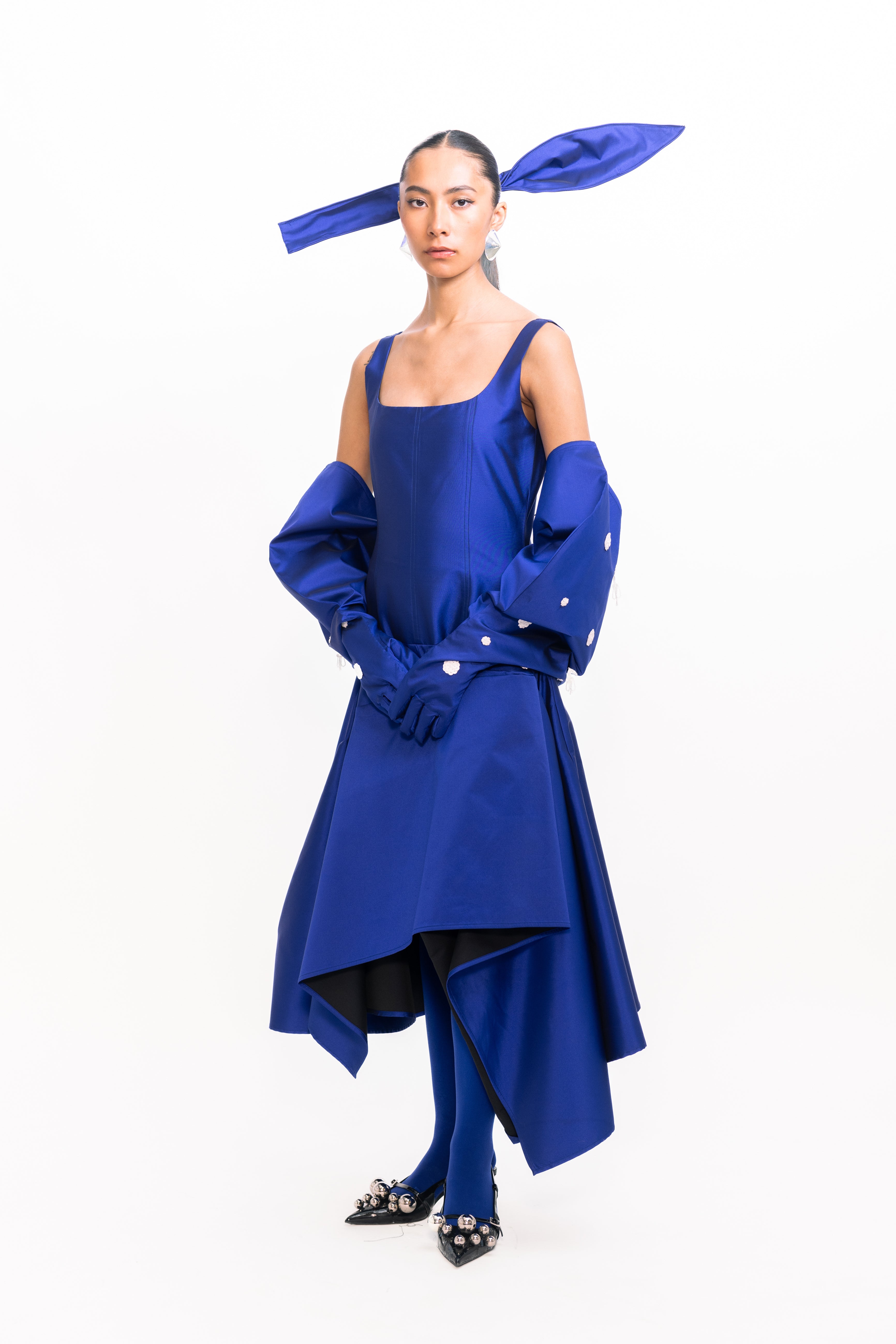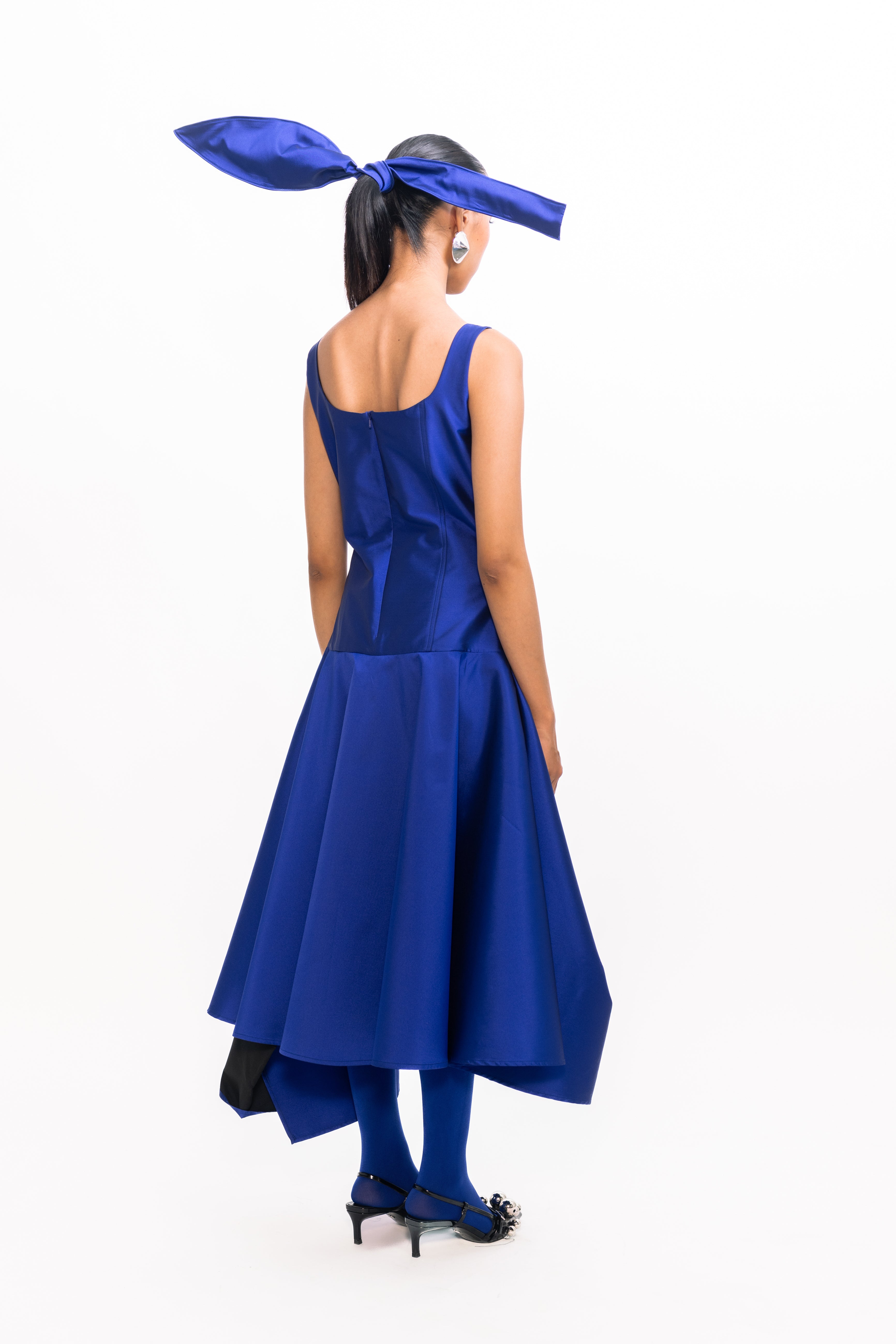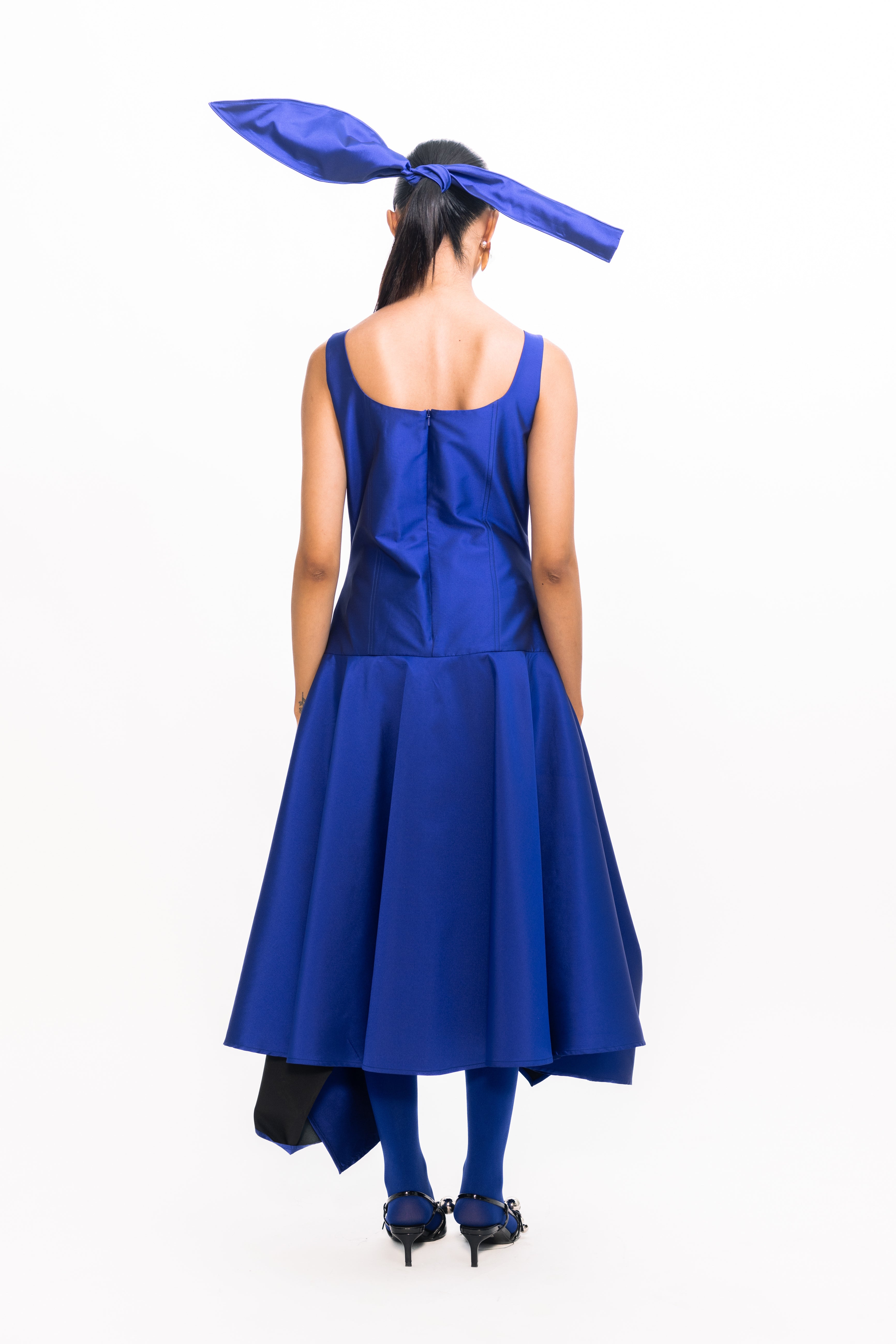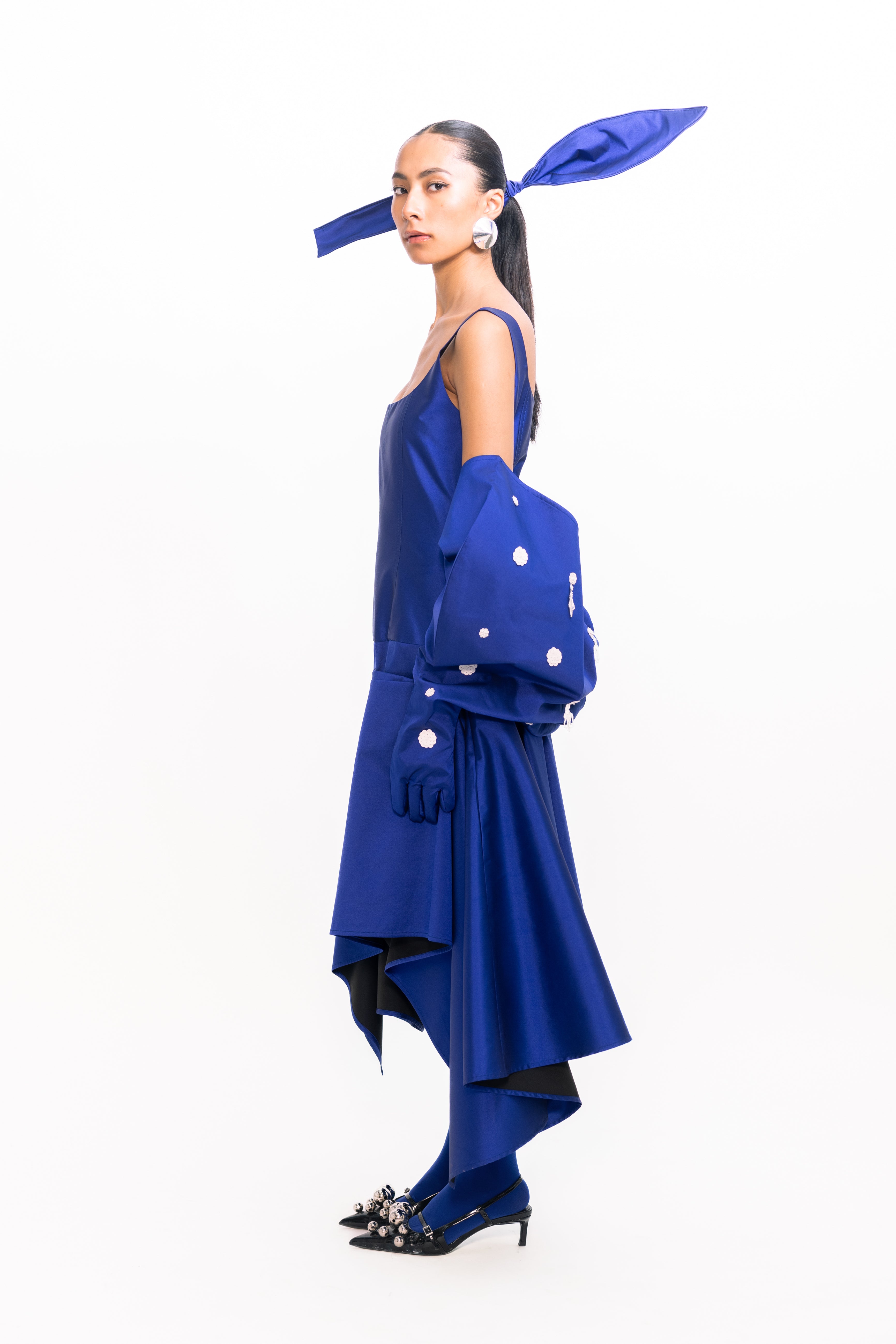 This dress features a fitted bodice that contours the figure, flowing into a chic drop waist. A dramatic, sculptural drape cascades from the hip, creating striking movement and a sense of modern elegance. Perfect for occasions that call for a bold yet refined statement.