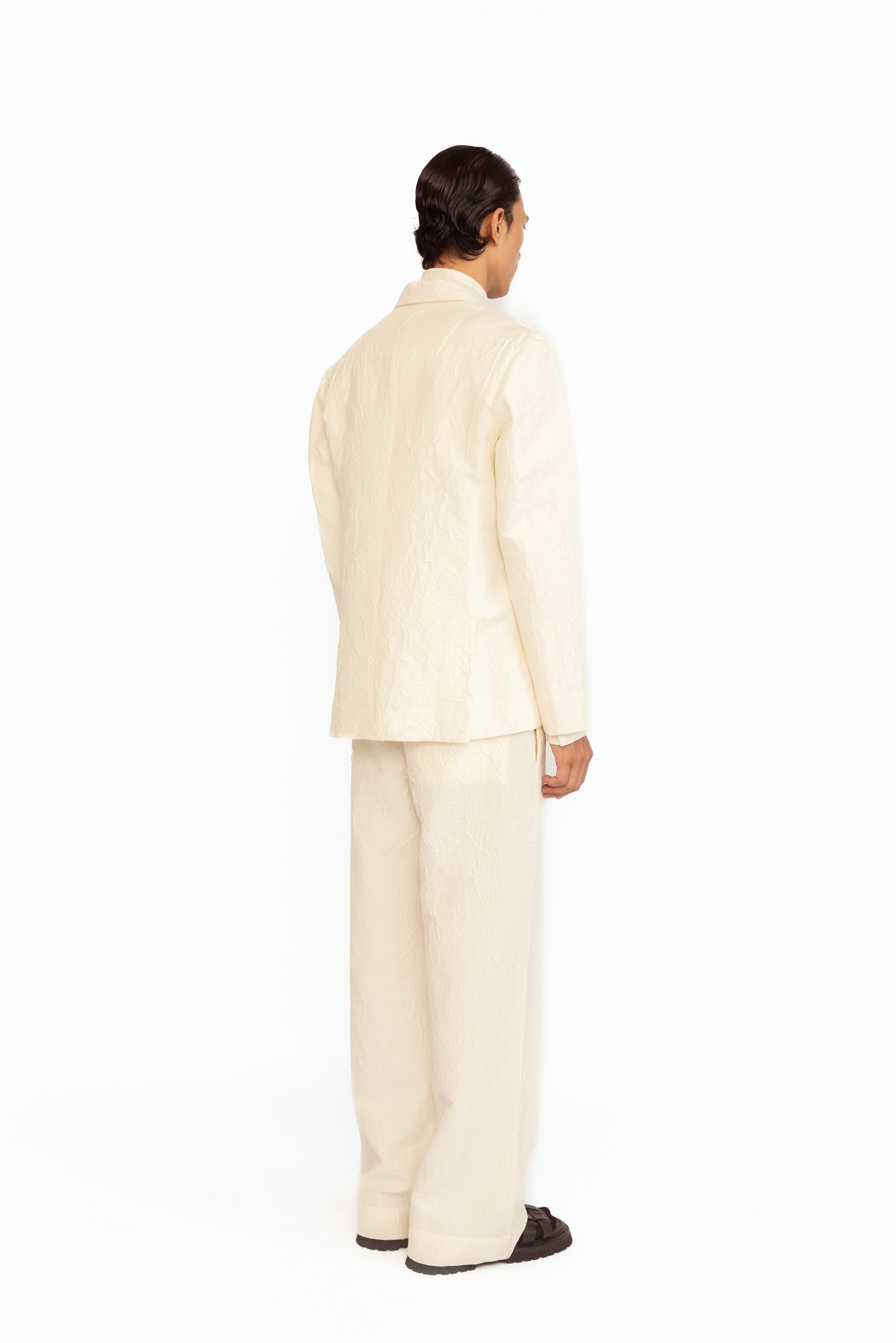 A classic menswear staple with a contemporary twist. This full-sleeved blazer is tailored in wrinkled linen, featuring a sharp lapel collar and a structured silhouette. The subtle rose appliqué adds a refined statement detail, while two pockets, one flap pocket, and a four-button closure complete the design with timeless functionality.