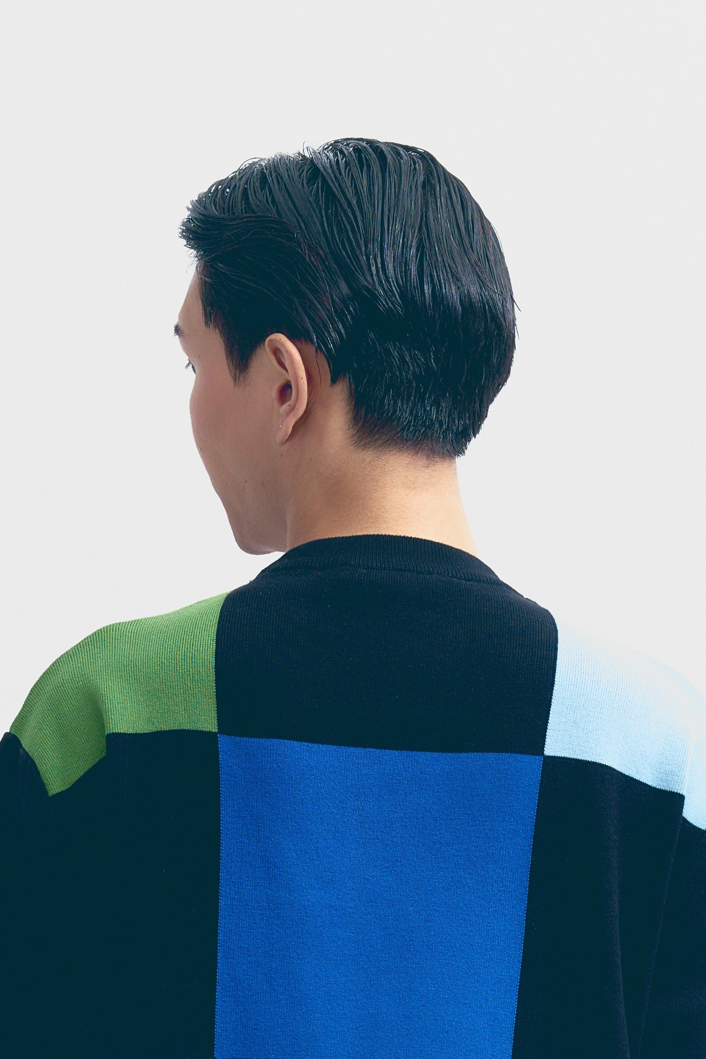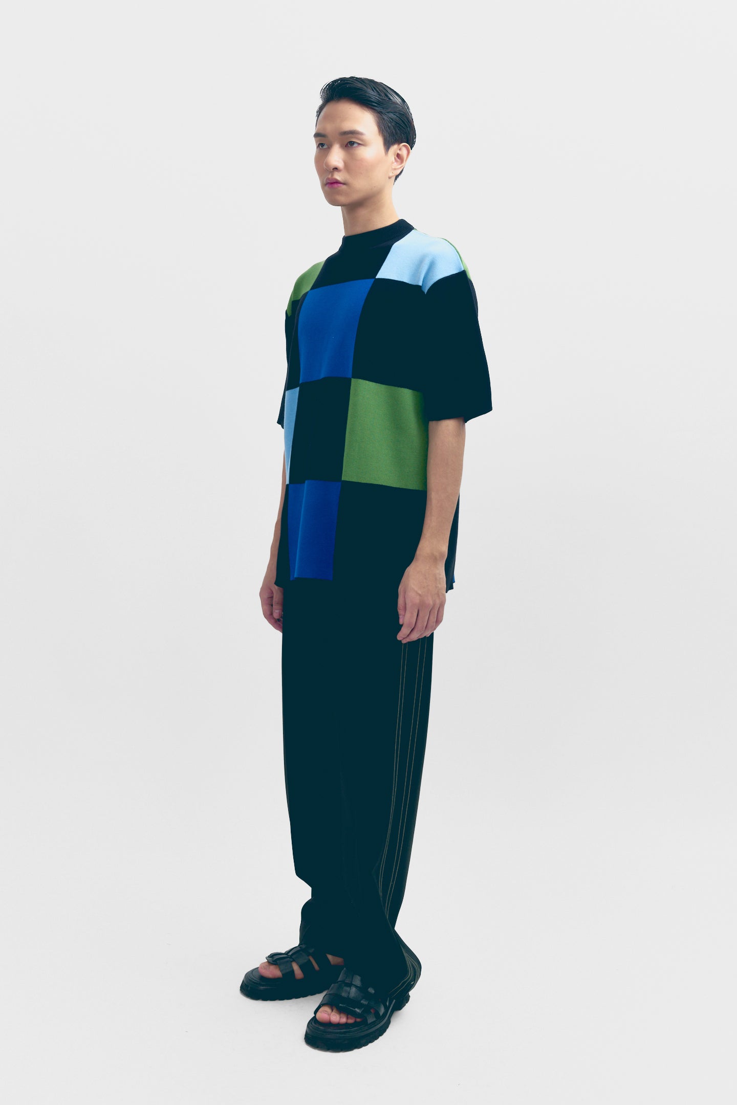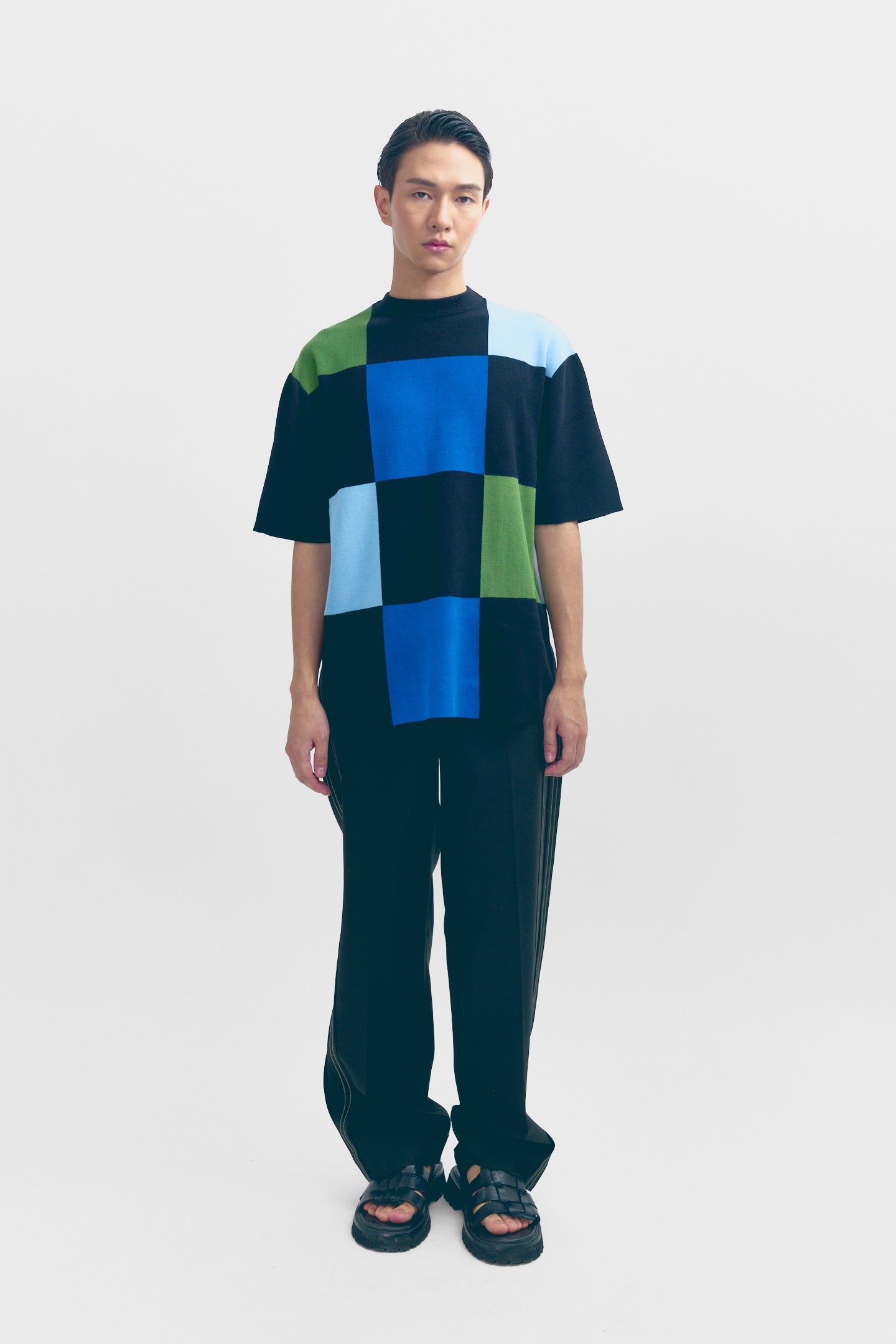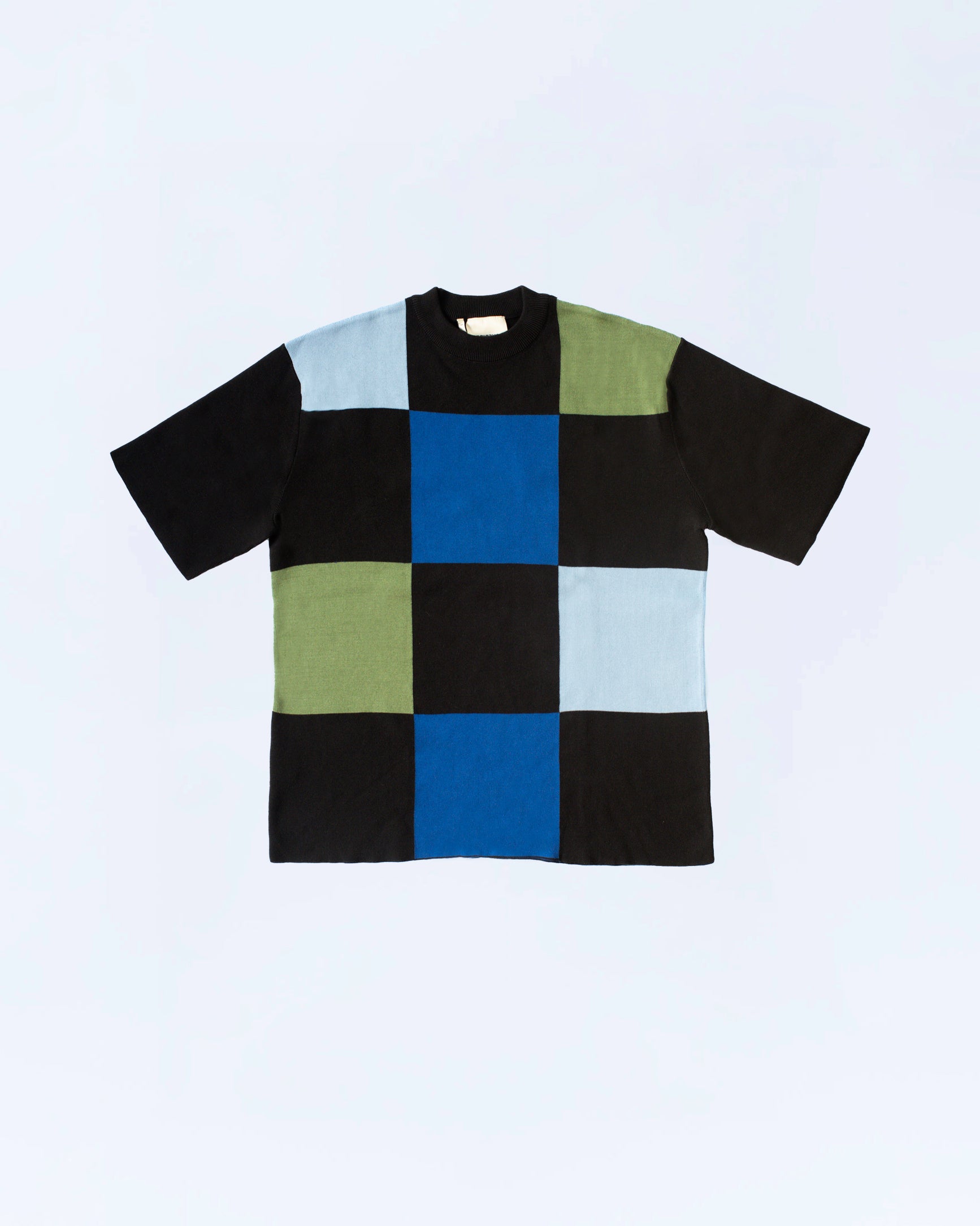 This knit T-shirt features a panelled design with a bold checkered pattern, adding texture and visual interest to a classic silhouette. Crafted from soft, breathable knit fabric, it offers a comfortable fit with a modern edge. Perfect for everyday wear with a standout twist.