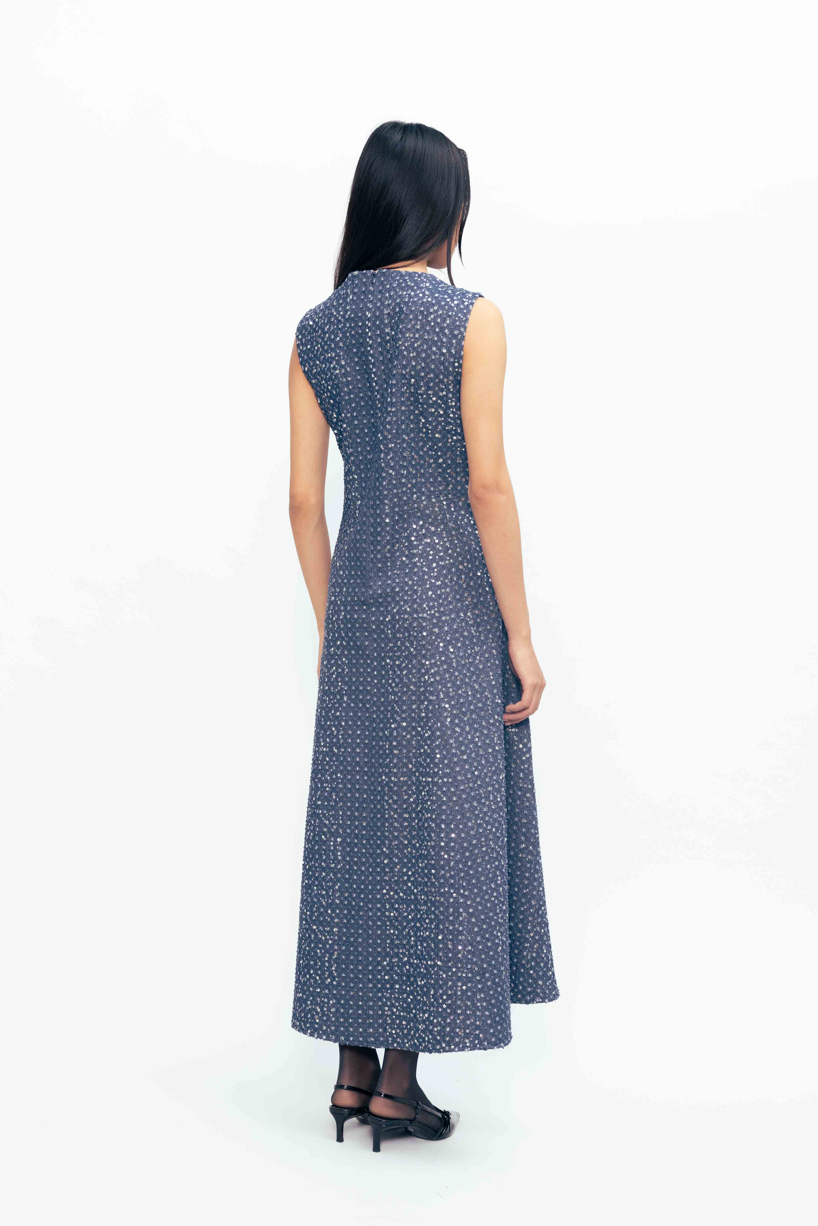 A feminine shape meets subtle detailing in this fit-and-flare midi. Light sequin work adds soft texture and dimension, while the grey-blue base keeps it versatile and grounded. Designed to define at the waist and flow with movement, it offers a balanced look — polished enough for occasions, relaxed enough for everyday.