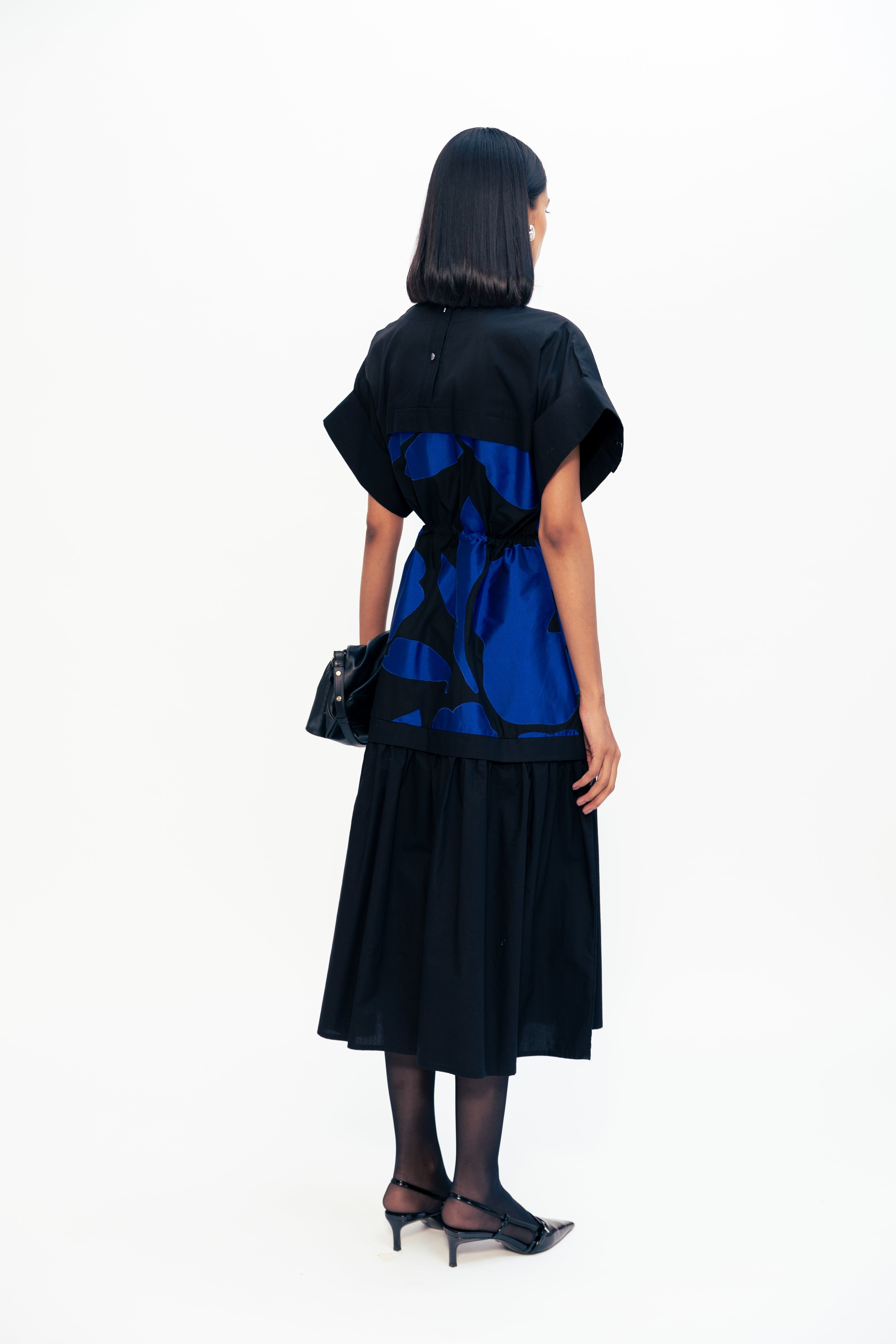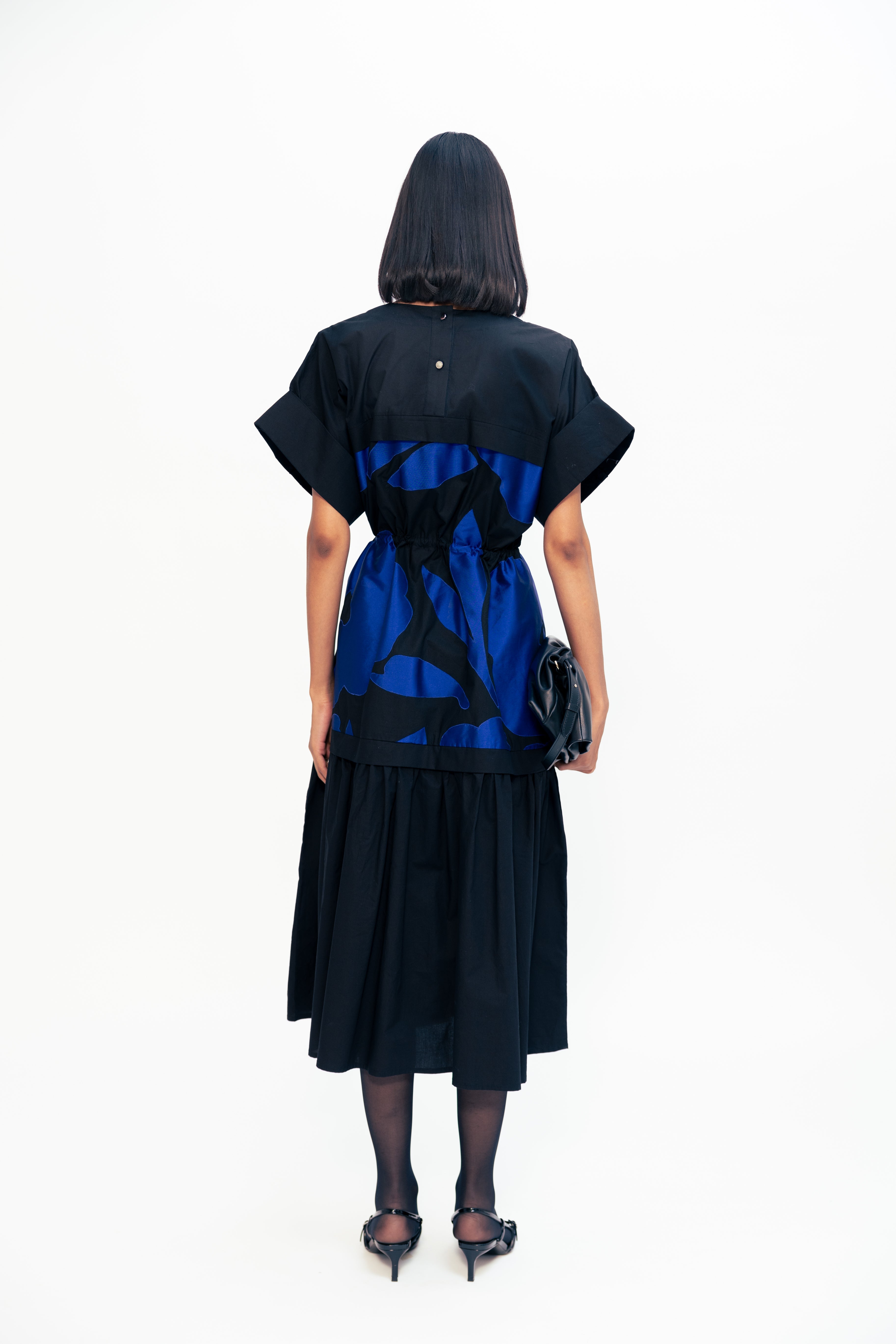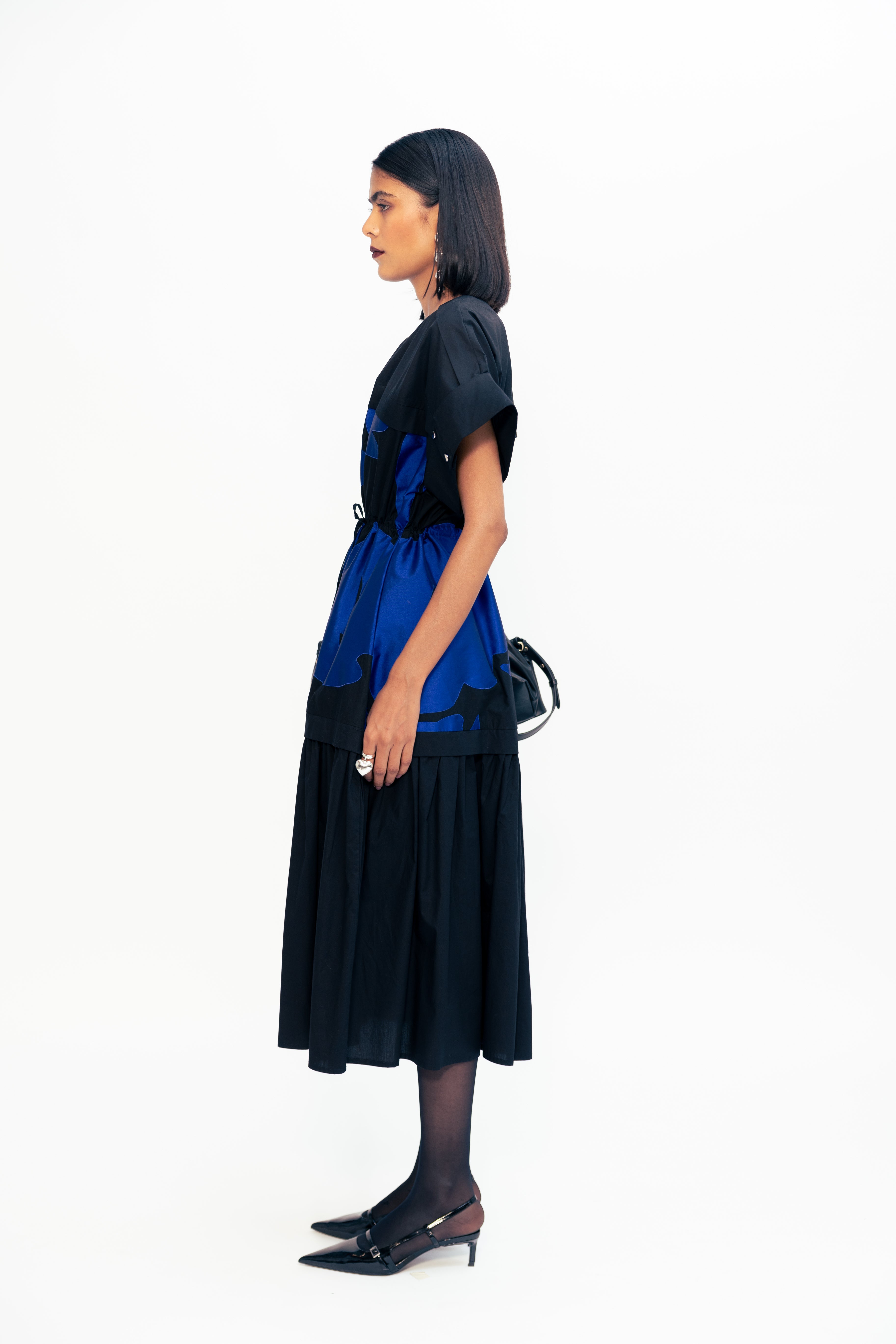 This dress features a gathered bottom and placket detailing at the sleeves, adorned with patchwork crafted from scrap fabrics. This design combines feminine elegance with creative sustainability, offering a unique and eco-friendly addition to any wardrobe.