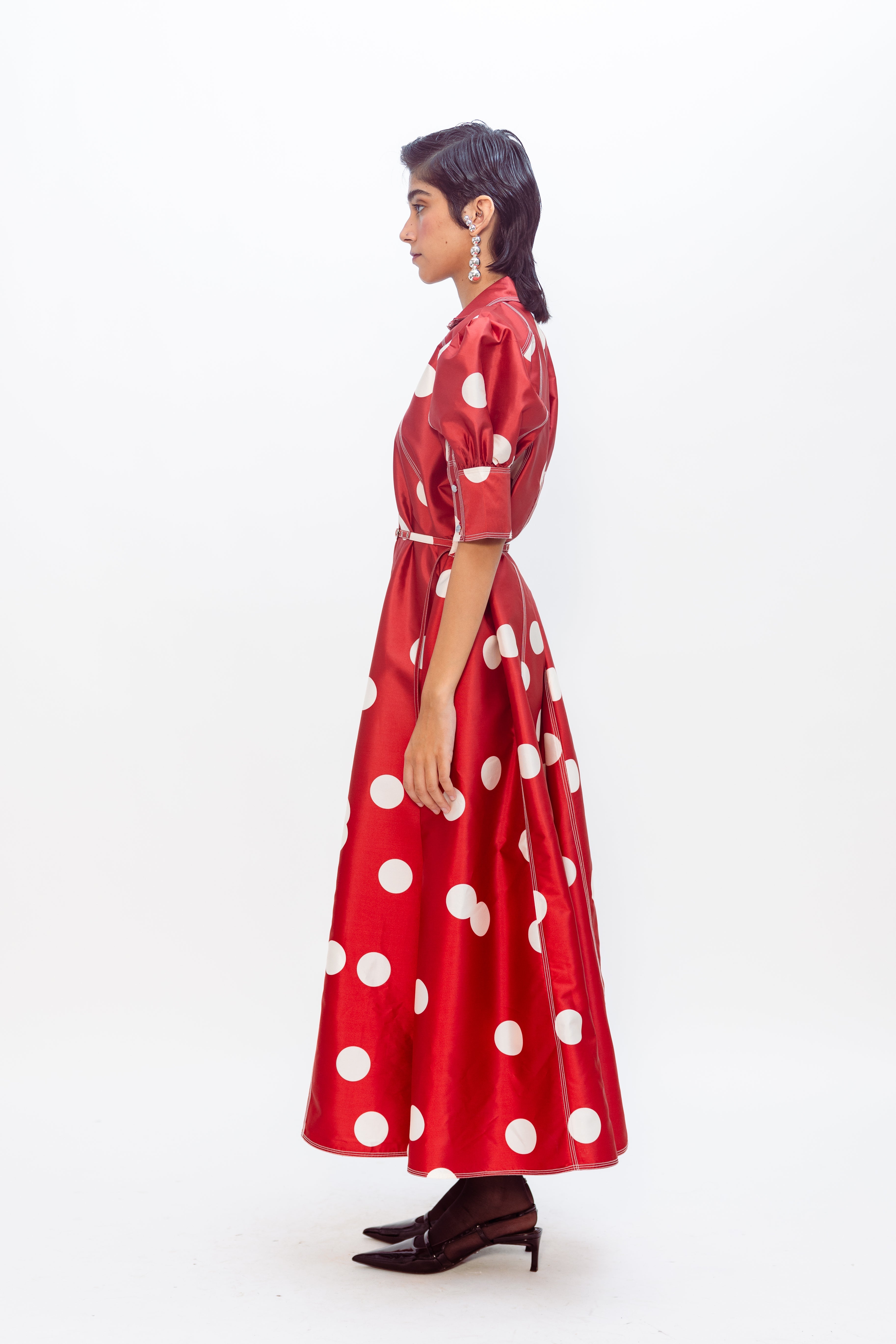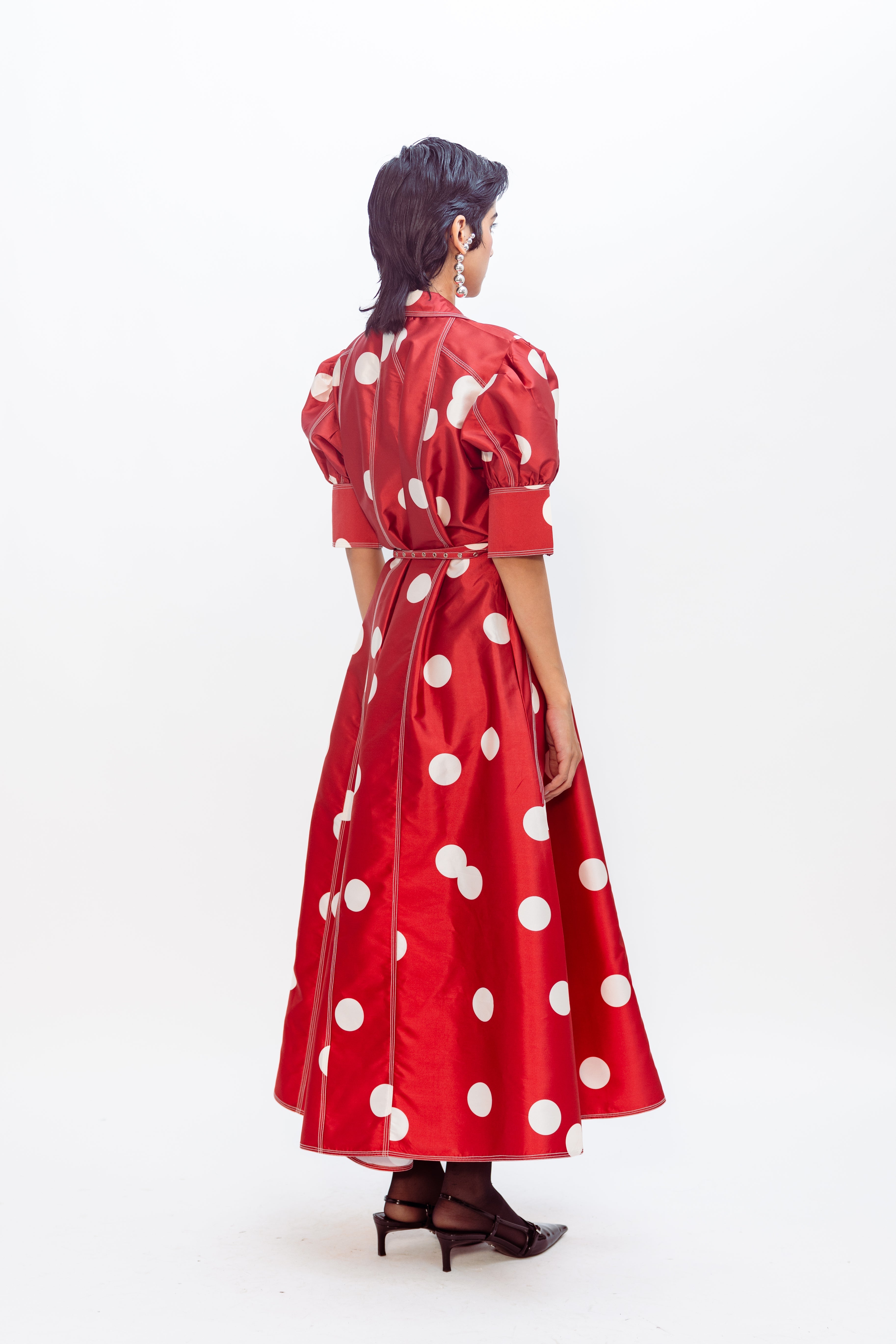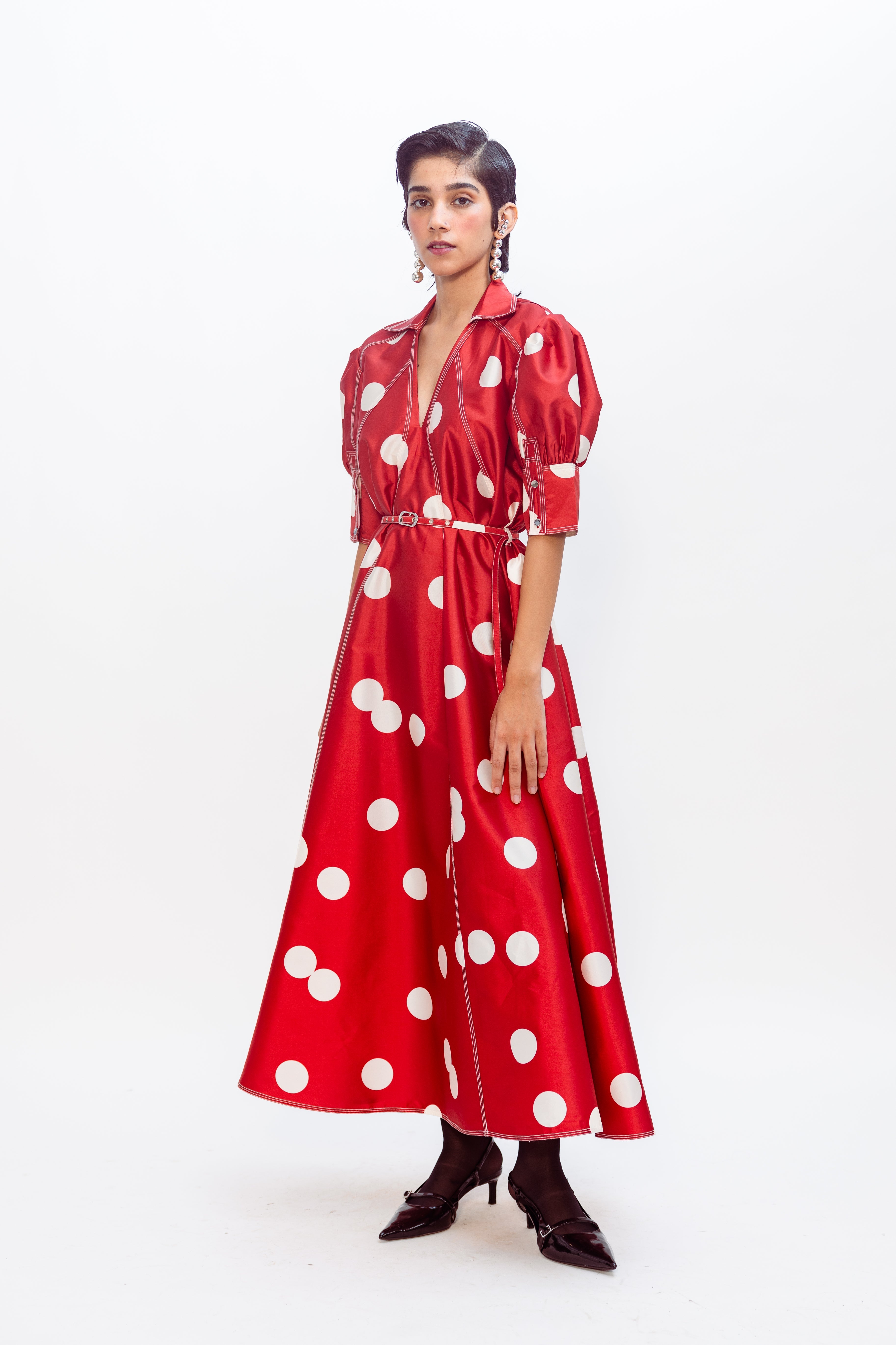 An ankle-length dress with a V-neck and collar, featuring slots all over, offers a blend of elegance and allure. The V-neckline adds a flattering touch, while the collar adds a refined detail. The slots all over the dress provide a unique and eye-catching design element, creating visual interest and movement. With plackets at the sleeves, the dress achieves a structured look. Paired with a belt, it offers versatility in styling and enhances the waistline. This combination creates a sophisticated and chic ensemble suitable for various occasions, from formal events to casual outings.