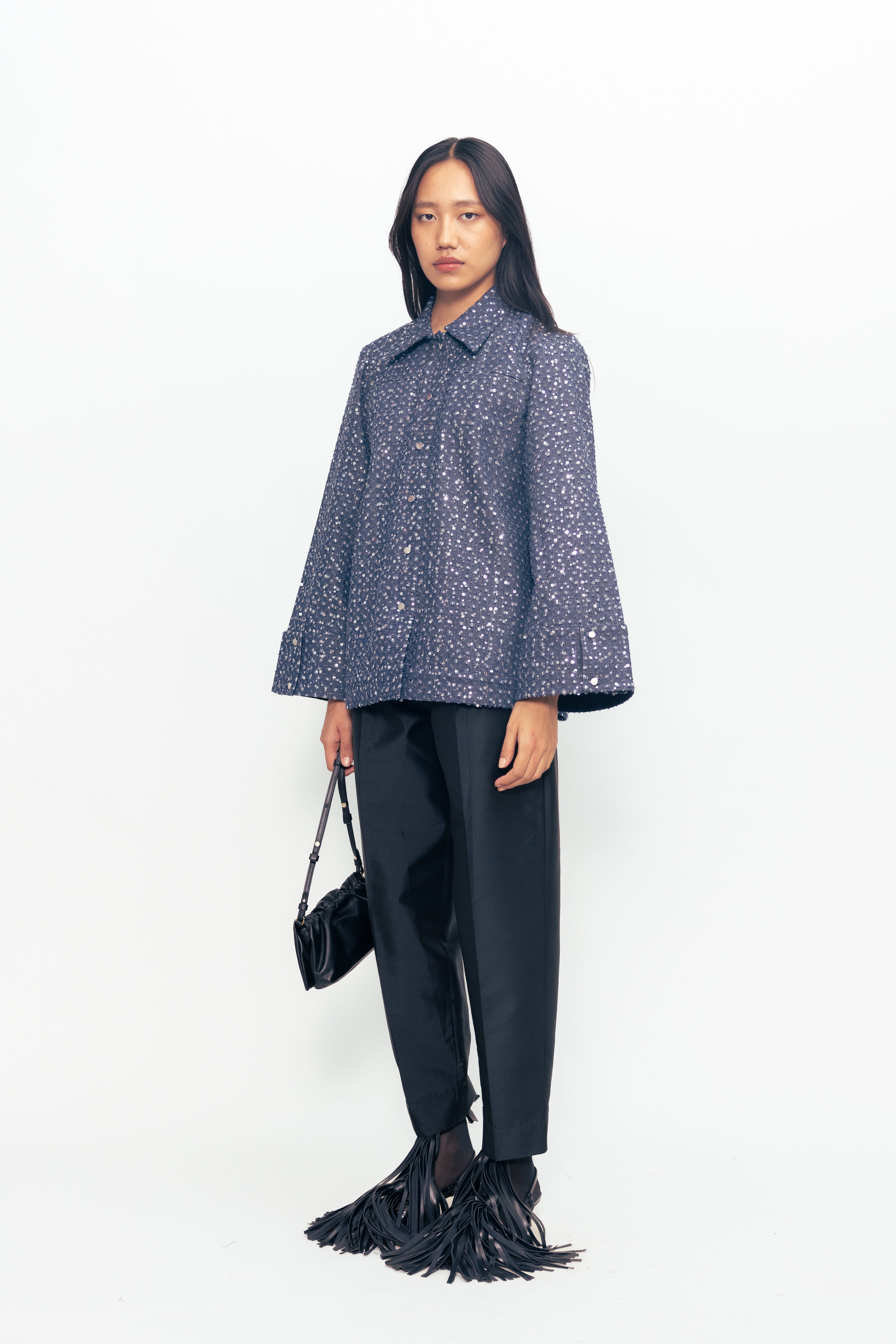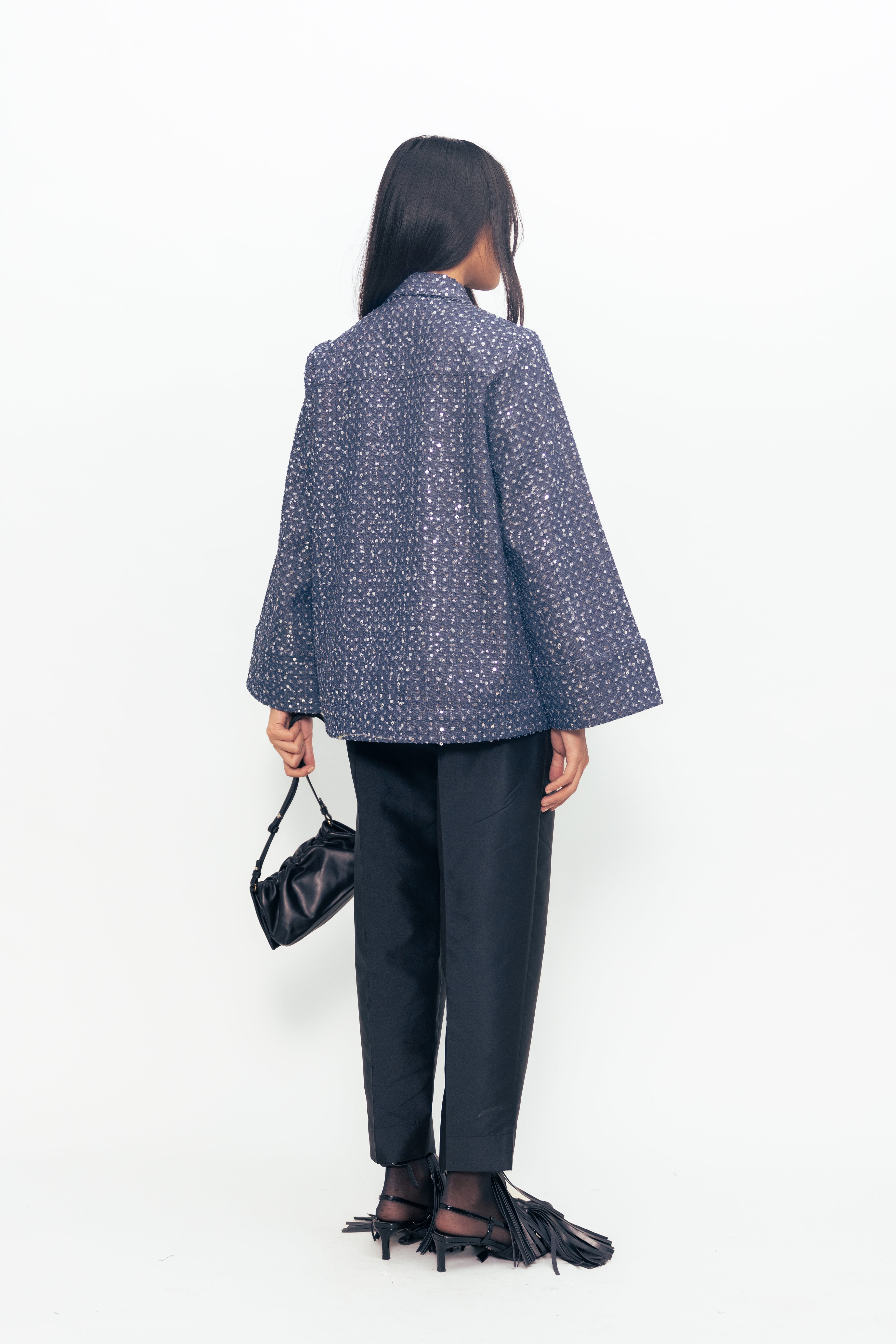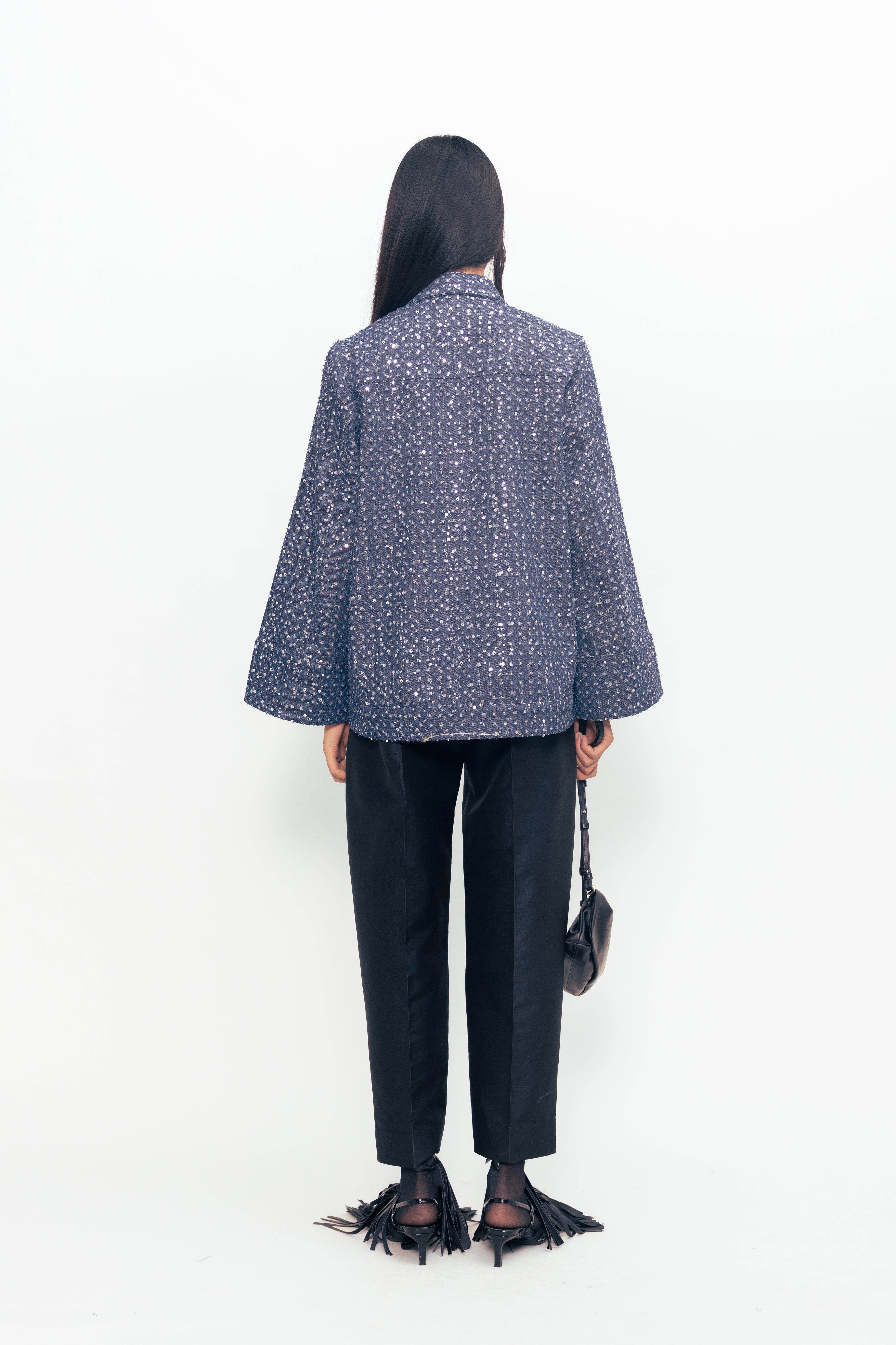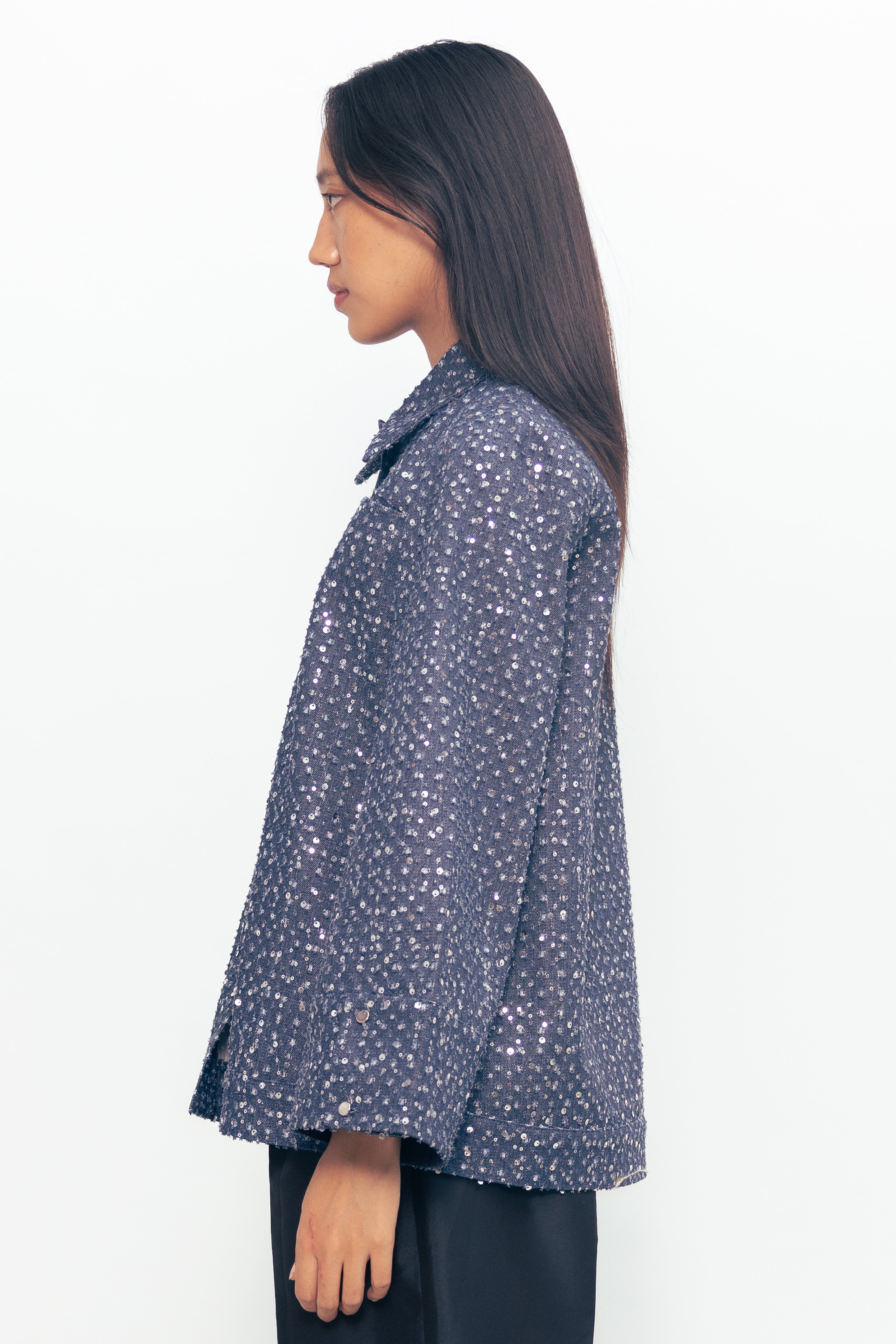 This piece reimagines classic denim with a refined touch of shine. Subtle sequins are scattered across its surface, catching light without overwhelming the look. The oversized sleeves bring volume and ease, giving it a bold yet wearable silhouette. A clean grey-blue tone grounds the piece, keeping it versatile for both casual and statement moments.