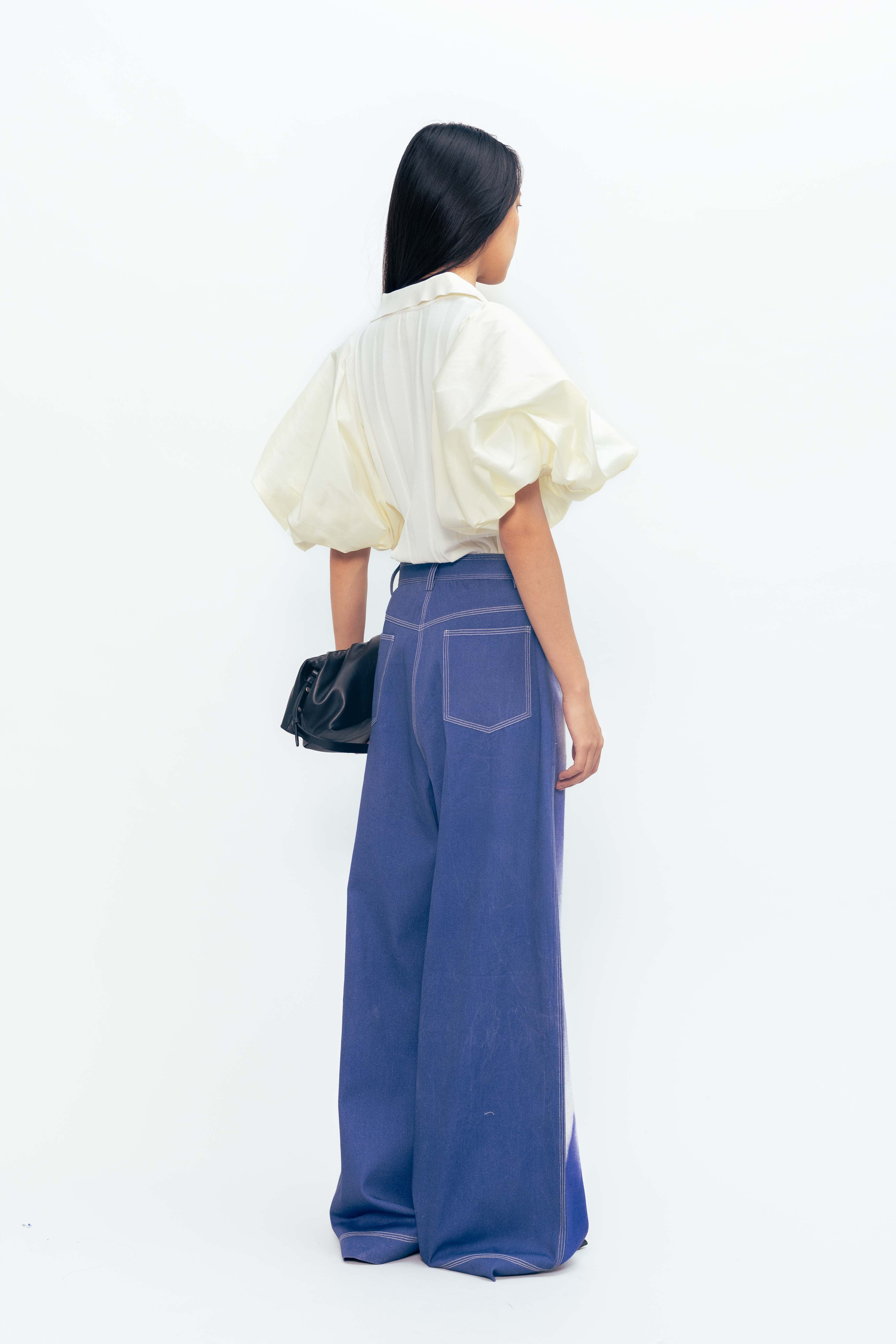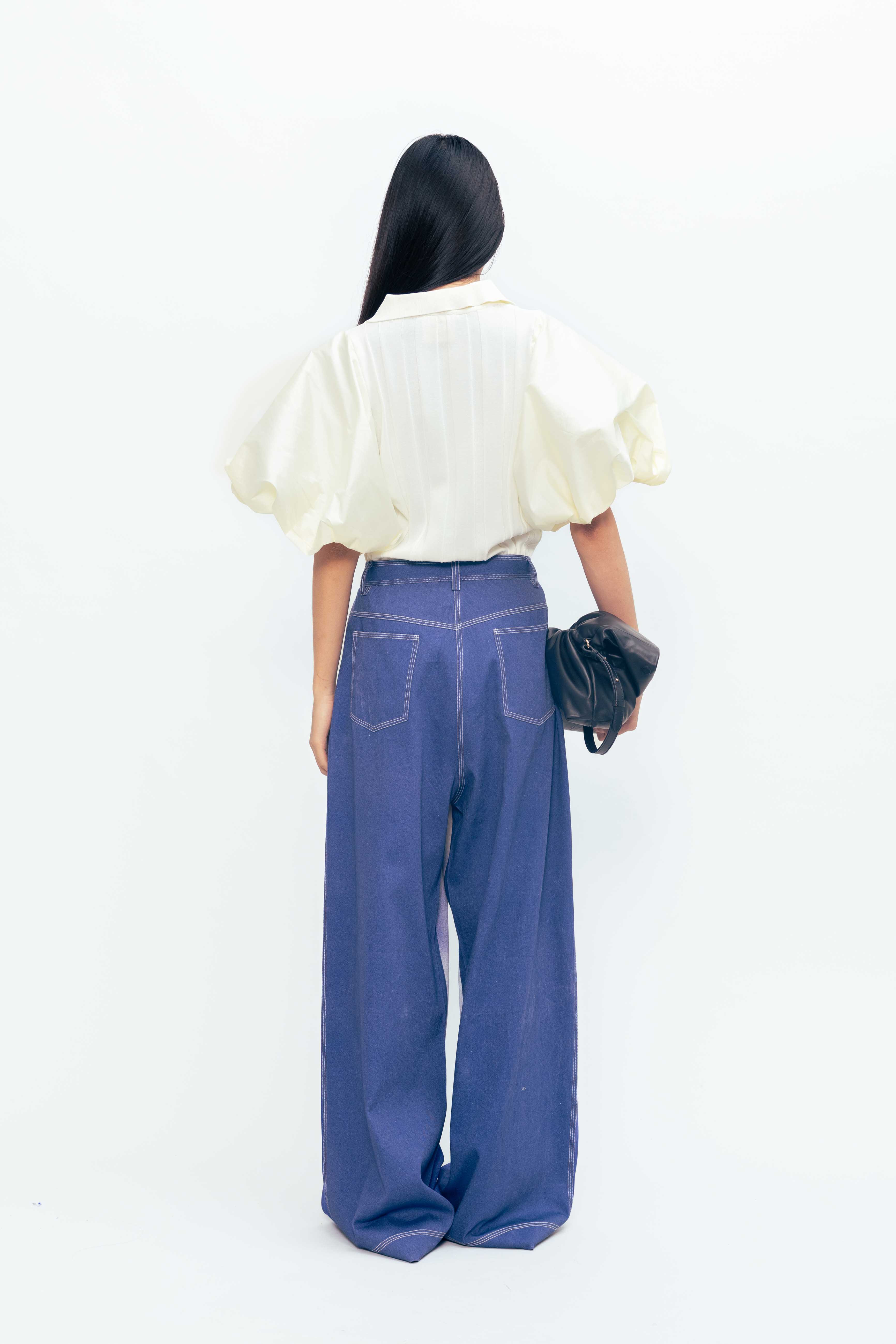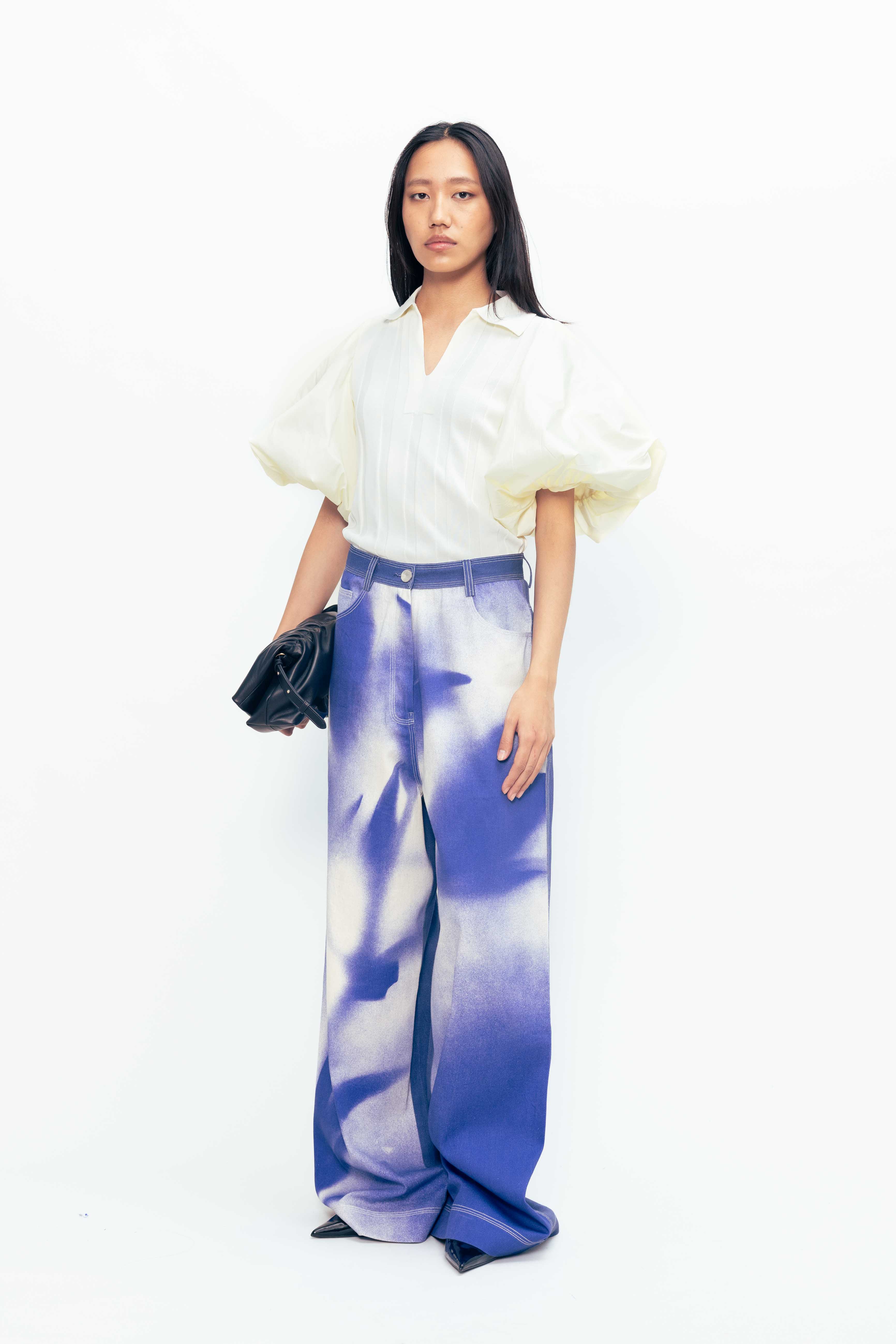 These relaxed-fit pants combine structure with ease, offering a slouchy silhouette that sits comfortably while maintaining a clean shape. The subtle all-over print adds a graphic touch, bringing personality to the sturdy yet soft texture. Perfect for casual styling with a distinctive edge, they’re a fresh take on everyday denim-inspired dressing.