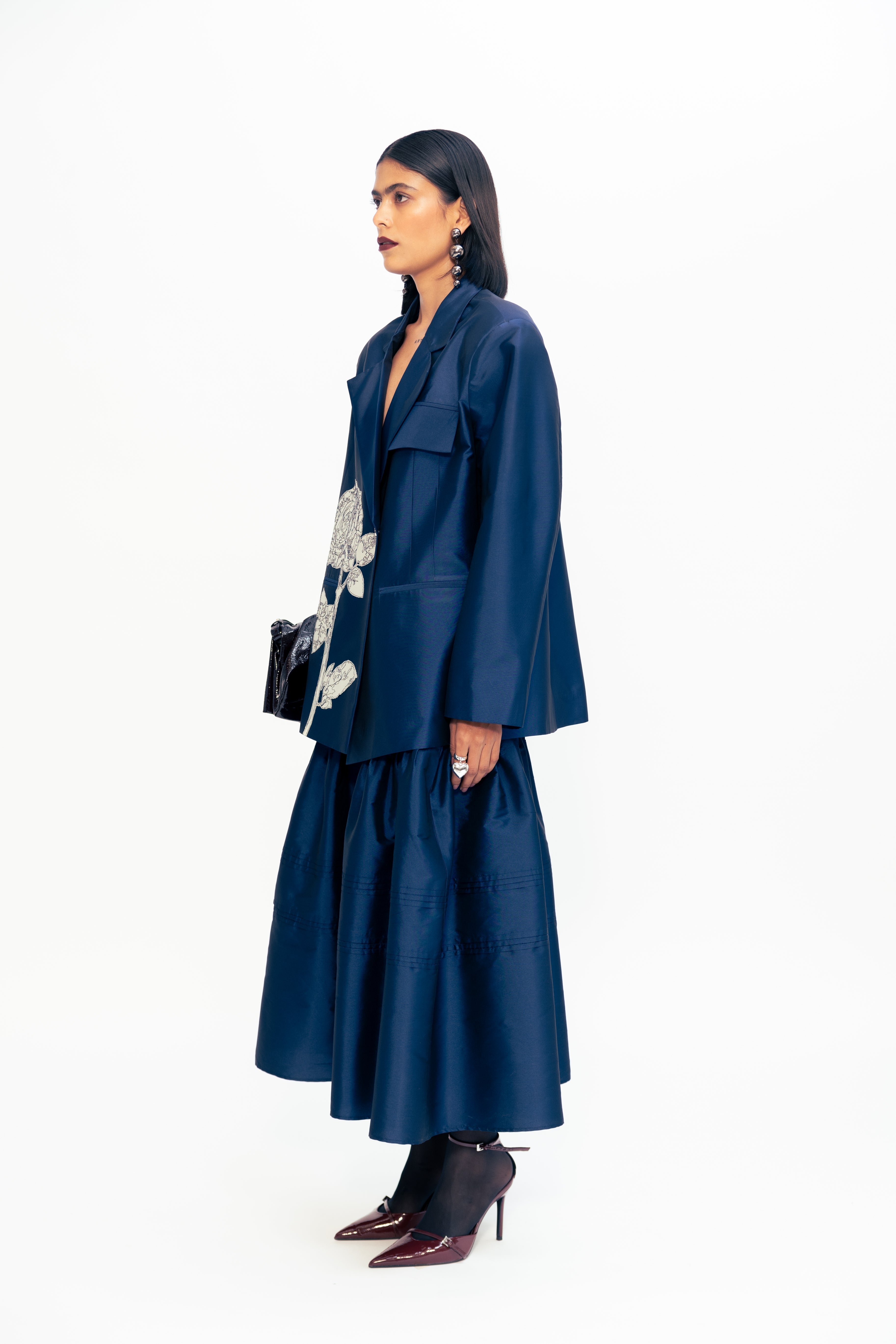 This refined blazer is a true statement piece, adorned with intricate appliqué embroidery that showcases exquisite craftsmanship. Tailored to perfection, it offers a graceful silhouette that flatters every frame. The delicate detailing adds depth and texture, making it ideal for both formal and elevated casual occasions.