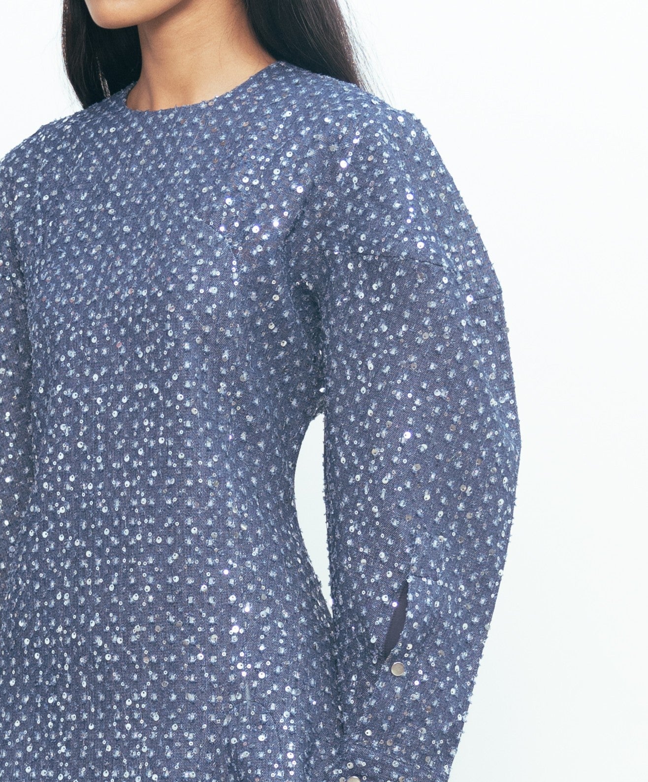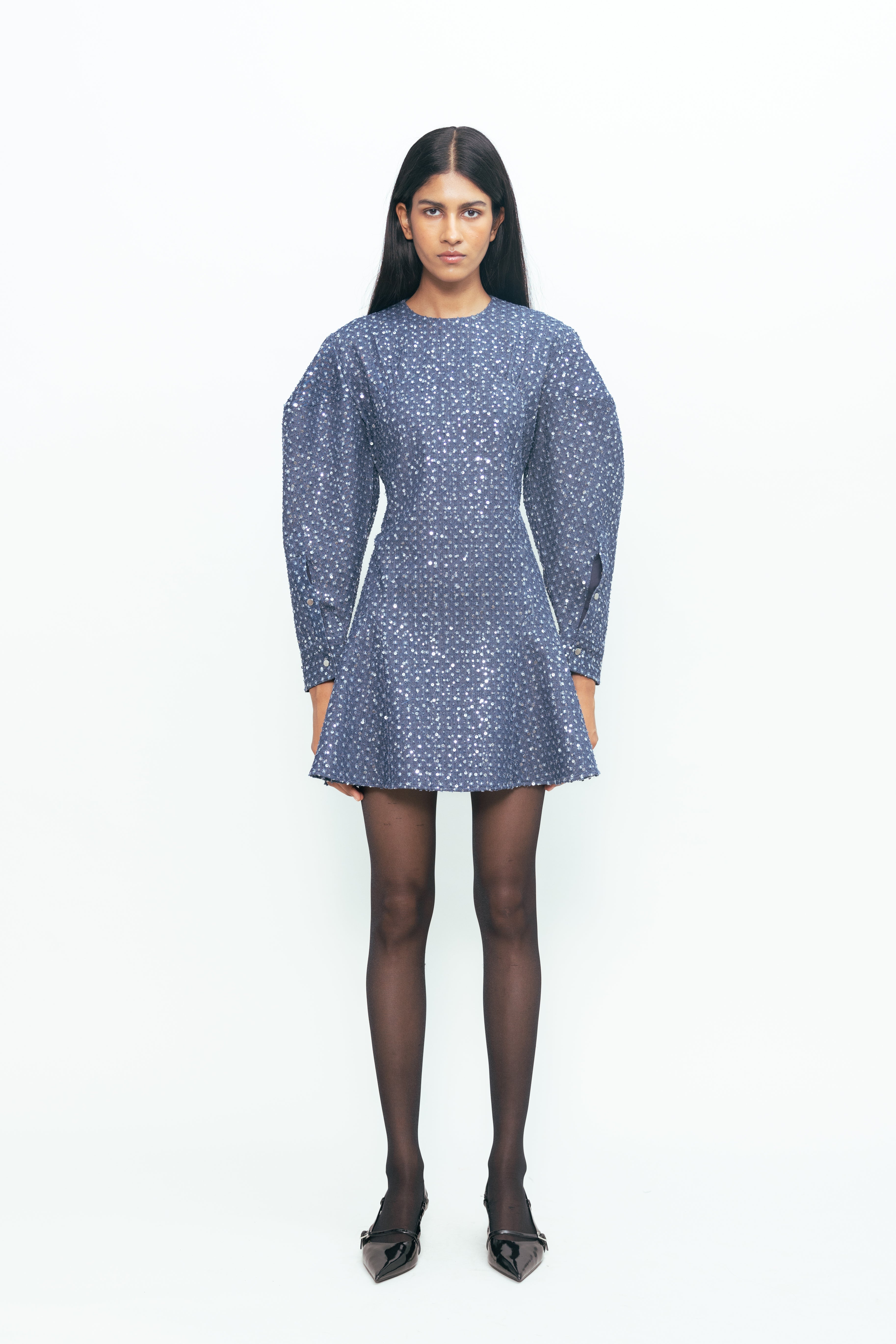 A clean A-line silhouette meets a touch of shimmer in this modern mini. Sequins are lightly scattered across the surface, adding just enough shine to elevate the look without losing its easy feel. The grey-blue tone keeps it grounded, while the shape offers comfort and movement. Simple, playful, and polished — all at once.