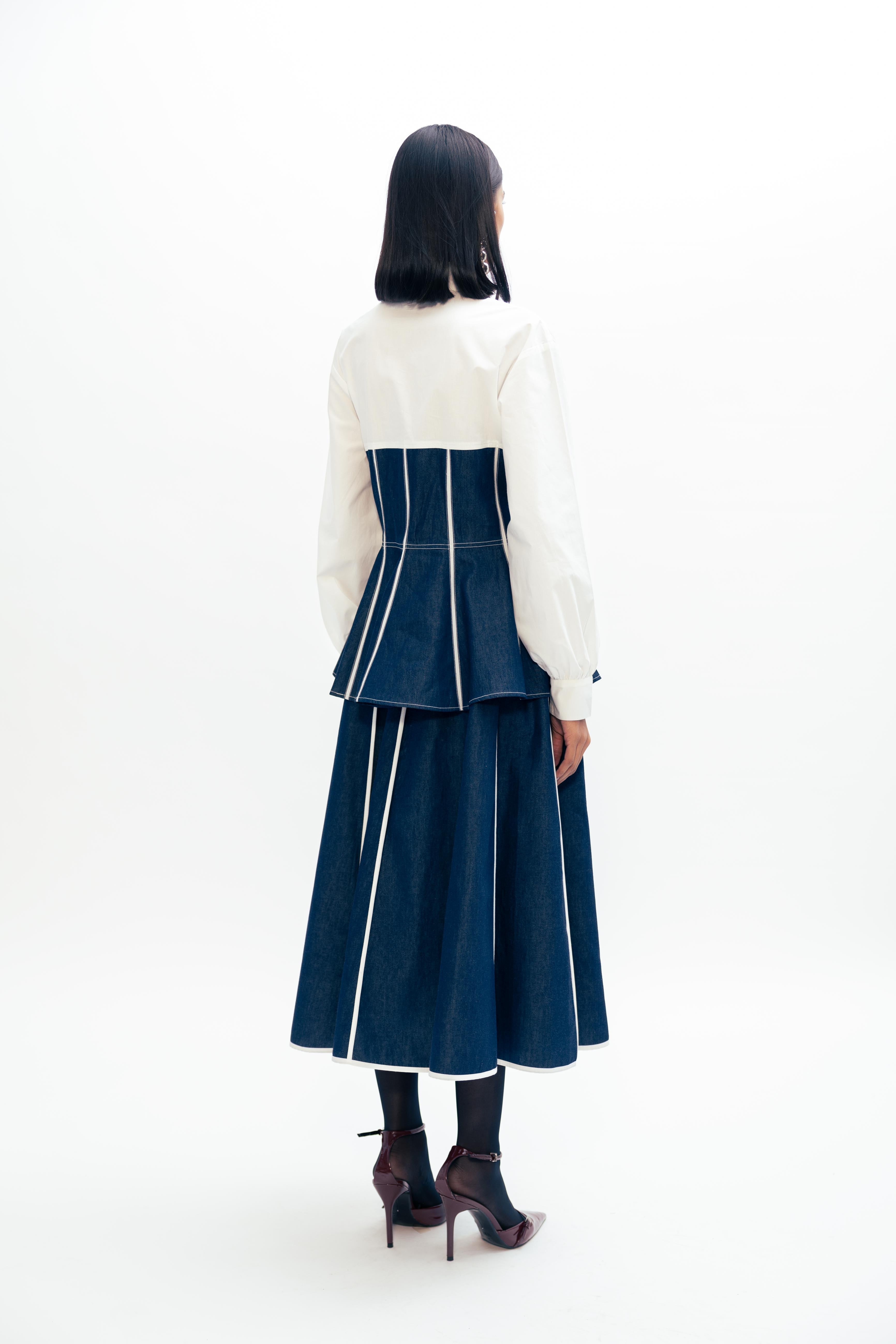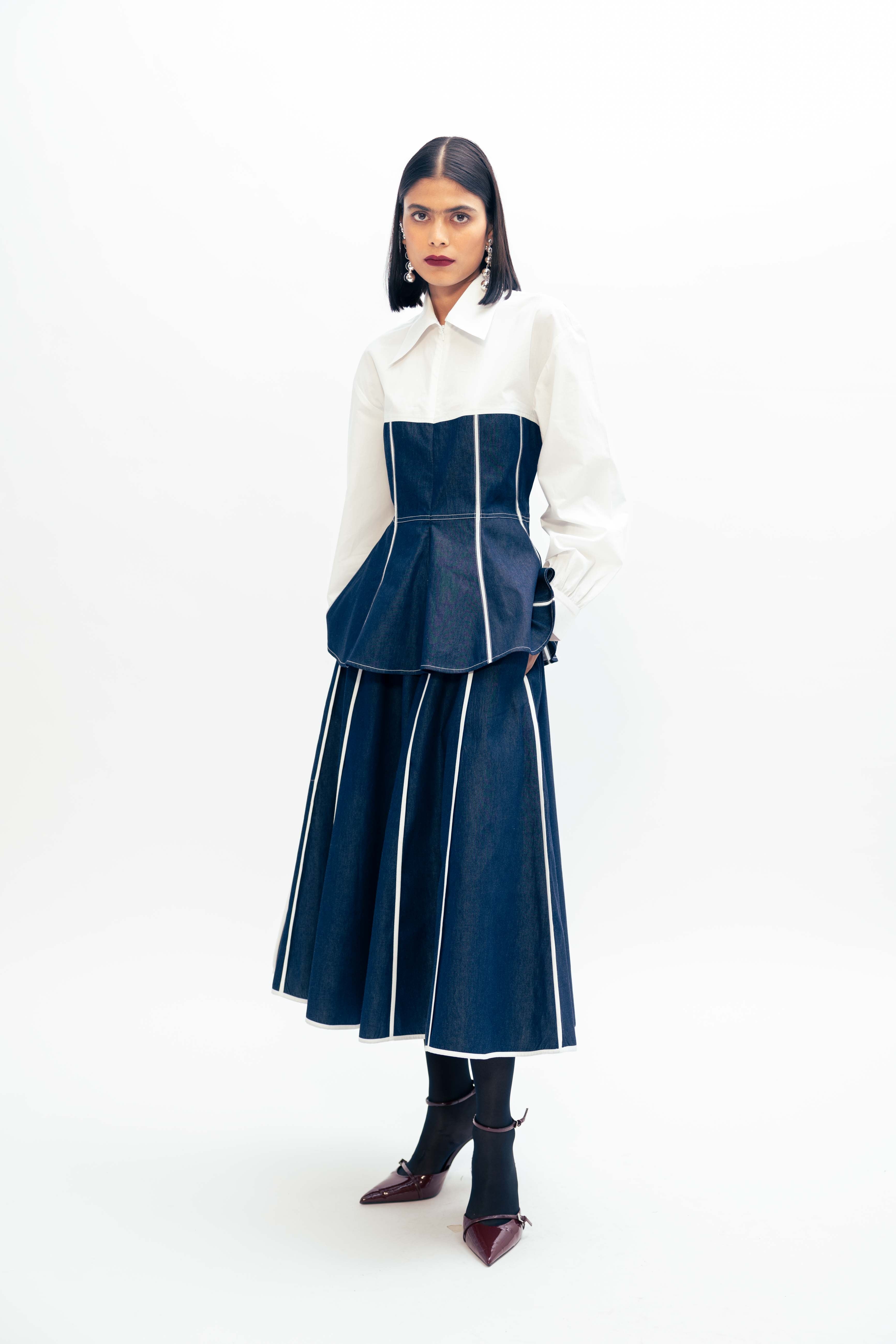 A fresh take on a classic shirt silhouette, this piece features a flattering peplum waist and modern fit-blocking design. The structured upper body contrasts with the soft flare of the peplum, creating a balanced, feminine look. Ideal for pairing with trousers or skirts for a smart, polished outfit.