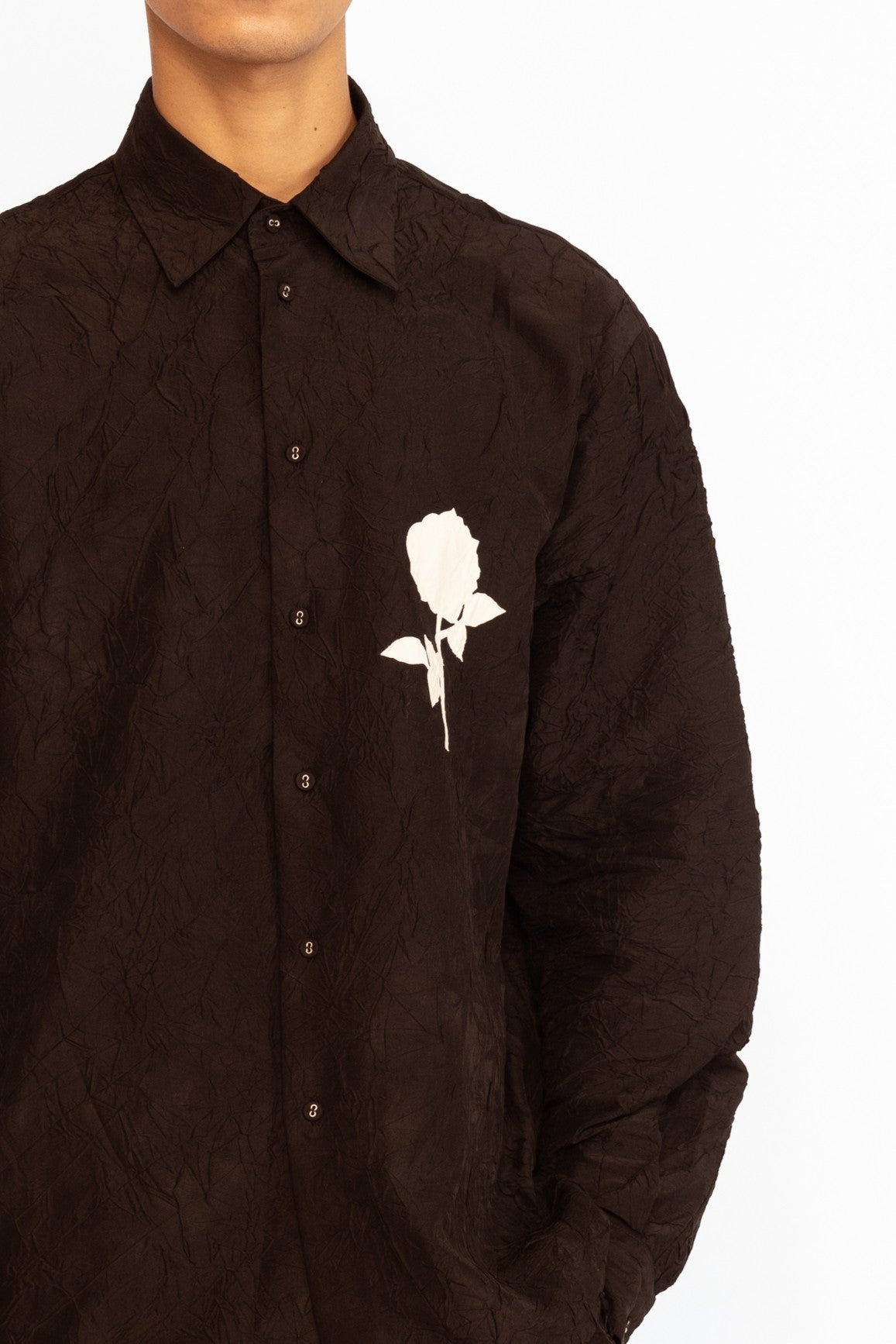 Crafted from luxurious wrinkled silk, this full-sleeved shirt combines classic elegance with a modern twist. The natural texture of the fabric lends it a relaxed yet elevated appeal, while the delicate rose appliqué adds a touch of feminine charm. Designed with a comfortable fit, it’s perfect for effortlessly transitioning from day to evening.