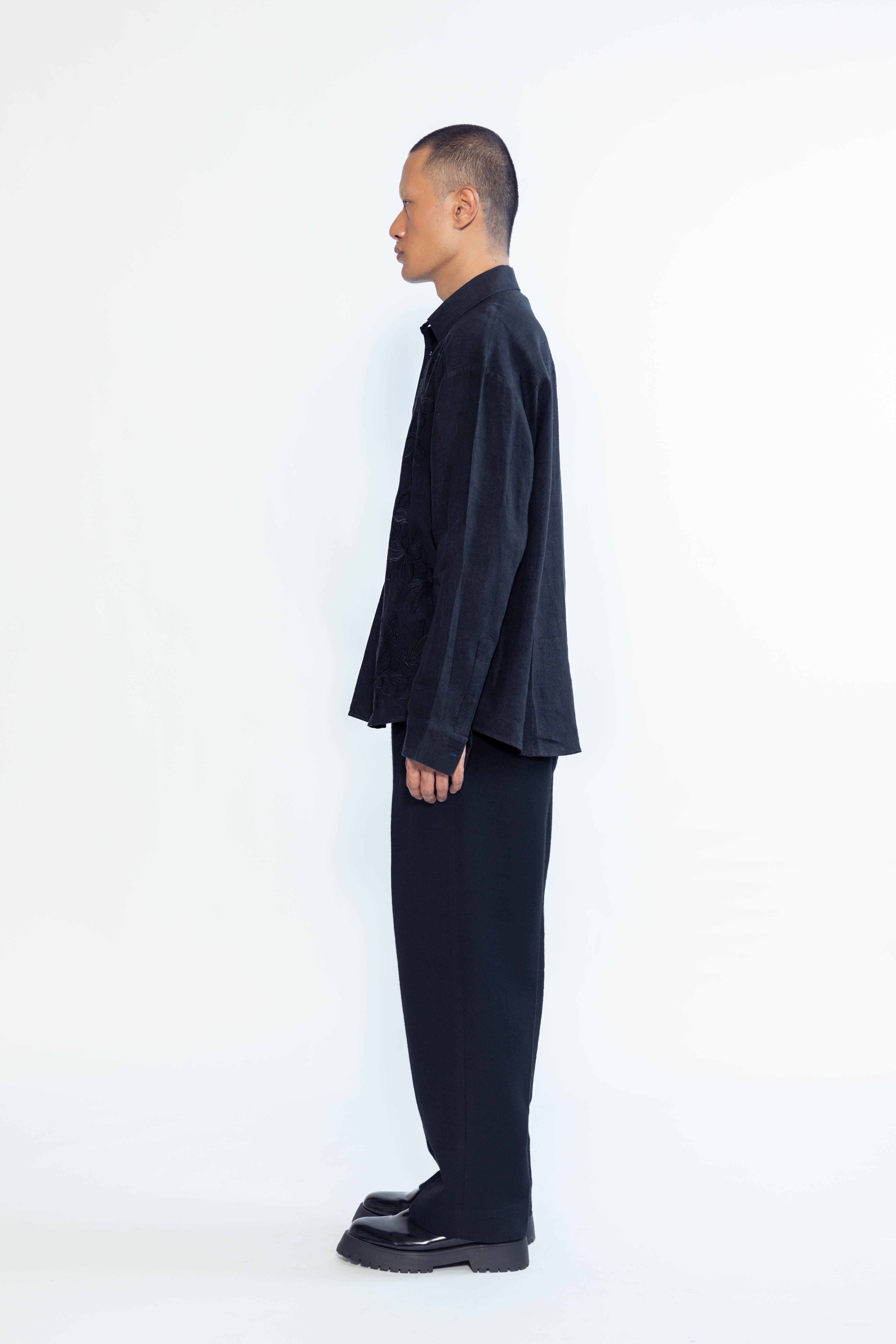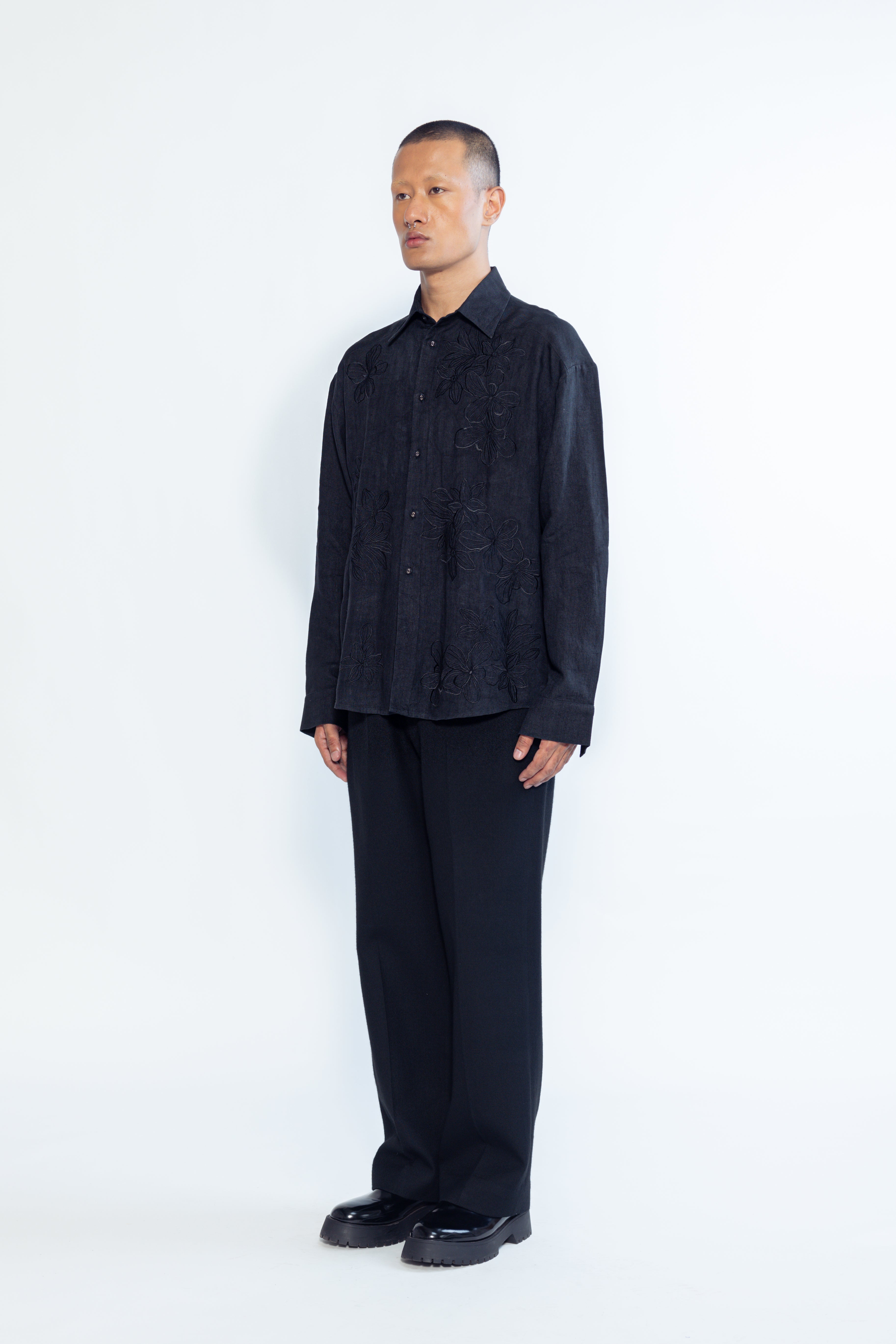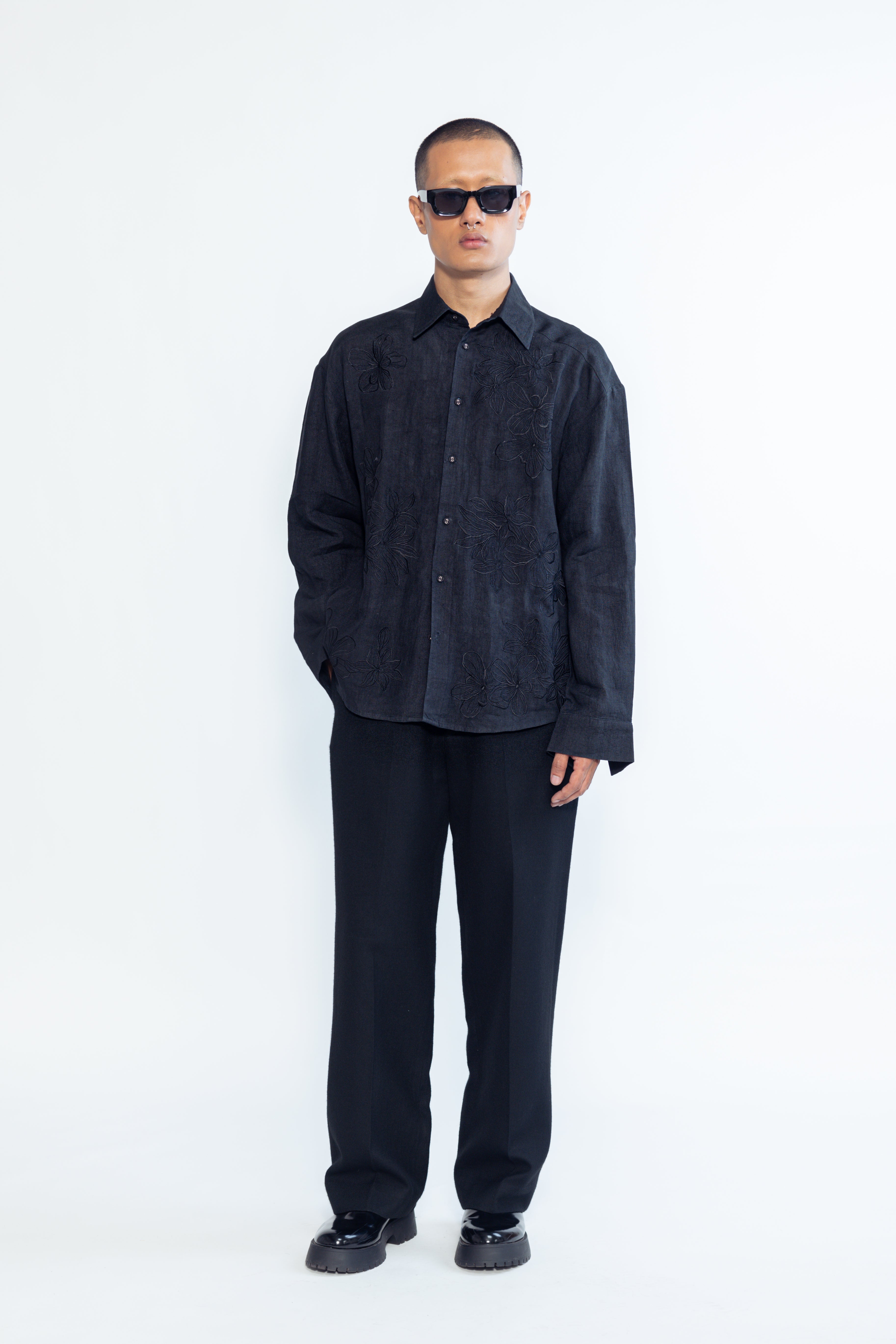 This piece is defined by its all-over tone-on-tone embroidery — a detailed floral arrangement that sits subtly against the base, adding rich texture without visual noise. The craftsmanship is deliberate: fine threadwork that blends into the fabric, offering depth you notice up close rather than at first glance. Cut in an oversized silhouette for ease and movement, it features matching buttons that keep the look seamless. Elevated yet understated, it’s built for those who appreciate detail in its most refined form.