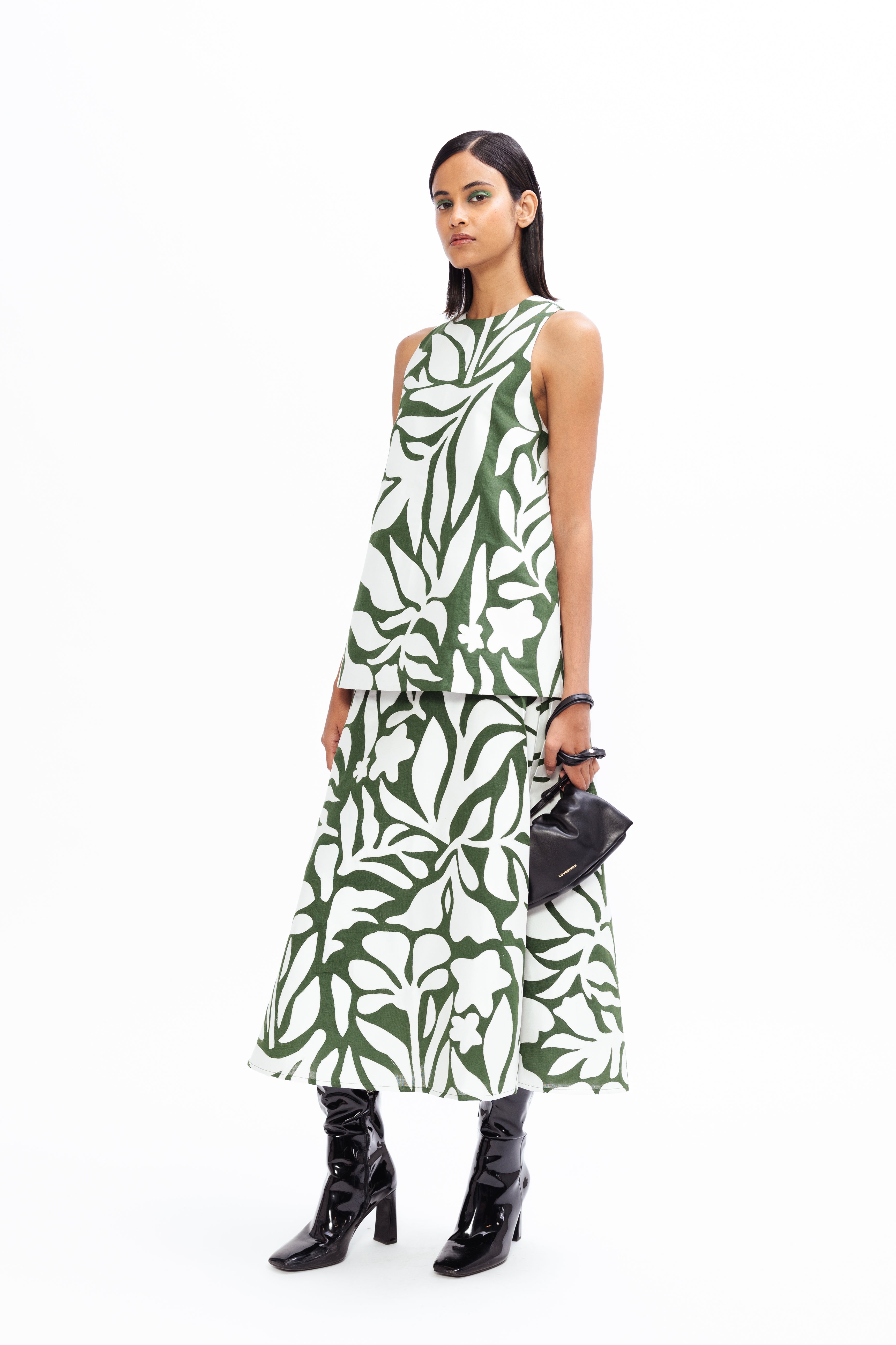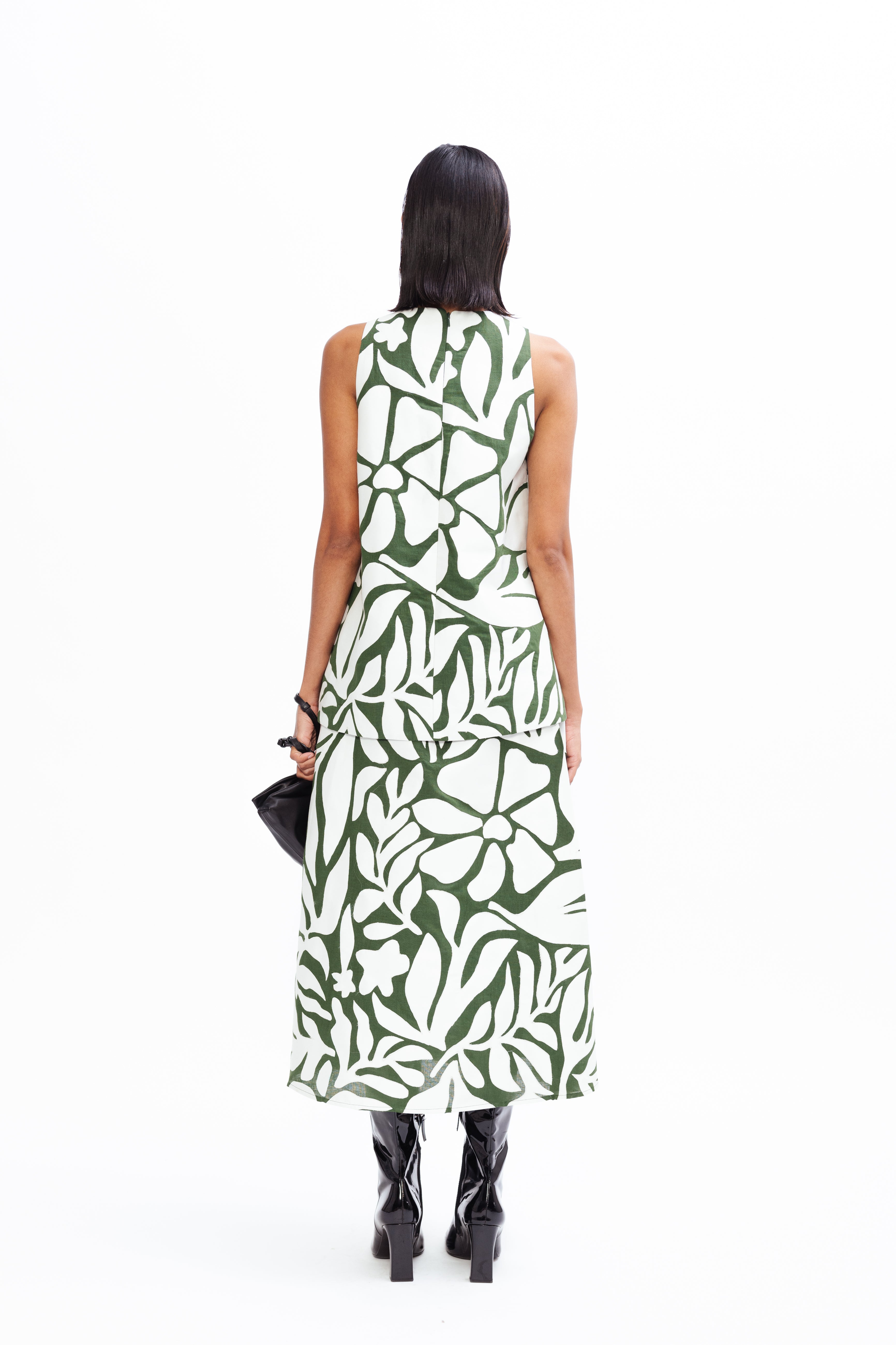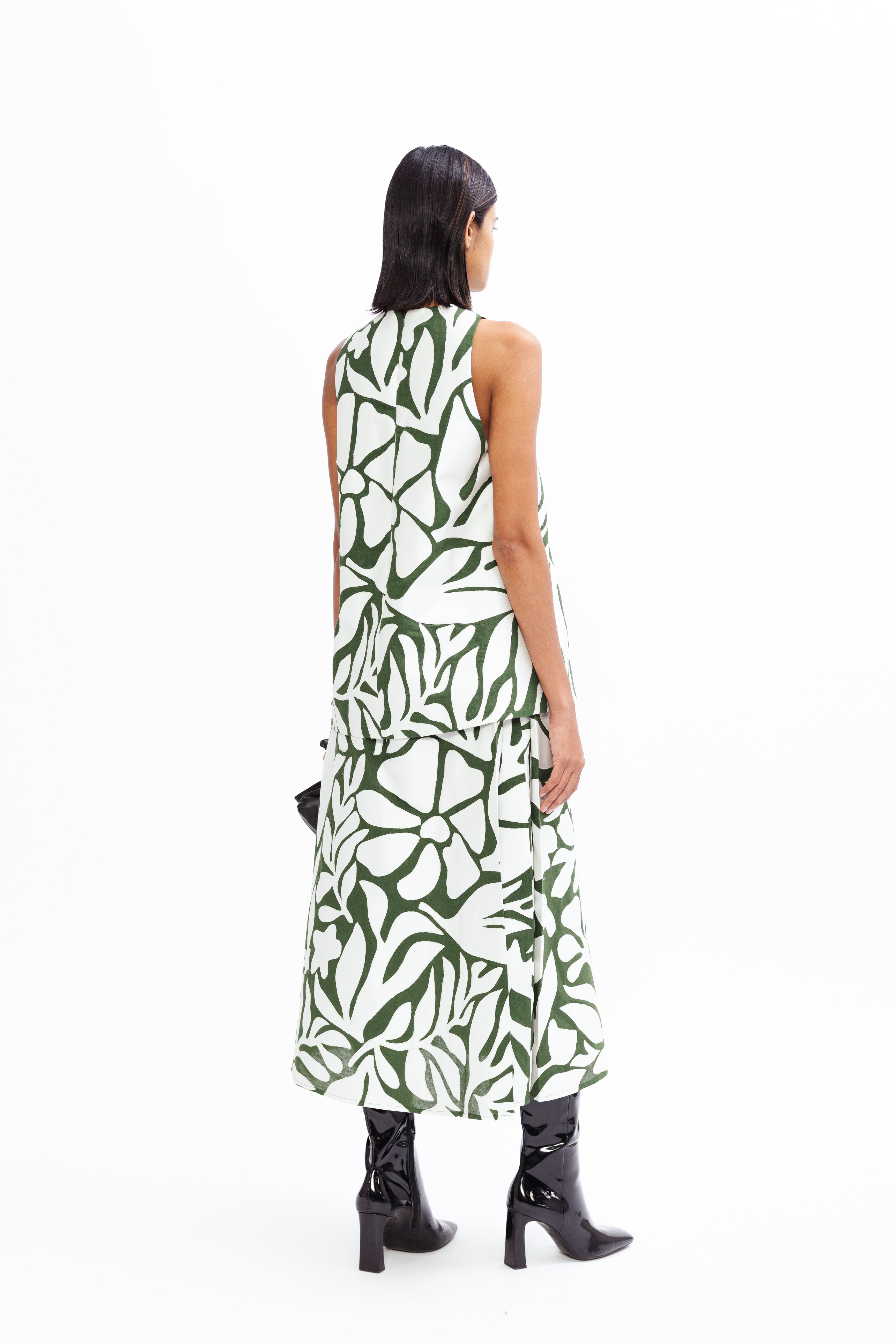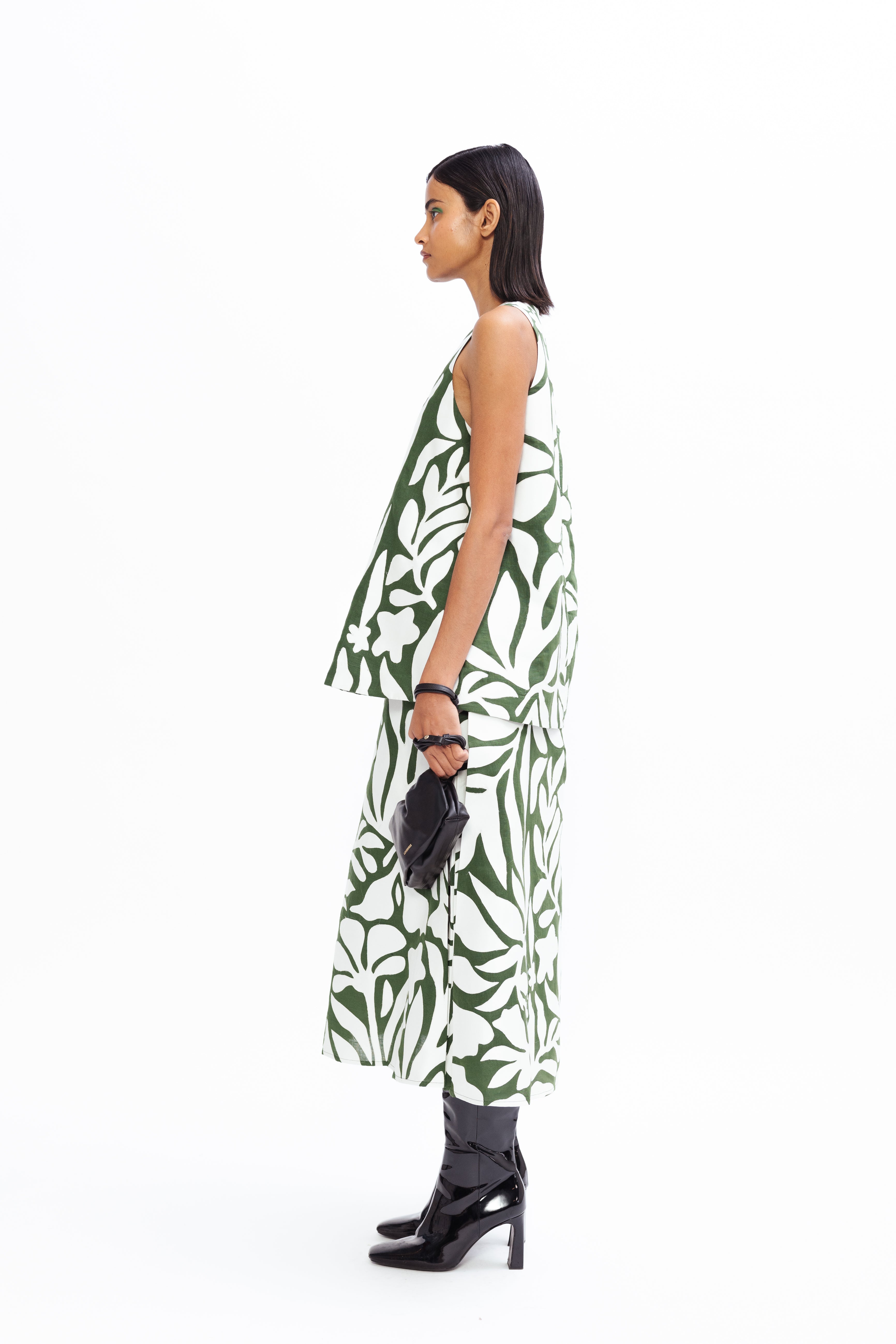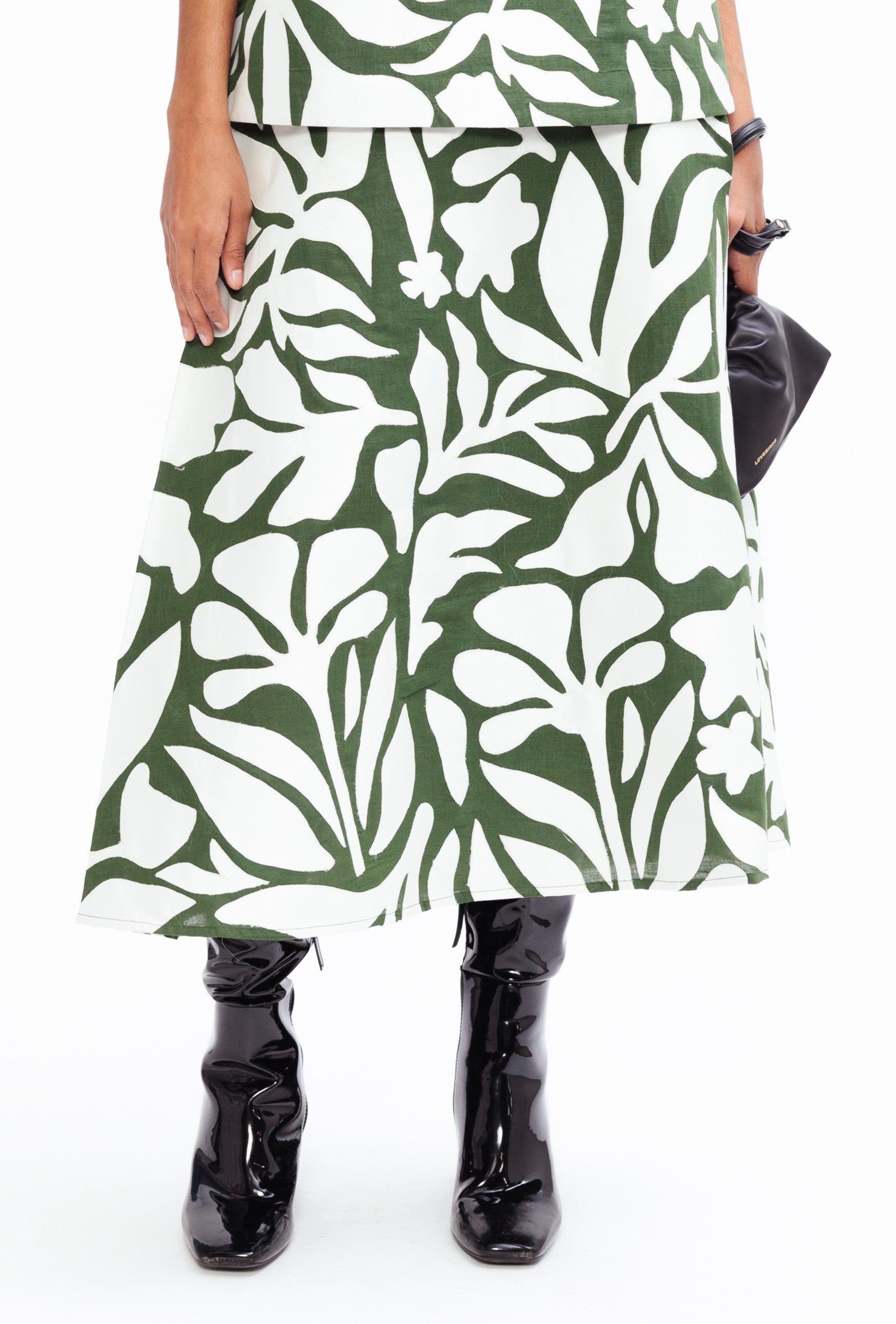 A side-tie midi skirt crafted on a rich hunter green base, featuring ivory bloom patches that bring a soft, artistic contrast. The adjustable side tie enhances the fit while the floral detailing adds depth and charm, creating a graceful piece with a touch of individuality.
