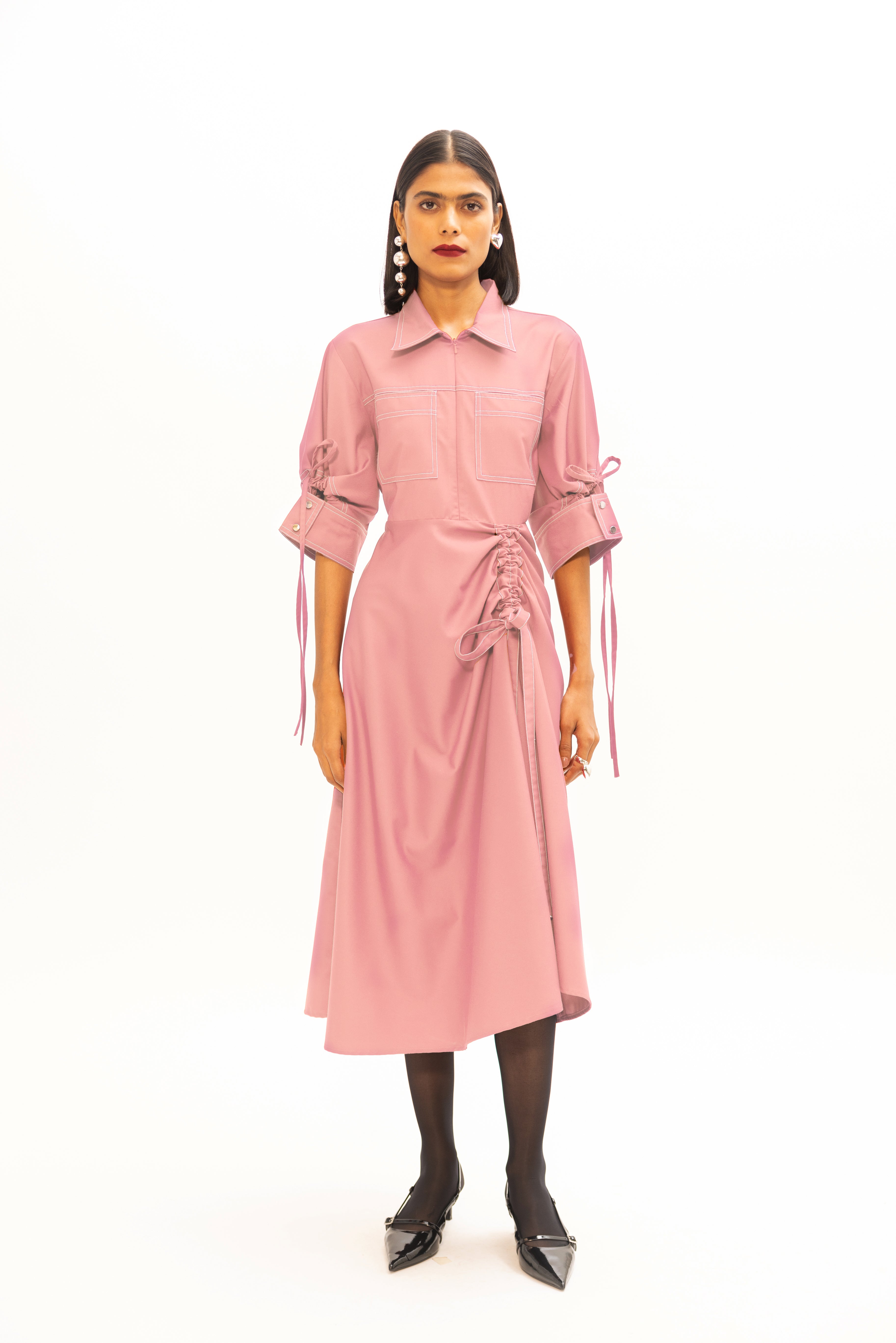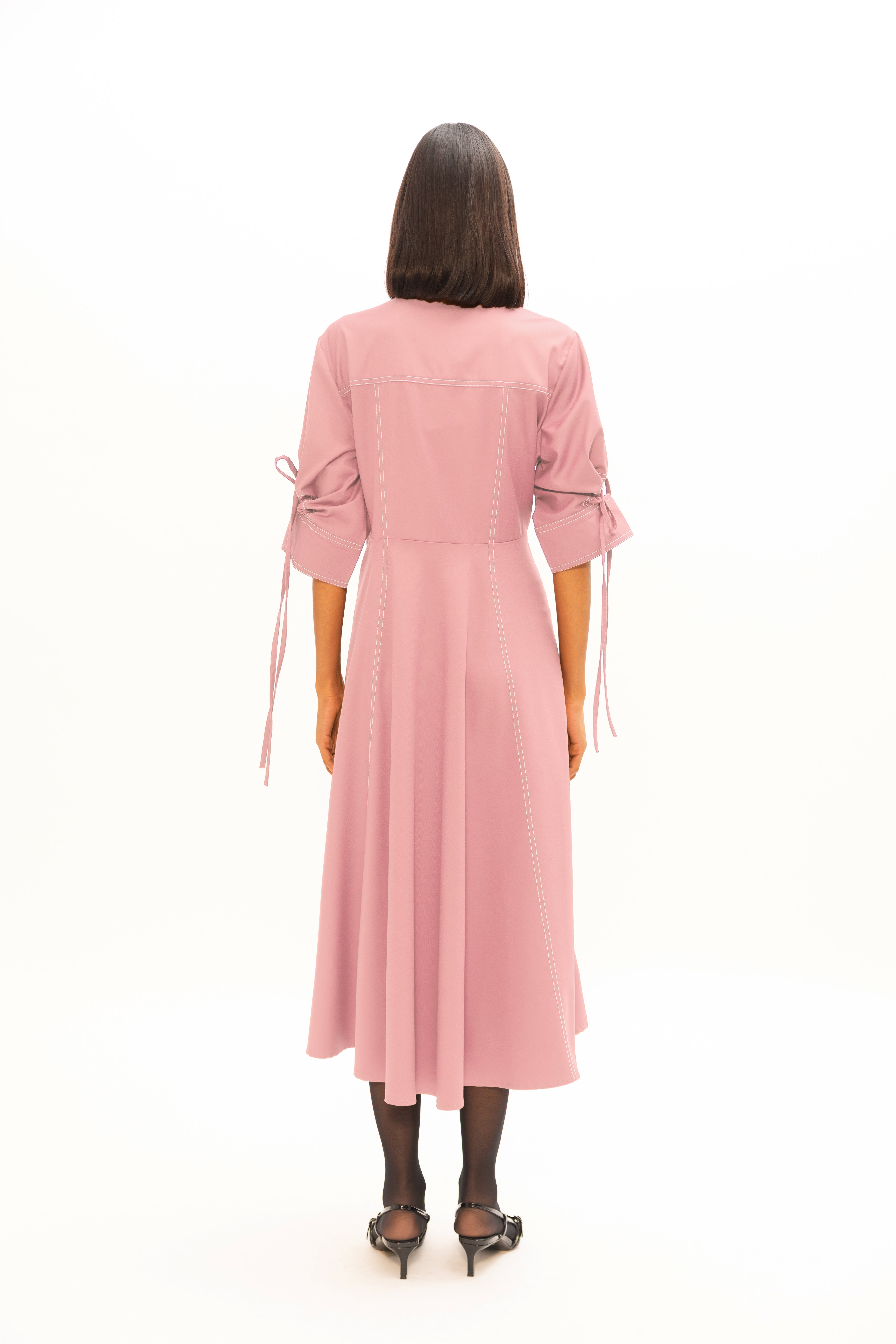 A mid-length dress with contrast top stitching, bust pockets cut out, and tying details at the sleeves exudes a blend of sophistication and playful charm. The contrast topstitching adds visual interest and highlights the dress's silhouette. Bust pockets with cut-out details offer a modern twist on a classic design element. Tying details at the sleeves add a touch of femininity and versatility. Additionally, tying detail below the waist enhances the dress's silhouette and offers a flattering fit. This combination of features creates a stylish and unique ensemble suitable for various occasions, from casual outings to more formal events.