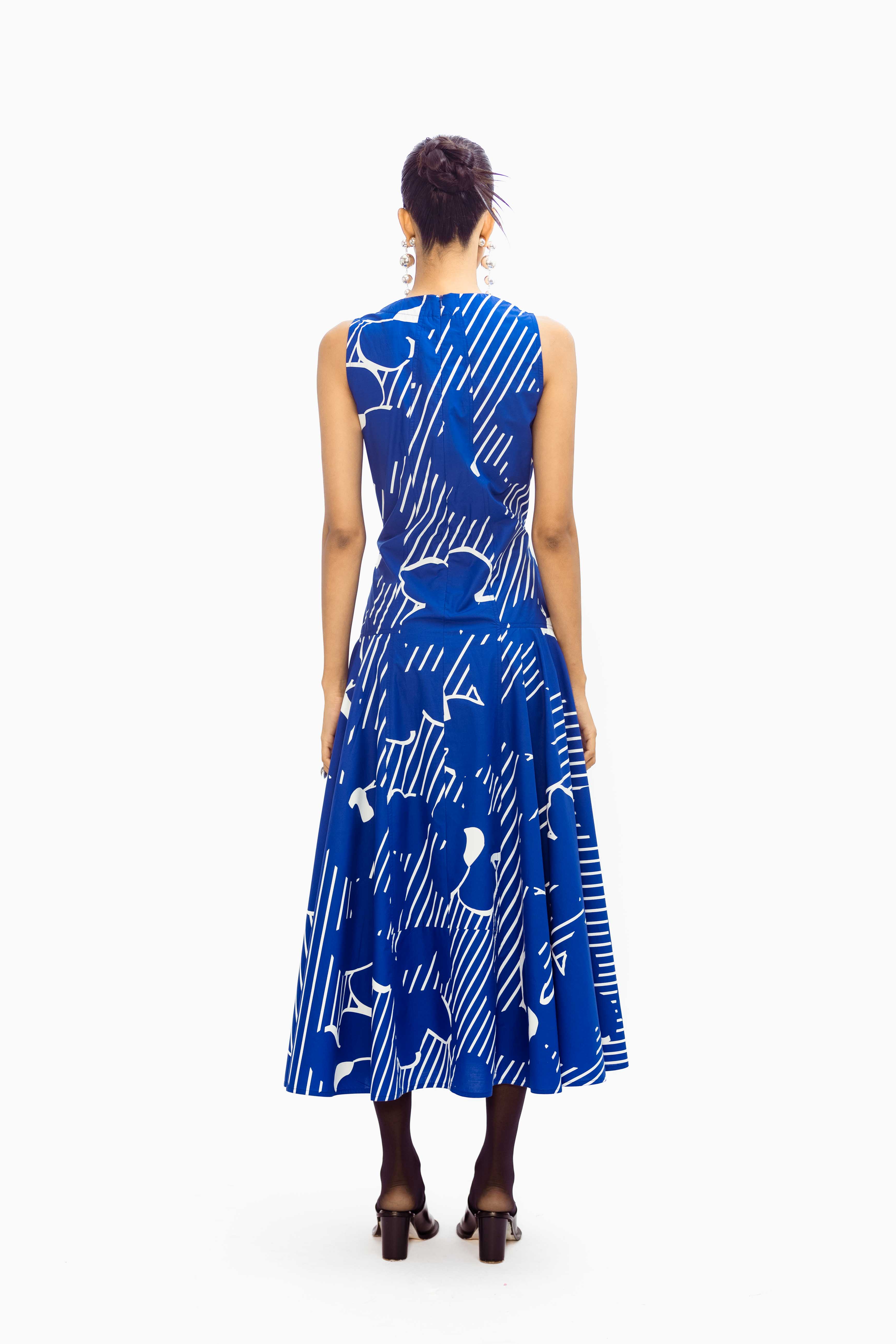 A sleeveless A-line midi dress in rich cobalt blue, accented with a bold graphic white linear print.