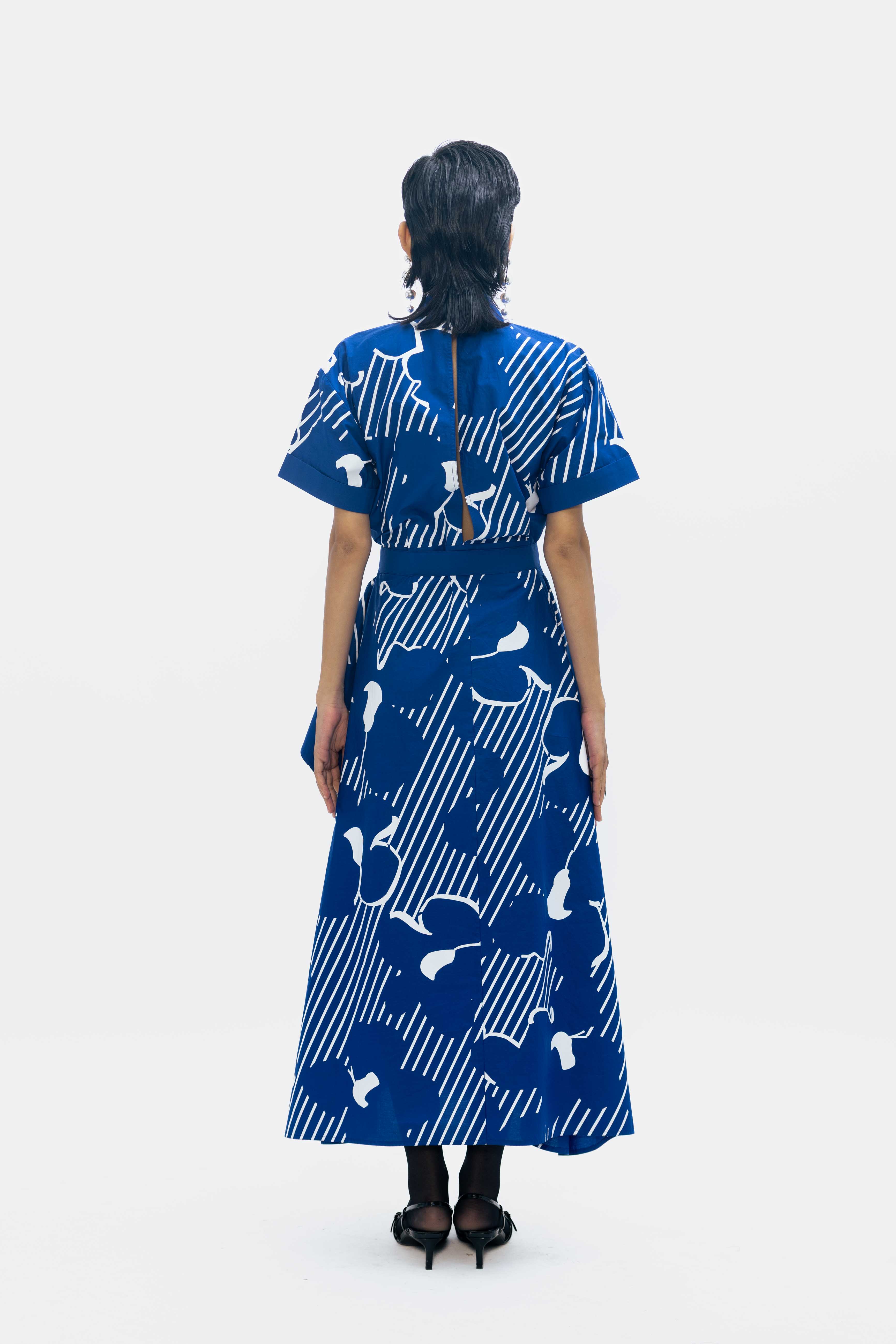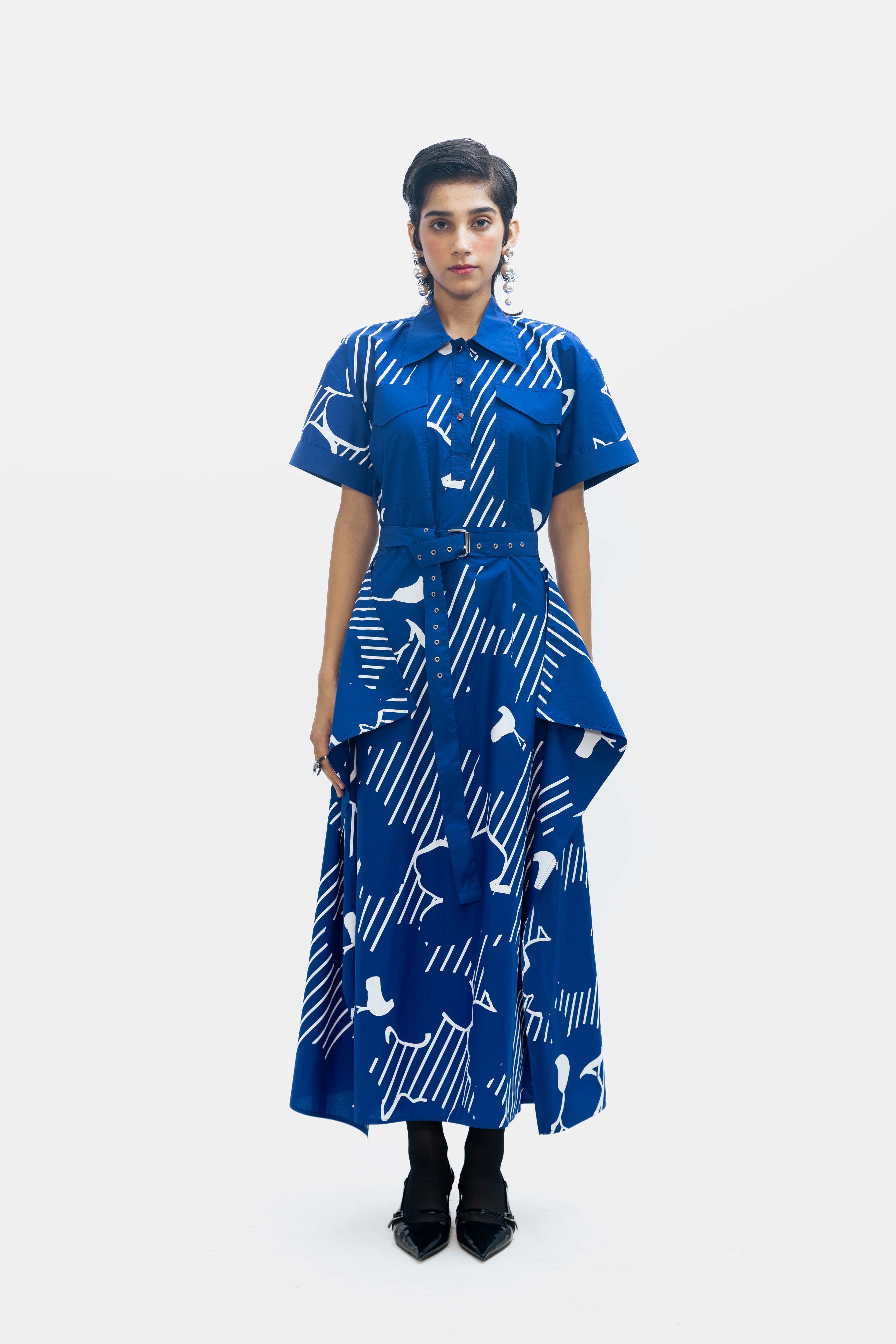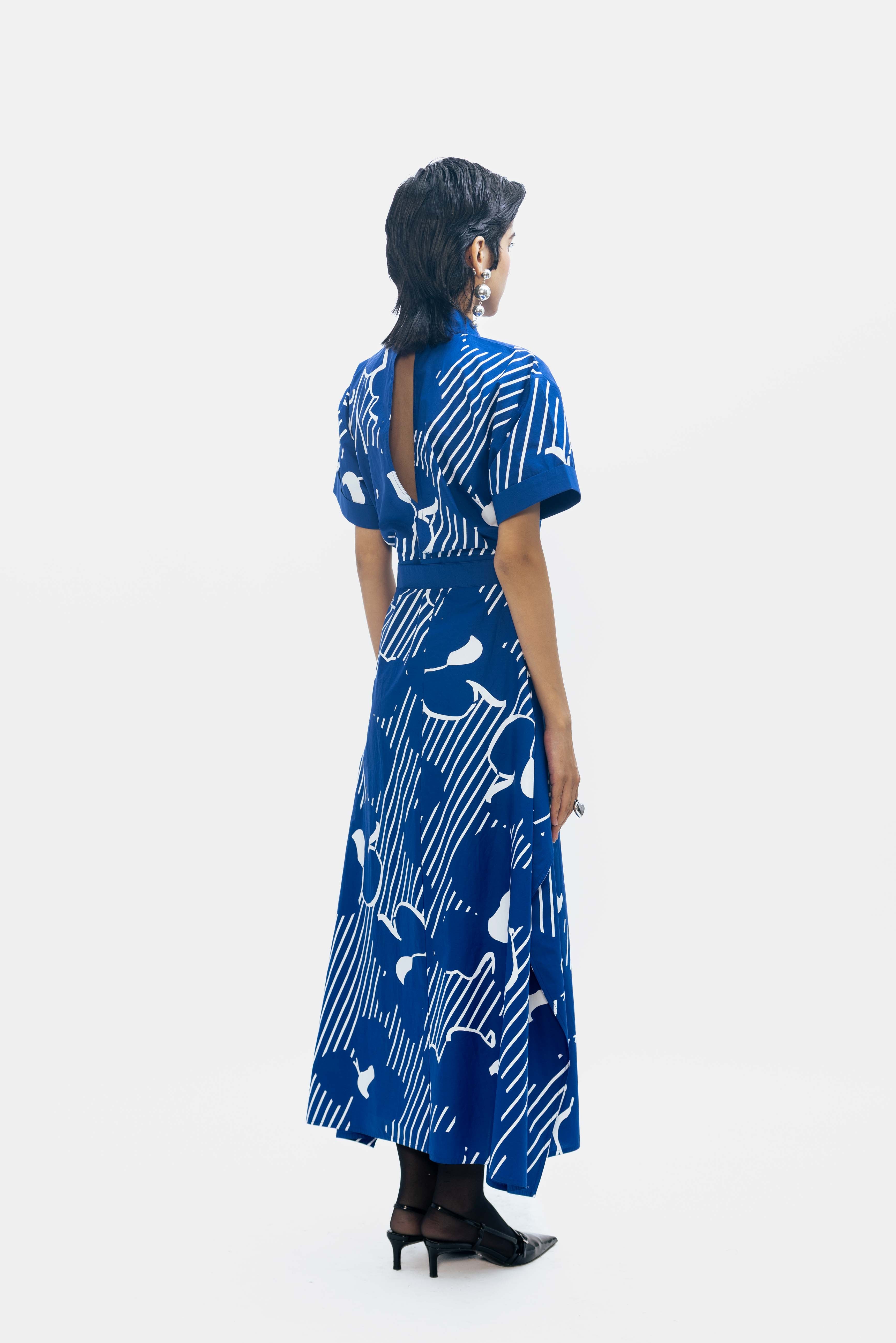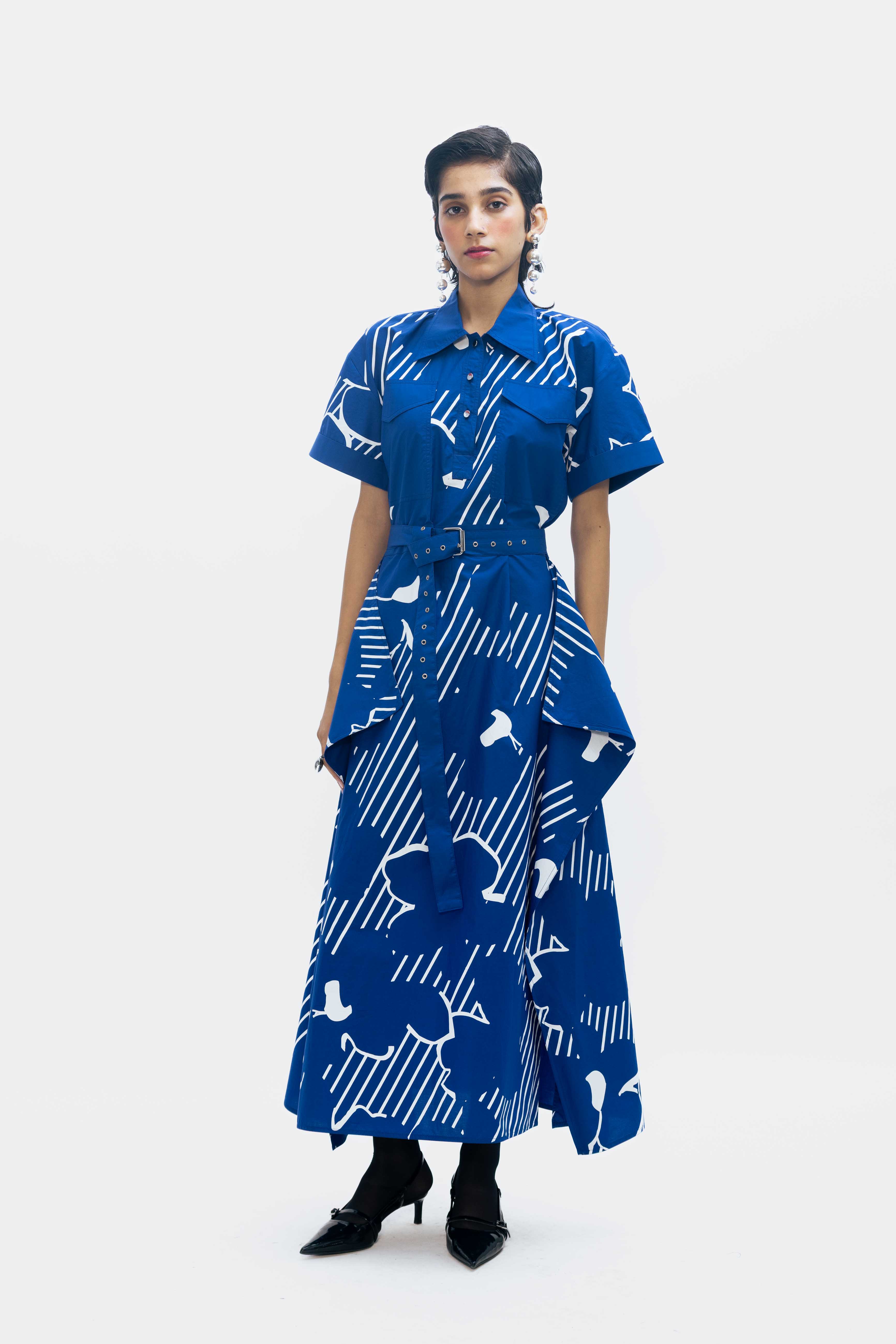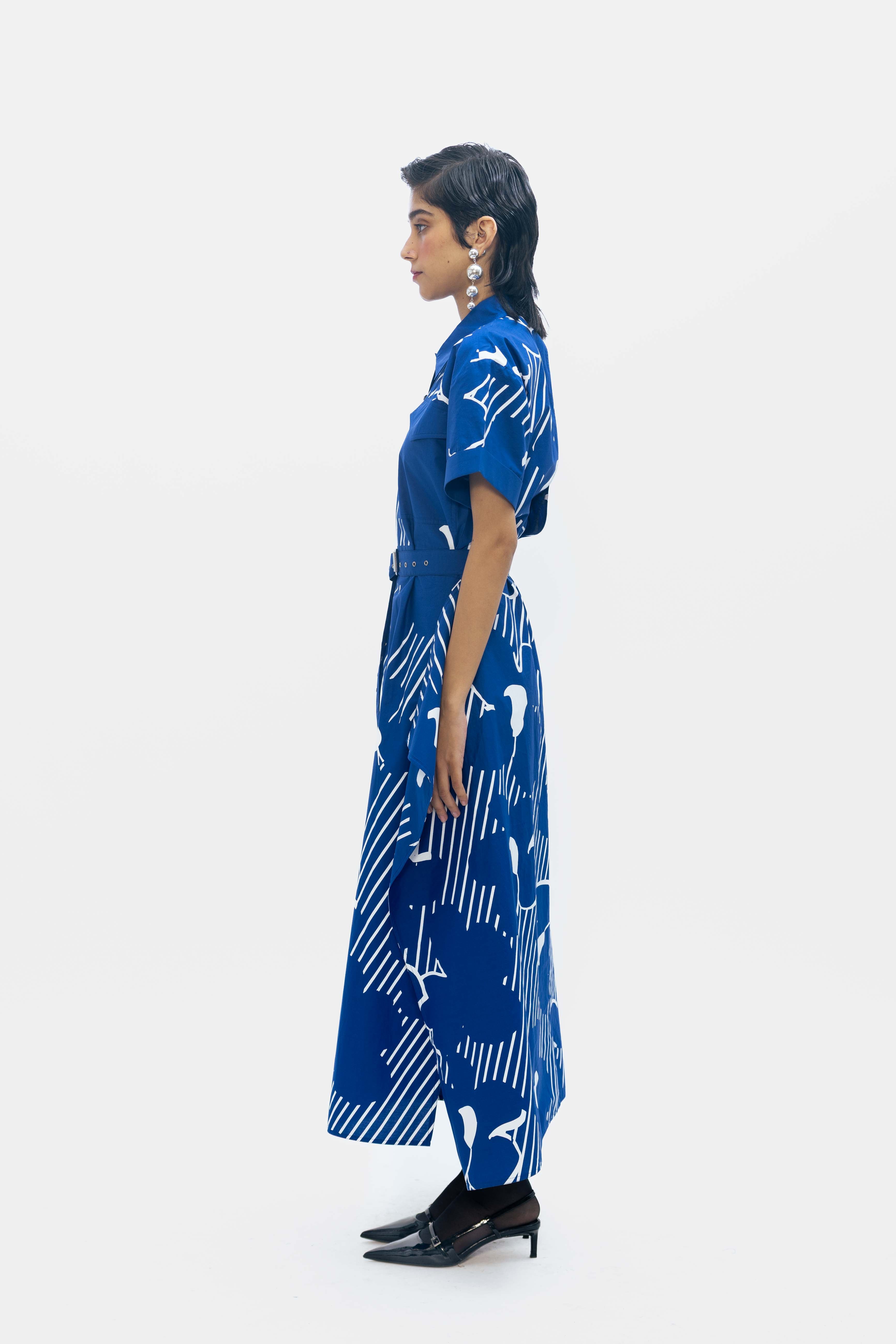 An asymmetric shirt dress in cobalt blue, highlighted with a striking graphic white print.