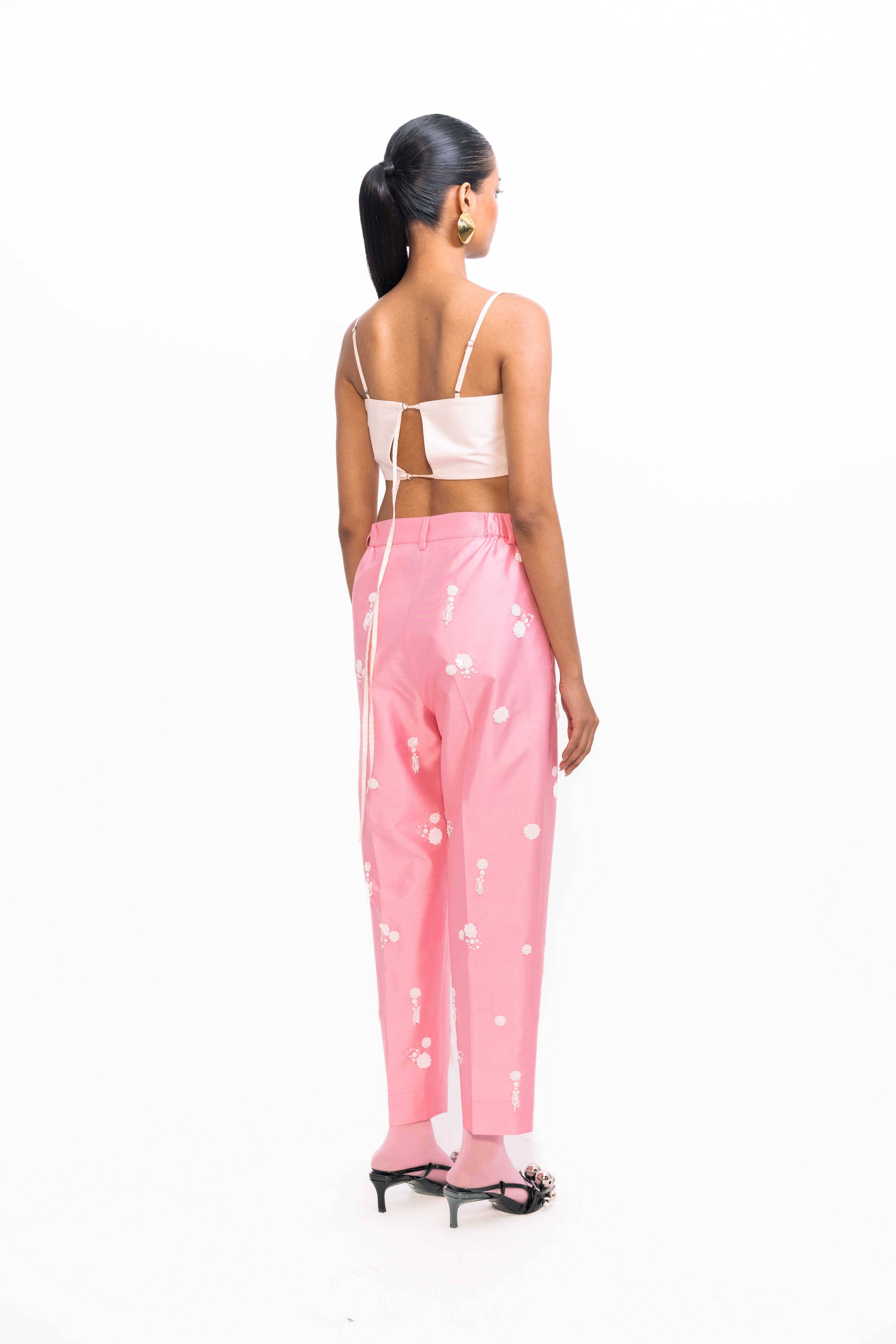 These high-waisted cigarette trousers offer a sleek, tailored silhouette that hugs the body from waist to ankle. Embellished with shimmering floral dangler sequins, they bring a striking, textural sparkle to the classic slim fit. Perfect for evening events or standout styling, this versatile piece pairs effortlessly with everything from minimalist tops to coordinated statement pieces.