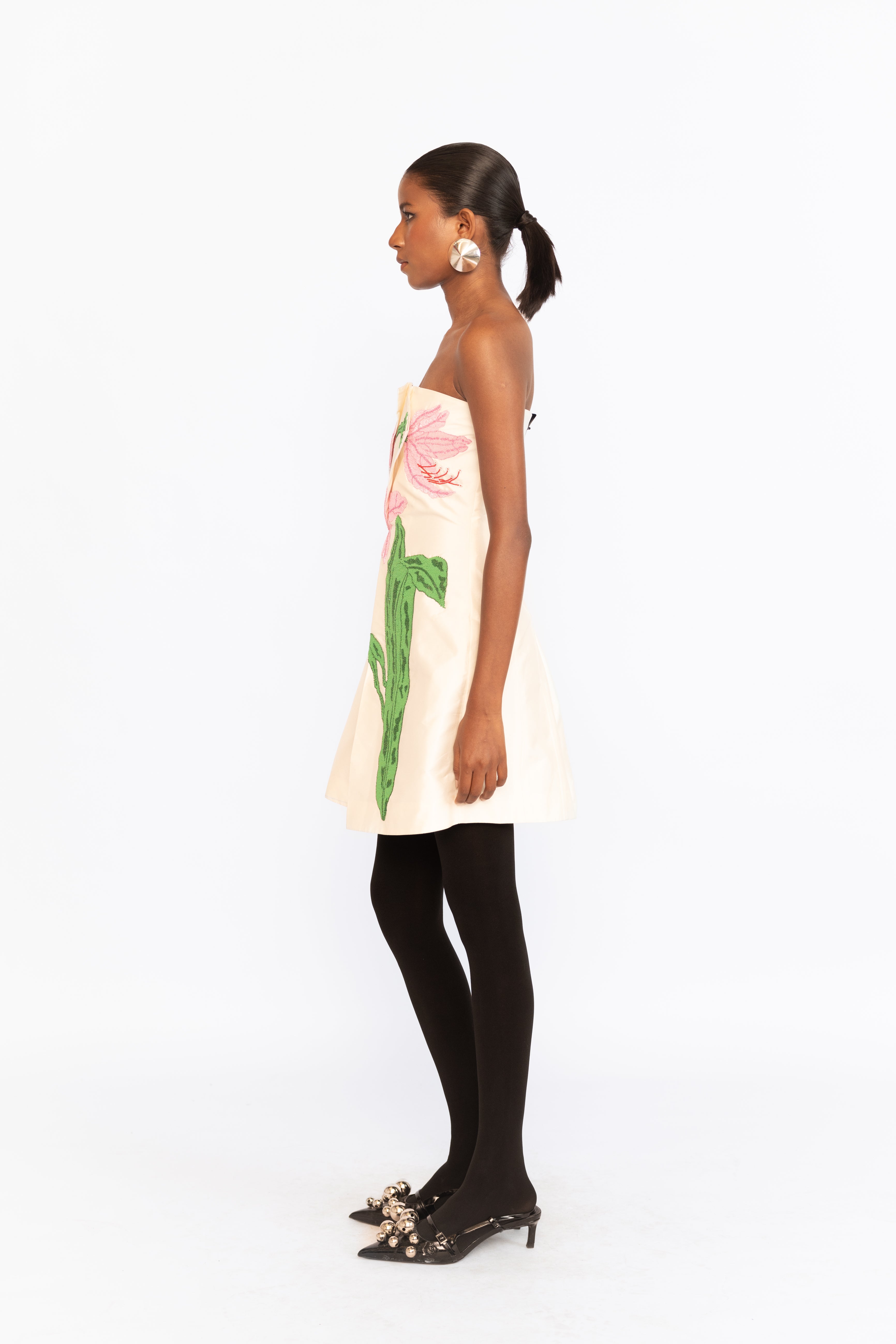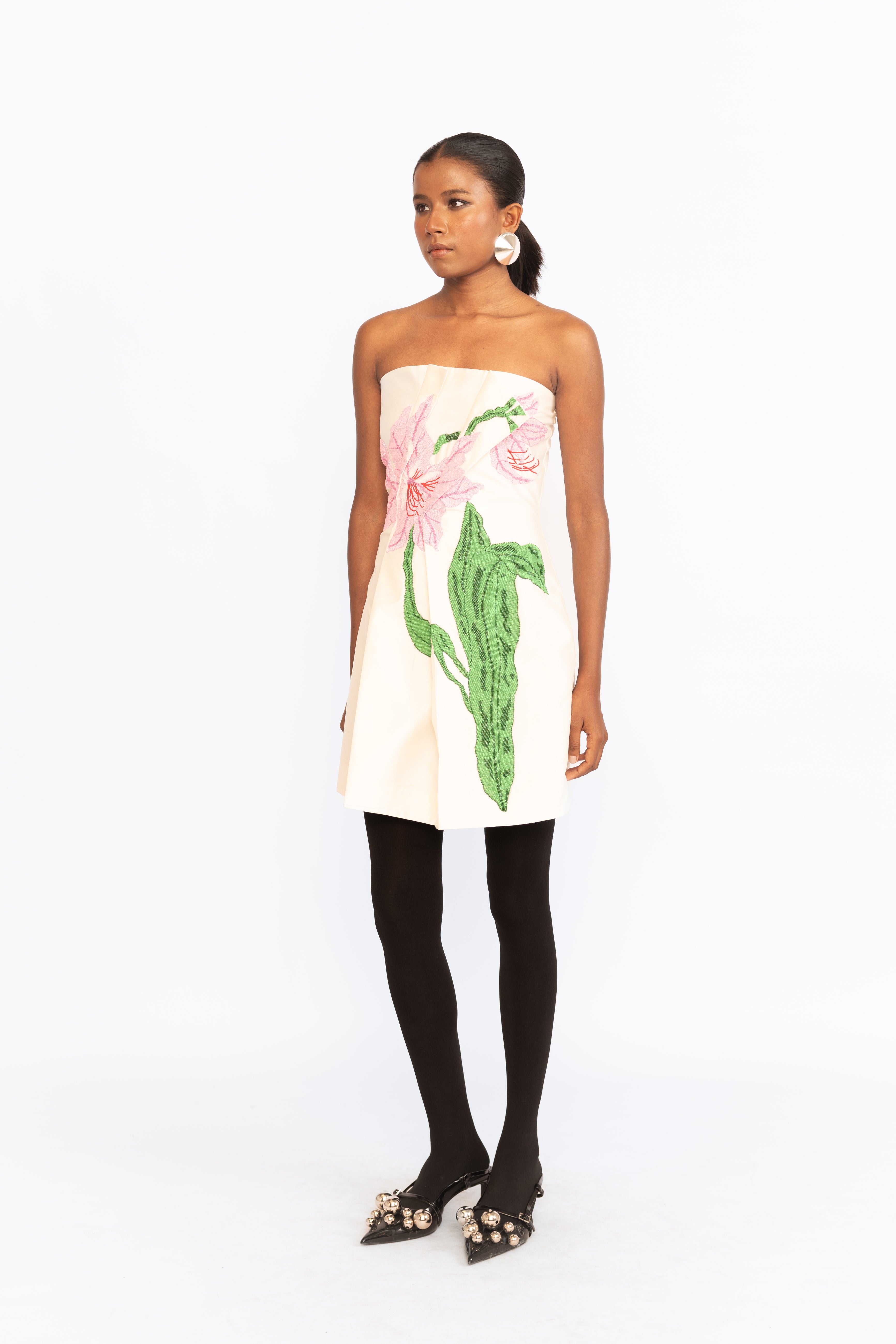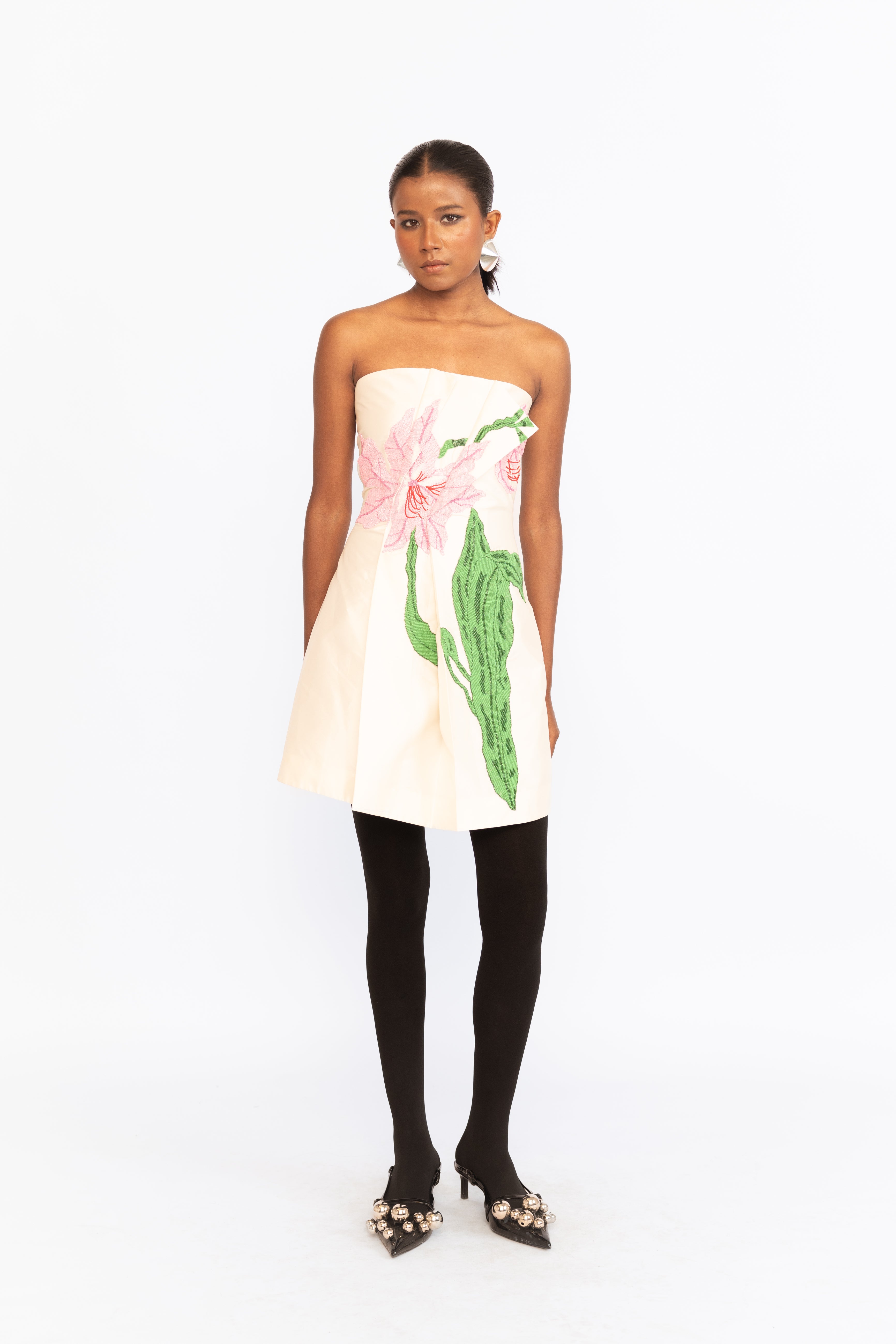 Turn heads in this fitted corset tube dress, designed to sculpt and flatter the silhouette. Intricate floral embroidery embellished with subtle Sequins adds a delicate shimmer, balancing structure with romantic detail—perfect for cocktail parties, evening events, or any occasion that calls for a touch of glamour.