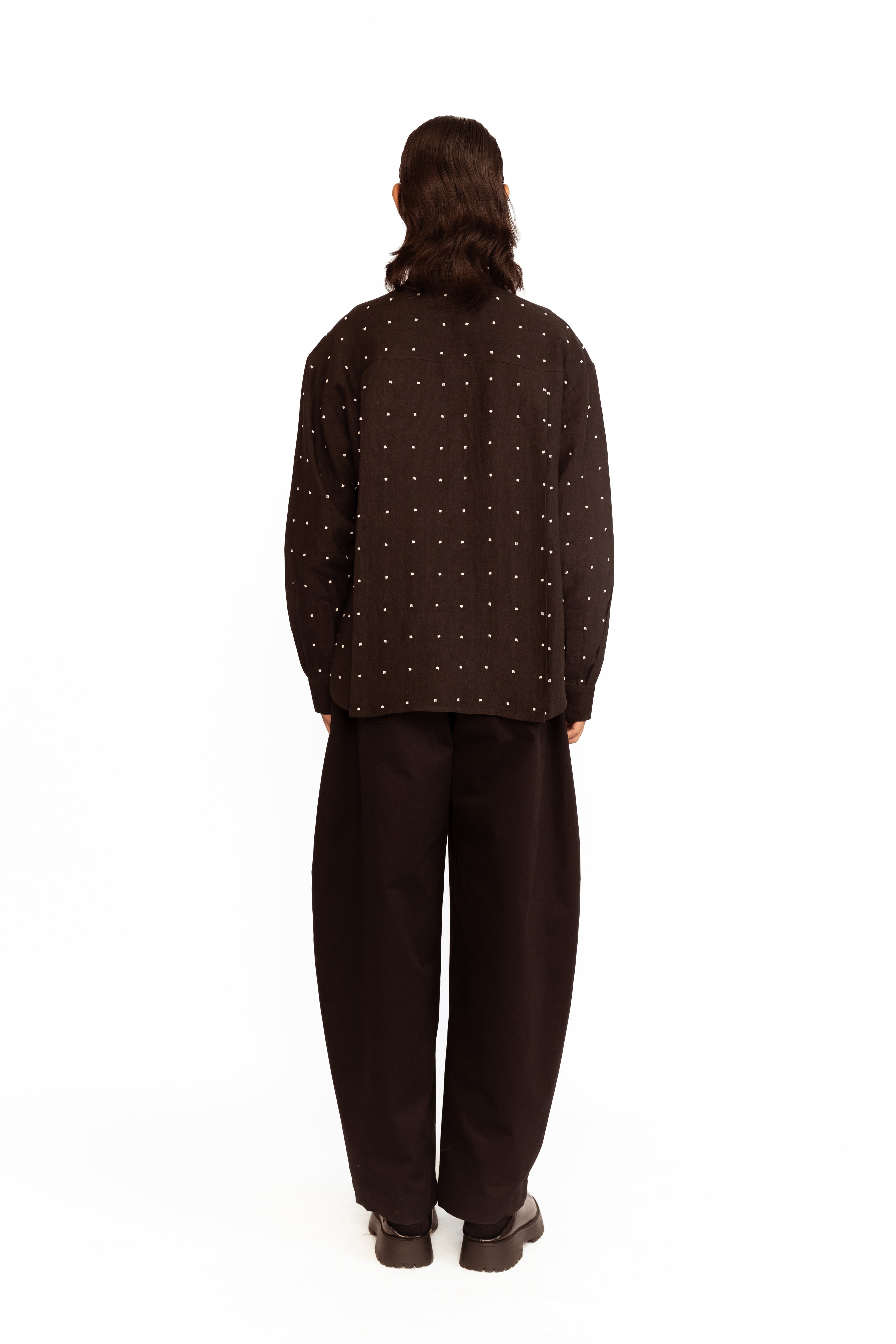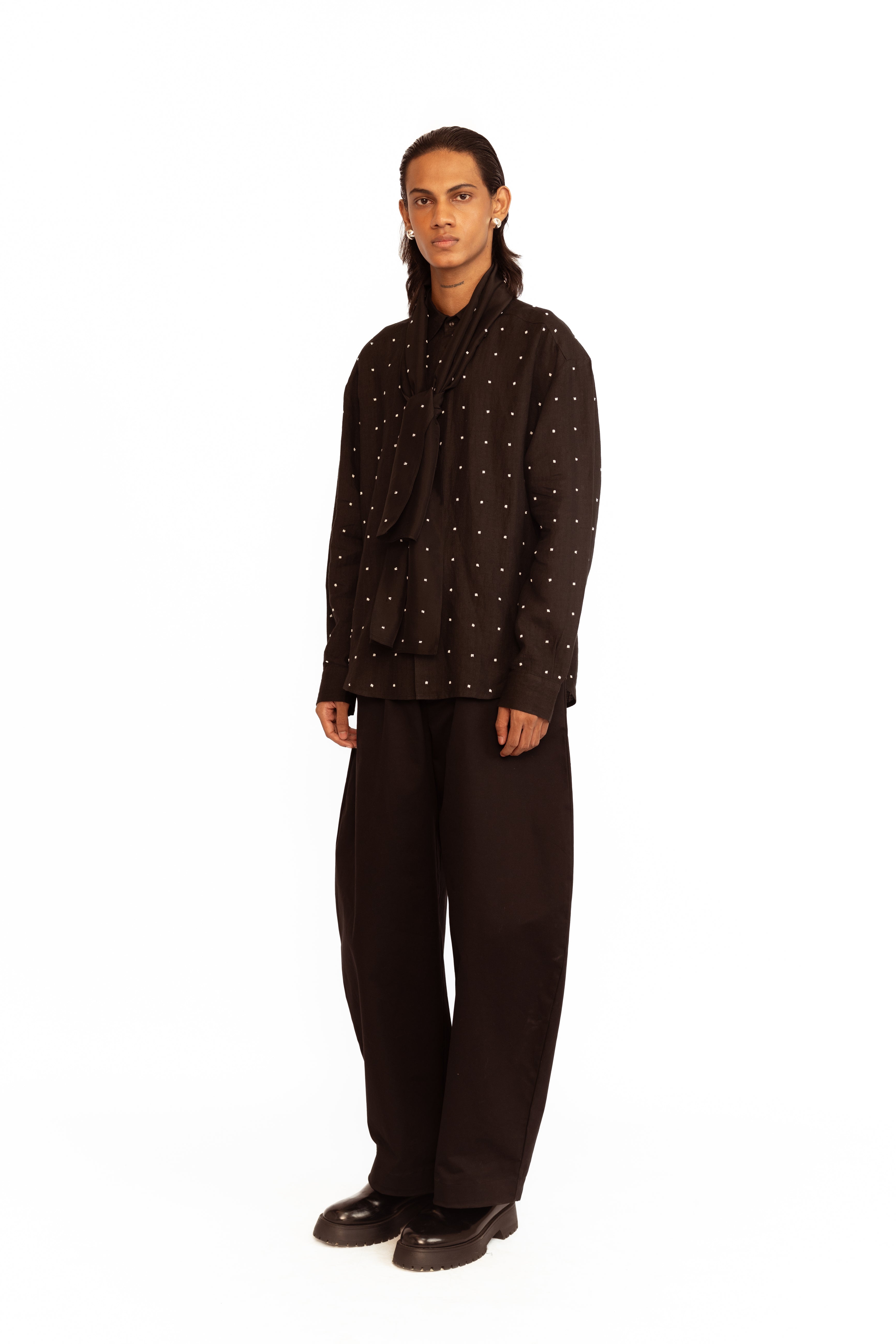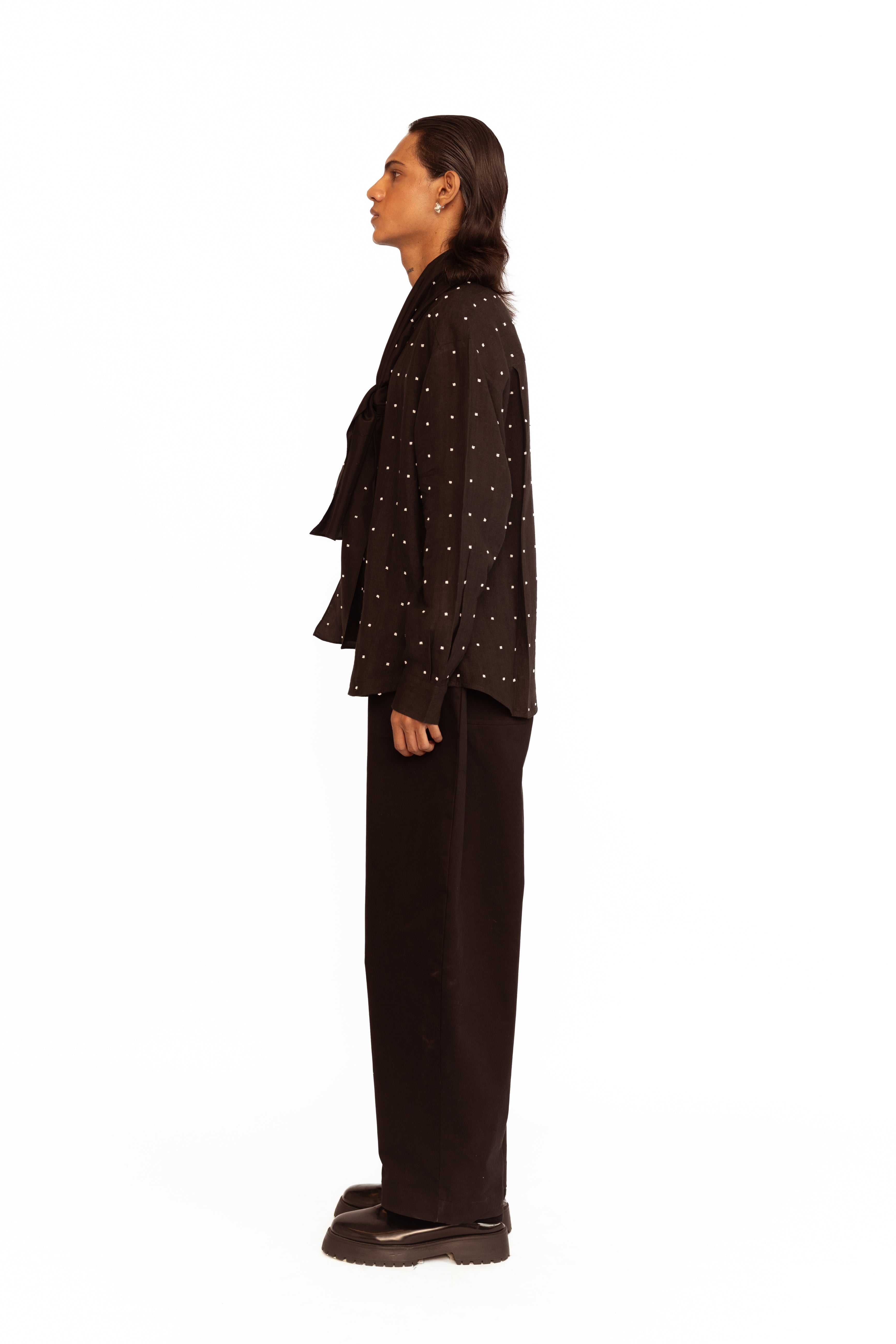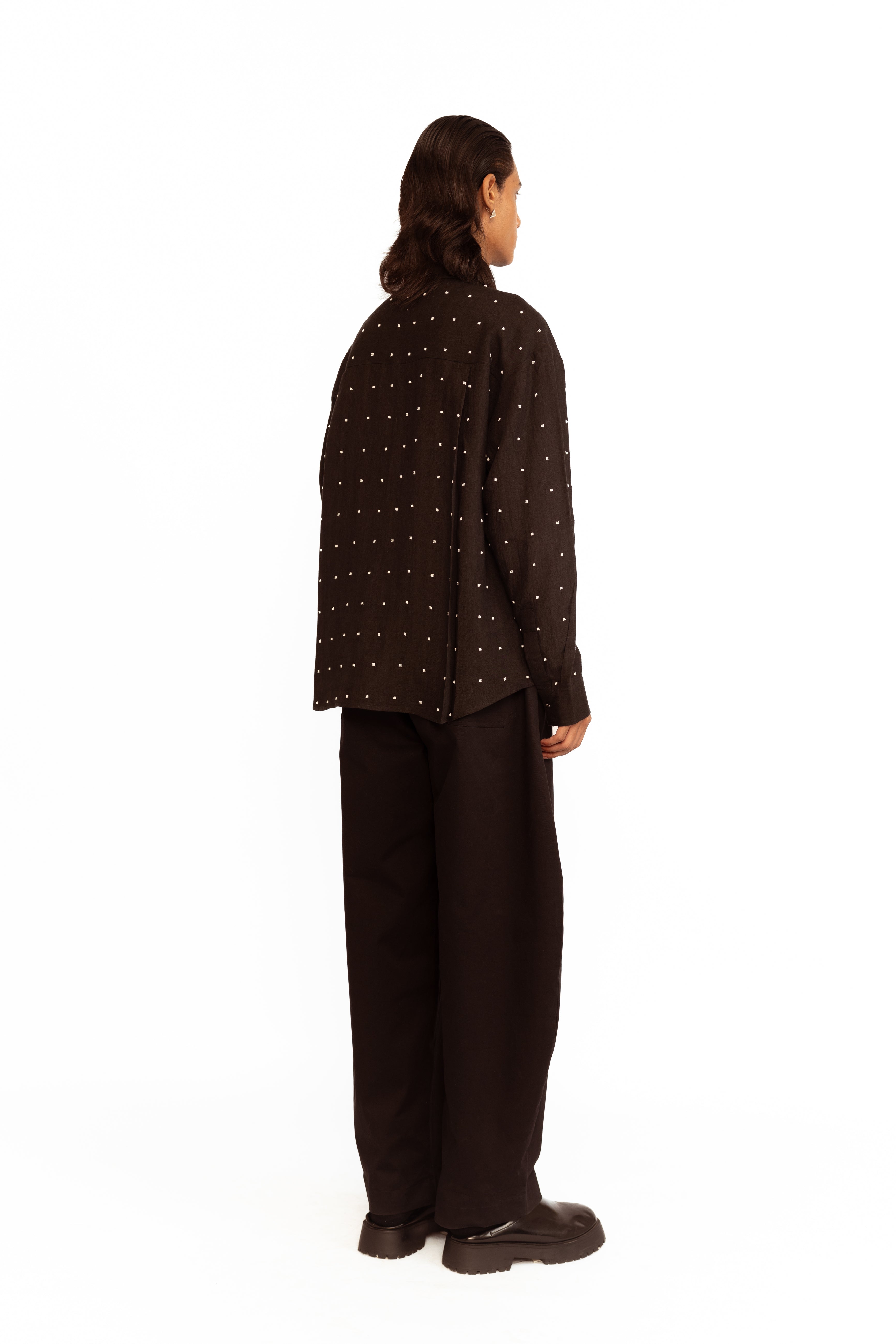 An elevated essential, this full-sleeved men’s shirt is adorned with intricate grid bead embroidery, lending a sophisticated touch to classic tailoring.