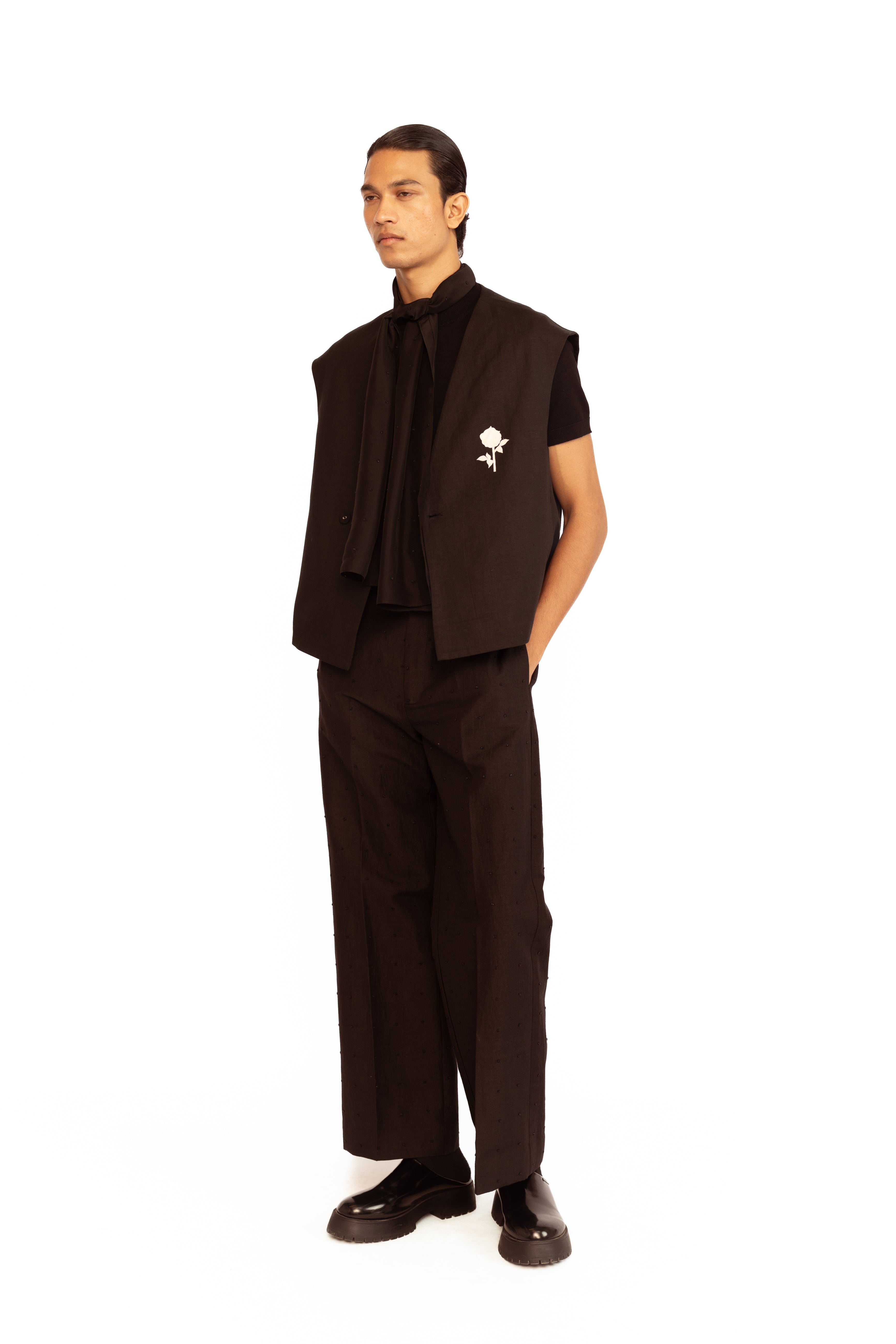 A contemporary classic — this sleeveless vest is elevated with intricate rose applique, blending modern tailoring with artistic detailing.