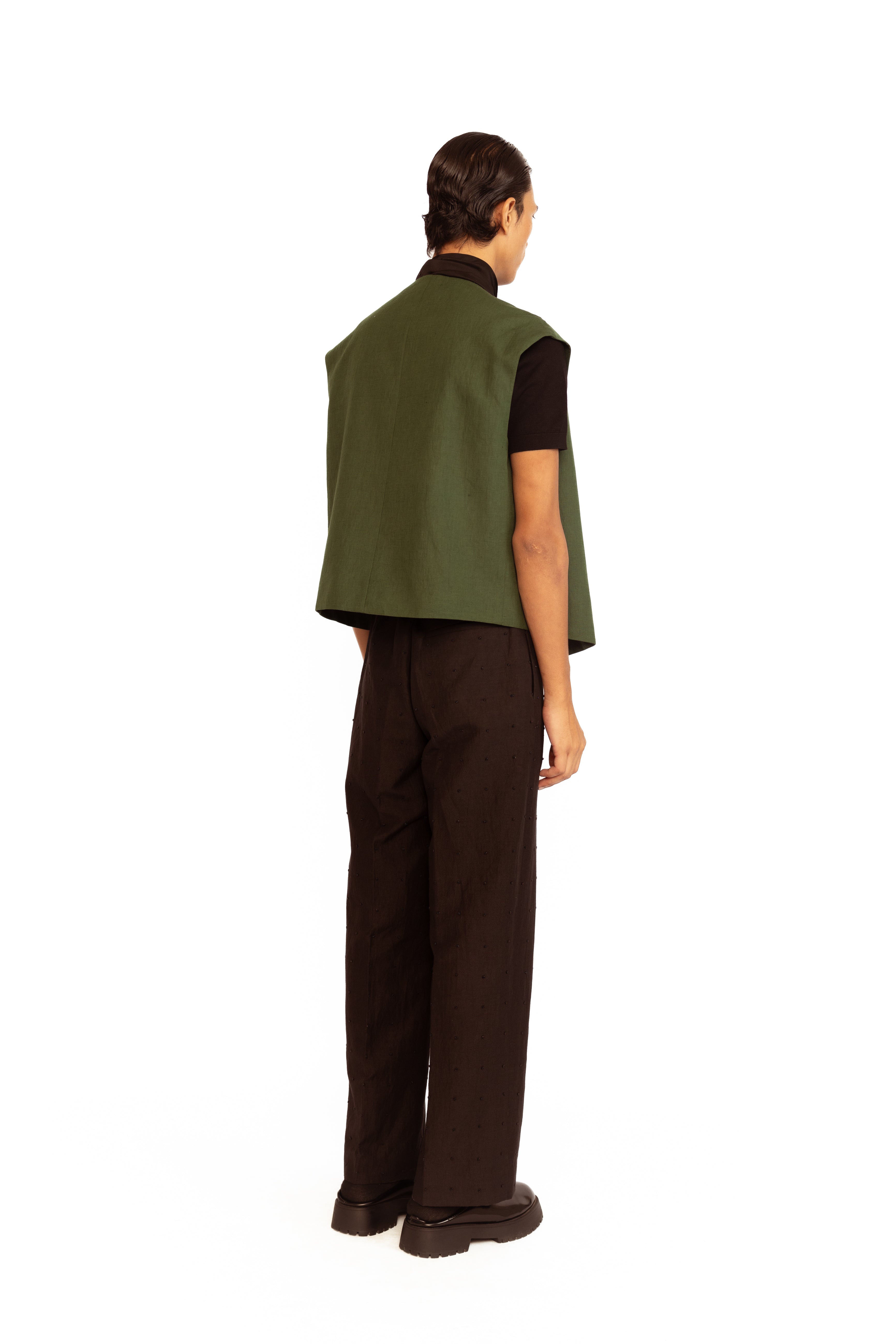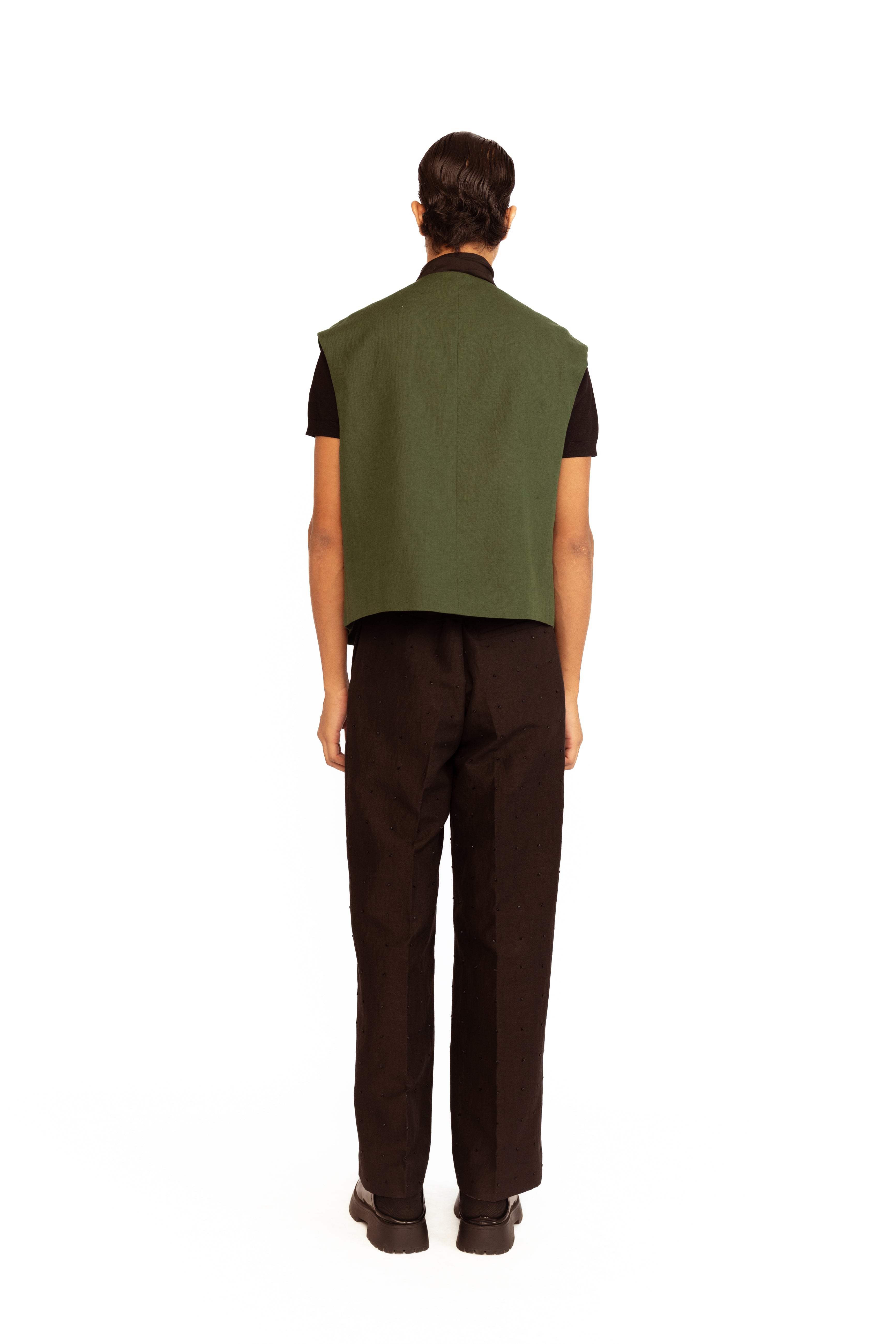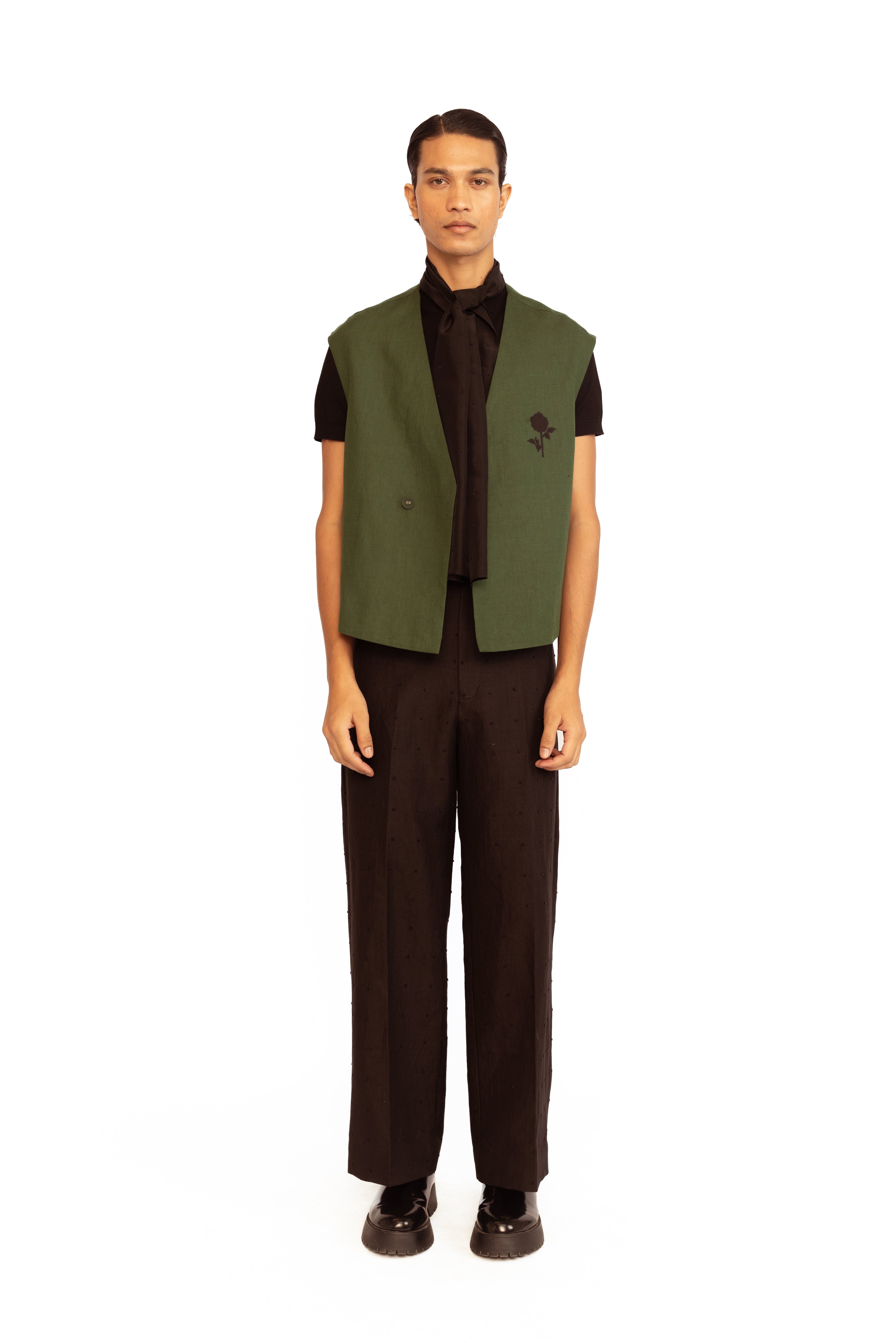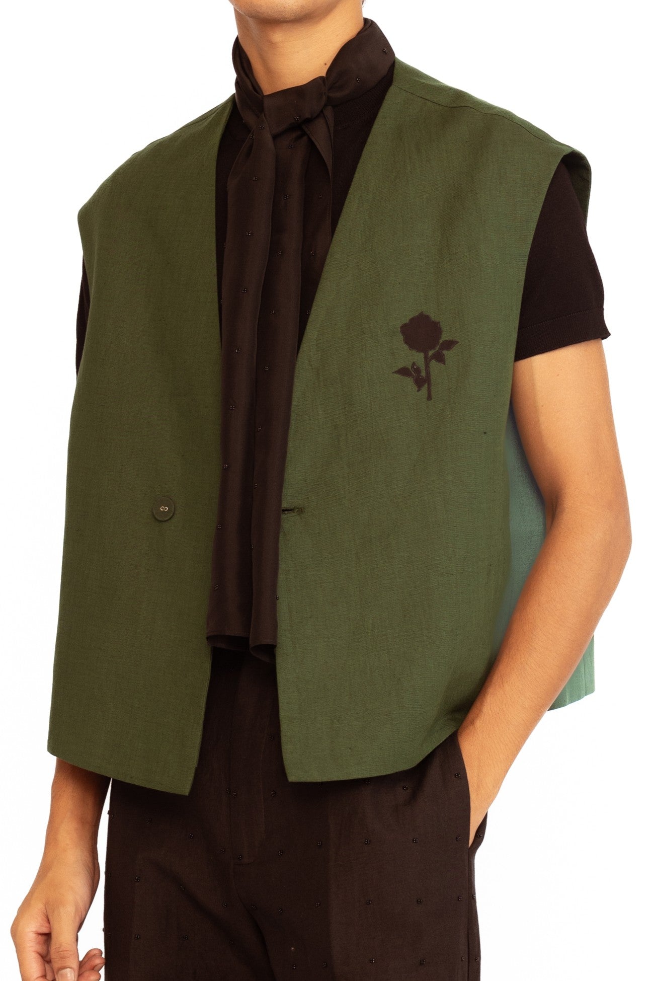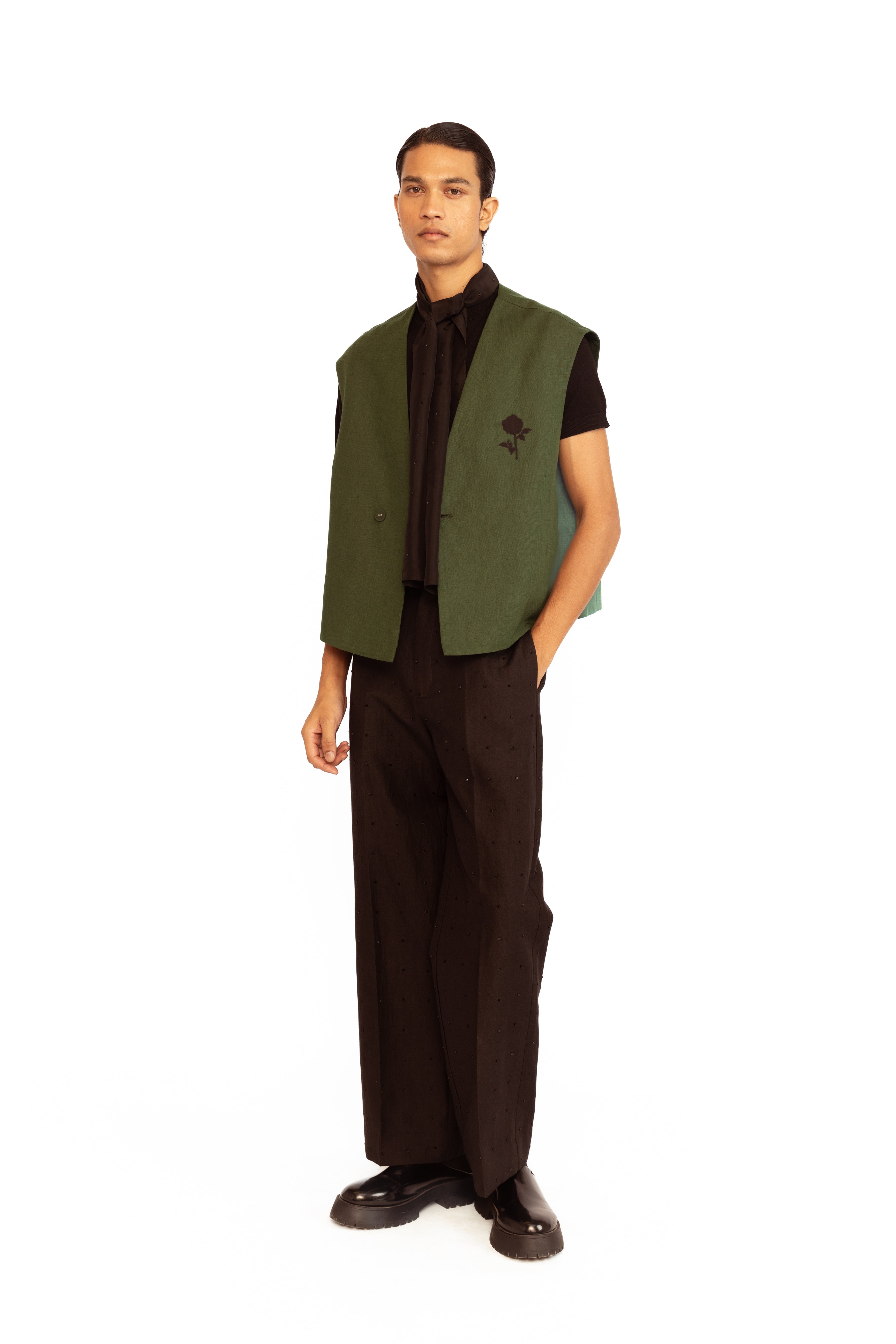 A contemporary classic — this sleeveless vest is elevated with intricate rose applique, blending modern tailoring with artistic detailing.