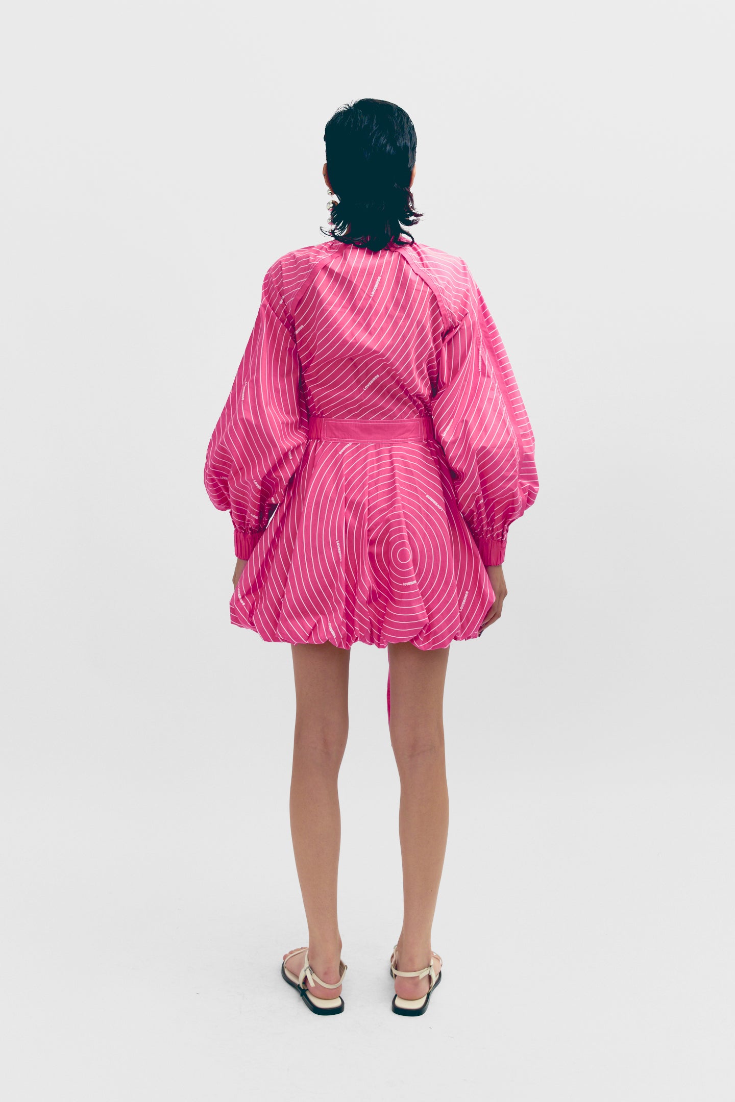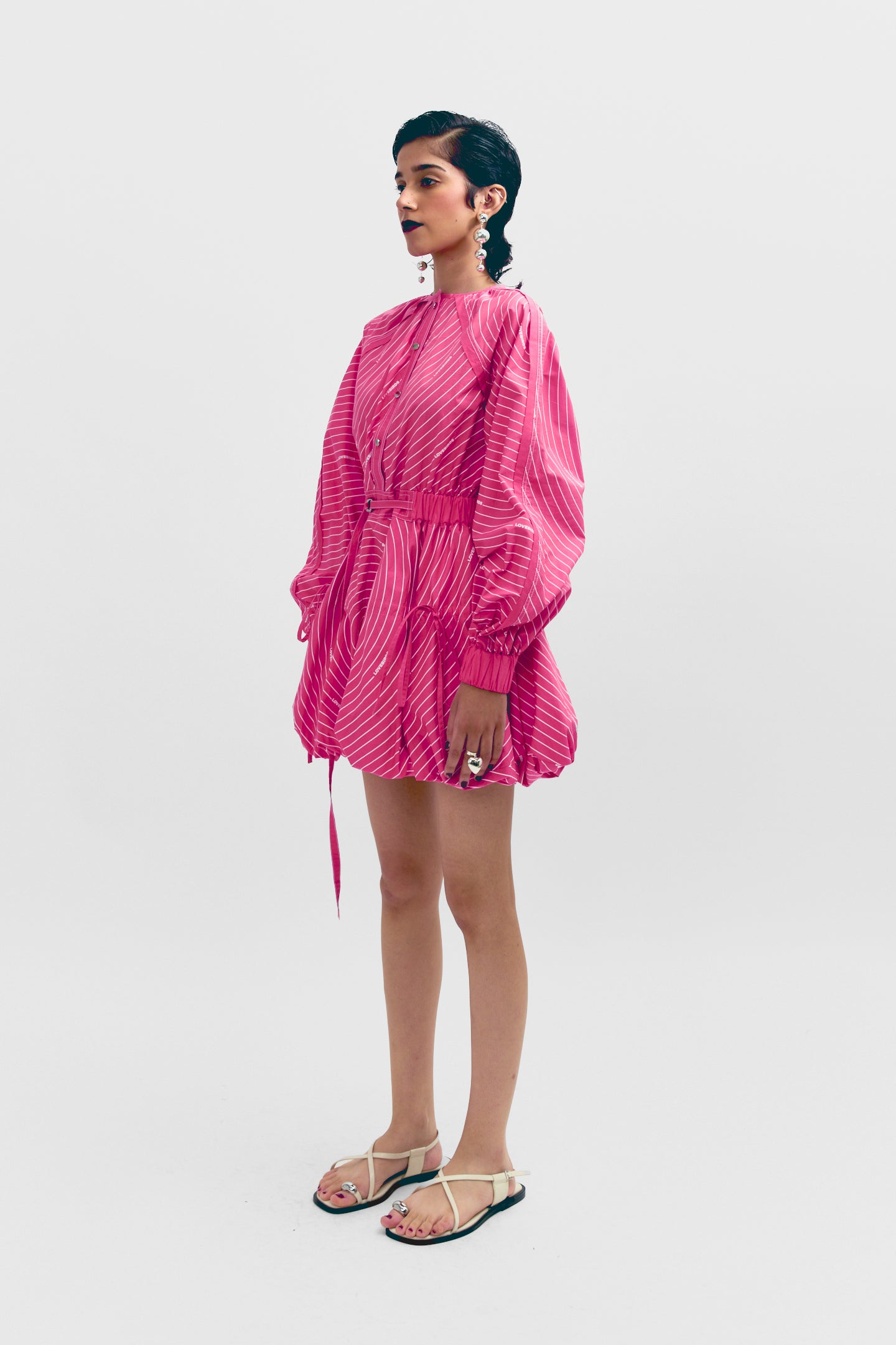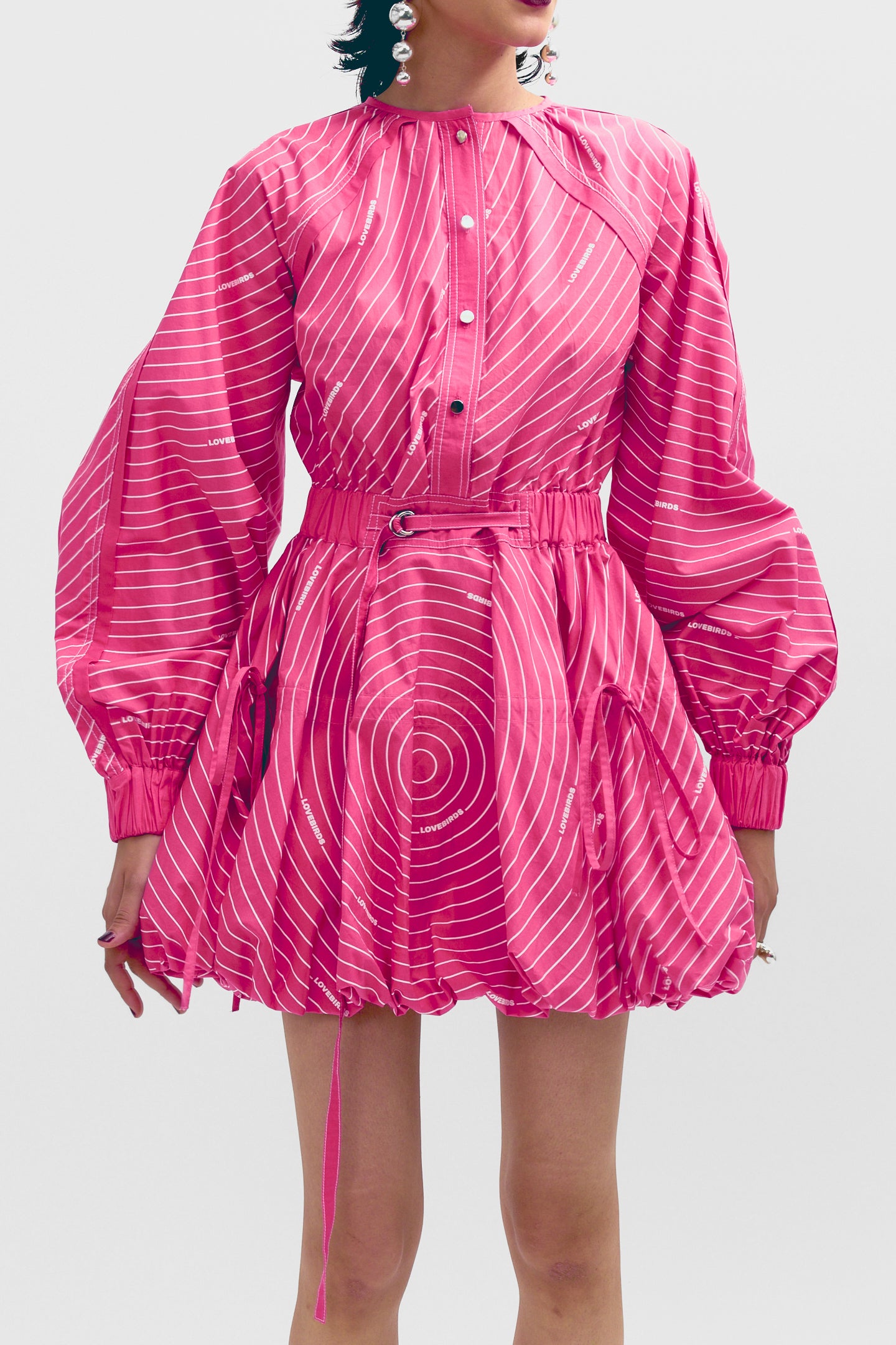 This short balloon dress features a playful silhouette with a balloon skirt and raglan sleeves, offering both comfort and style. The attached belt cinches the waist for a flattering fit and adds a touch of definition to the relaxed silhouette. Perfect for a casual yet chic look.