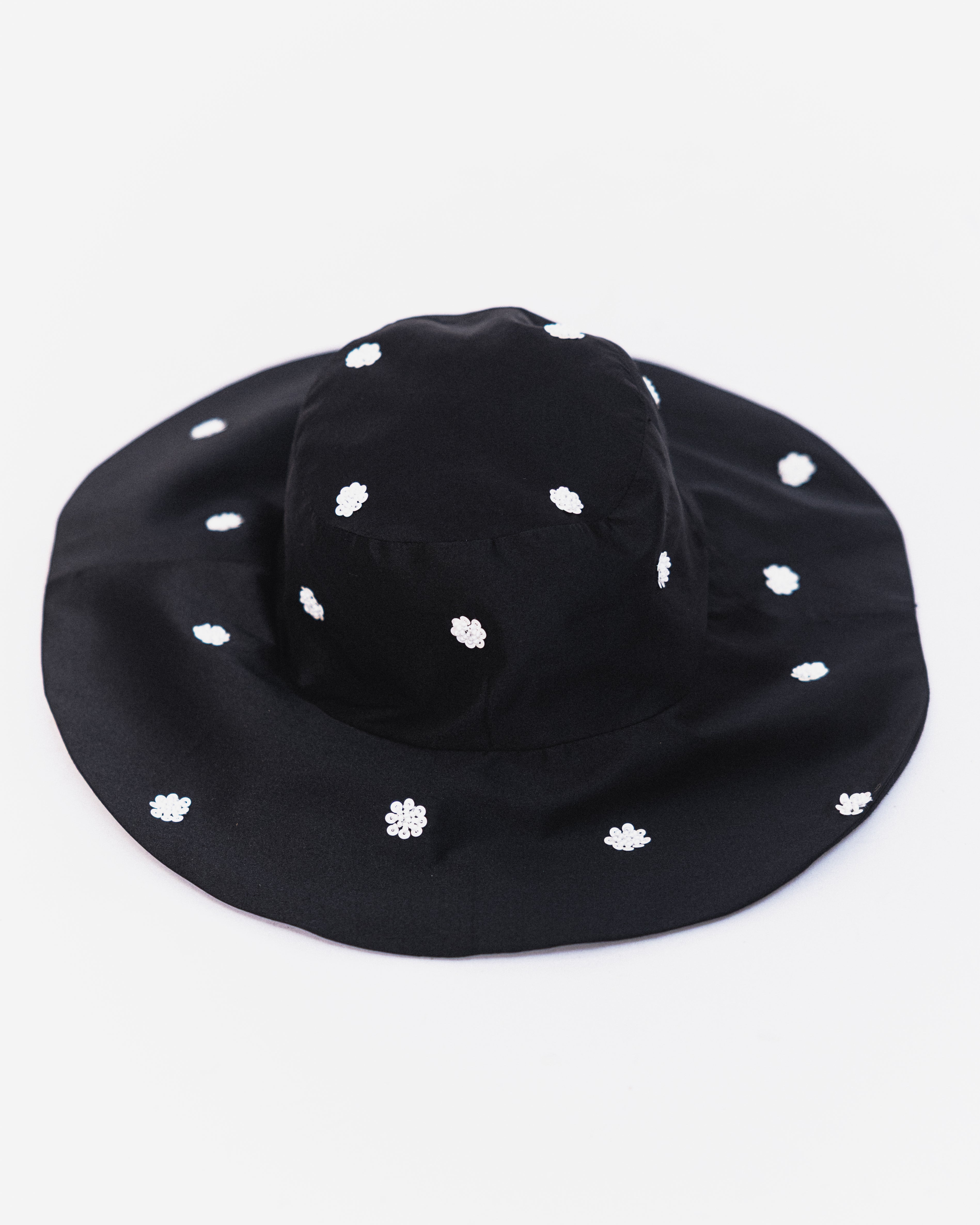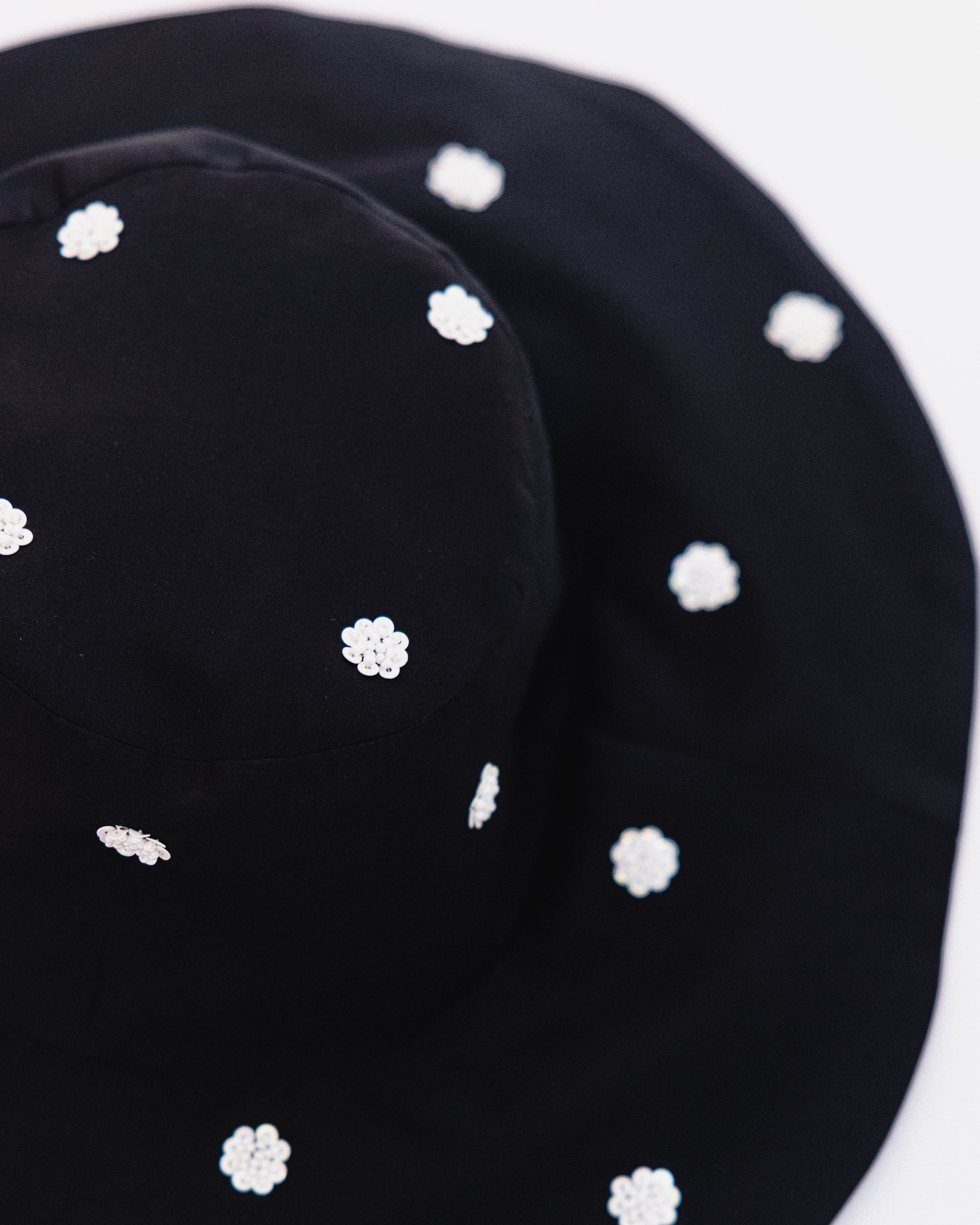 A classic silhouette with a subtle sparkle. This bucket hat is elevated with precise grid-pattern sequin embroidery, adding a modern geometric sheen to a timeless shape. Lightweight yet structured, it brings just the right touch of shine—perfect for daytime edge or evening flair. A standout accessory that turns simplicity into statement.