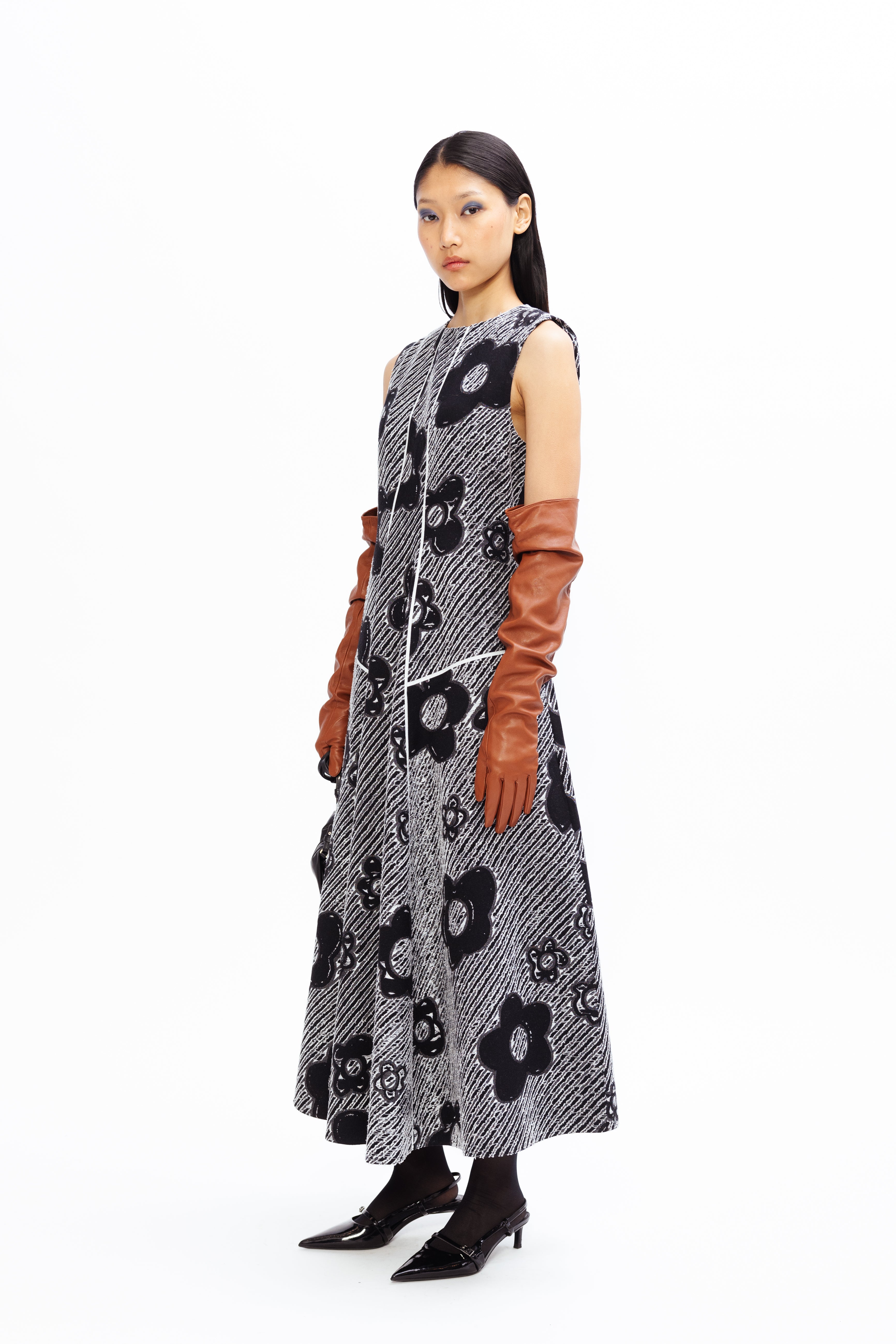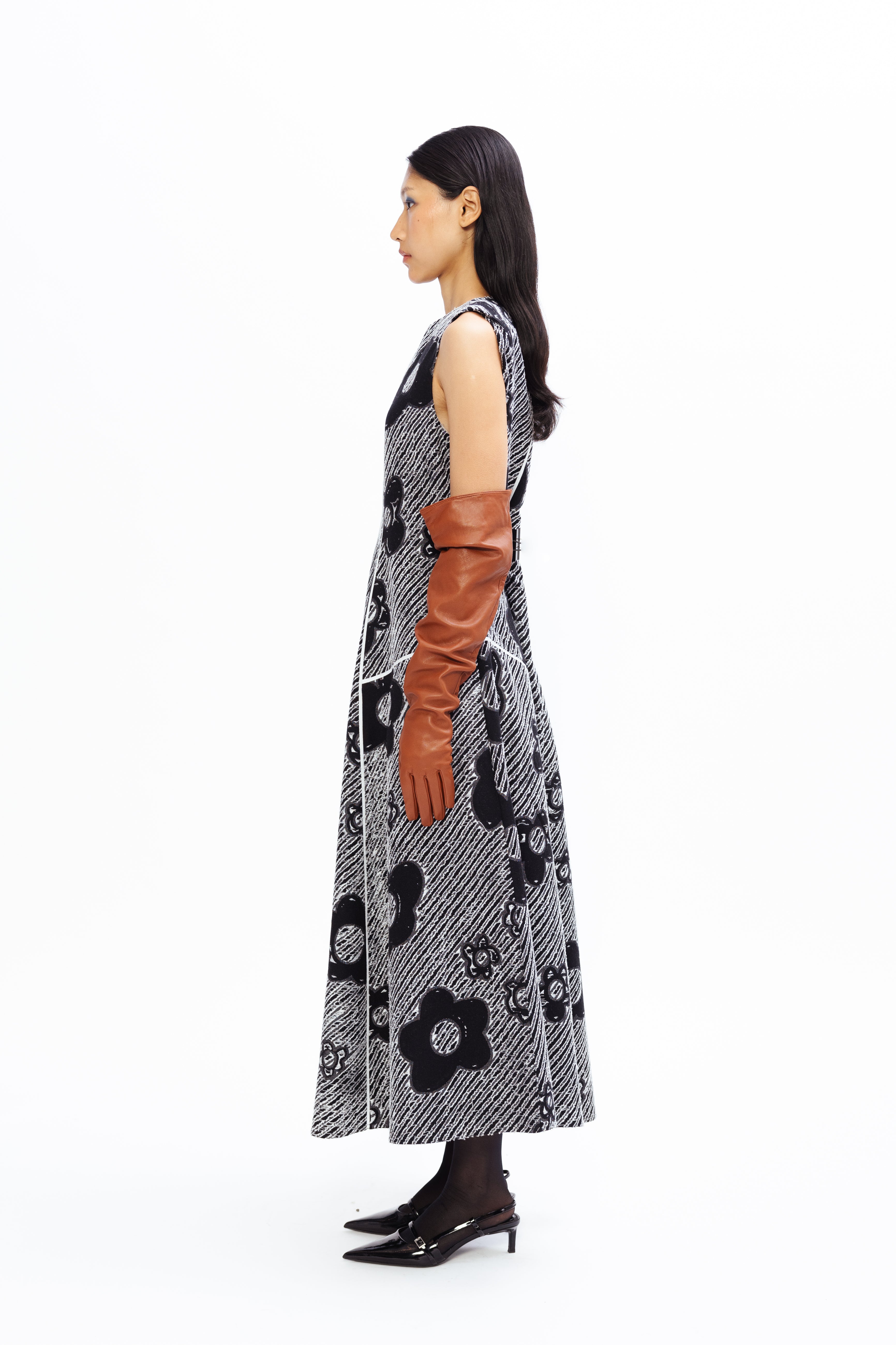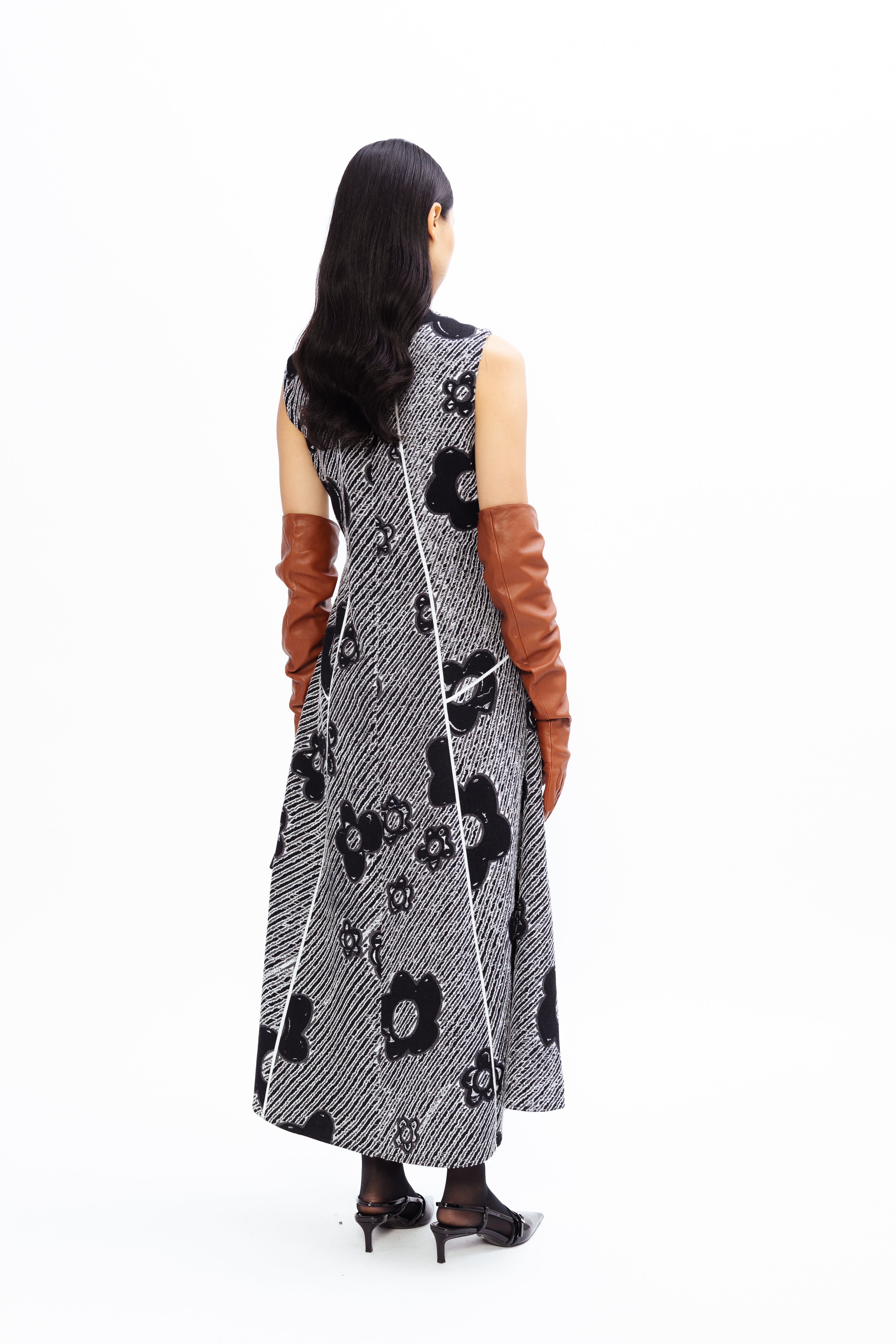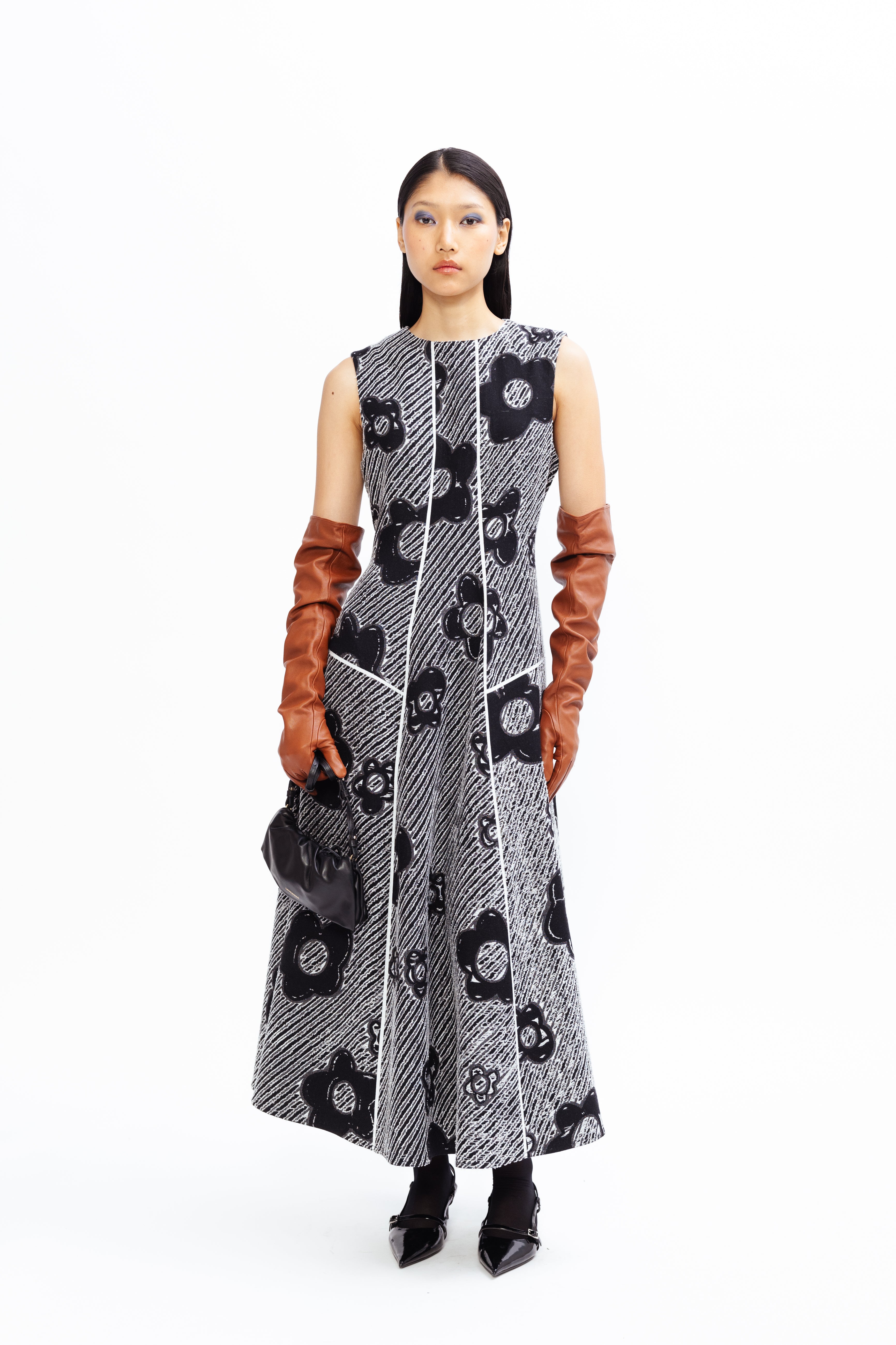 This paneled fit-and-flare dress features an oversized, structured silhouette with a slightly relaxed fit that blends modern artistry with timeless femininity. The bold black-and-white graphic pattern, showcasing abstract florals and diagonal linework, adds a textured visual appeal. Thoughtfully paneled to accentuate the waist and create graceful movement, this piece makes a refined yet striking statement.