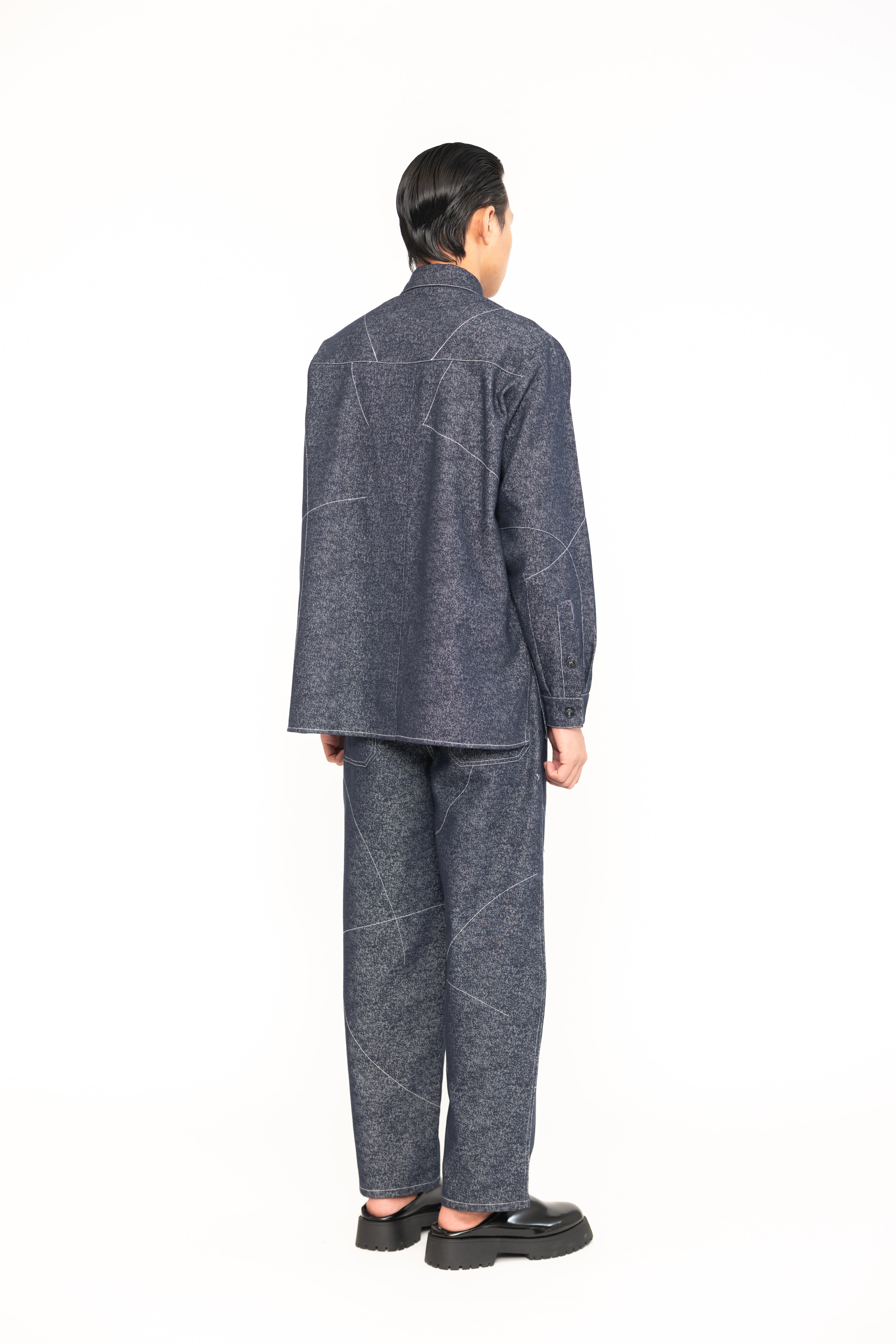 Men's oversized mélange denim trousers with contrast topstitching are relaxed-fit pants with a unique, mixed-tone denim texture. The contrast stitching adds subtle detail, giving the trousers a stylish, modern edge perfect for casual wear.