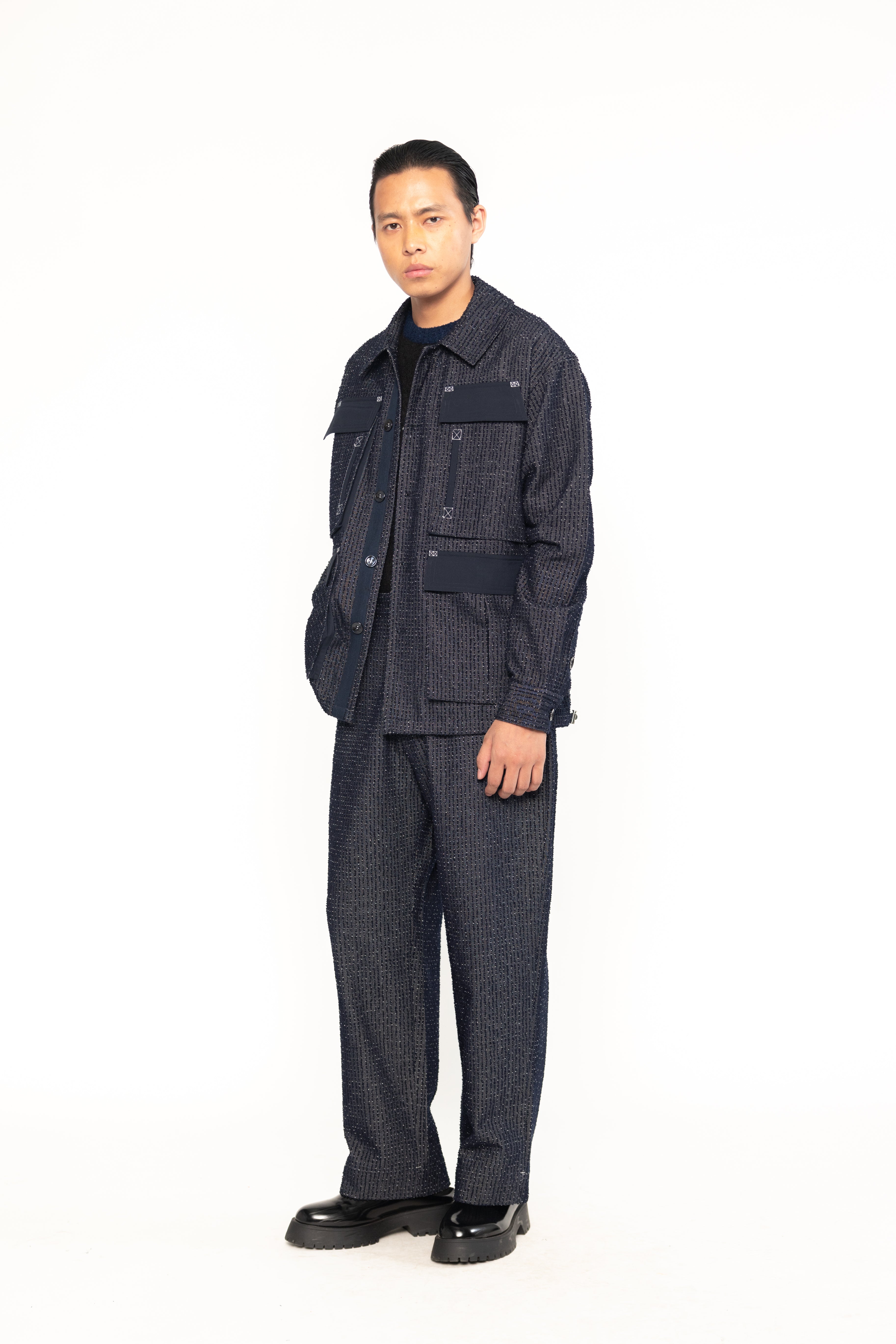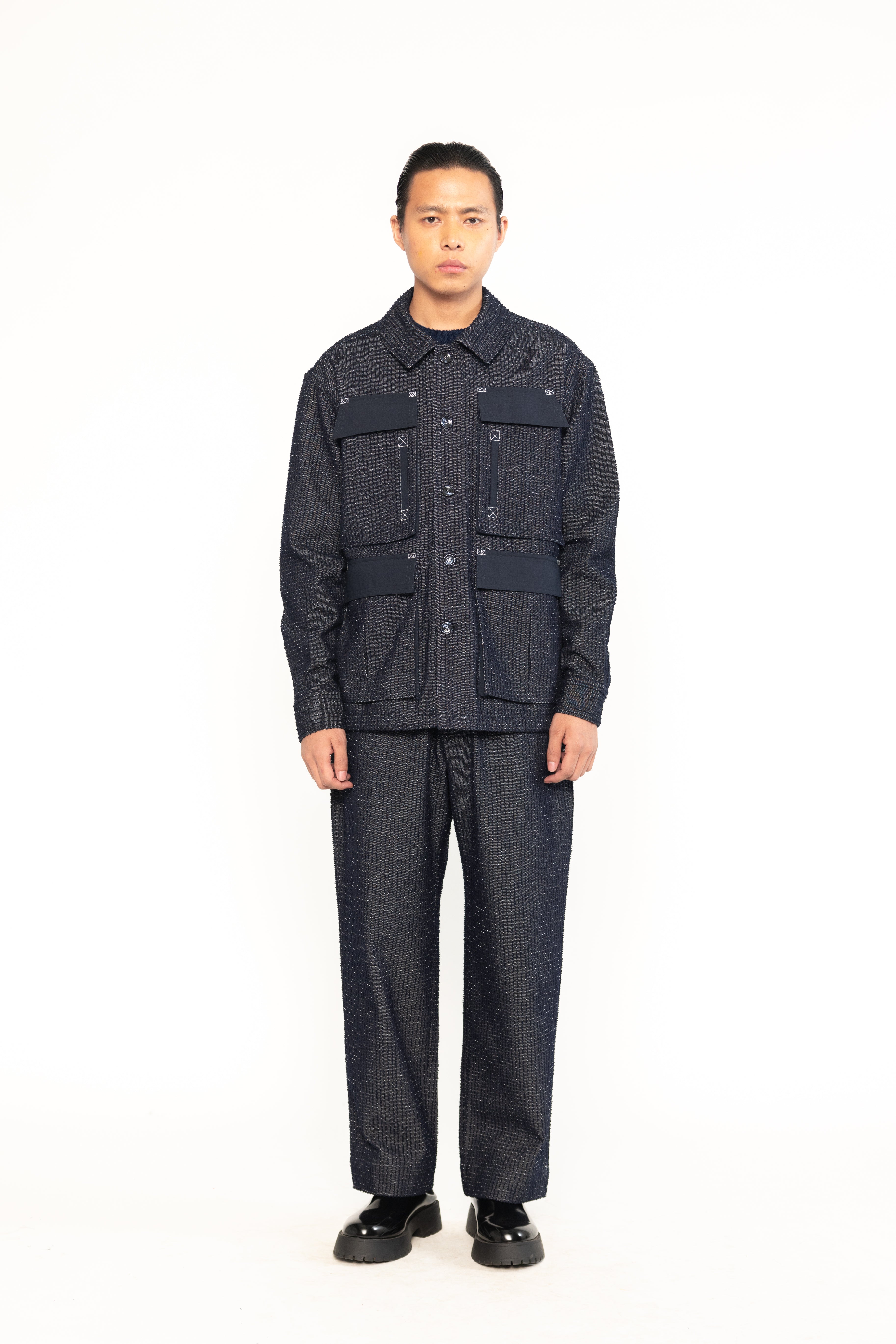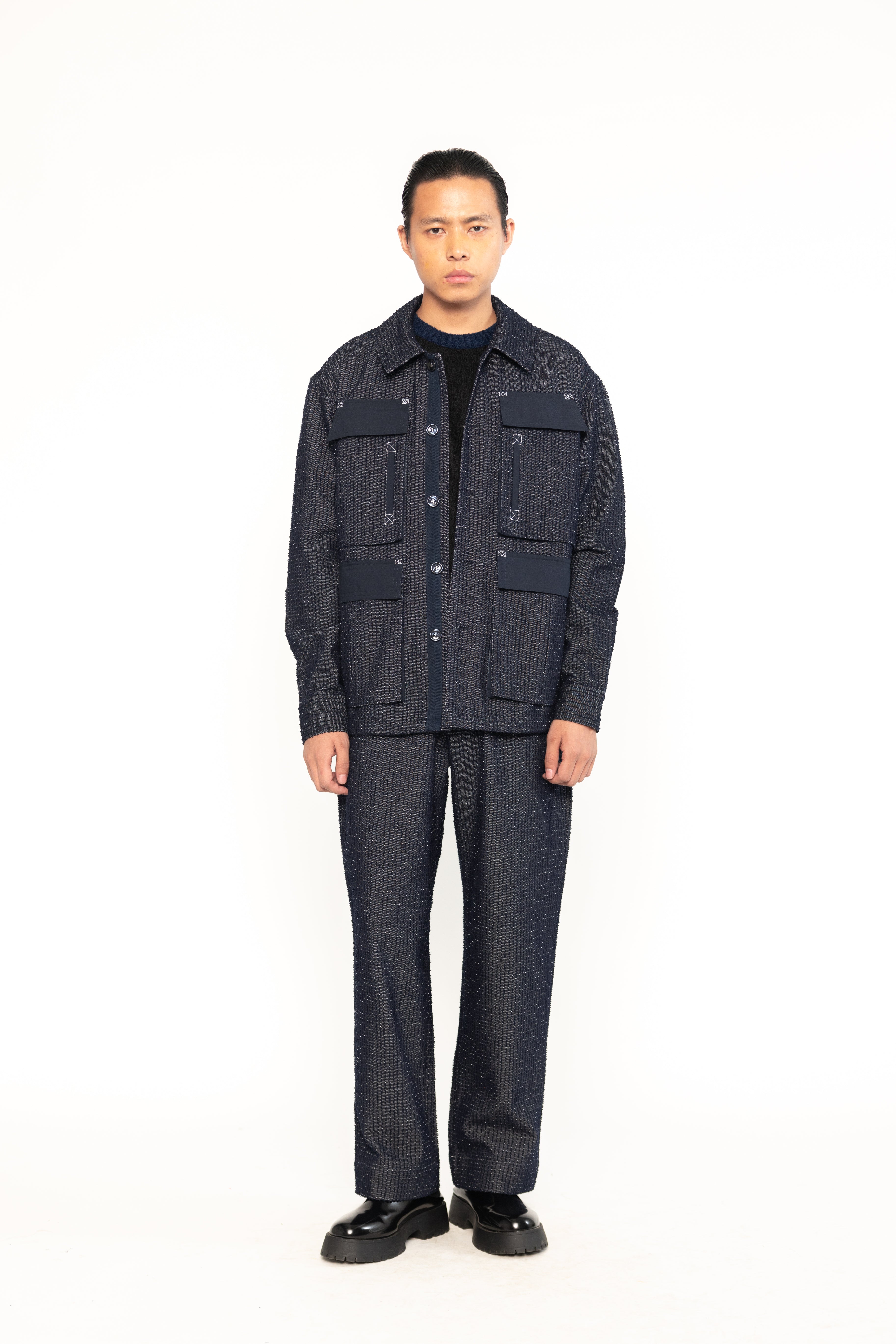 This denim utility shacket with multiple pockets, blending the structure of a shirt with the warmth of a jacket. Made from durable denim, it offers ample storage and a rugged, workwear-inspired style—perfect for layering in cooler weather.
