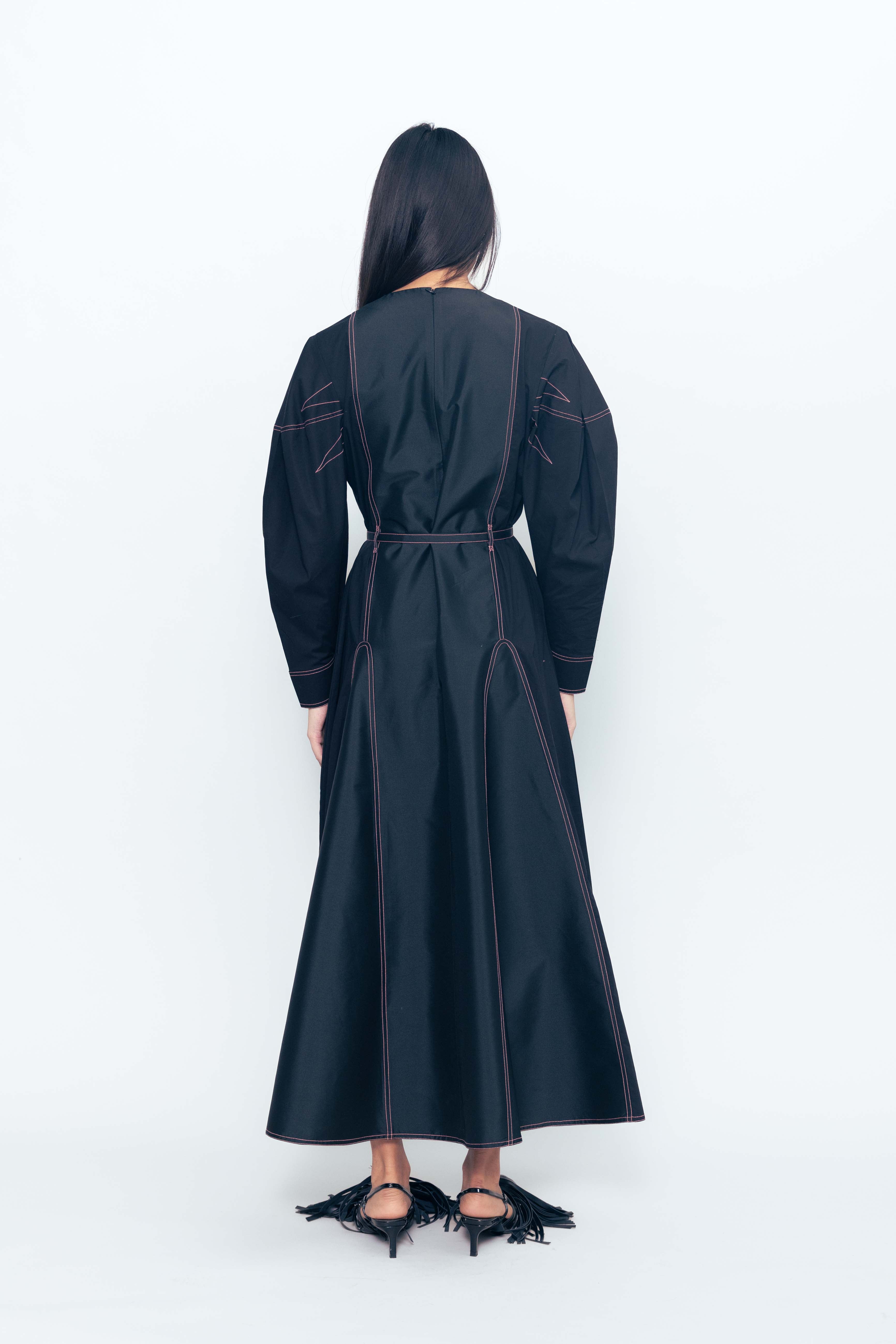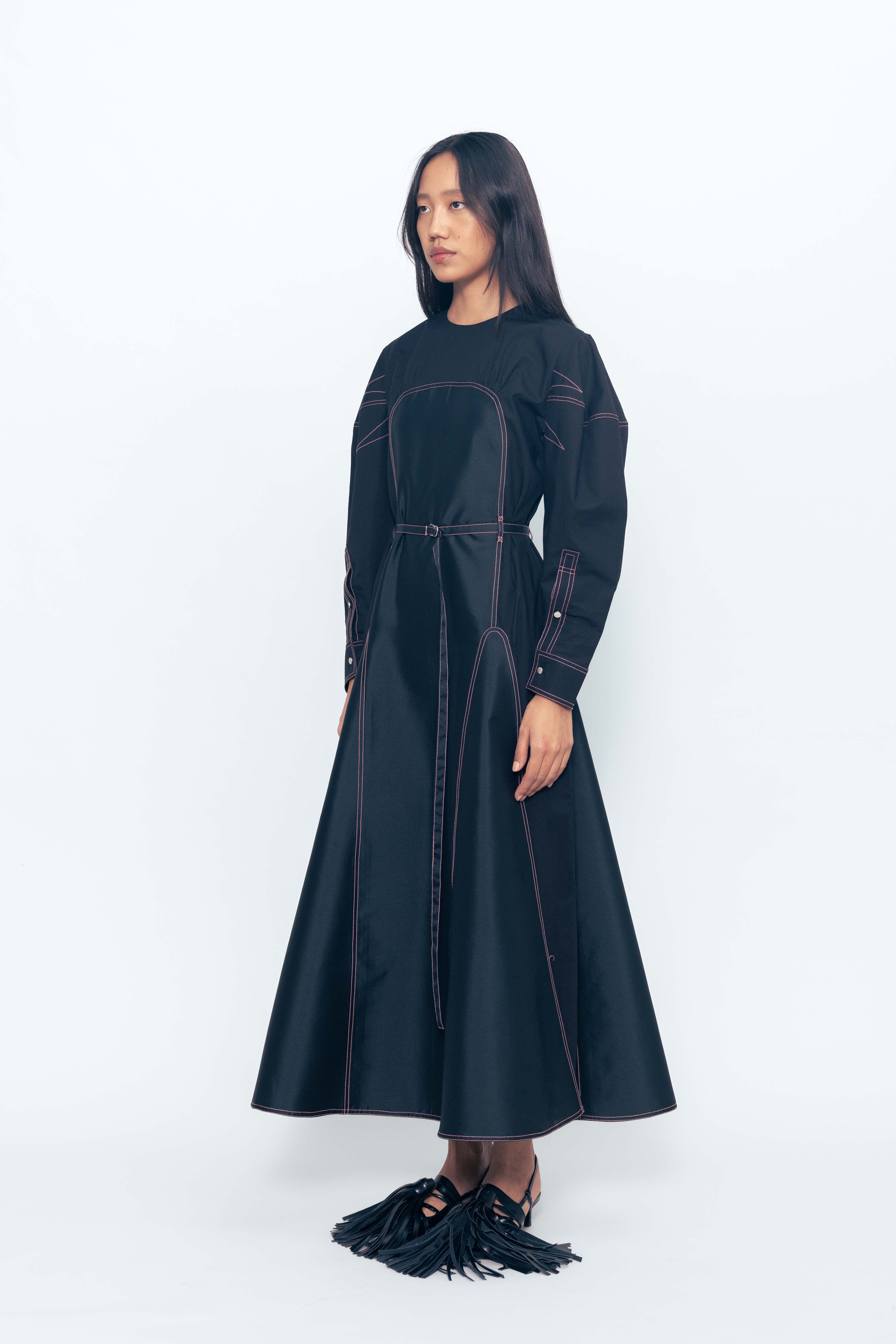 A bold interplay of texture and tone defines this piece, where crisp structure meets fluid form. Panels shift from matte to sheen, creating contrast not just in color but in light. The silhouette is elongated and balanced, drawn in at the waist with a defined tie that anchors the look. Each section feels deliberate—patchworked with purpose—offering a sense of motion, clarity, and quiet drama.