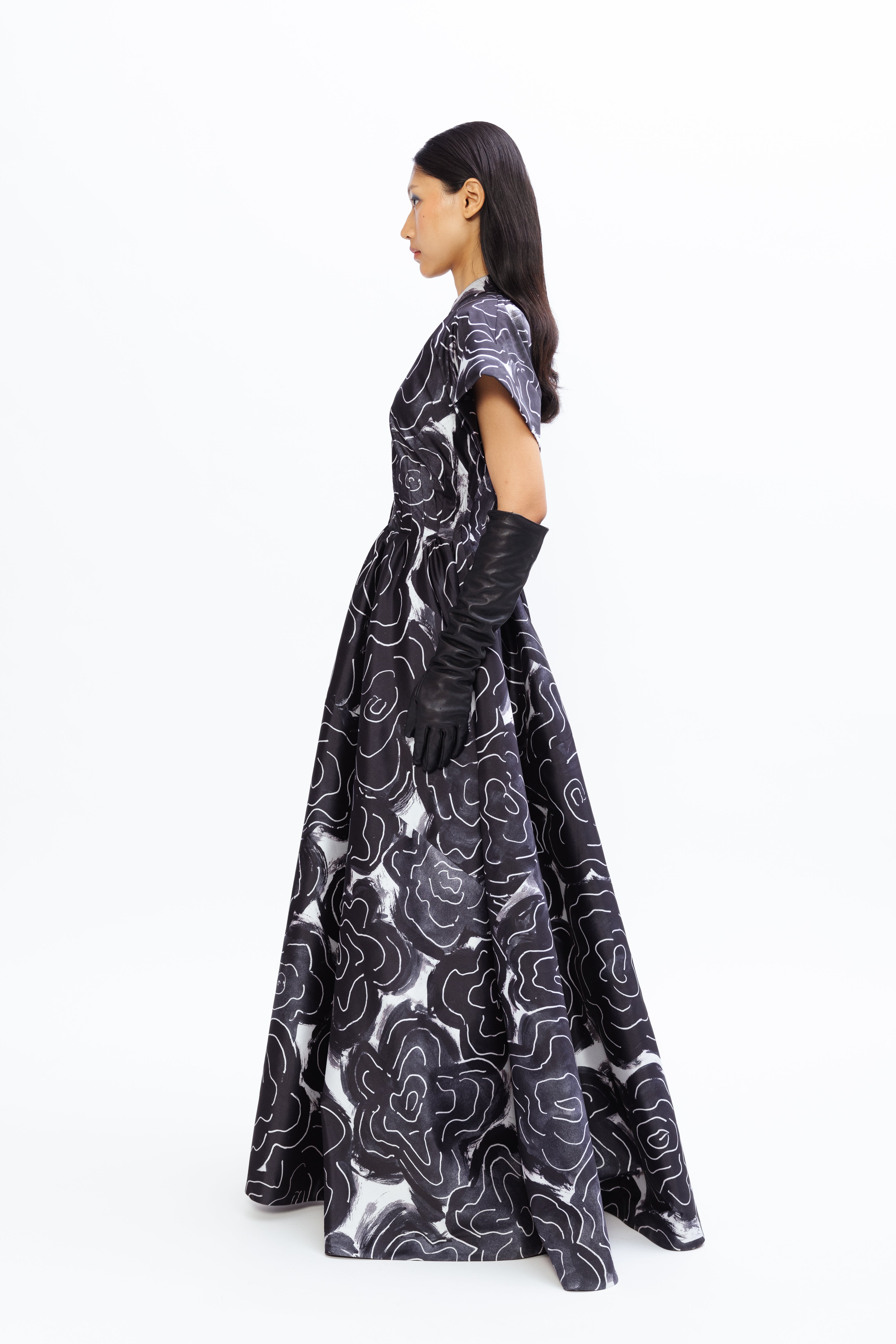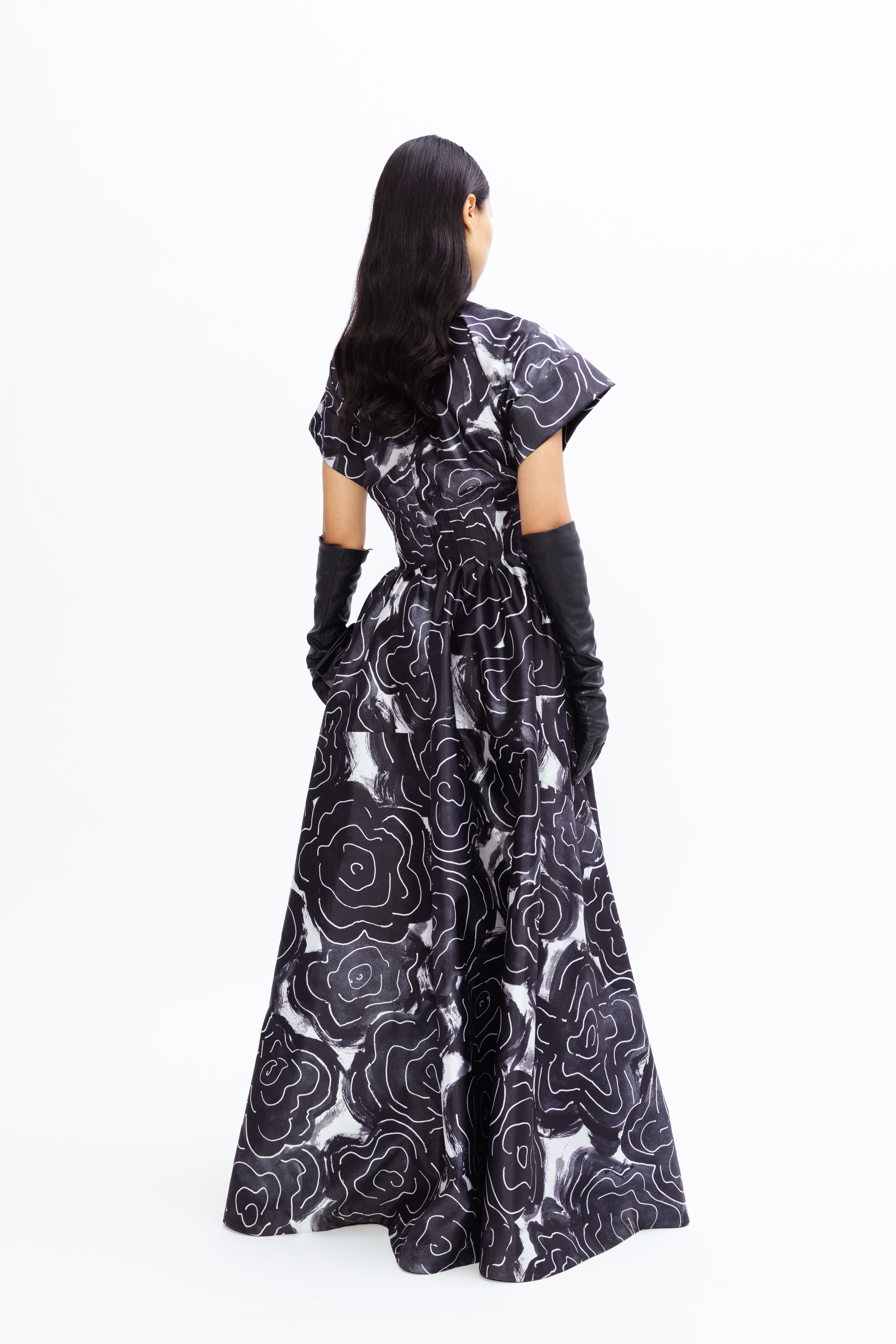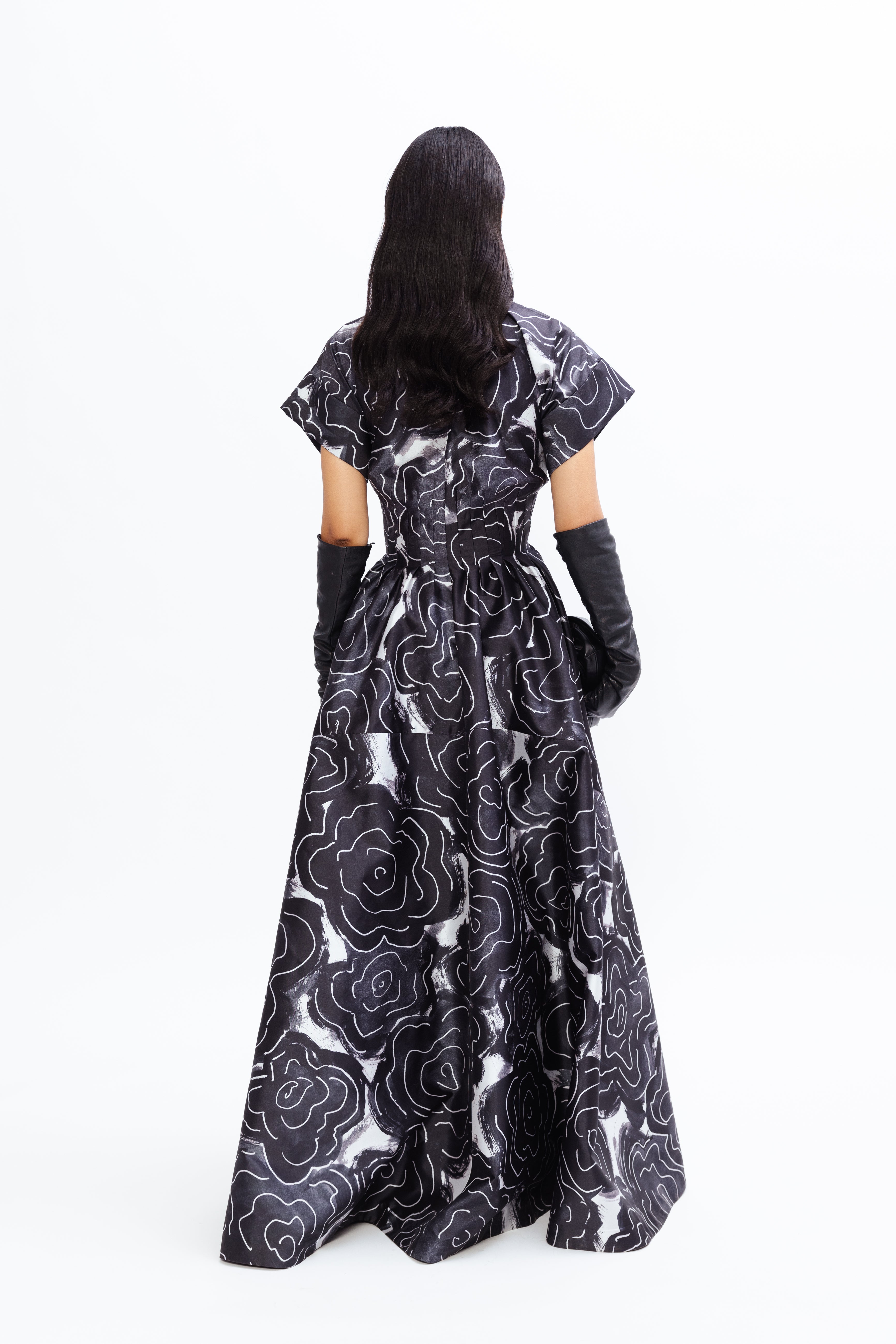 This short-sleeved gown blends timeless elegance with bold artistry. Featuring a darted high-waist silhouette, it flows gracefully with its full-length design for a flattering, elongated look. The striking abstract floral pattern in contrasting navy and white adds a modern, contemporary edge—making it a captivating choice for evening events or statement occasions.