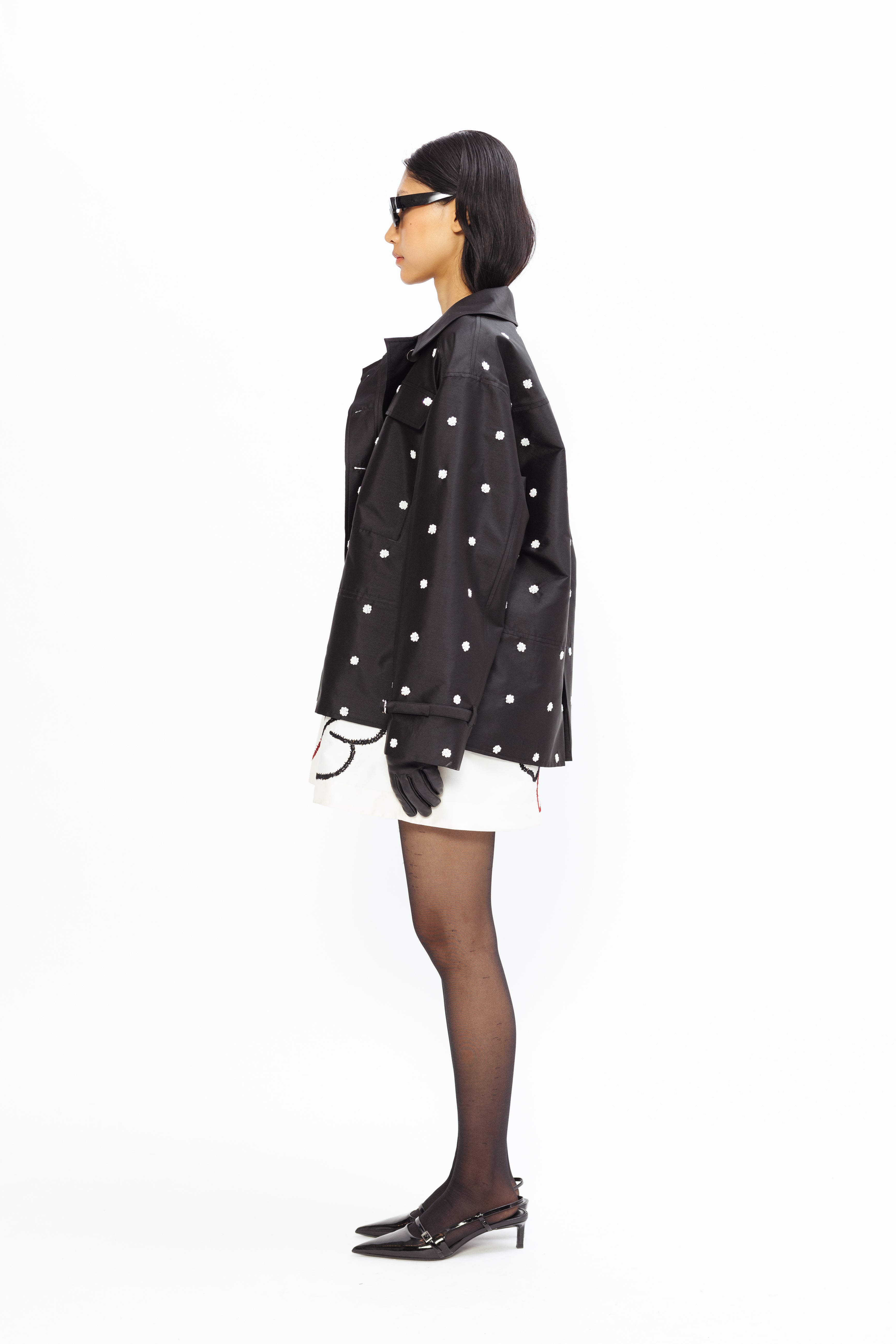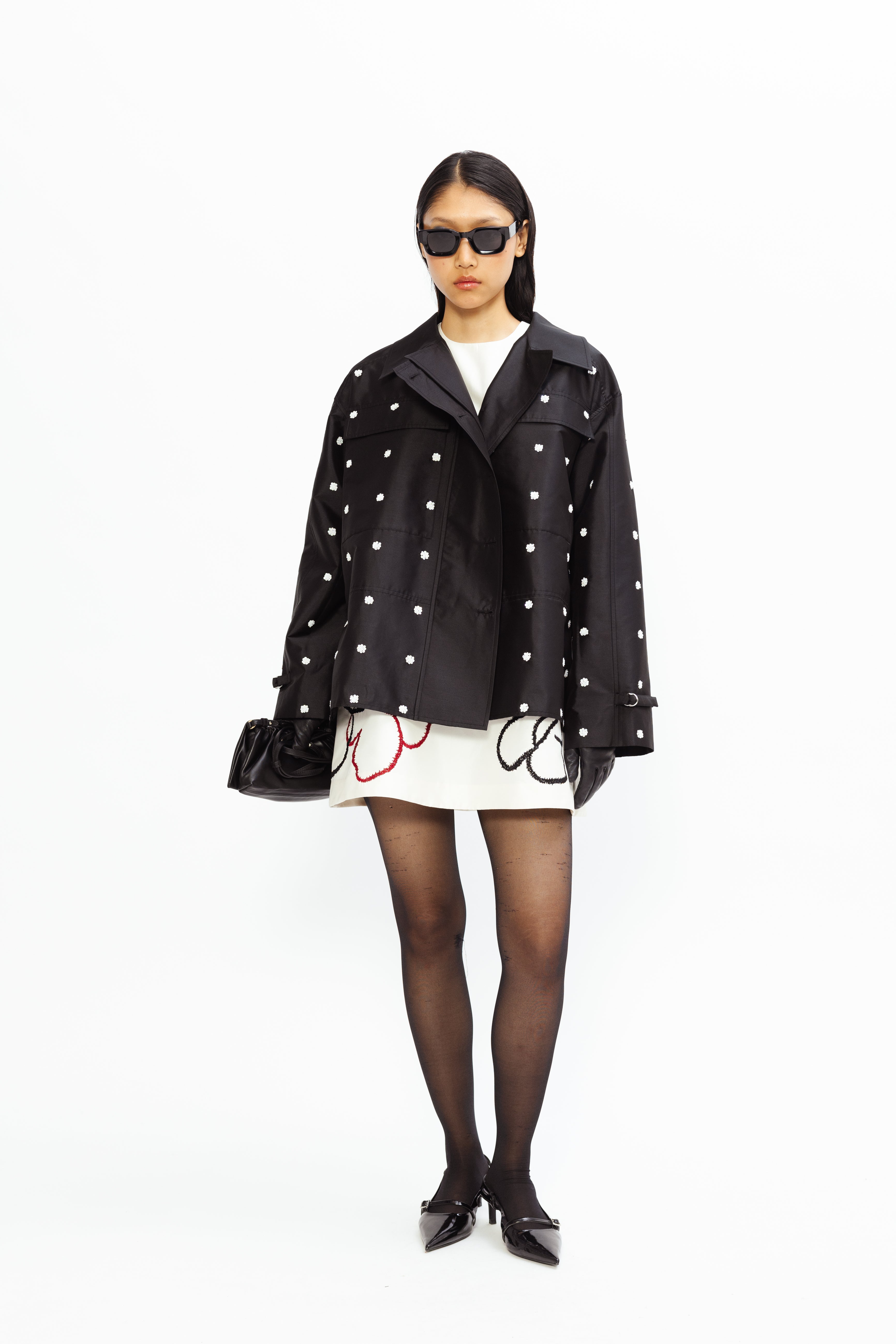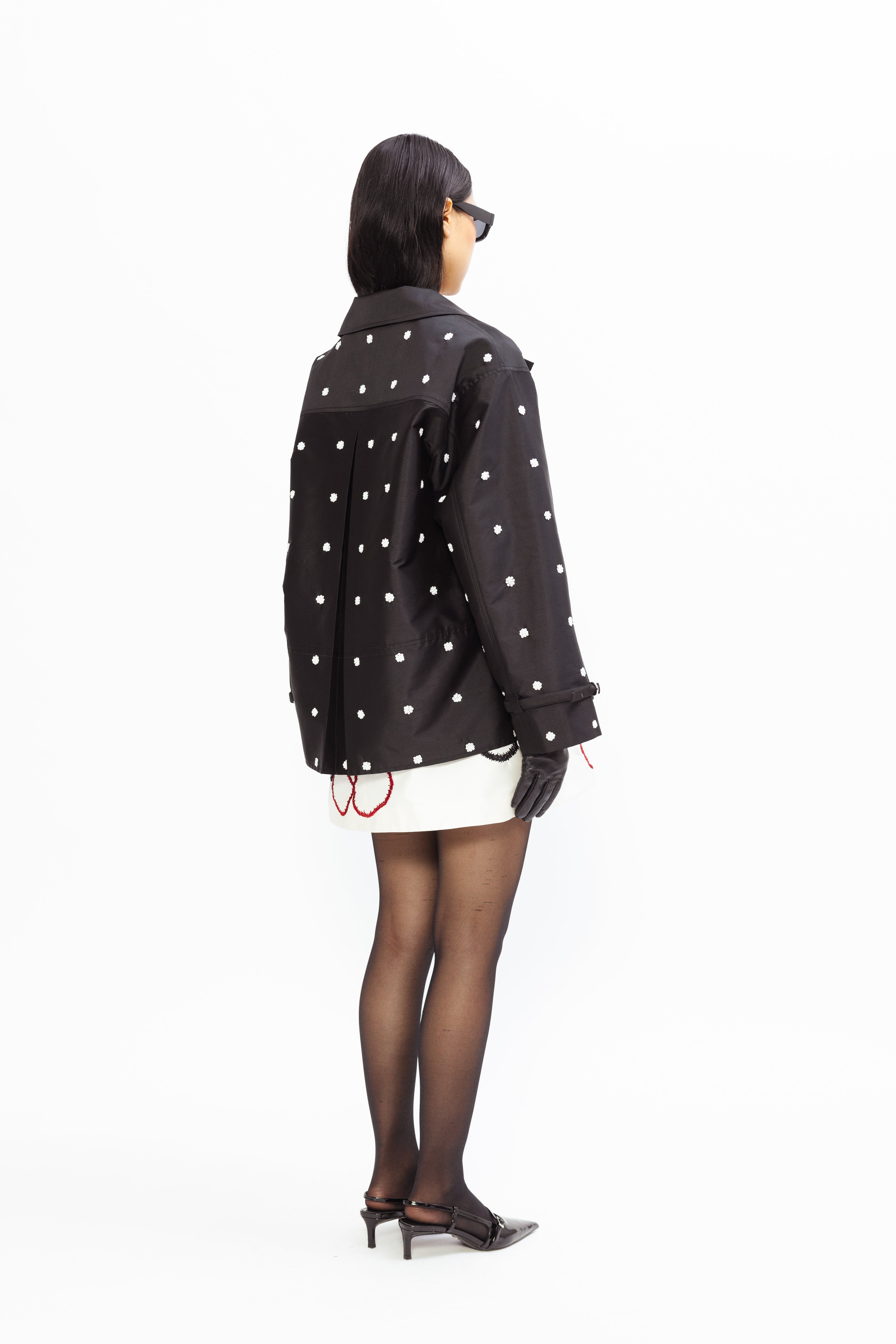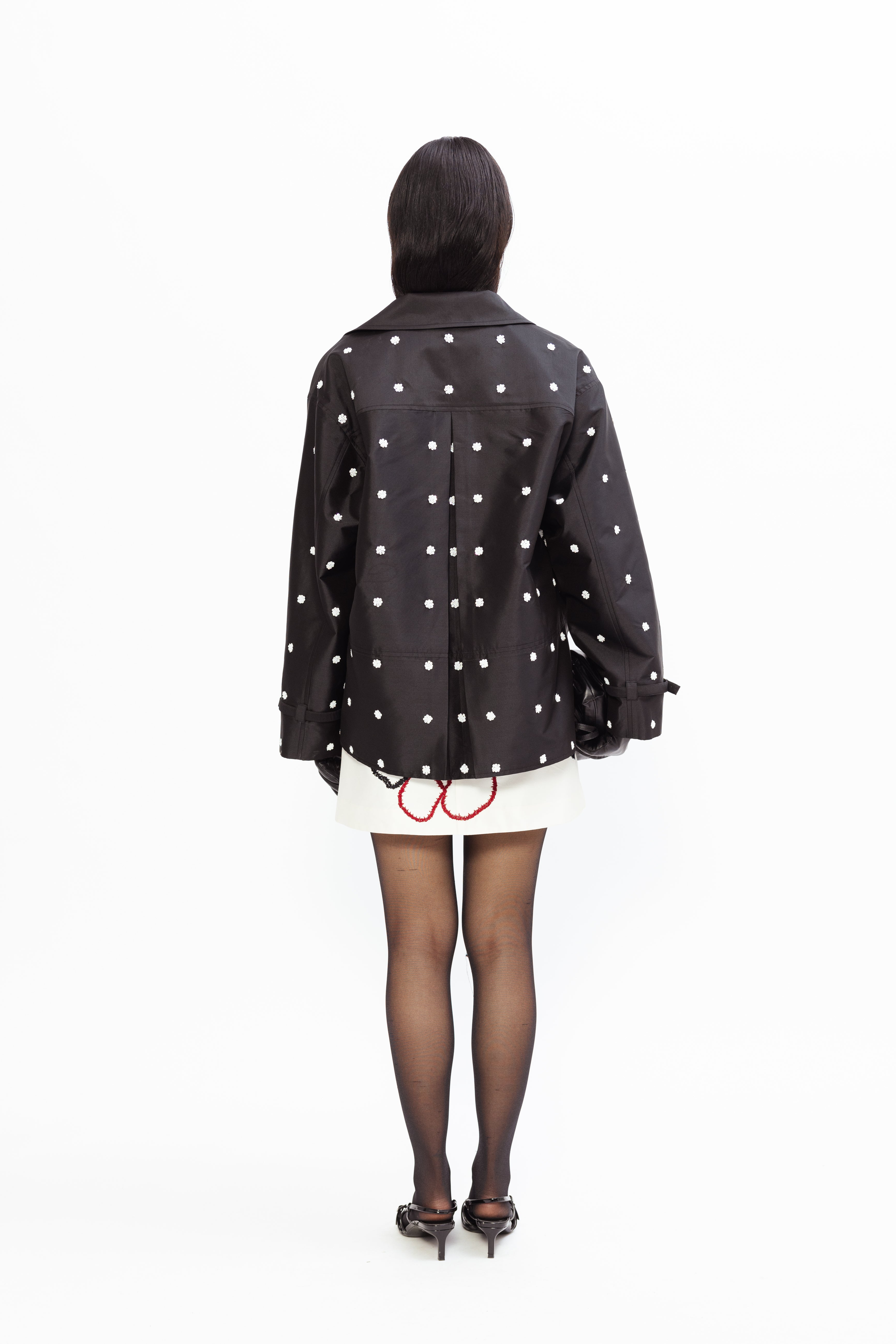 A chic and structured short trench jacket featuring intricate embroidery, a distinctive double-collar detail, and a belted waist for a flattering fit. Perfect for layering in style.