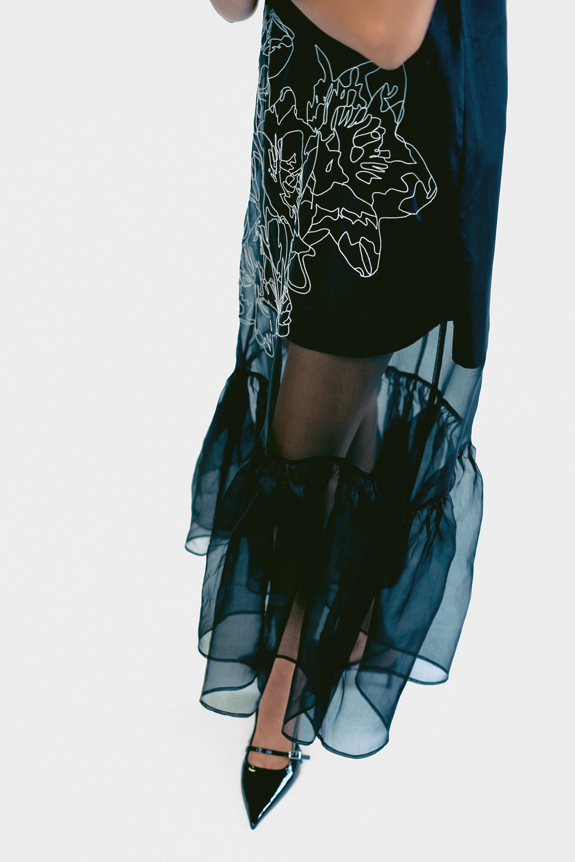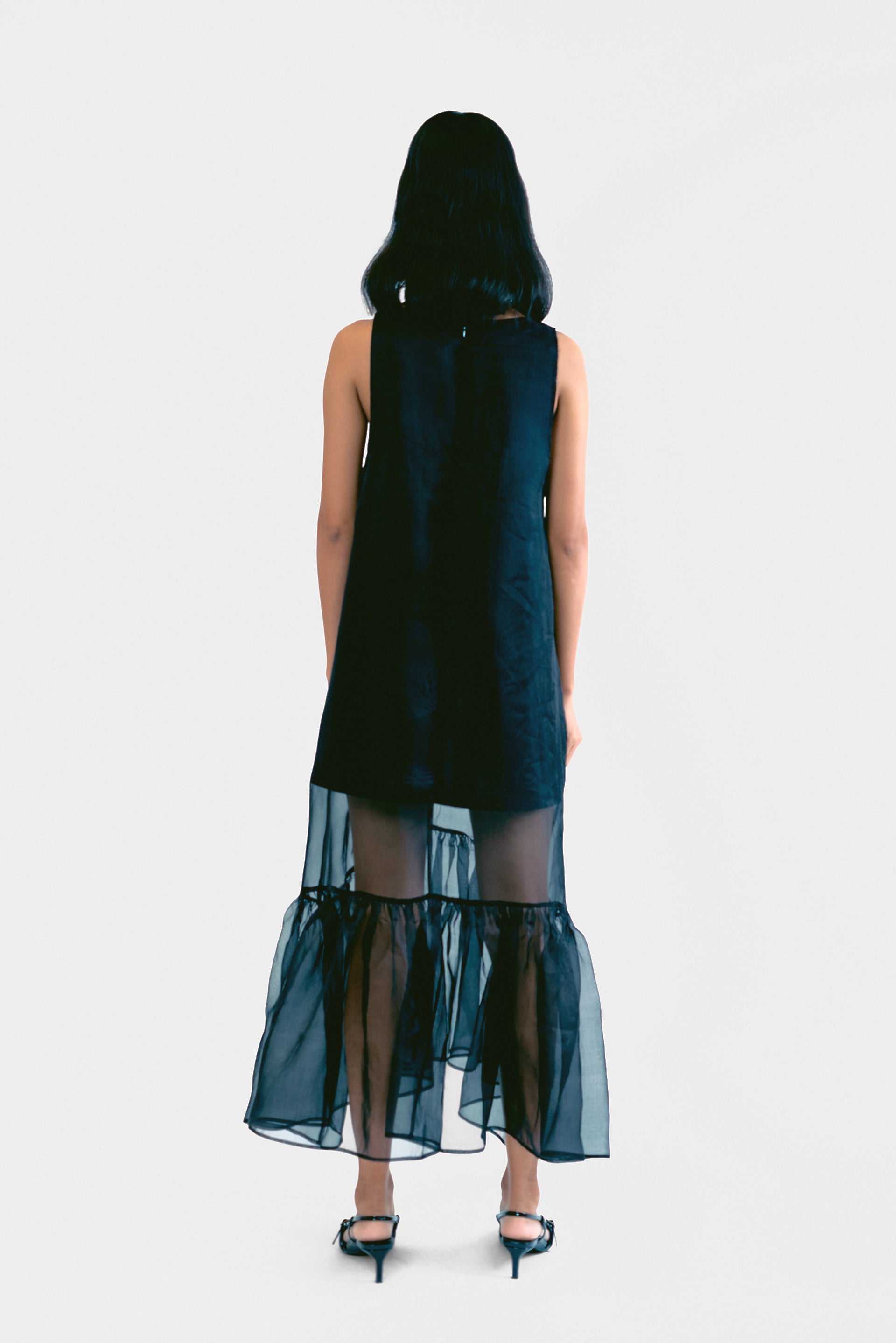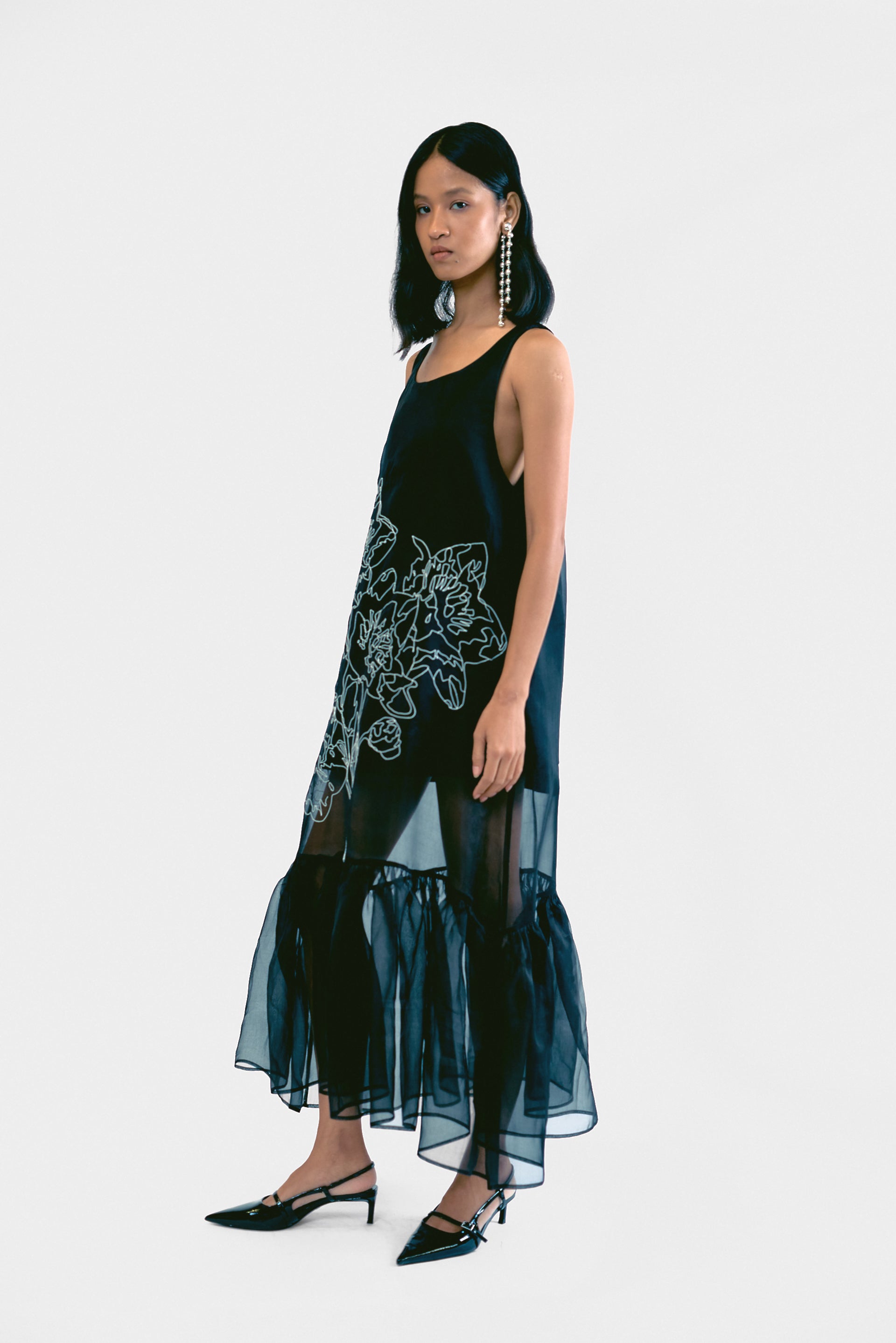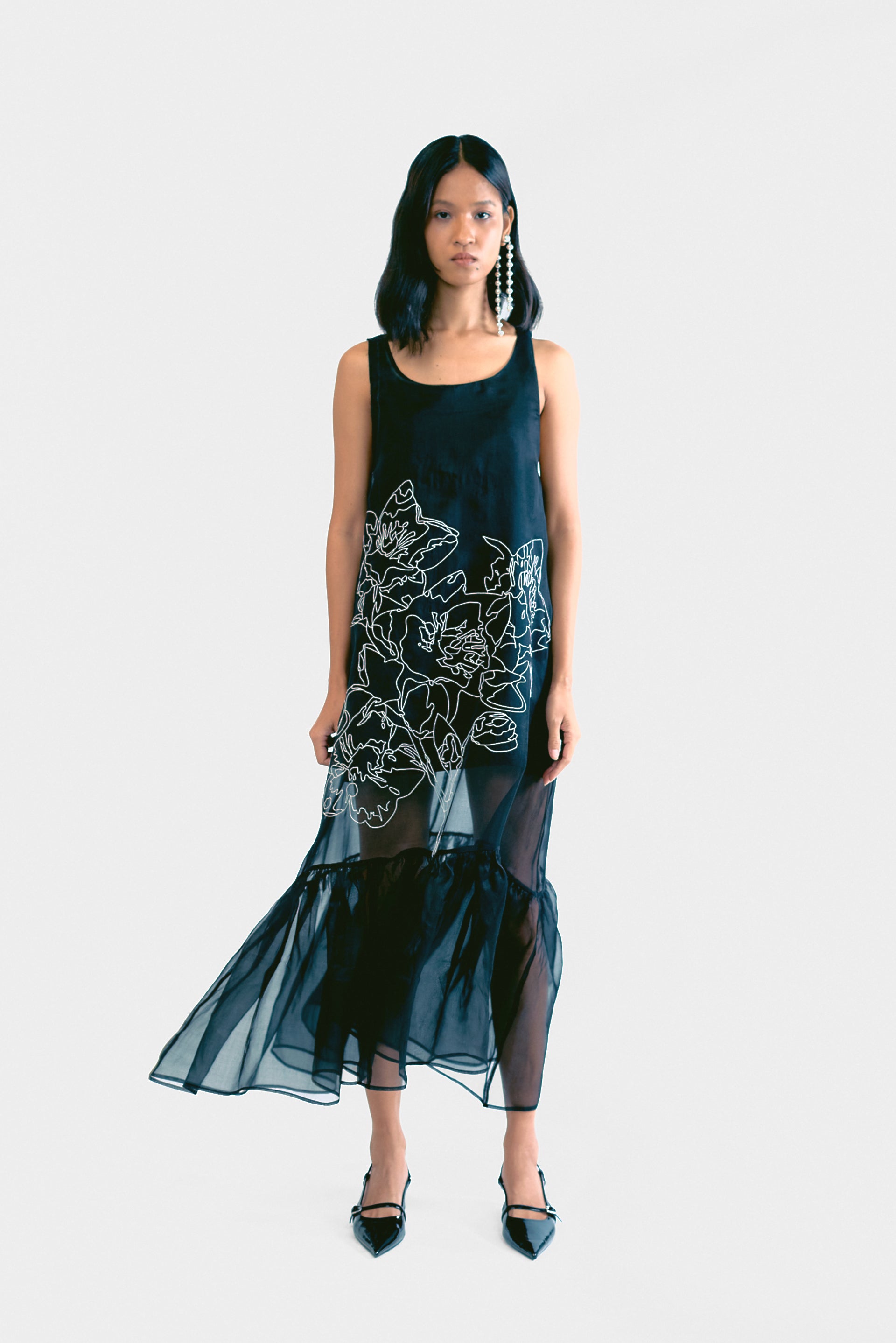 Step into elegance with this Highlighted Freesia Sleeveless Dress, featuring delicate Freesia embroidery for a refined touch. The organza layer adds a soft, ethereal finish, creating a graceful silhouette perfect for any special occasion.