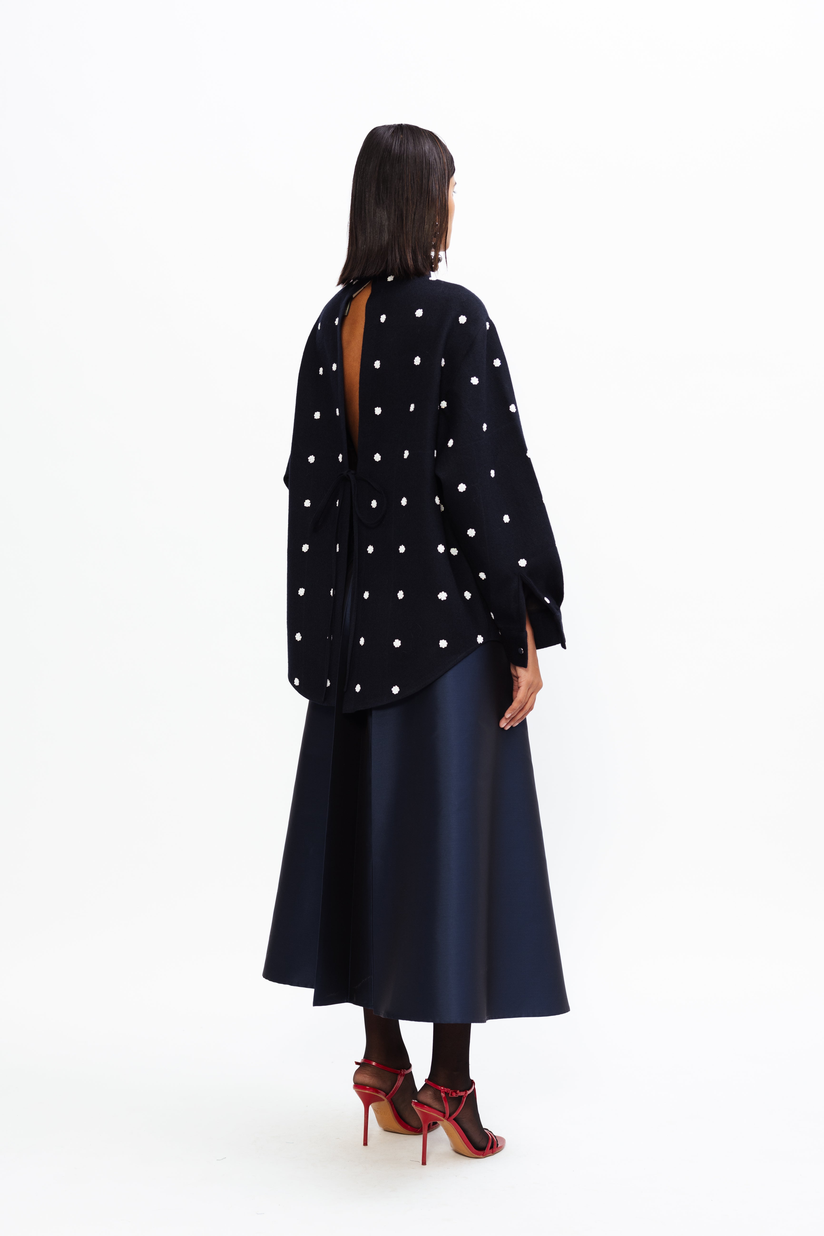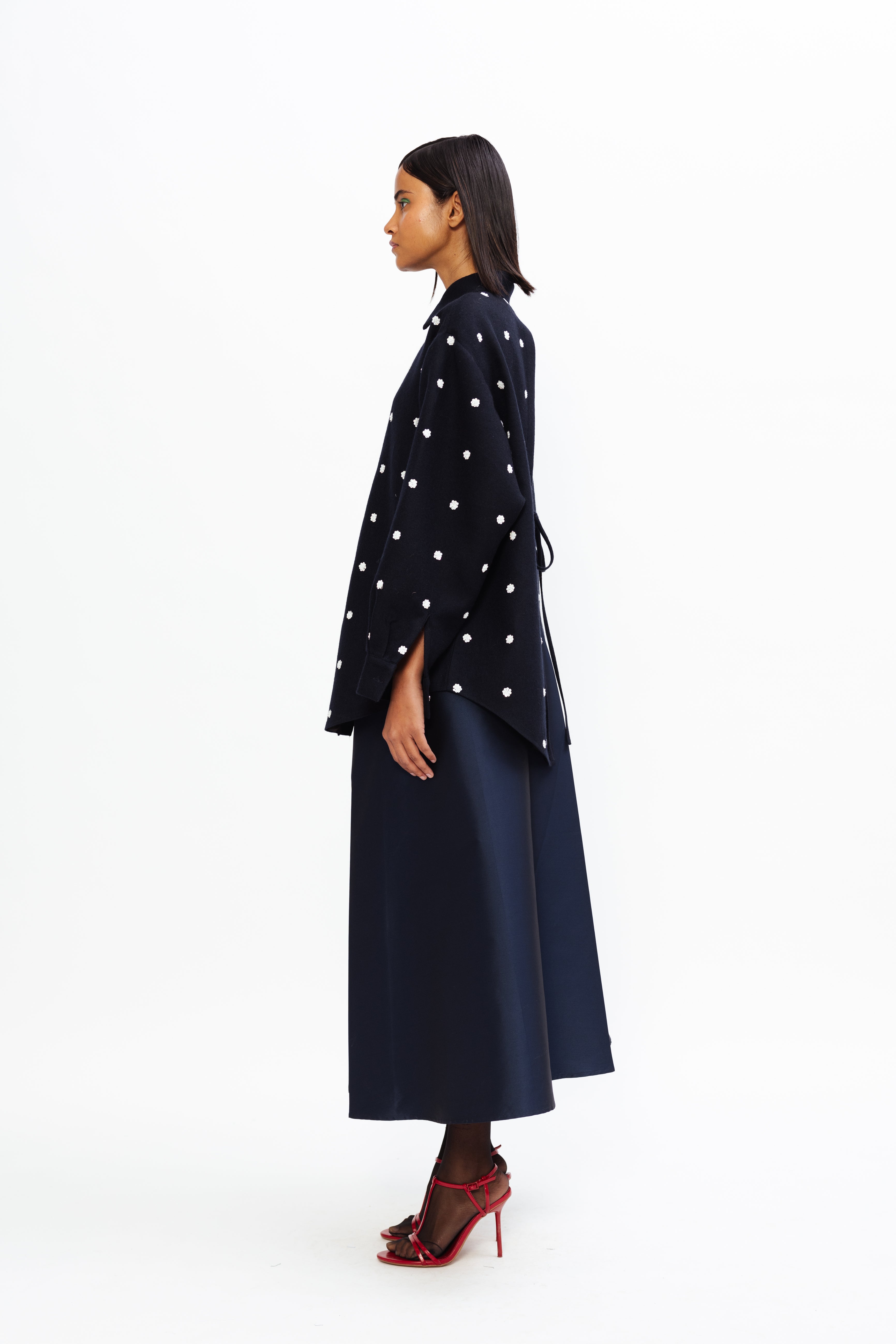 This full-length skirt flows gracefully to the ankles, exuding timeless elegance. Designed with gathered box pleats, it creates beautiful volume and movement, making it a refined choice for both formal and elevated everyday occasions.