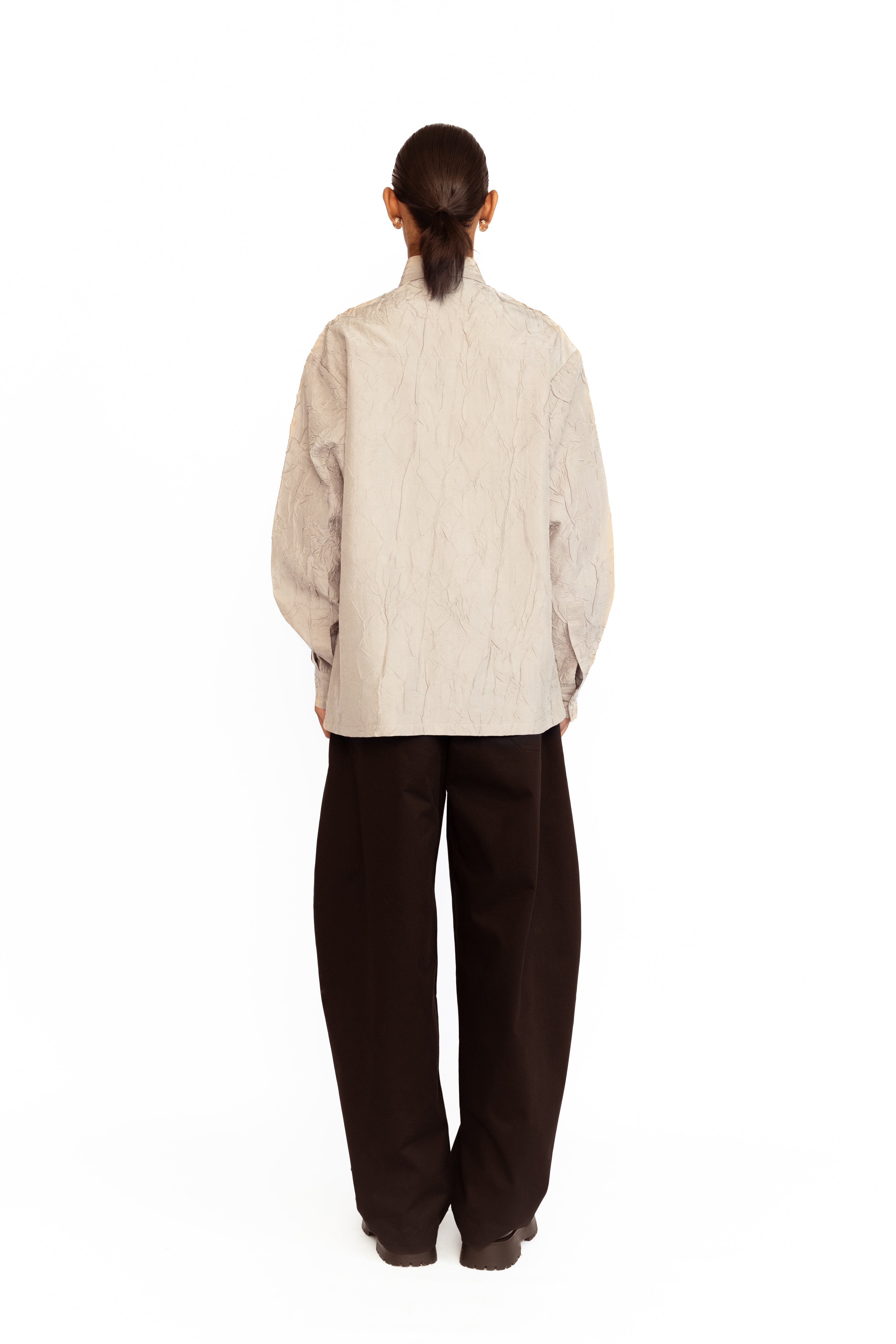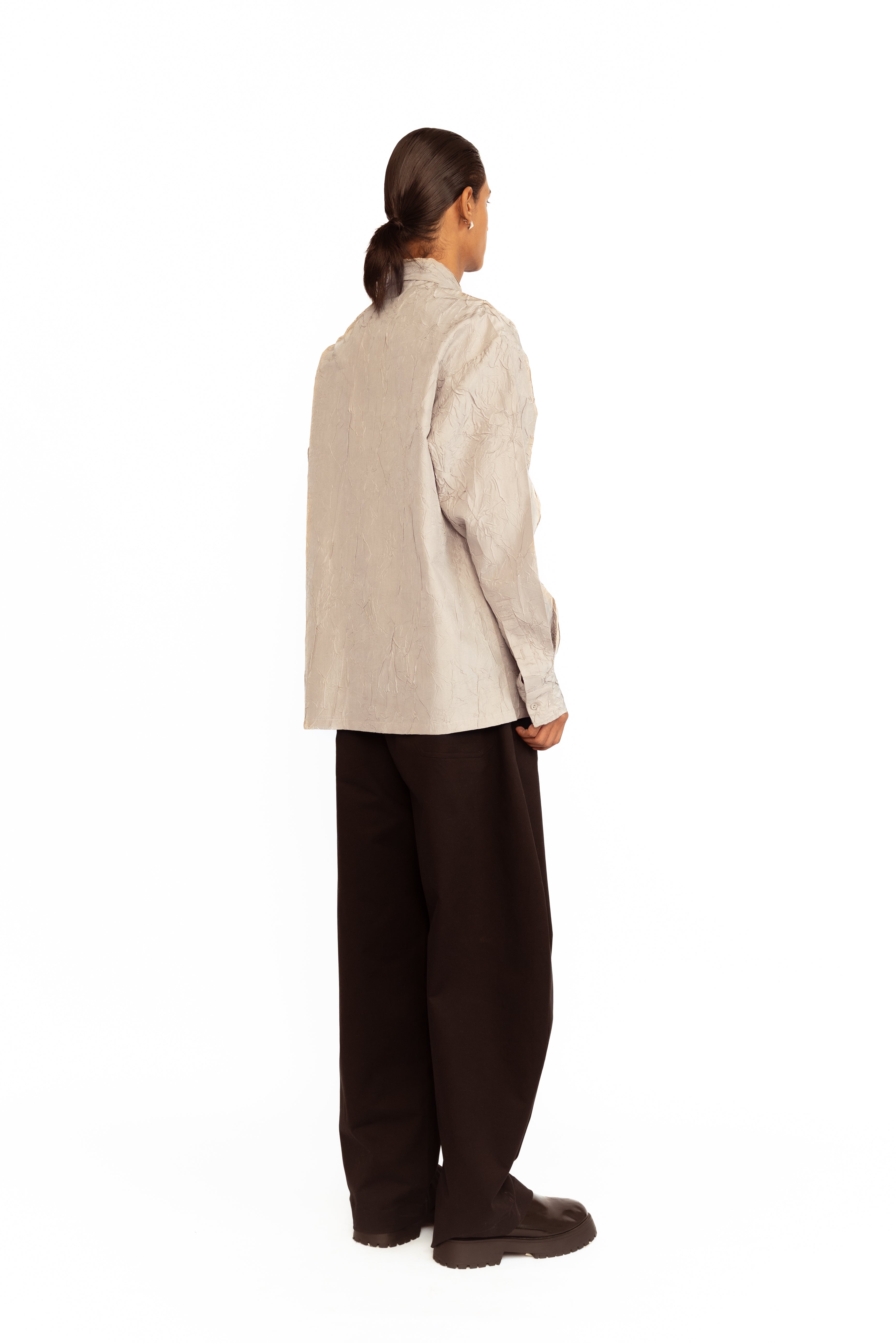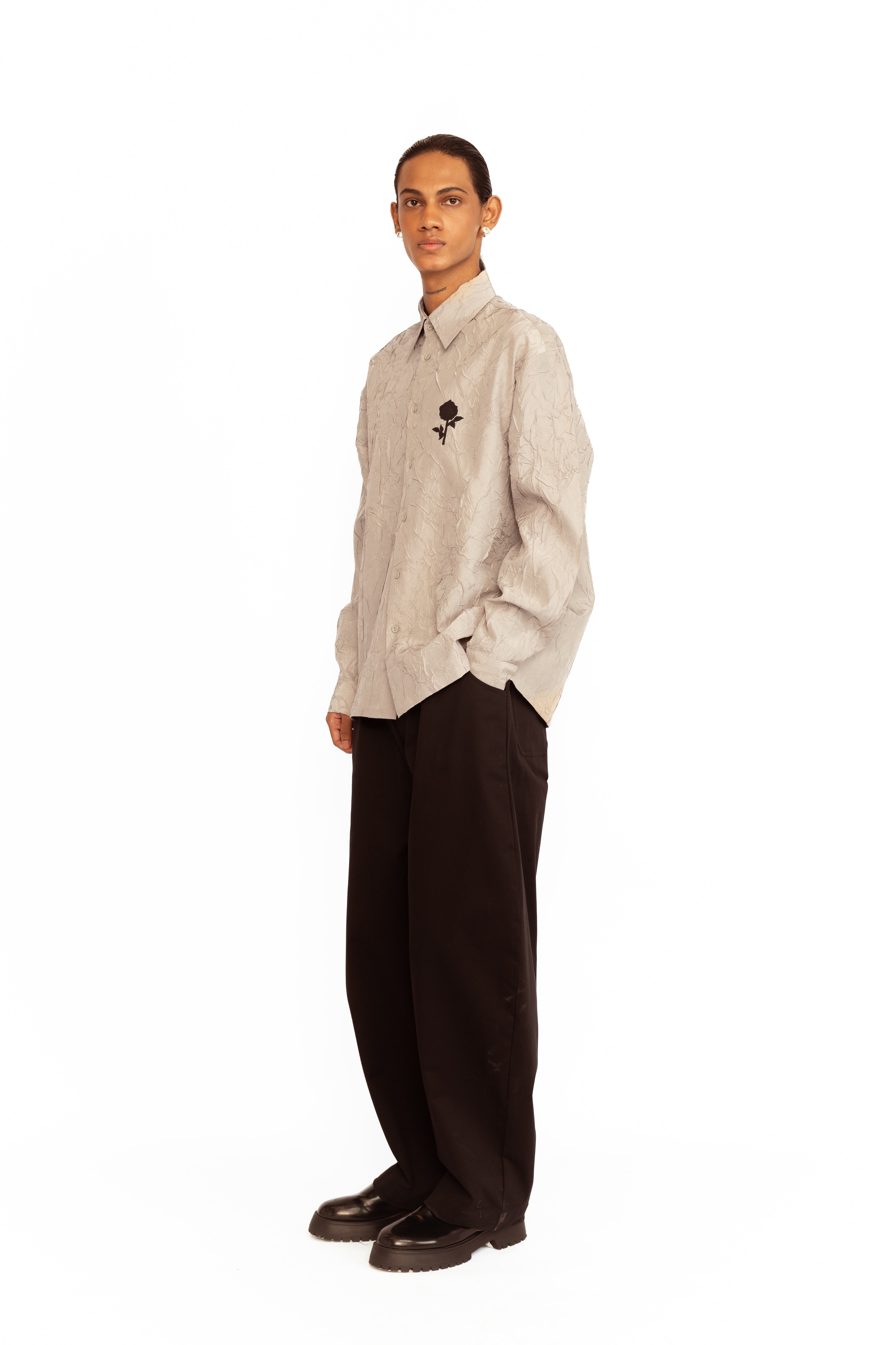 Crafted from luxurious wrinkled silk, this full-sleeved shirt combines classic elegance with a modern twist. The natural texture of the fabric lends it a relaxed yet elevated appeal, while the delicate rose appliqué adds a touch of feminine charm. Designed with a comfortable fit, it’s perfect for effortlessly transitioning from day to evening.