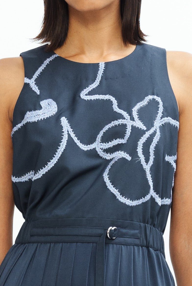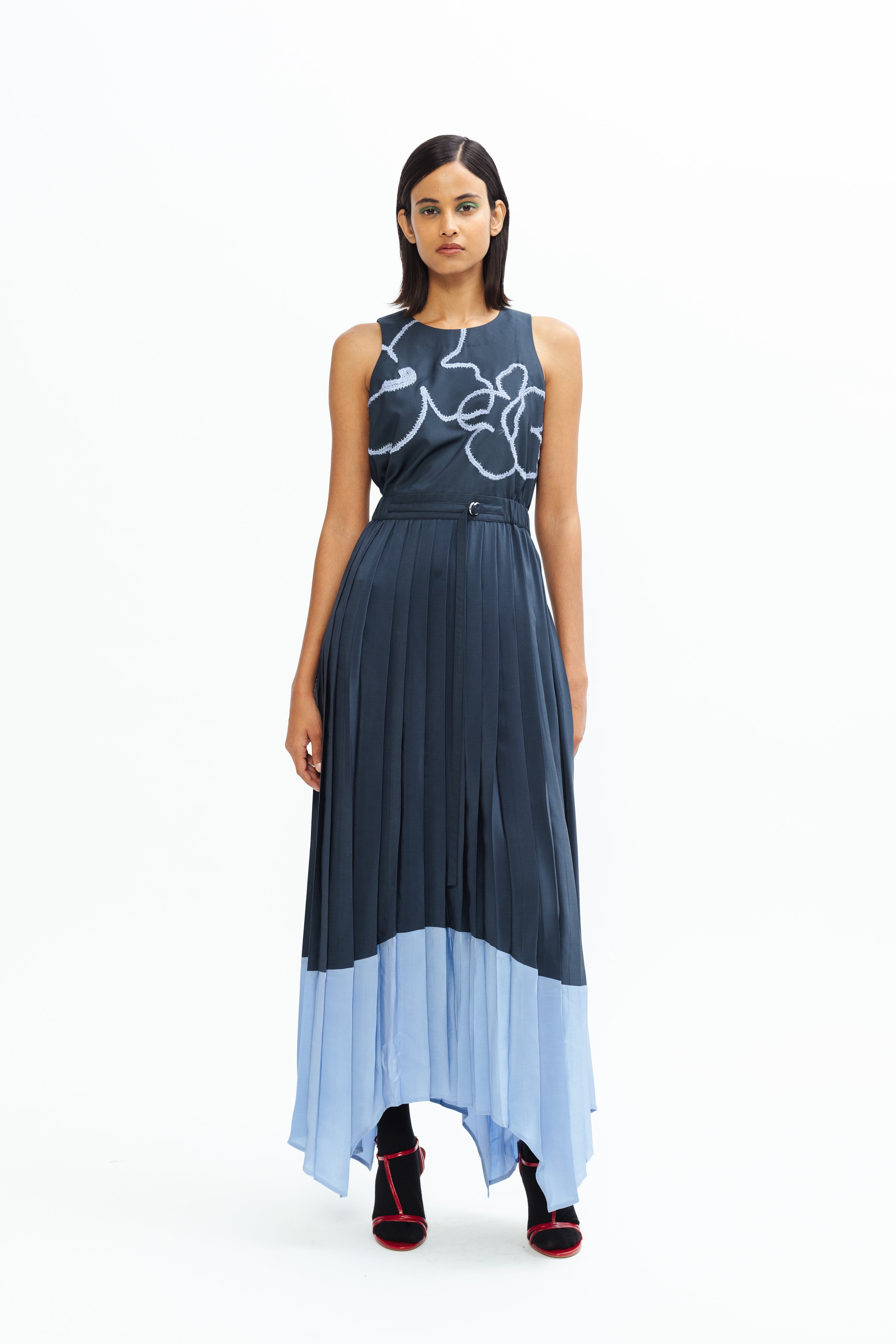 This maxi-length pleated skirt exudes sophistication with its fluid movement and elegant flow. Designed with an asymmetrical hemline, it features a layered gradient effect that transitions beautifully from deep navy to light blue, creating a refined and contemporary color-blocked statement.