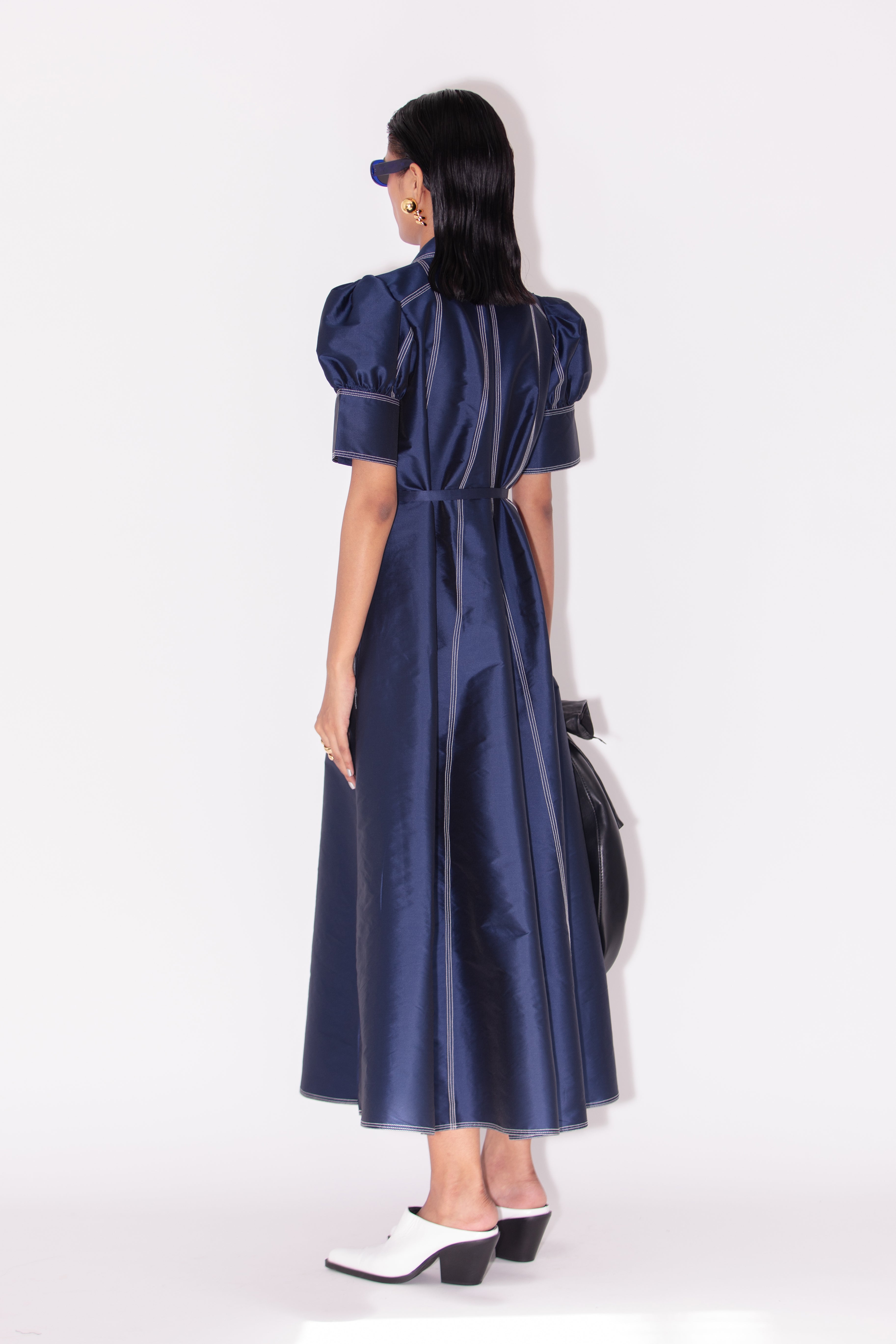 An ankle-length dress with a V-neck and collar, featuring slots all over, offers a blend of elegance and allure. The V-neckline adds a flattering touch, while the collar adds a refined detail. The slots all over the dress provide a unique and eye-catching design element, creating visual interest and movement. With plackets at the sleeves, the dress achieves a structured look. Paired with a belt, it offers versatility in styling and enhances the waistline. This combination creates a sophisticated and chic ensemble suitable for various occasions, from formal events to casual outings.