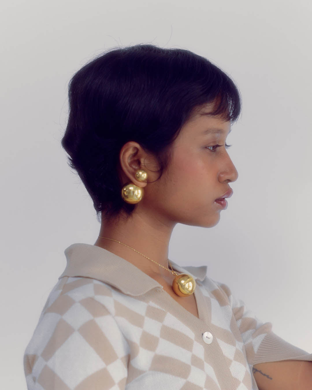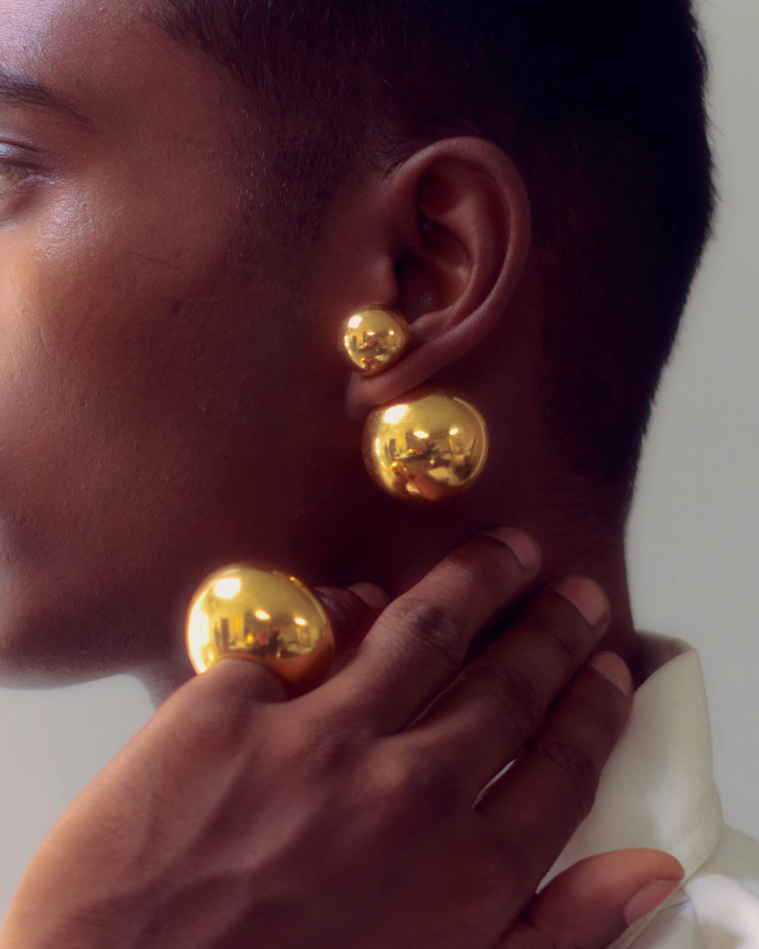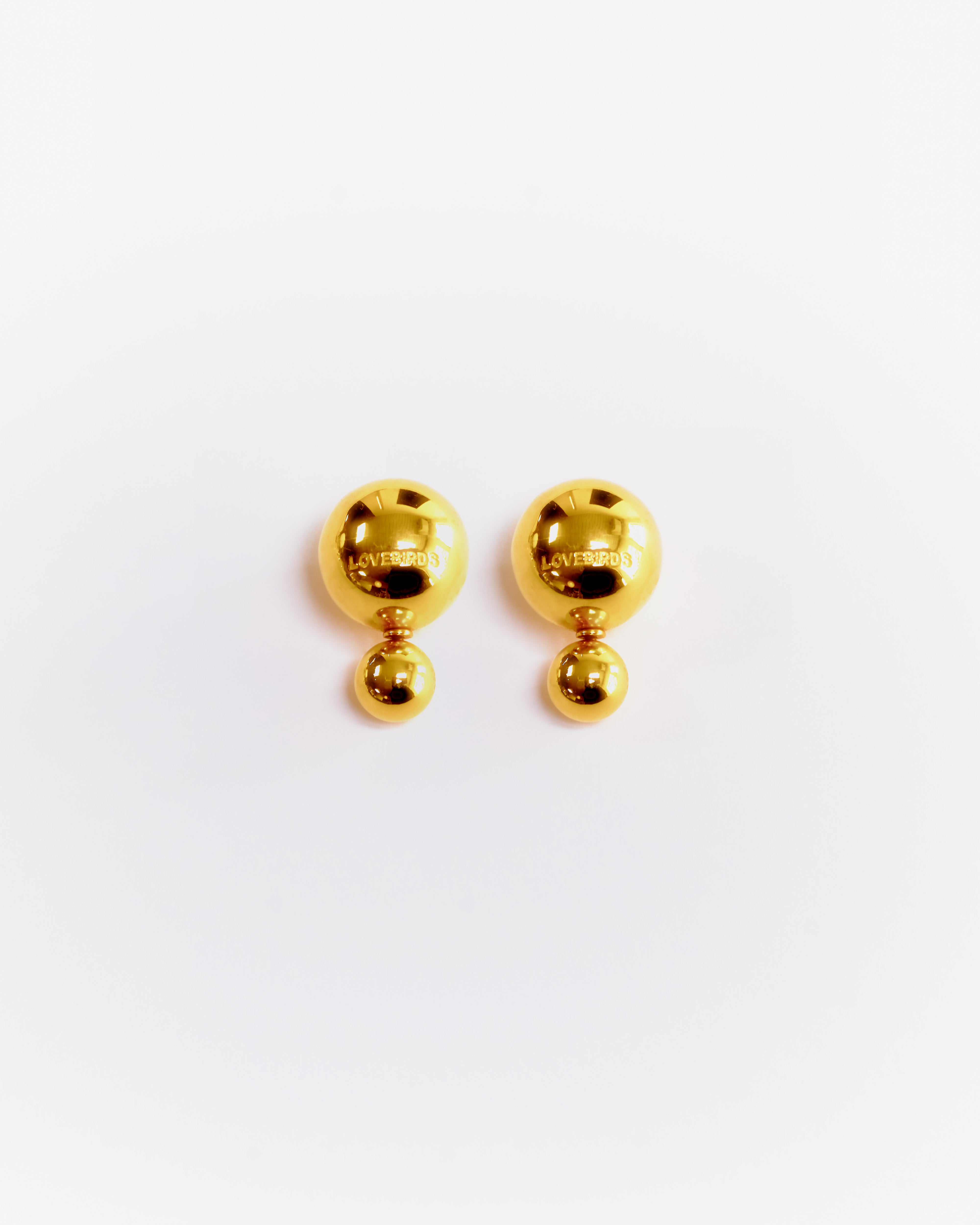 A pair of 35mm Sphere light weight Ear-studs with 18KT high shine gold finish, fastened by 15mm sphere. Comes with an extra regular fastener to use the spheres separately.