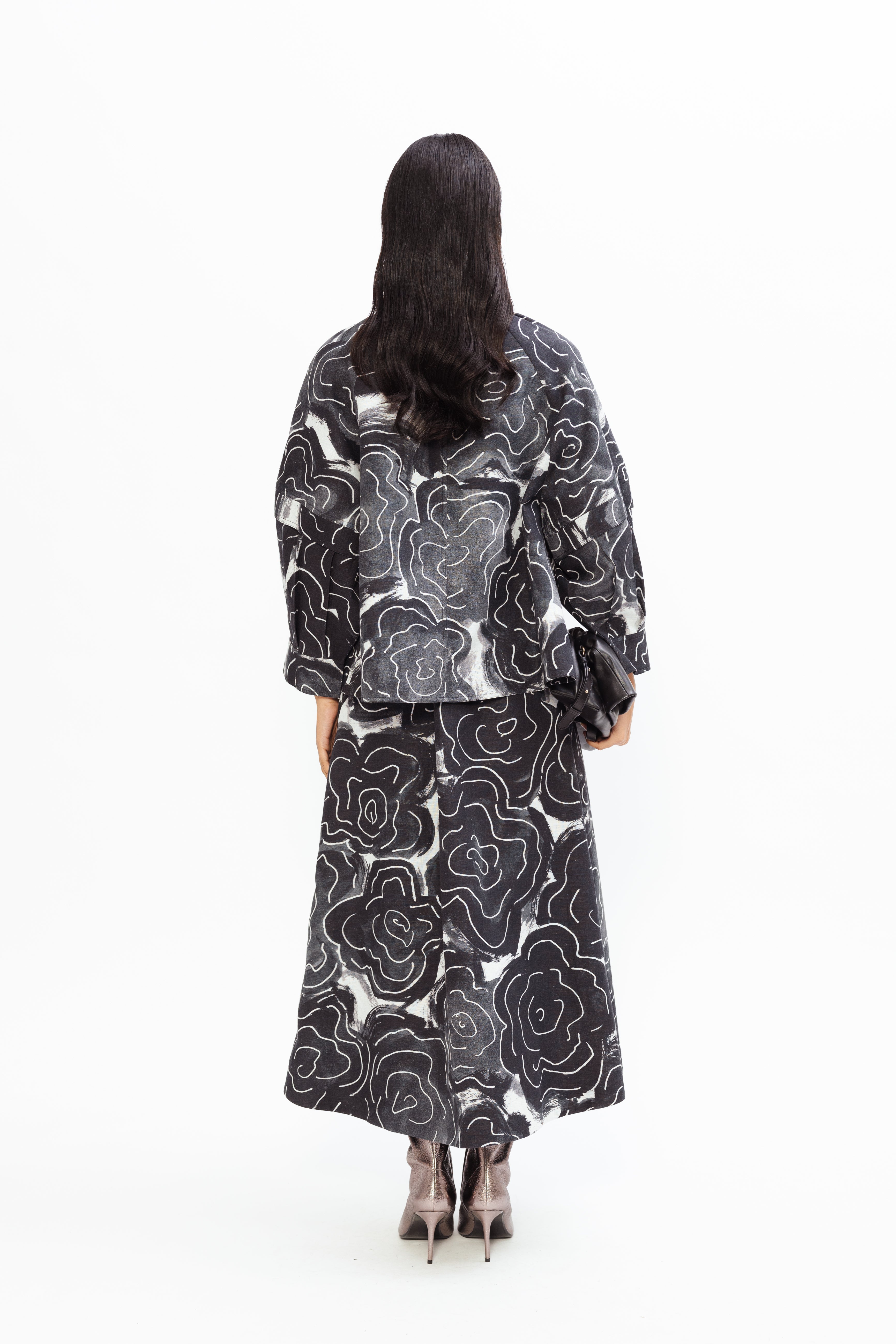 This A-line midi skirt offers a sophisticated yet comfortable fit, combining structure with graceful movement. Falling elegantly to midi length, it embodies timeless style with a modern edge. The artistic monochrome design lends a contemporary, high-fashion aesthetic, making it a versatile statement piece for any occasion.