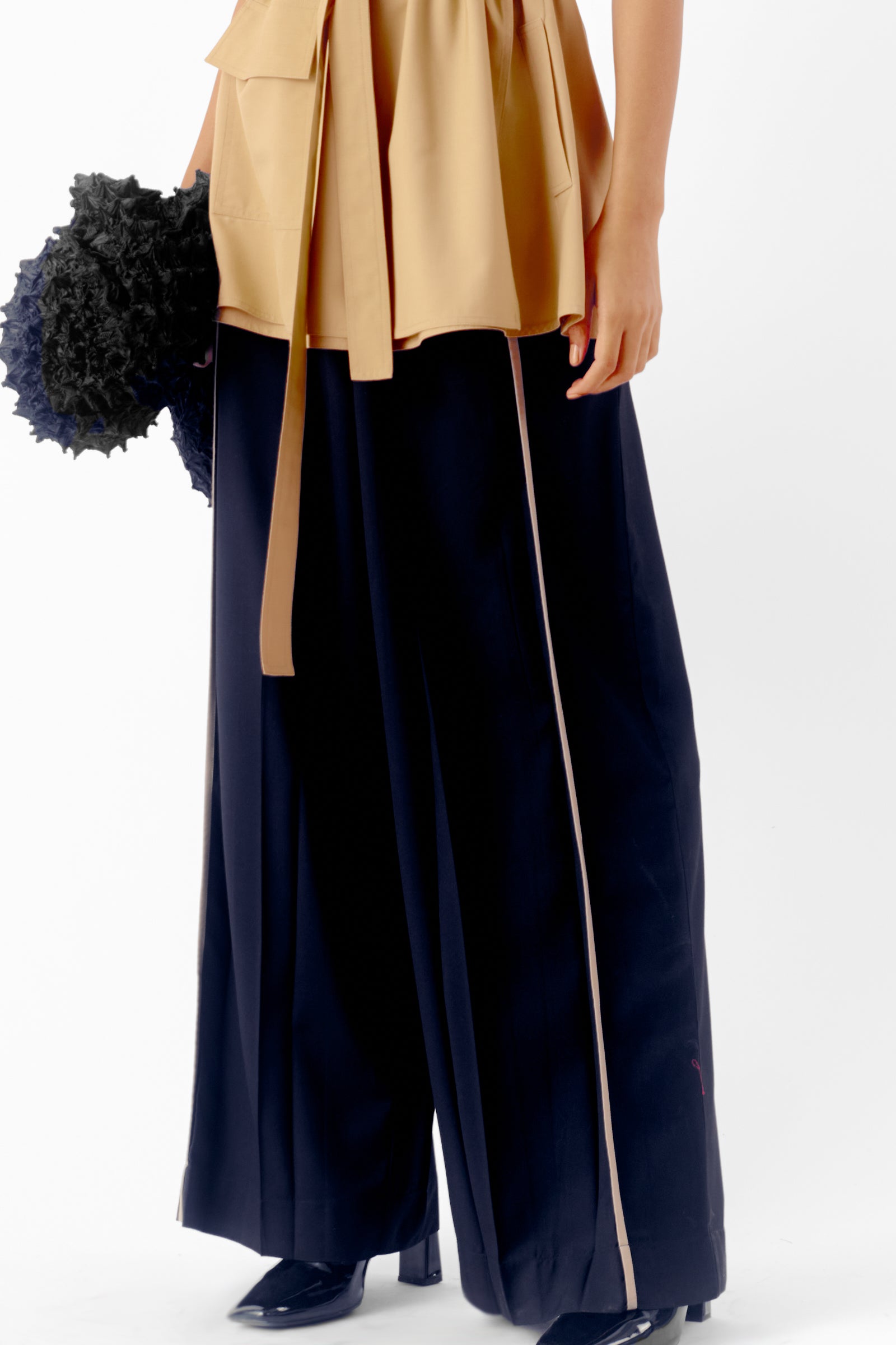 Relaxed fit trousers with a single front pleat for subtle tailoring, complemented by contrast slits for a modern touch.