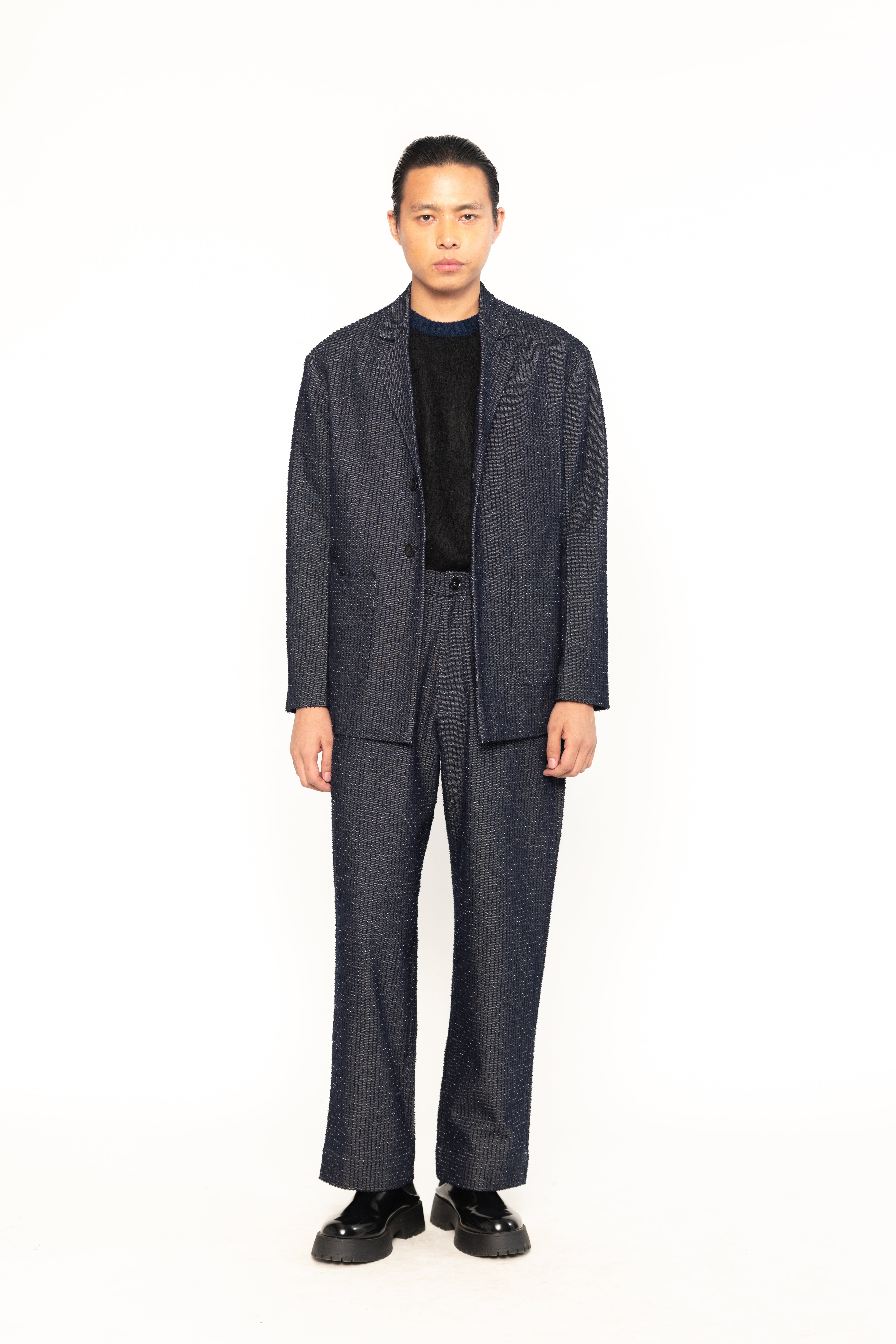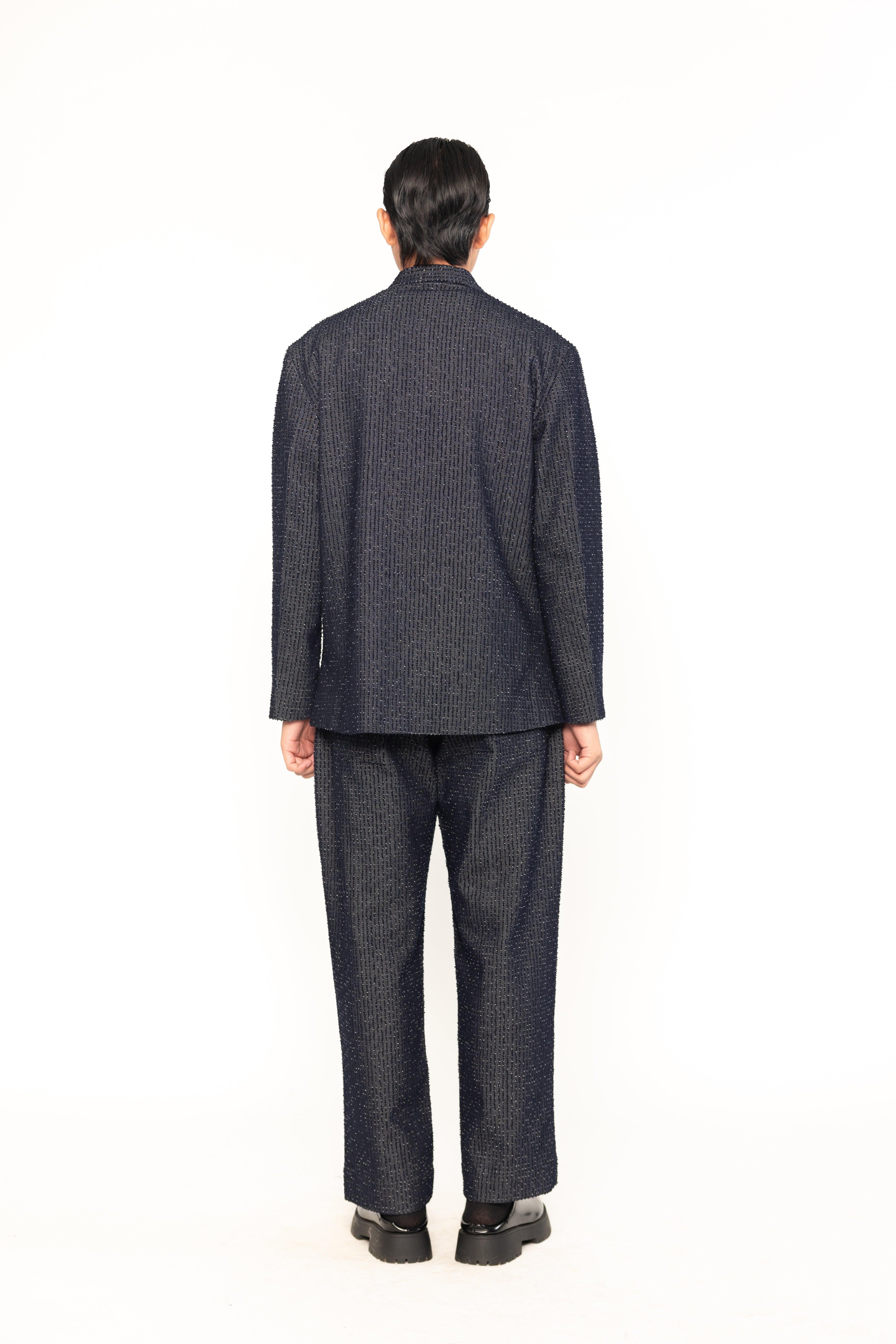 This textured denim men's blazer combines the classic structure of a blazer with the casual, rugged appeal of denim. The textured fabric adds depth and visual interest, making it a stylish, modern piece suitable for smart-casual occasions.