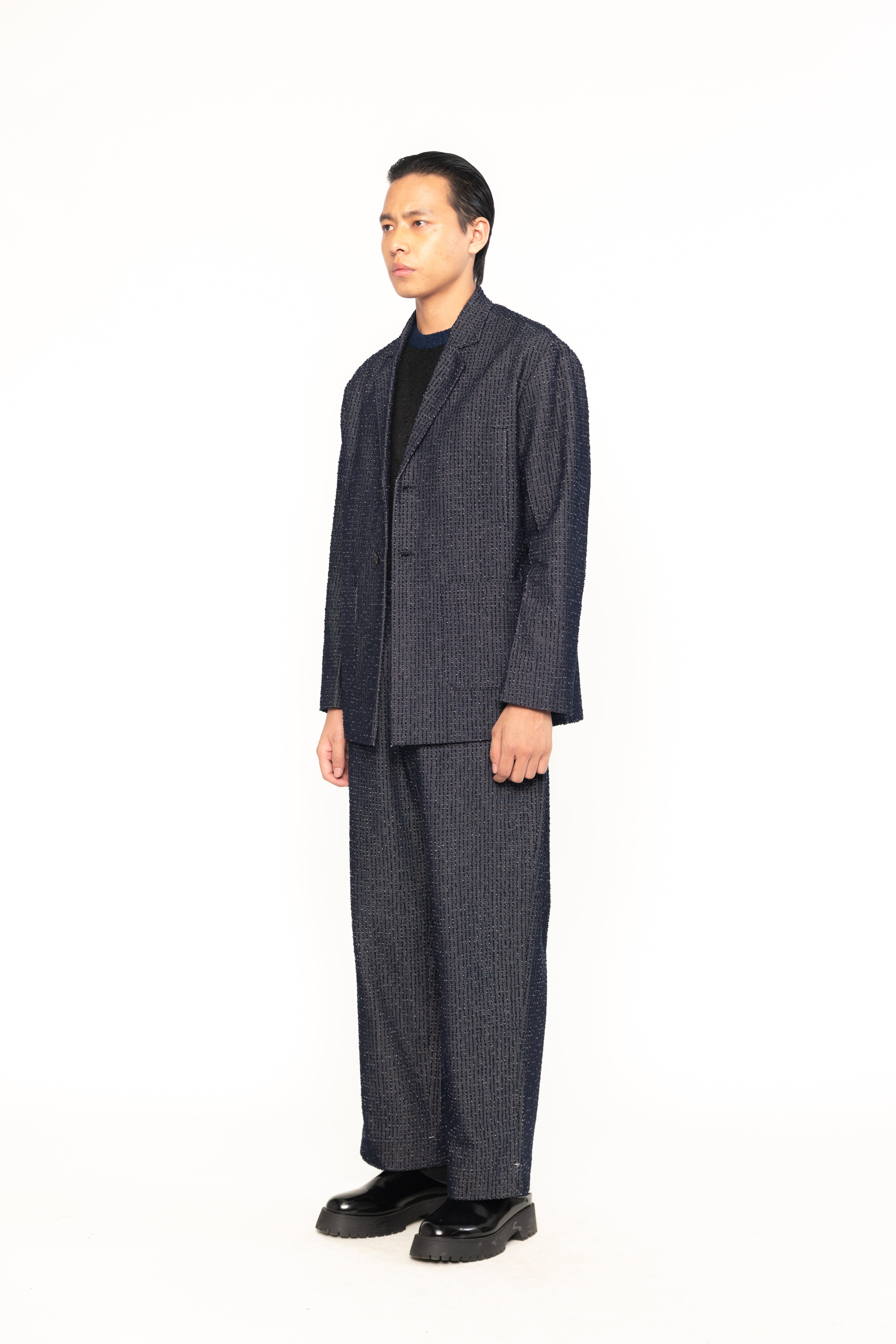 Relaxed-fit textured denim trousers offer a comfortable, laid-back fit with a unique, textured denim fabric. The relaxed silhouette ensures ease of movement, while the textured finish adds depth and visual interest, making them ideal for casual wear.