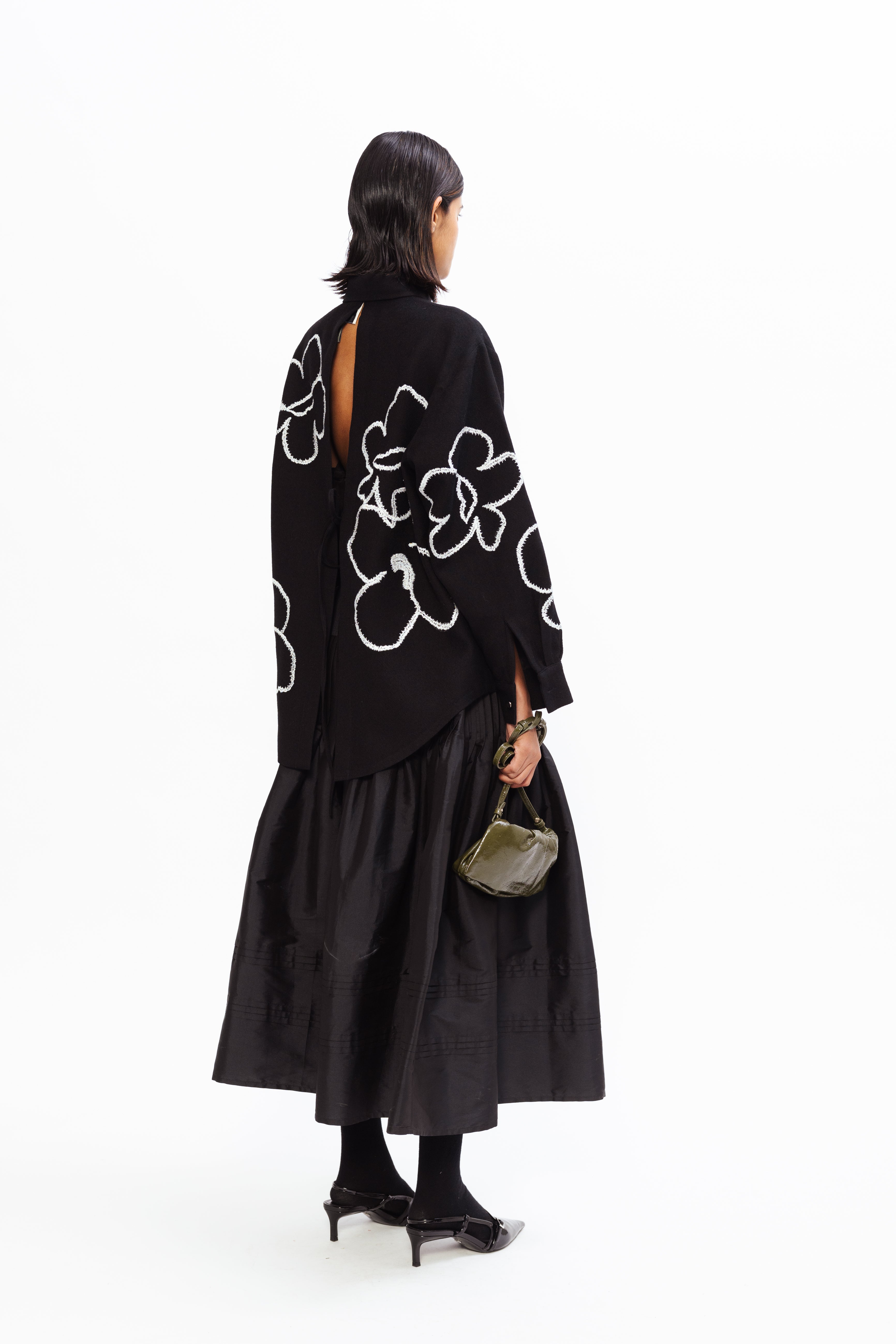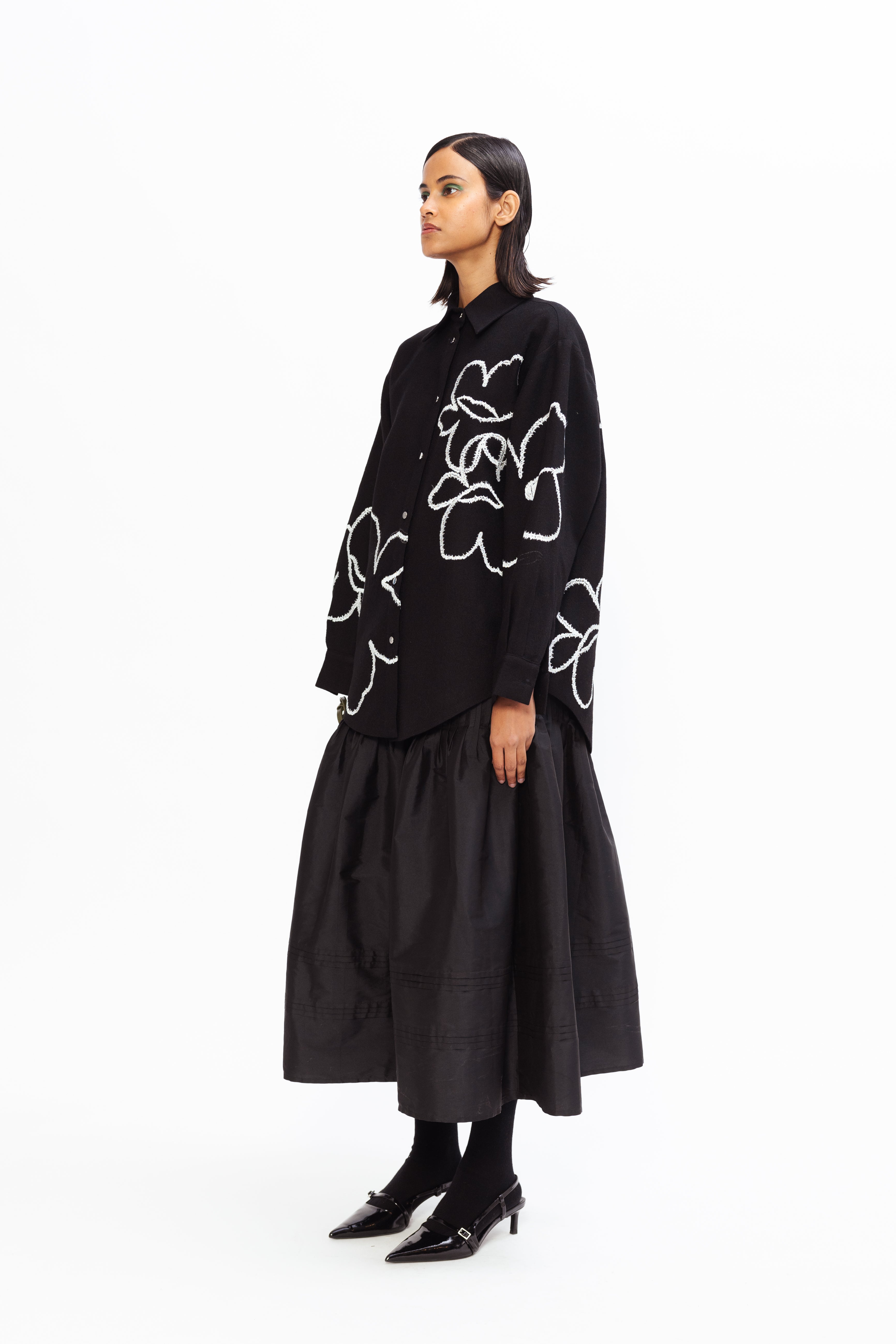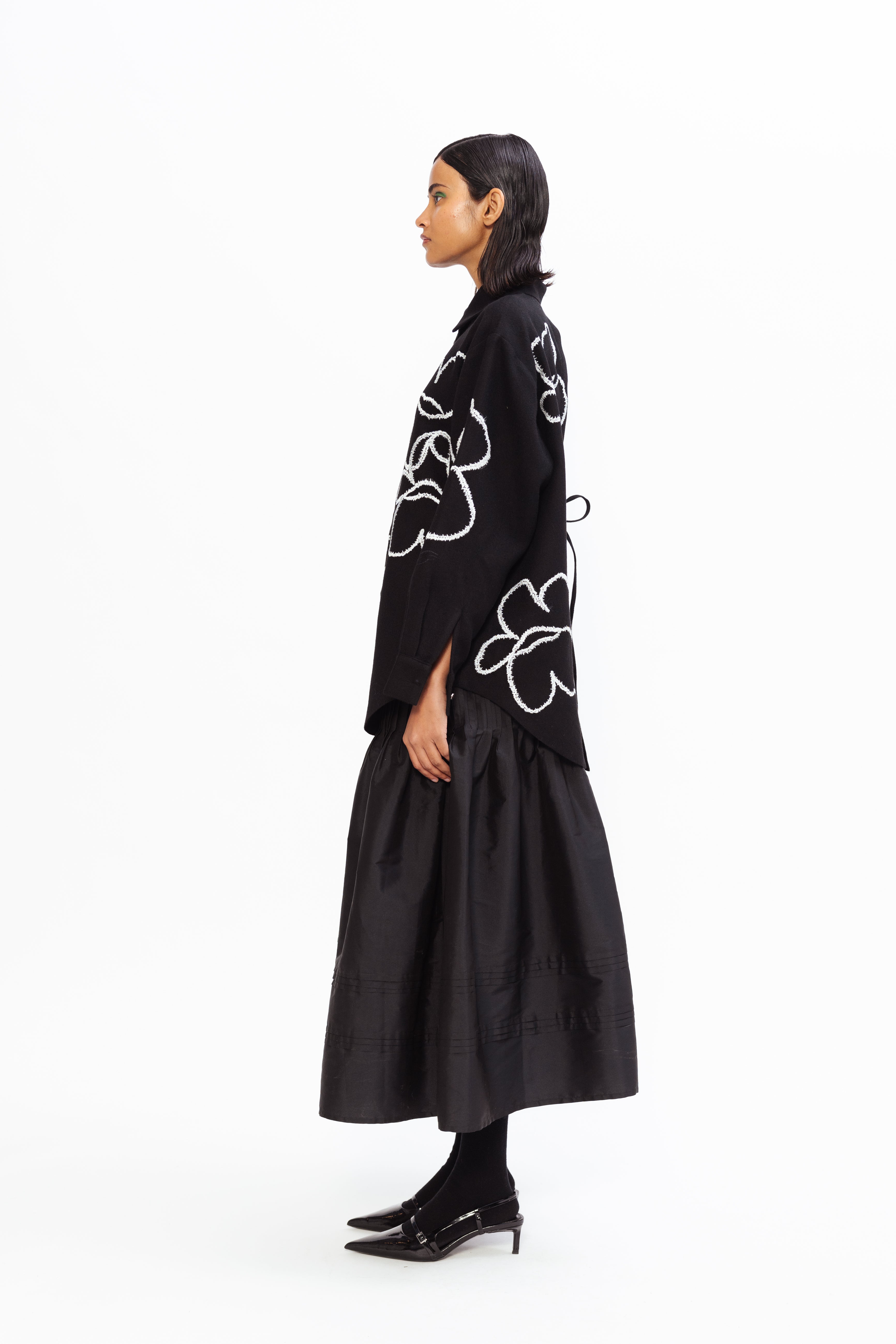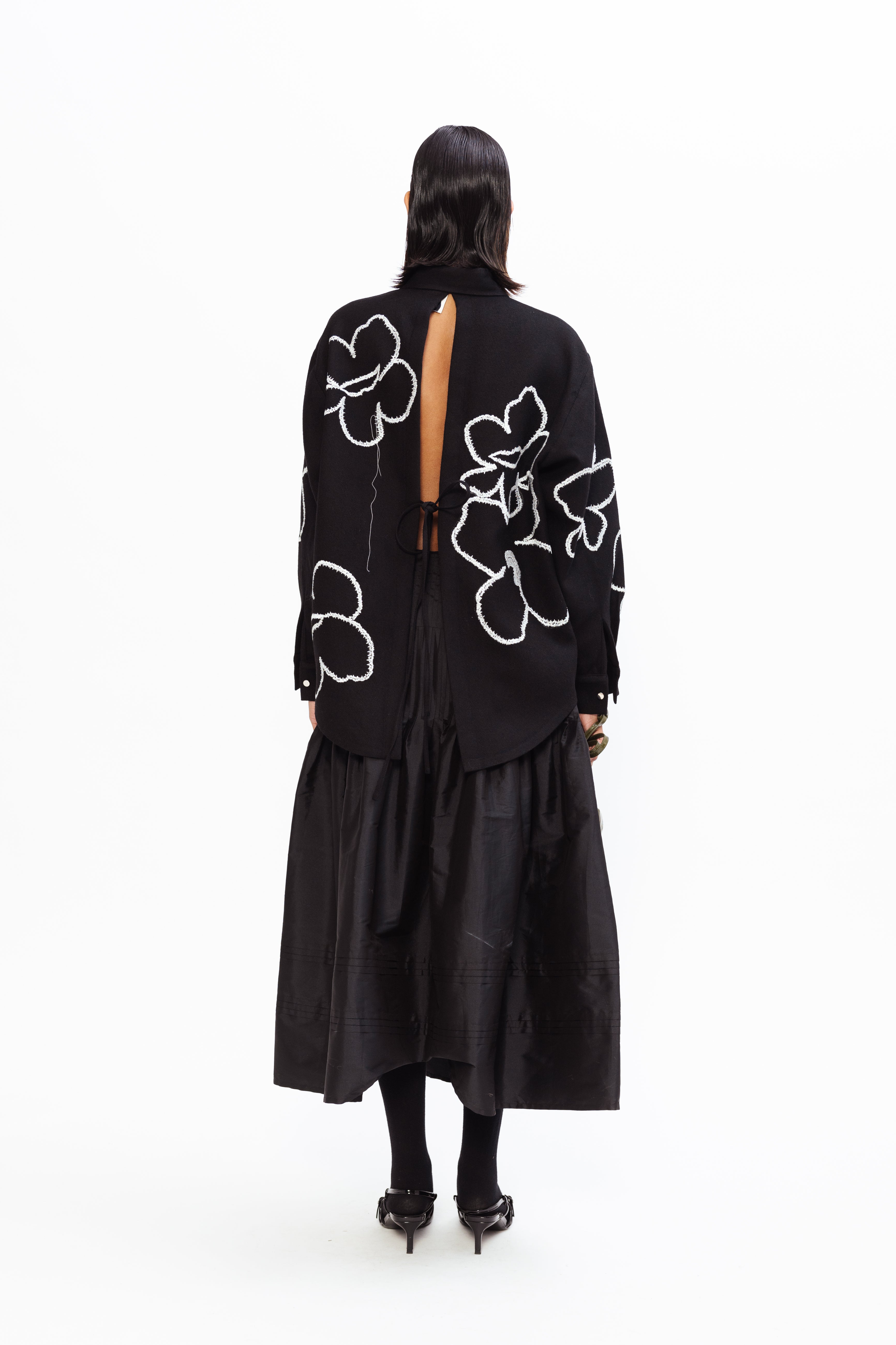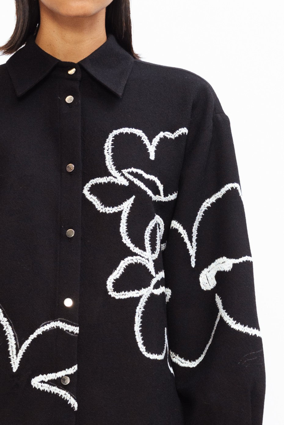 This structured wool shirt is crafted from high-quality fabric that offers warmth, texture, and a polished finish. Adorned with bold white floral embroidery in an abstract design, it stands out beautifully against the black base, blending classic tailoring with a modern artistic edge.