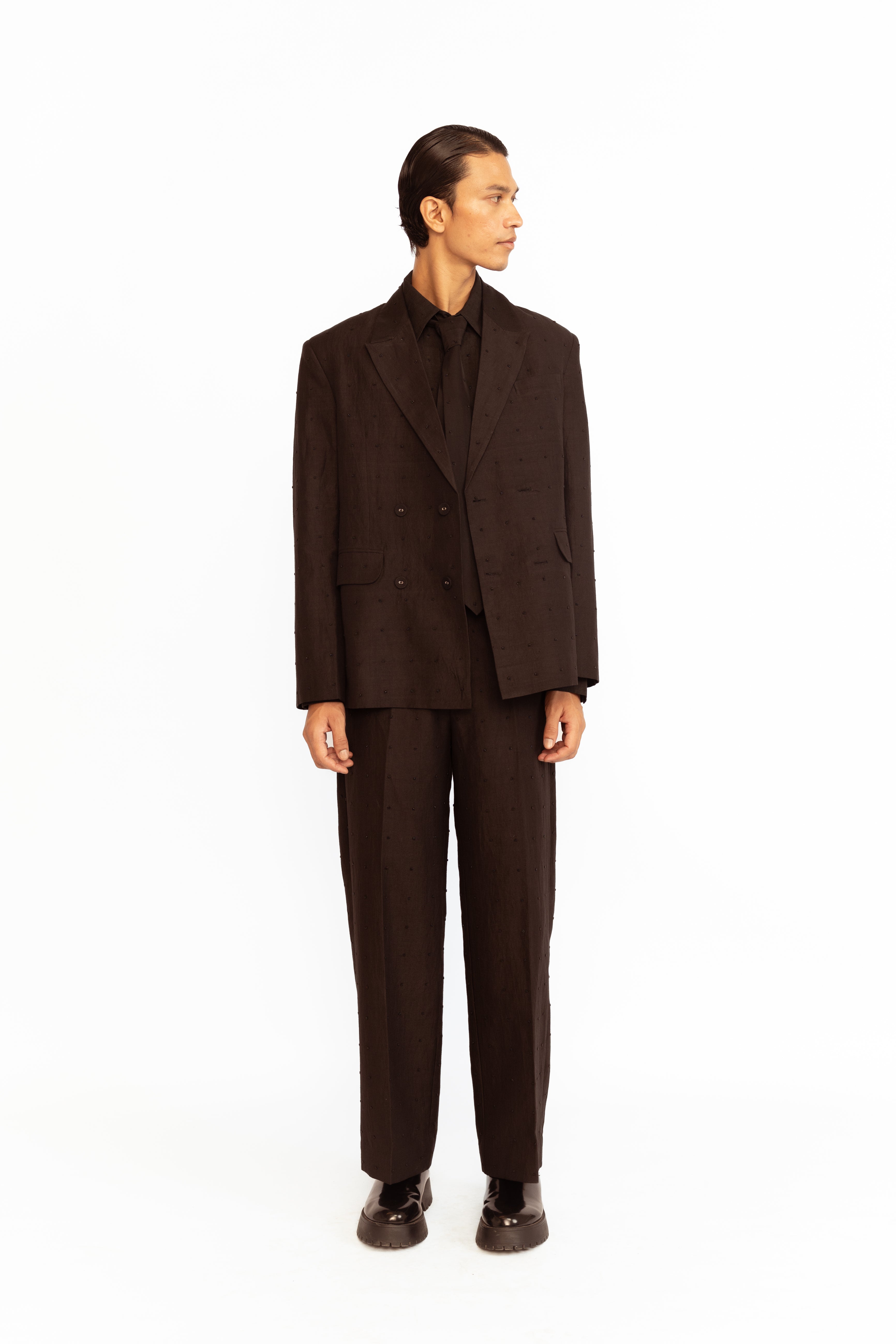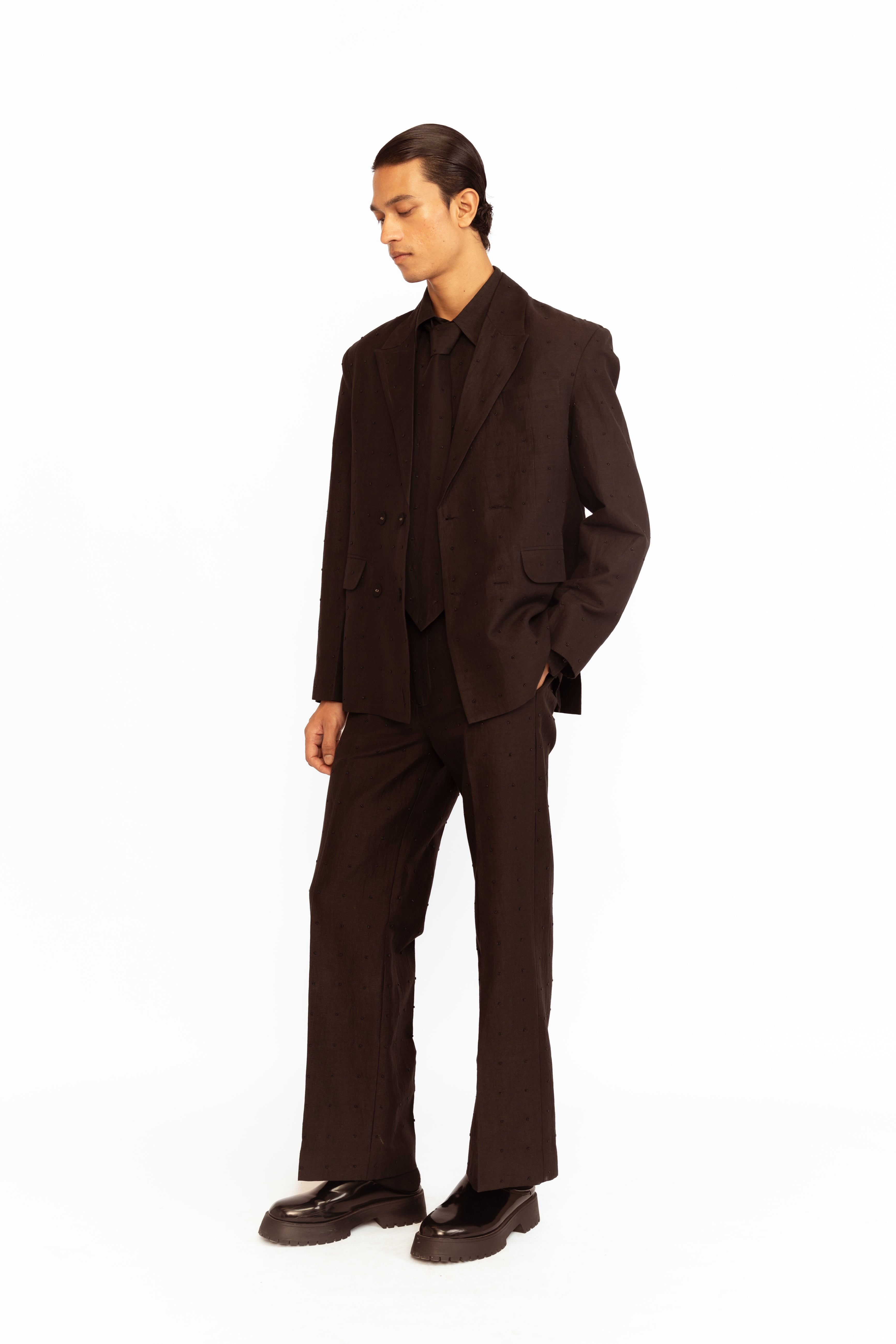 A statement piece with intricate detailing. This blazer features elegant lapel collars and a structured silhouette, highlighted by delicate grid bead embroidery for a touch of texture and shine. Designed with functional pockets and a four-button closure, it blends classic tailoring with modern embellishment for a sophisticated finish.