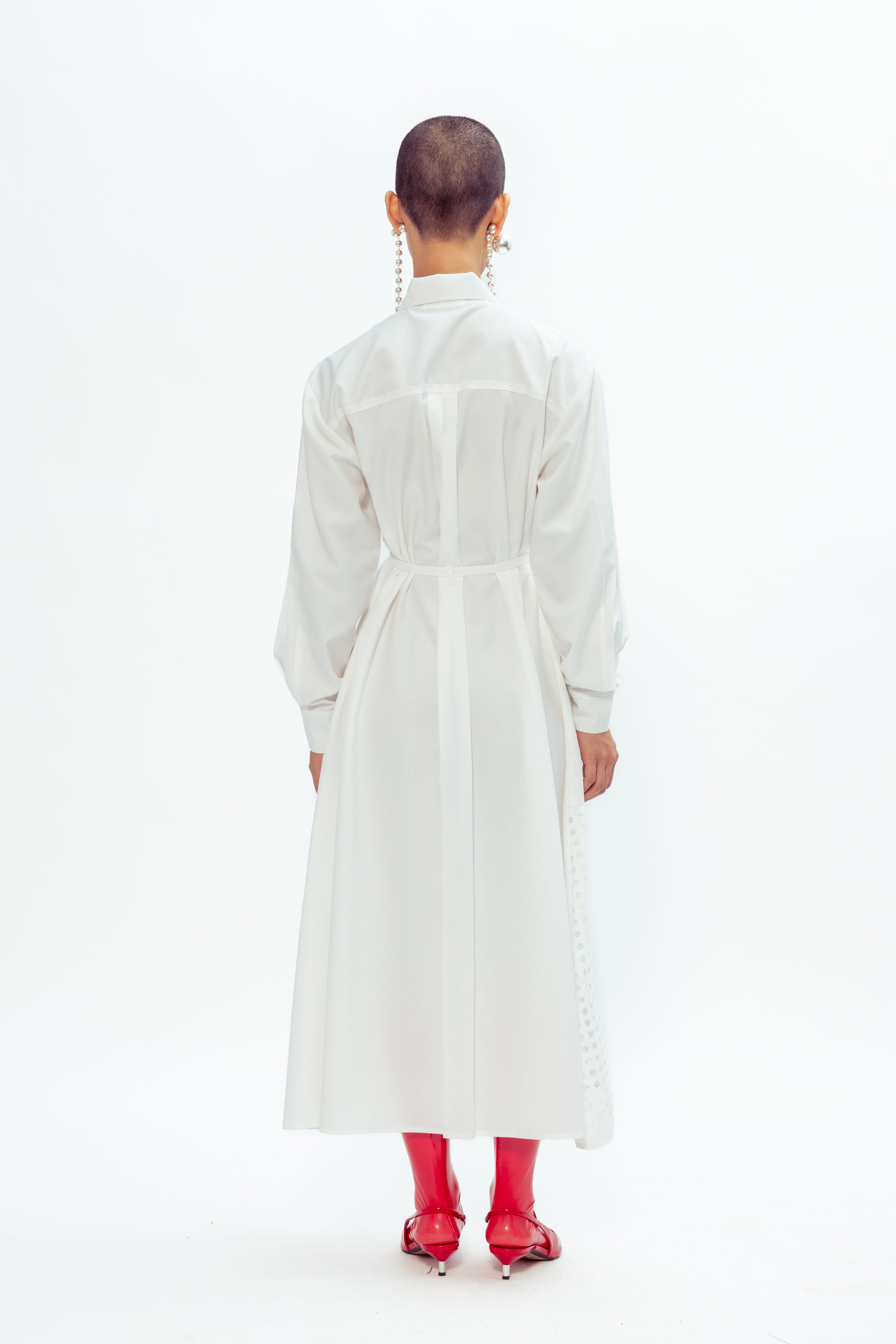 A trendy laser mesh shirt dress featuring a double drawstring belt for an adjustable fit. A perfect balance of sporty and chic.