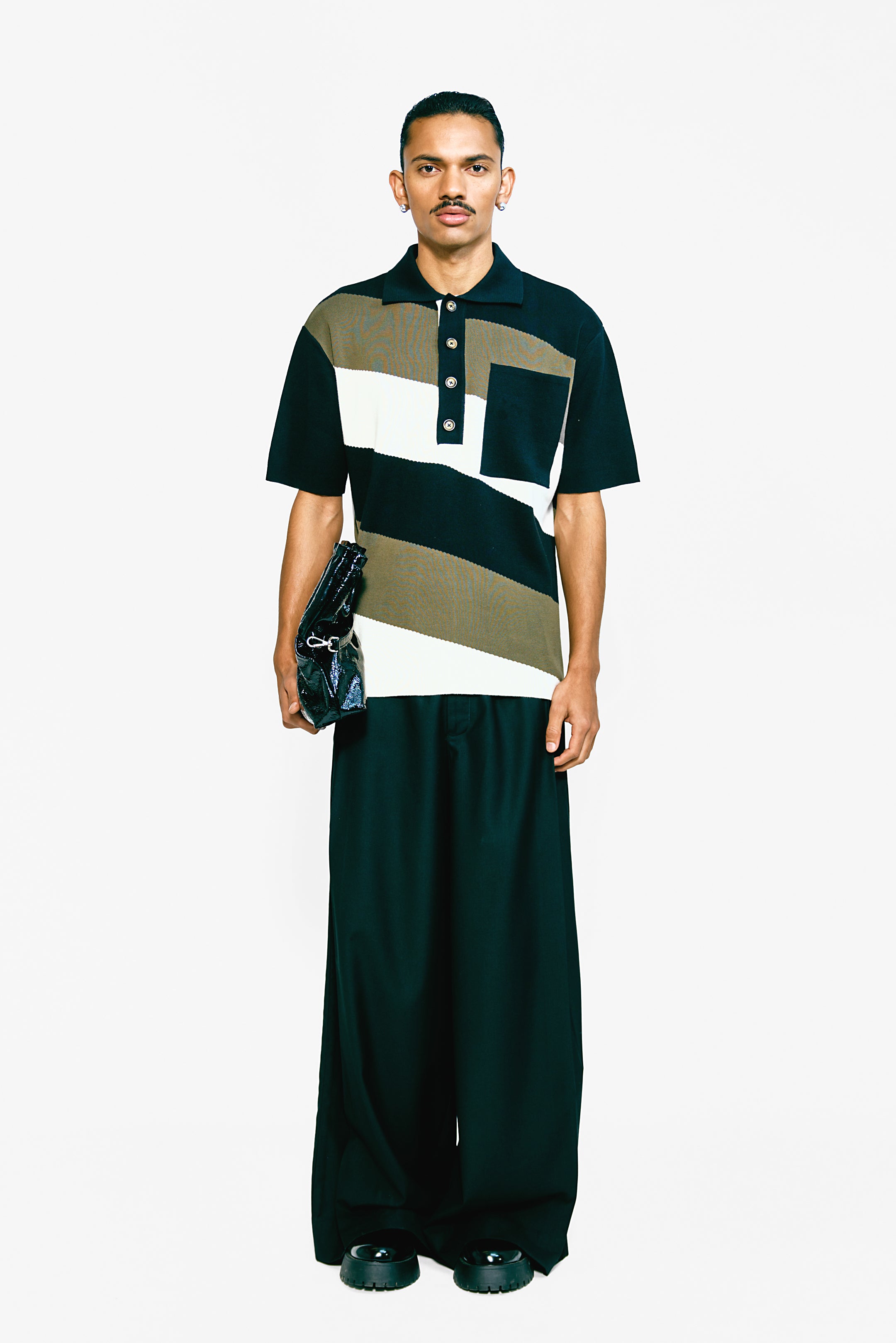 - Classic polo collar with a four-button placket, blending sporty and sophisticated elements.