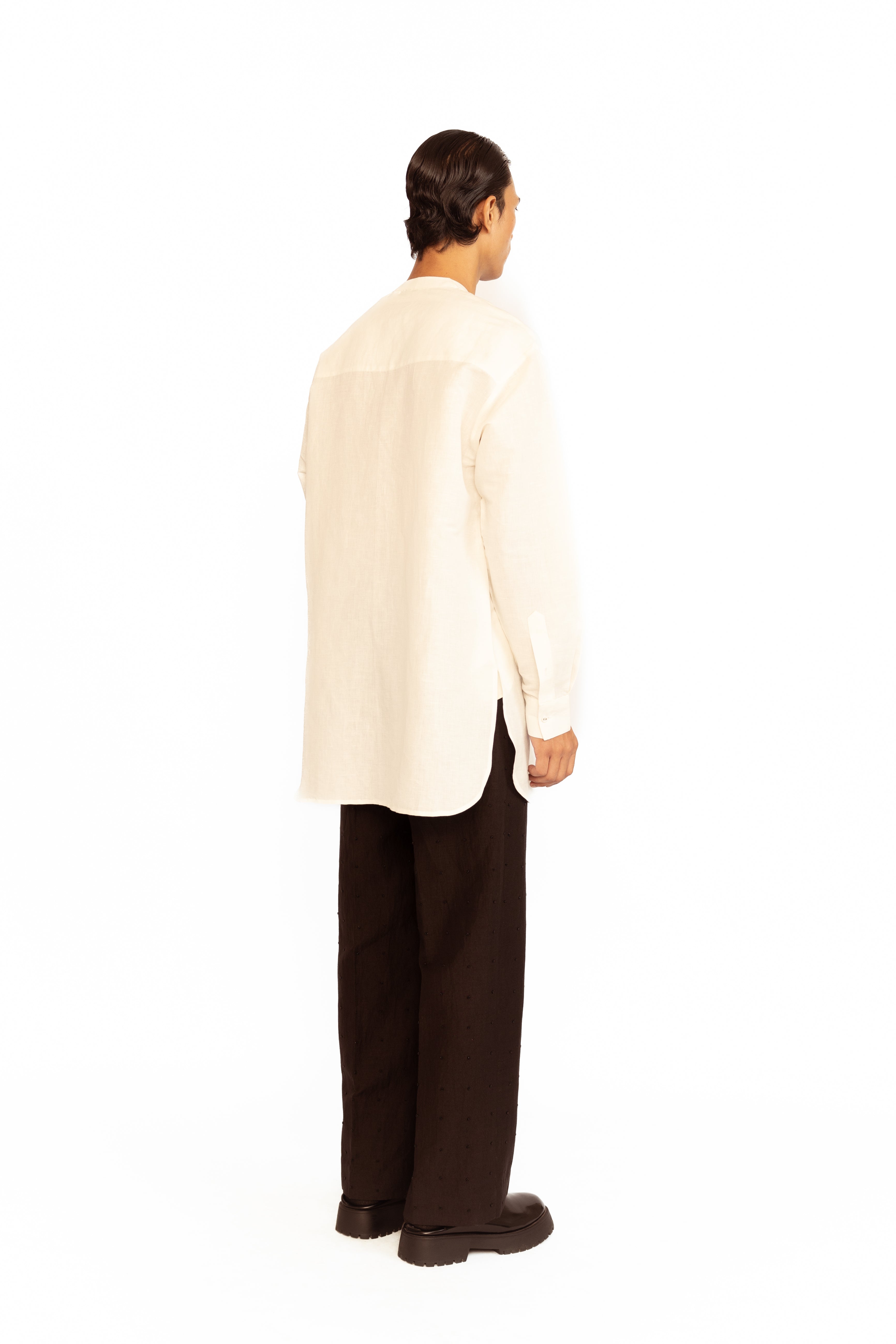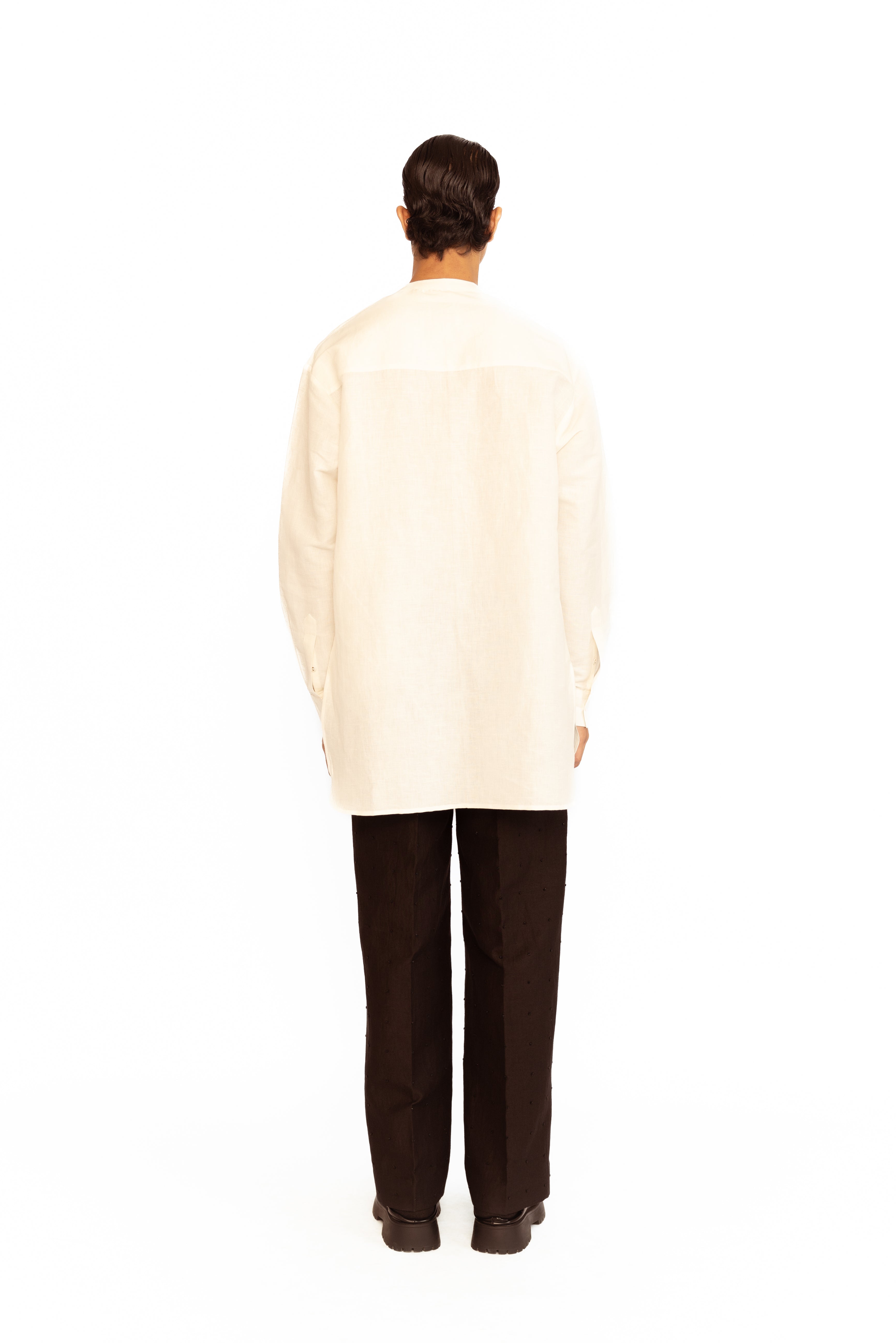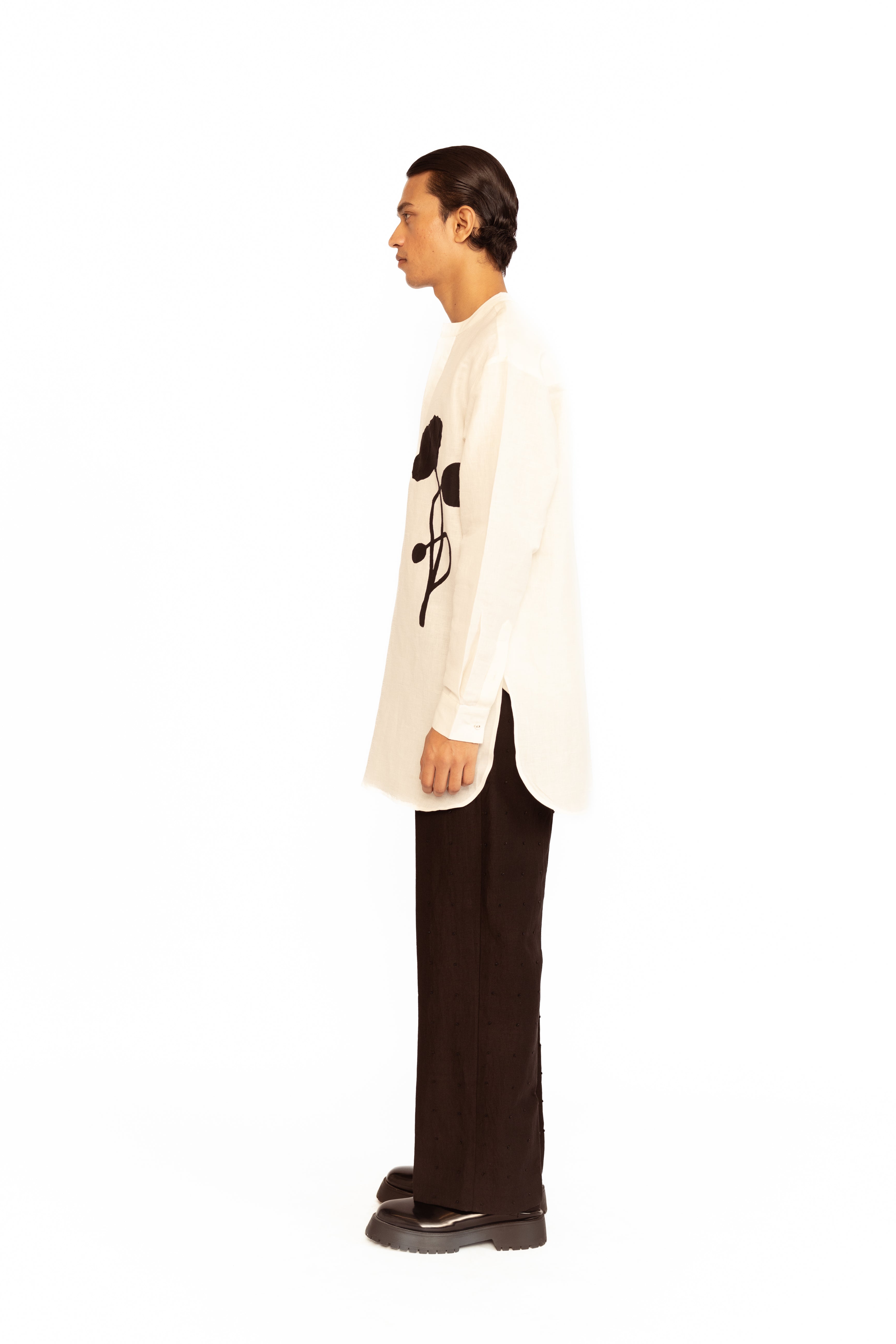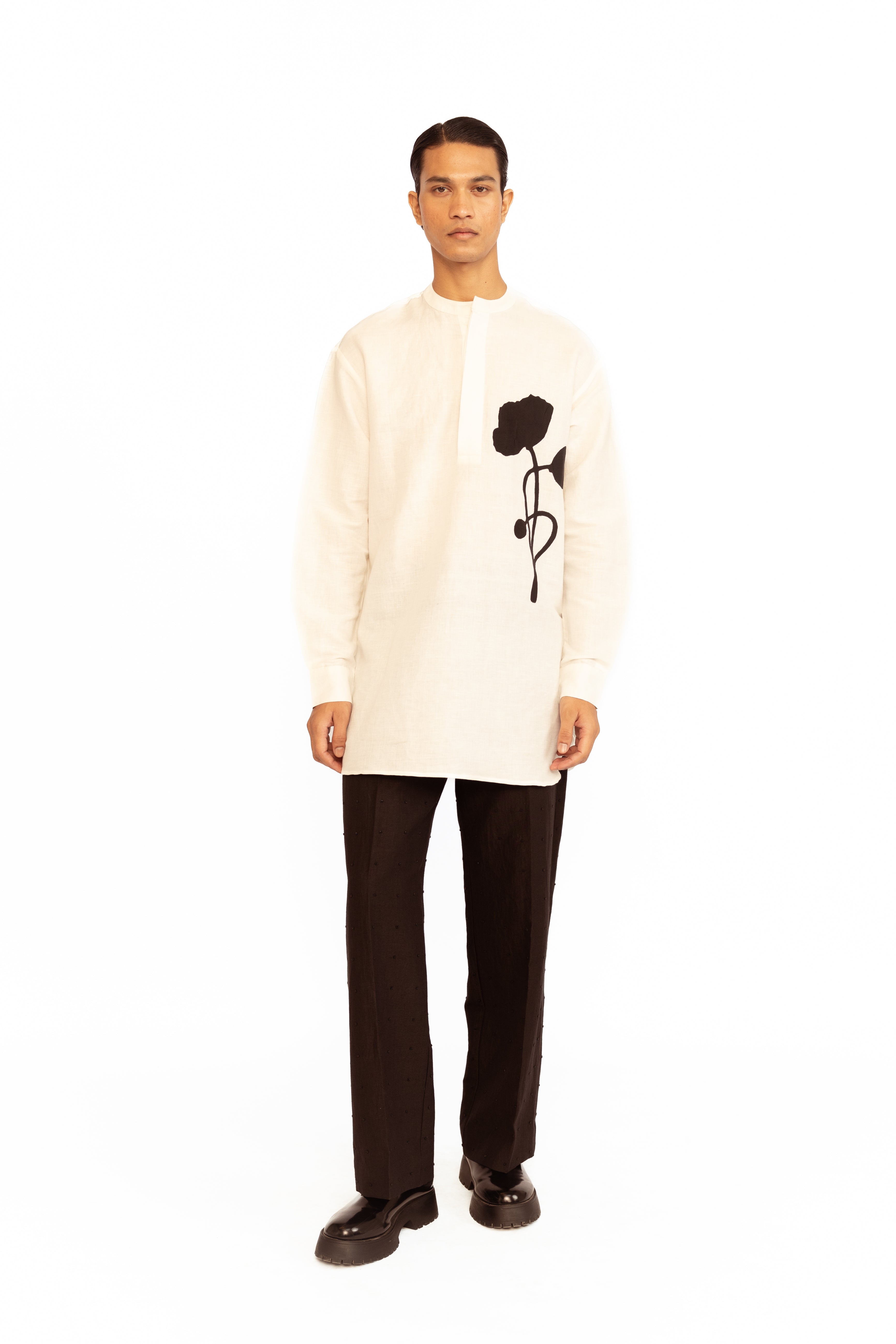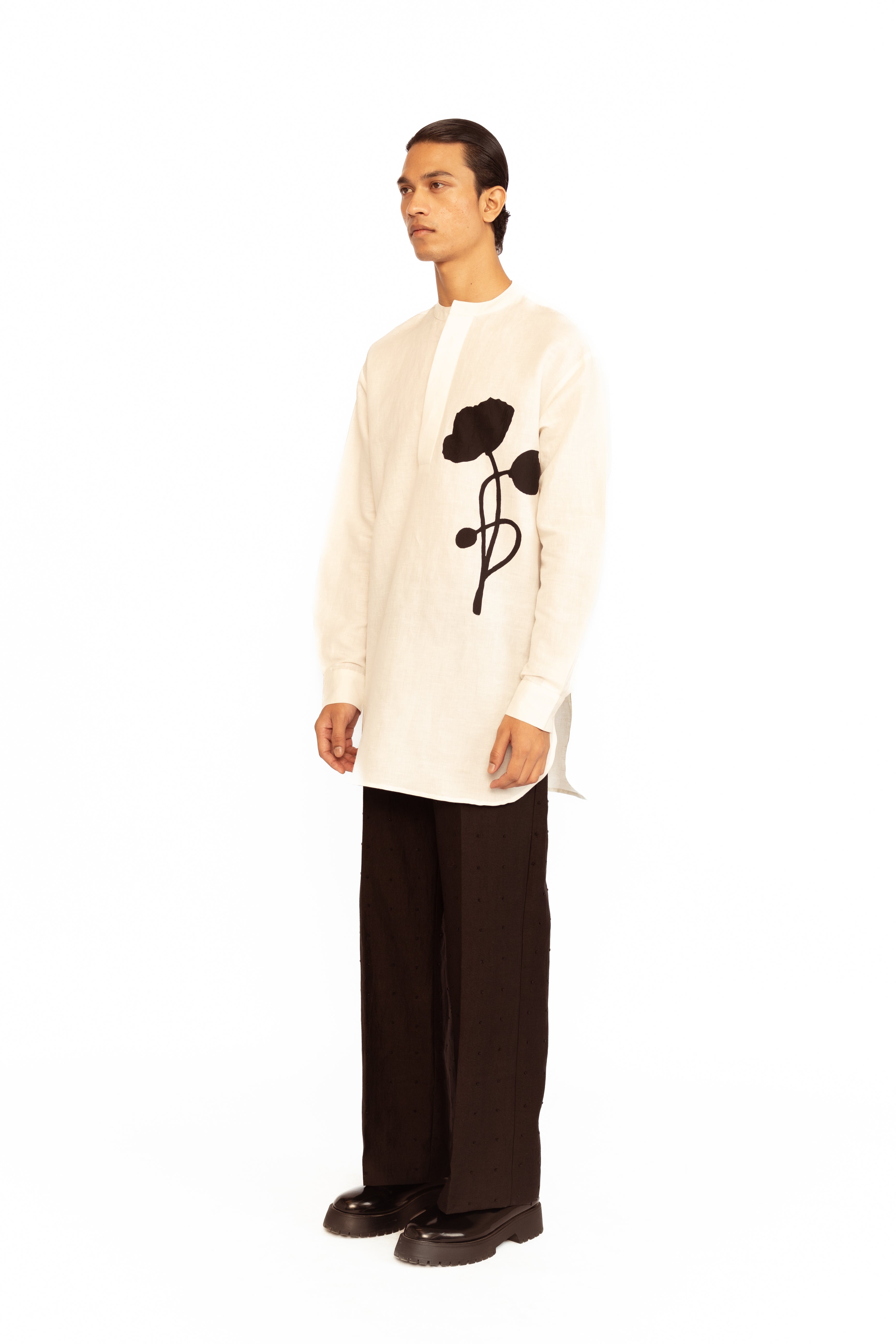 A relaxed mid-length kurta featuring mandarin collars and a concealed placket for a clean, refined look. Designed with full sleeves and sleeve plackets, it blends effortless style with classic detailing, enhanced by delicate floral applique.