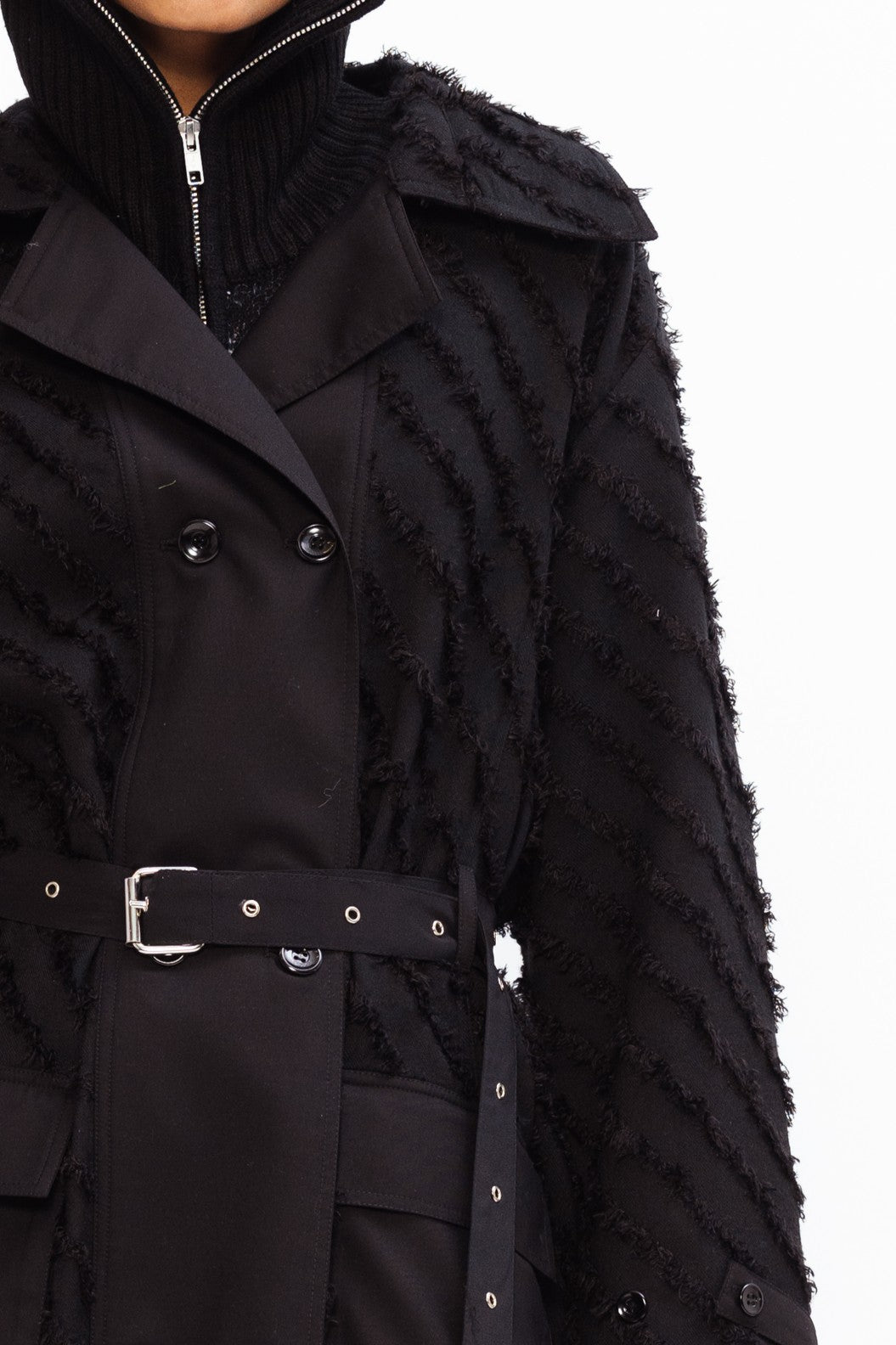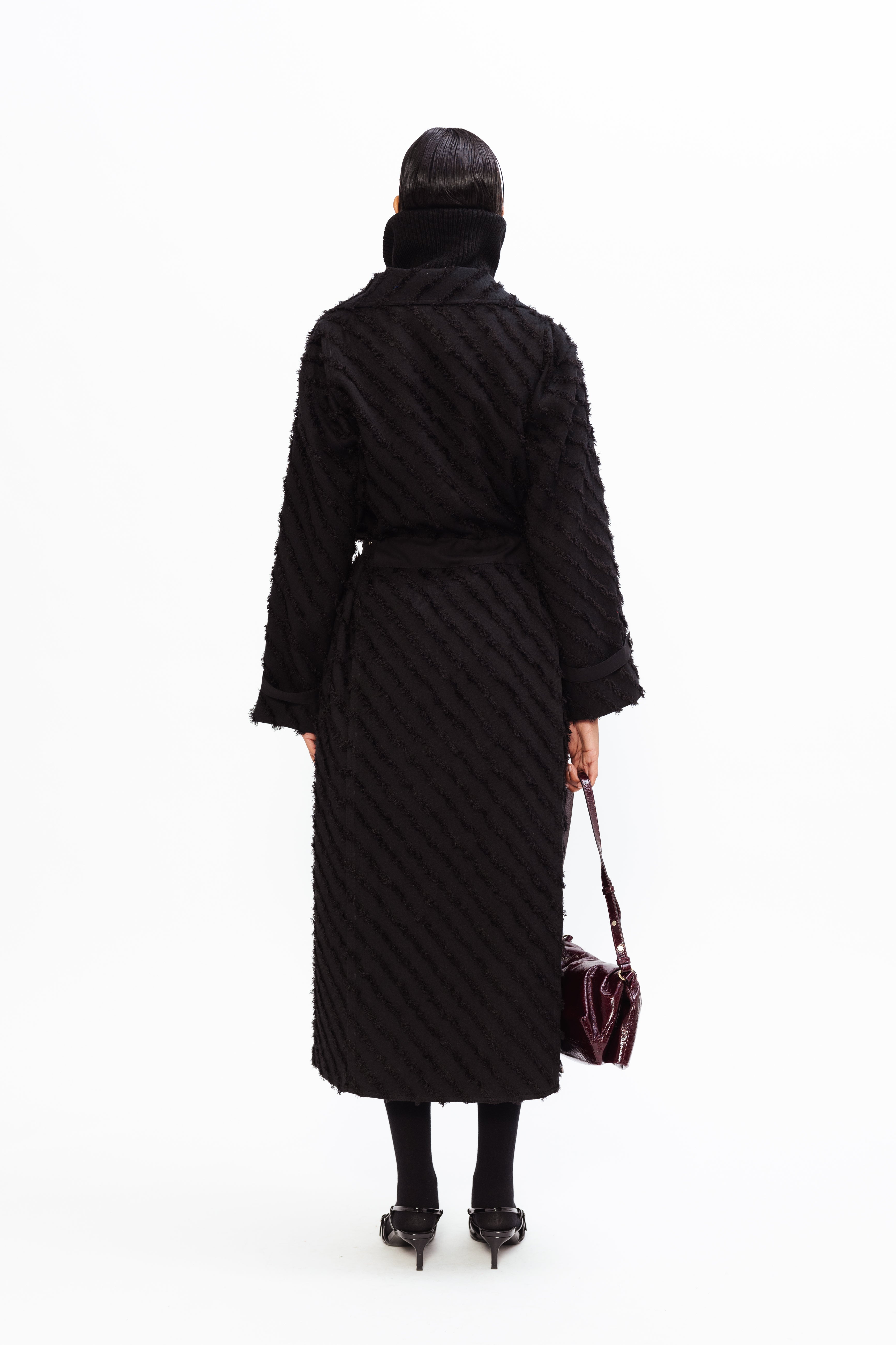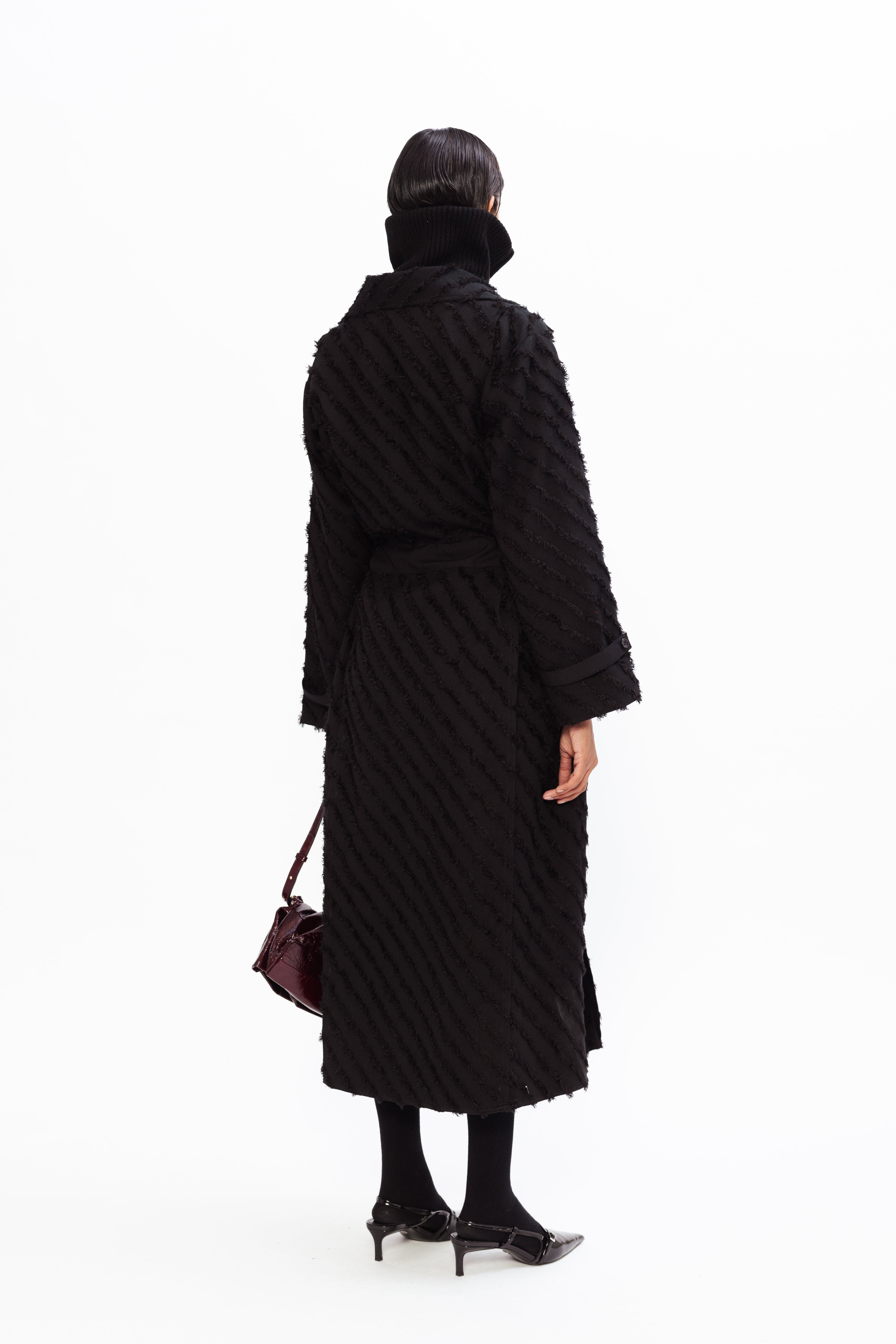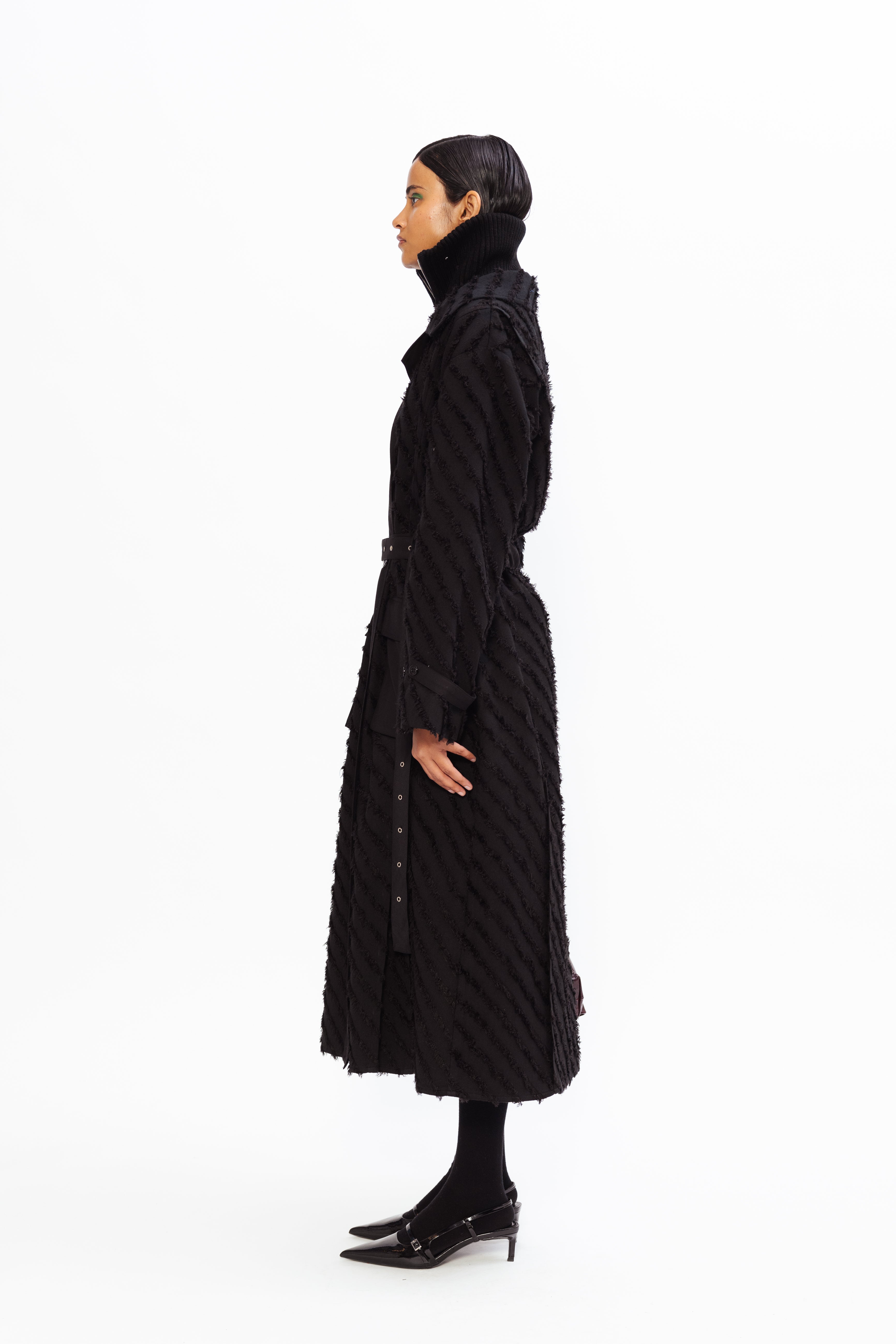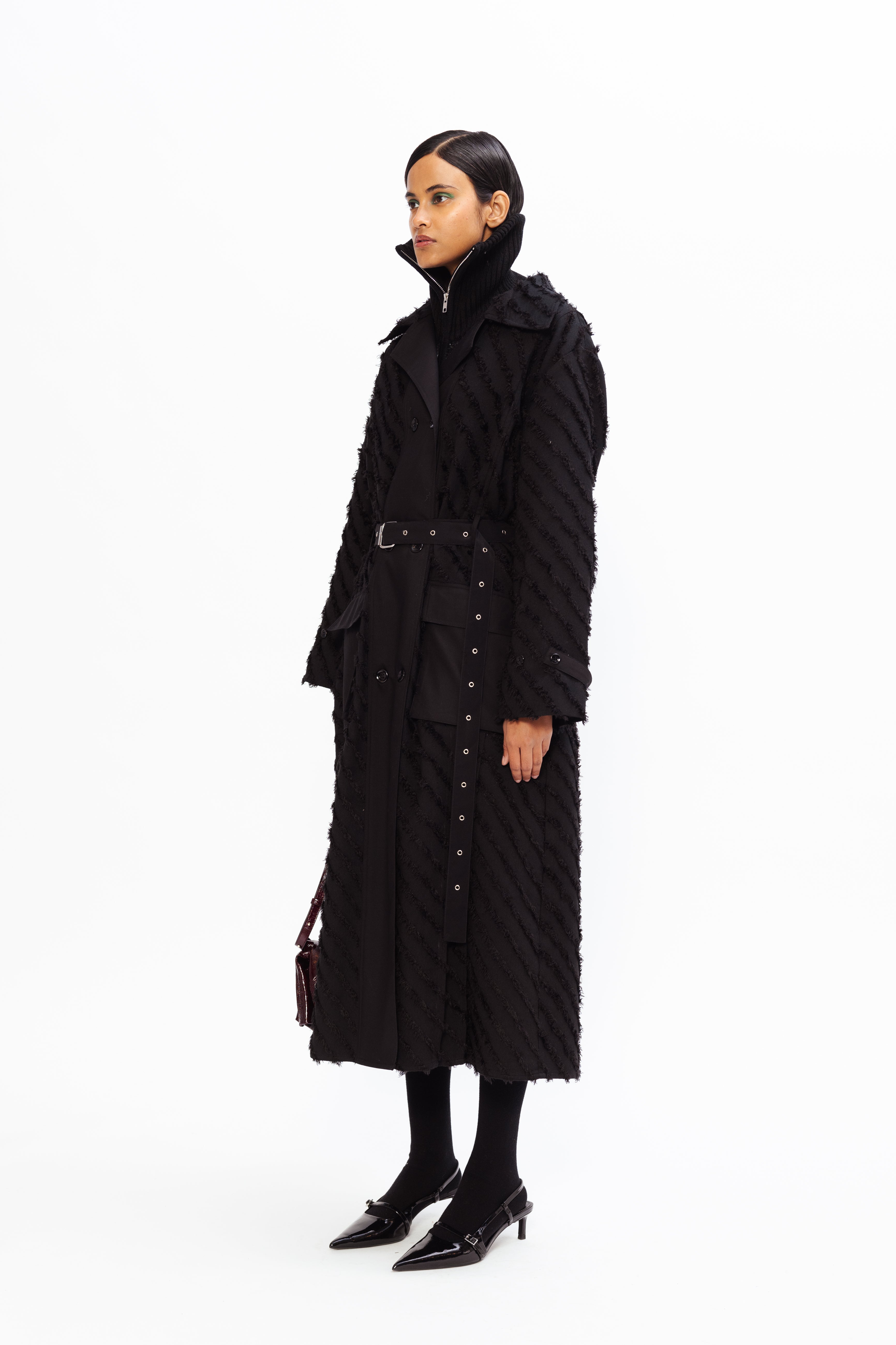 This trench-inspired coat features a long, tailored silhouette that extends below the knee, offering a dramatic and elegant presence. Blending timeless design with contemporary detailing, it serves as a sophisticated and versatile statement piece for refined, modern dressing.