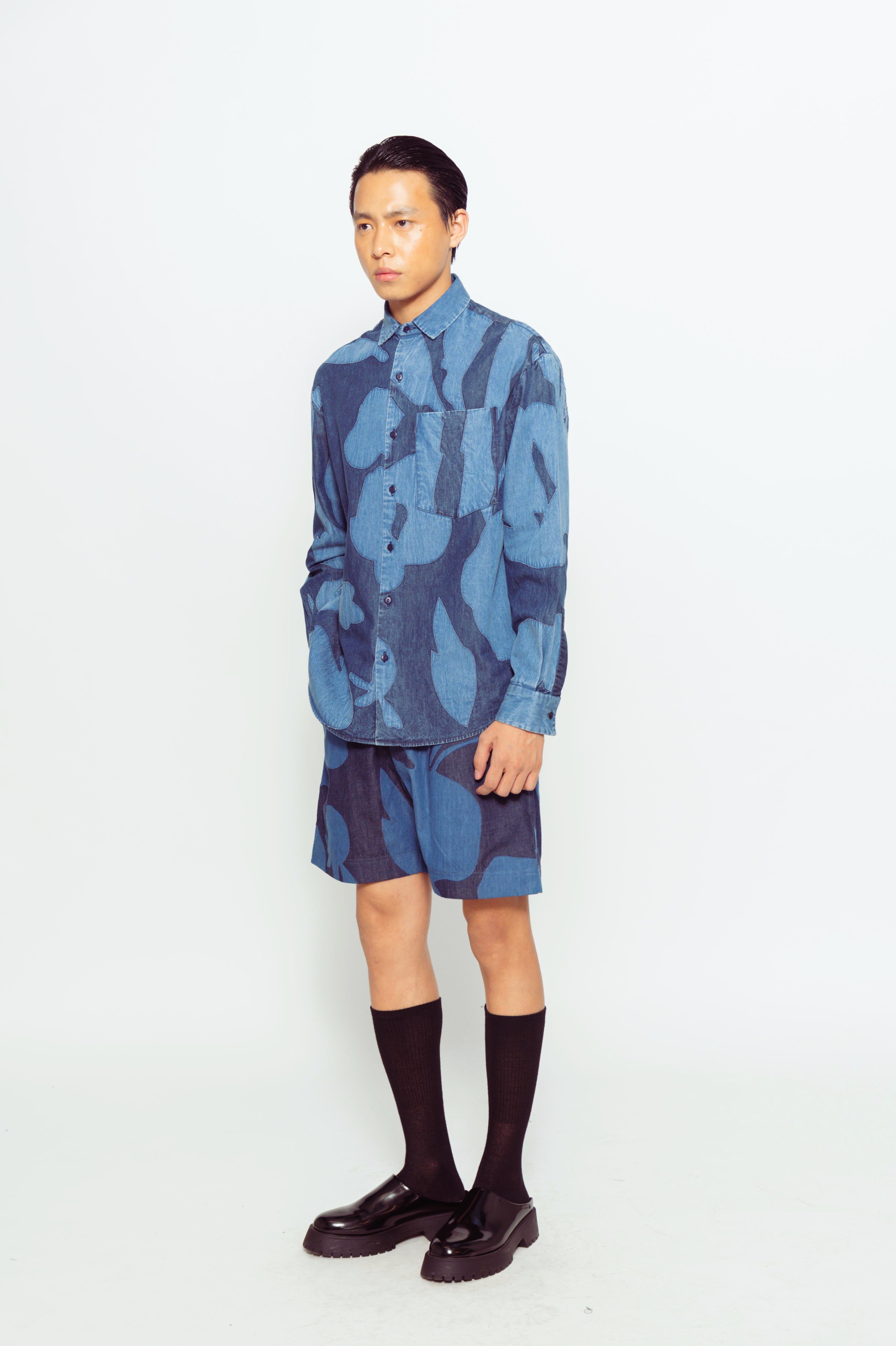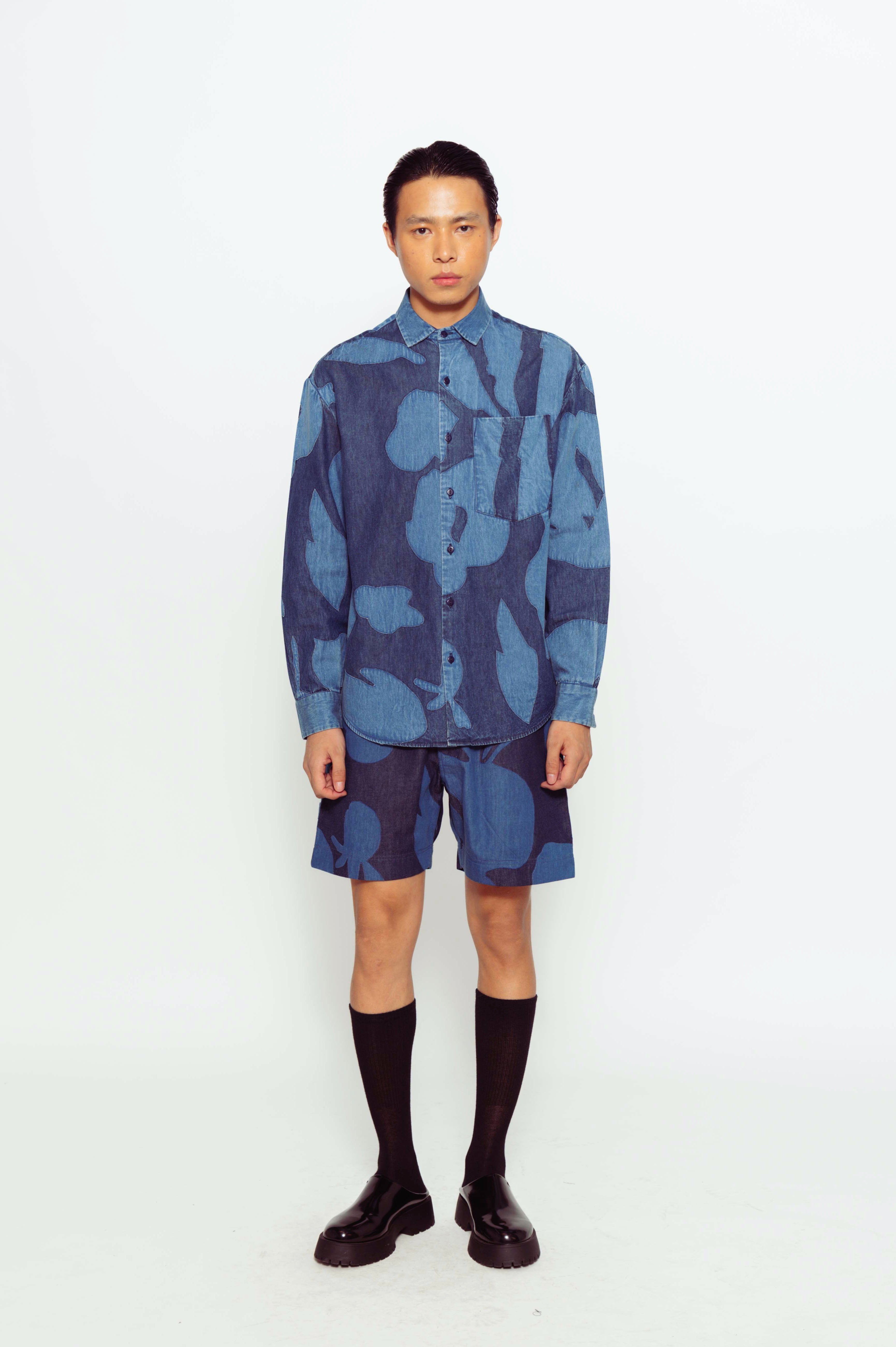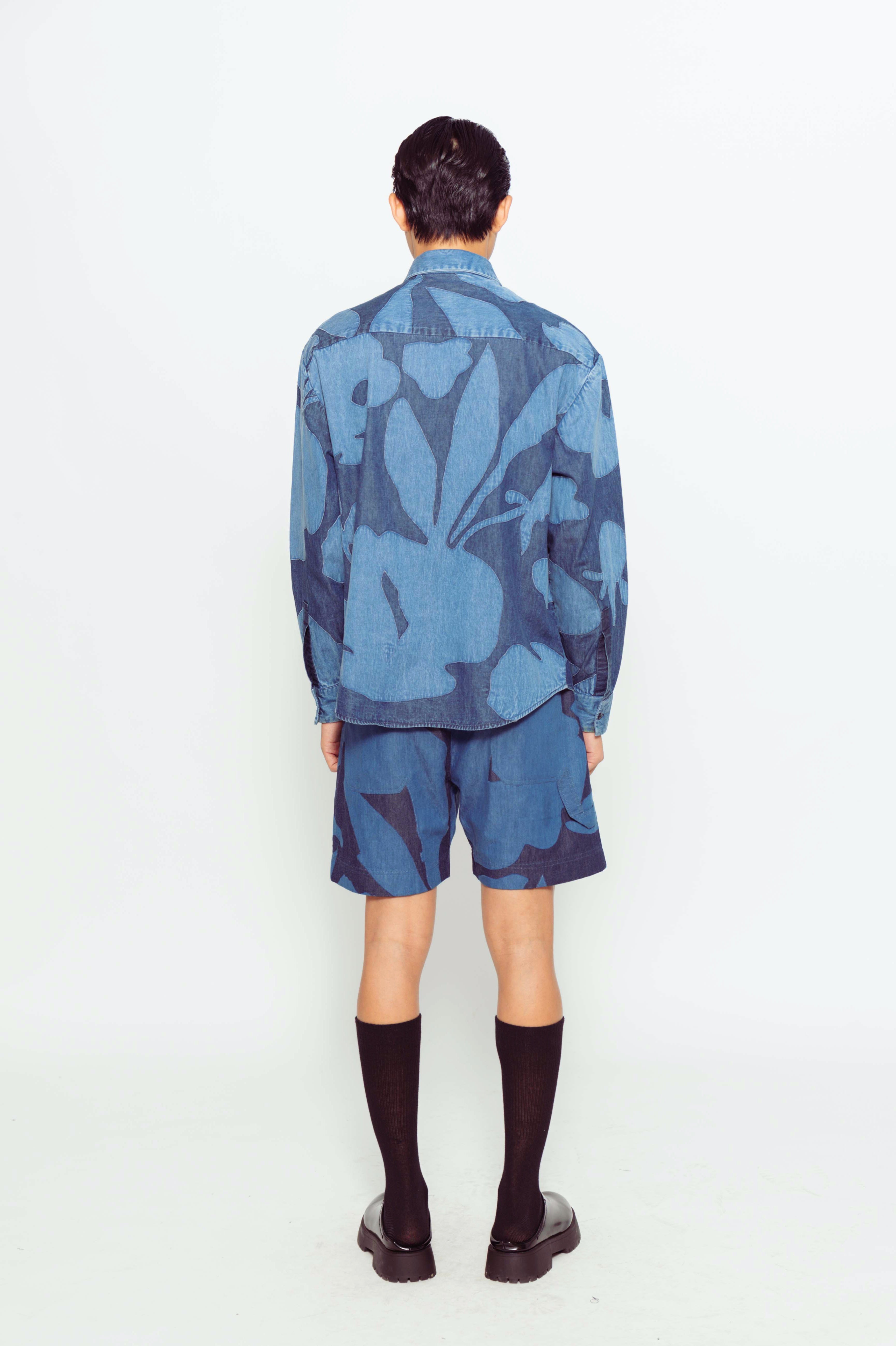 Men’s denim shorts with lighter color floral applique feature subtle, decorative floral patches that contrast with the base denim. The applique adds a unique and stylish element to the casual, relaxed design of the shorts.