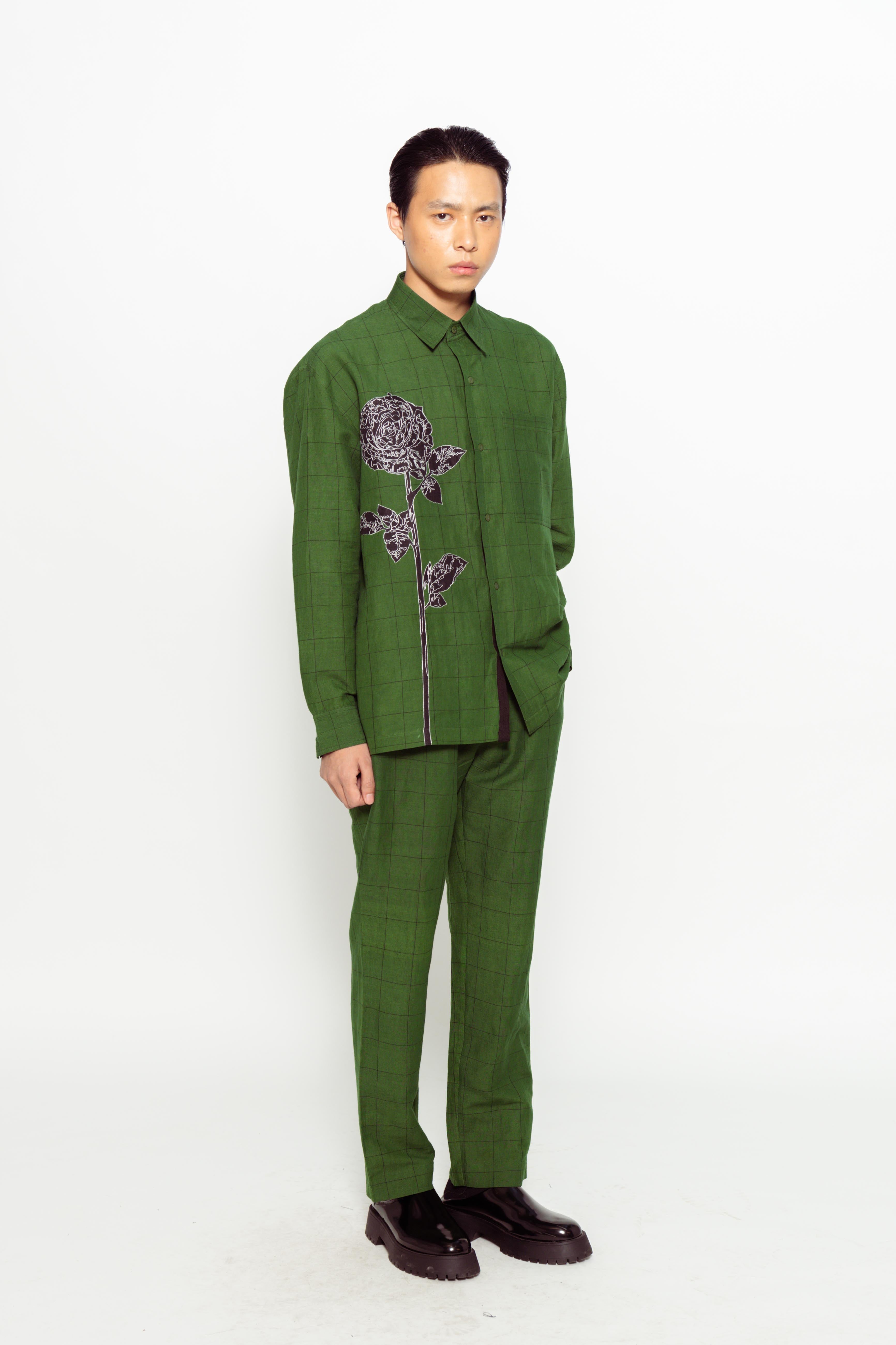 This self-checkered handloom linen full-sleeve shirt features a subtle woven pattern and is adorned with delicate applique embroidery. The breathable linen fabric and intricate detailing make it a stylish choice for casual or semi-formal wear.