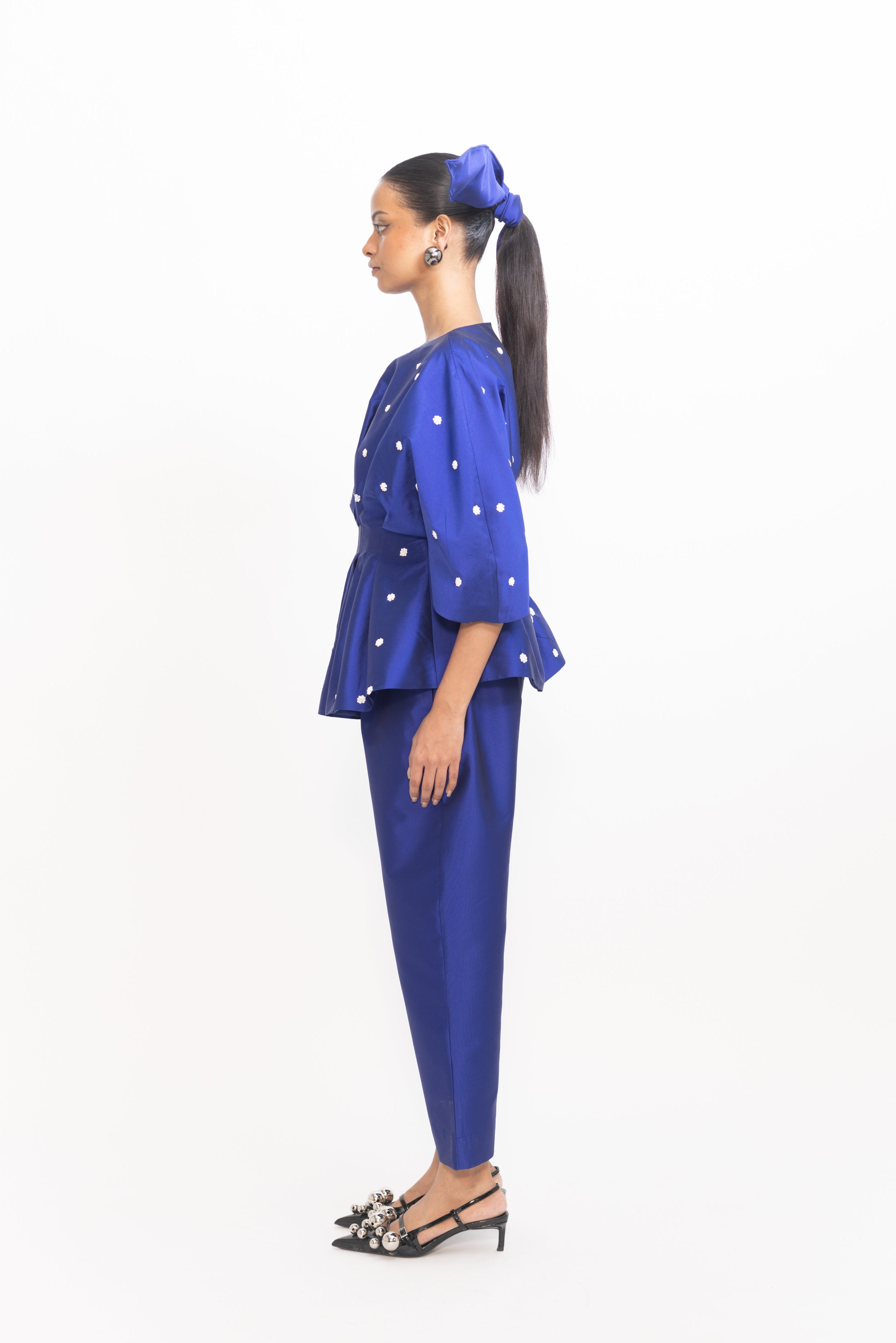A timeless look with modern details, this top features intricate pleating at the waist for a subtle corset effect that beautifully defines the silhouette. Delicate floral sequins add a touch of shimmer and texture, while buttoned sleeves lend a refined finish—perfect for both daytime celebrations and evening occasions.