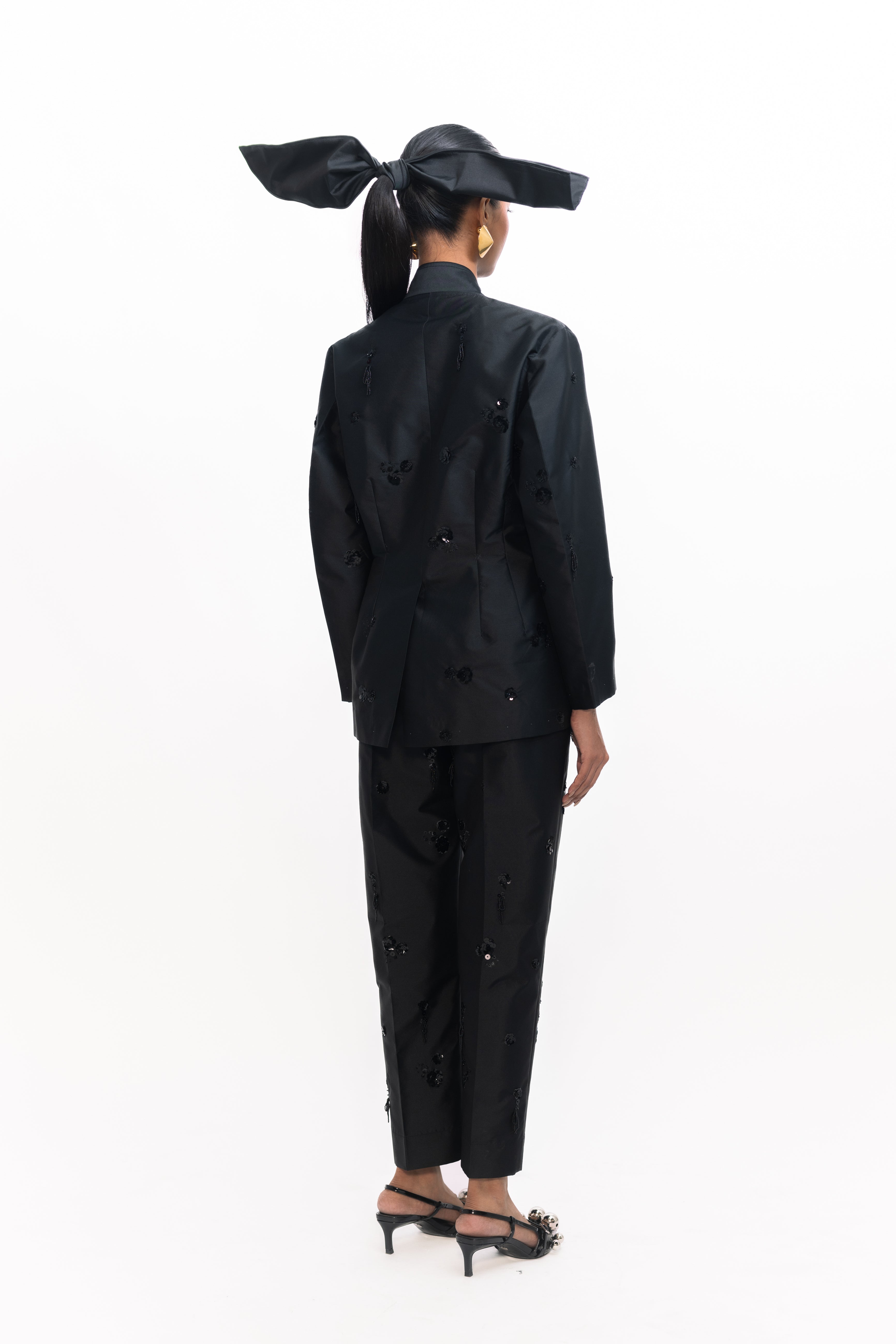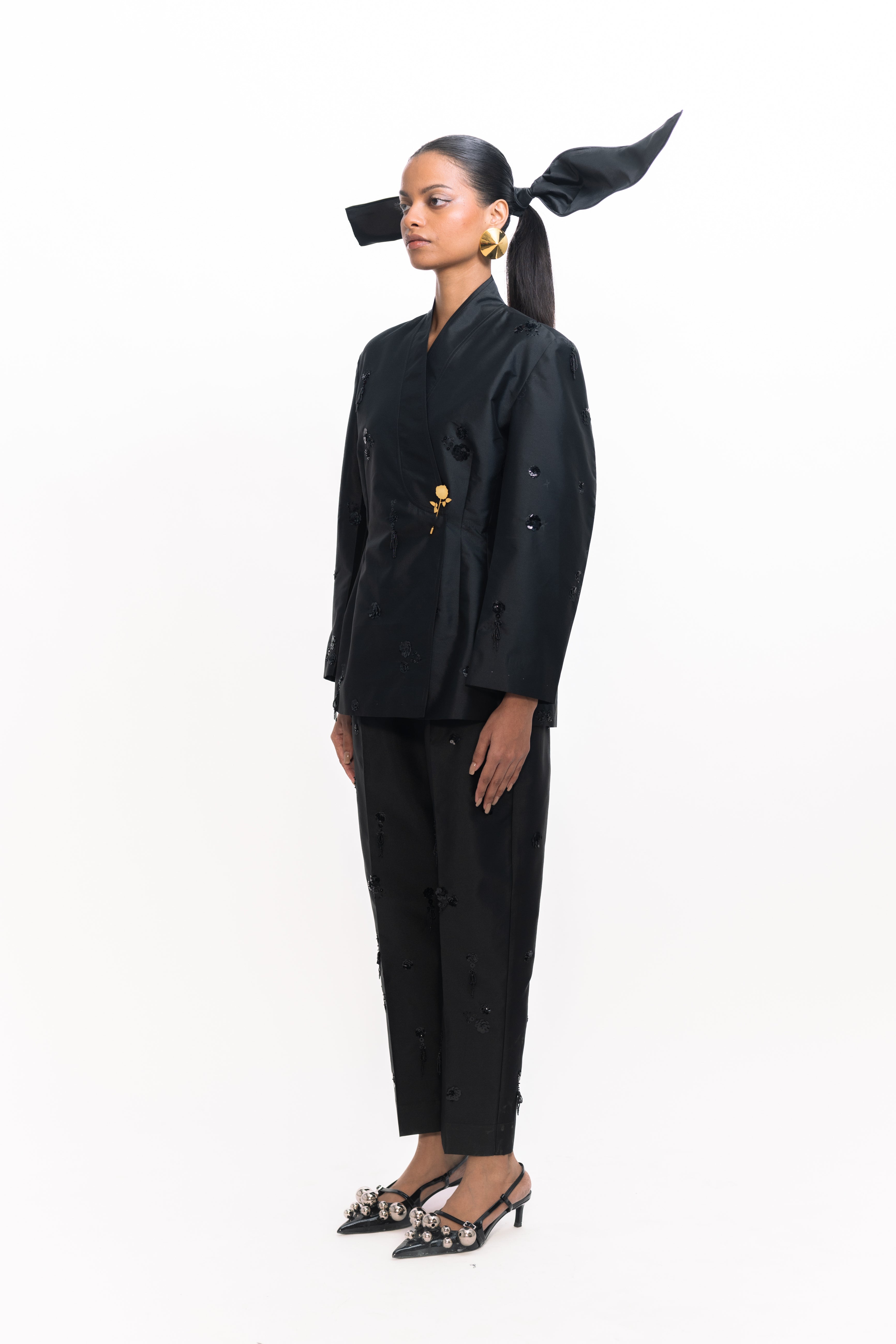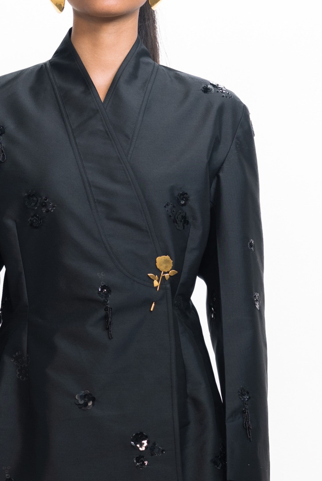 This overlap jacket features a sleek wrap-style front adorned with intricate sequin embroidery. The tailored silhouette balances shimmer with structure, making it a standout piece for both evening occasions and elevated daywear.